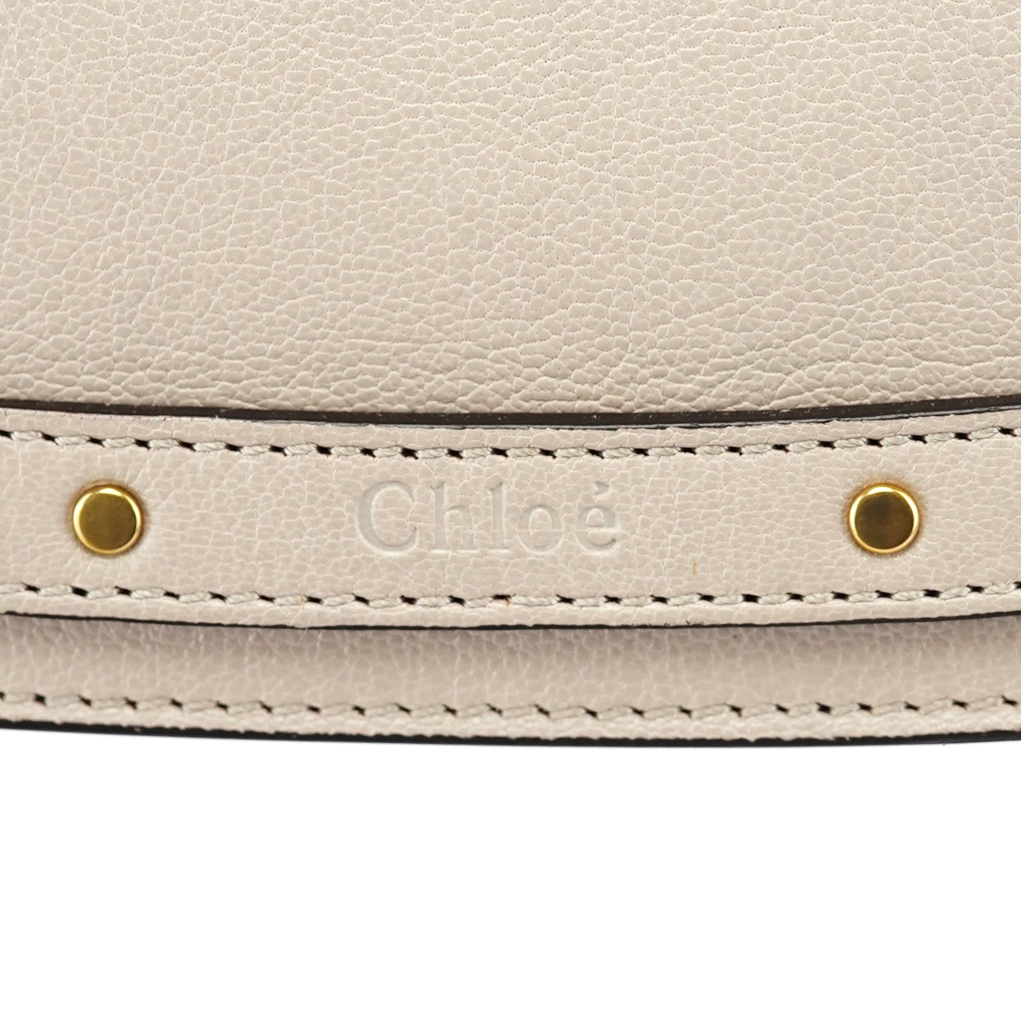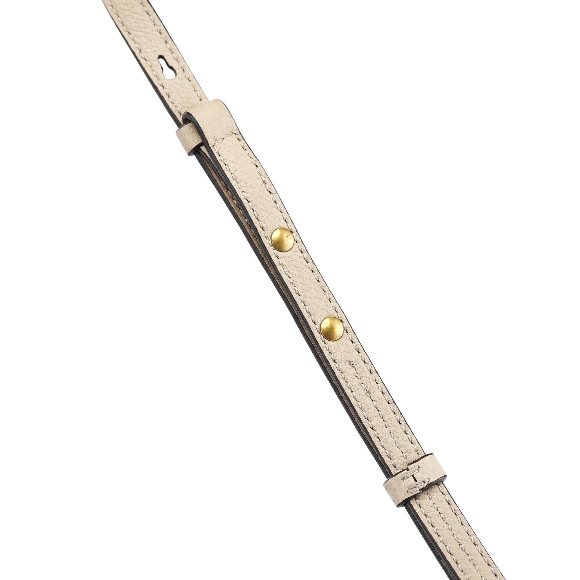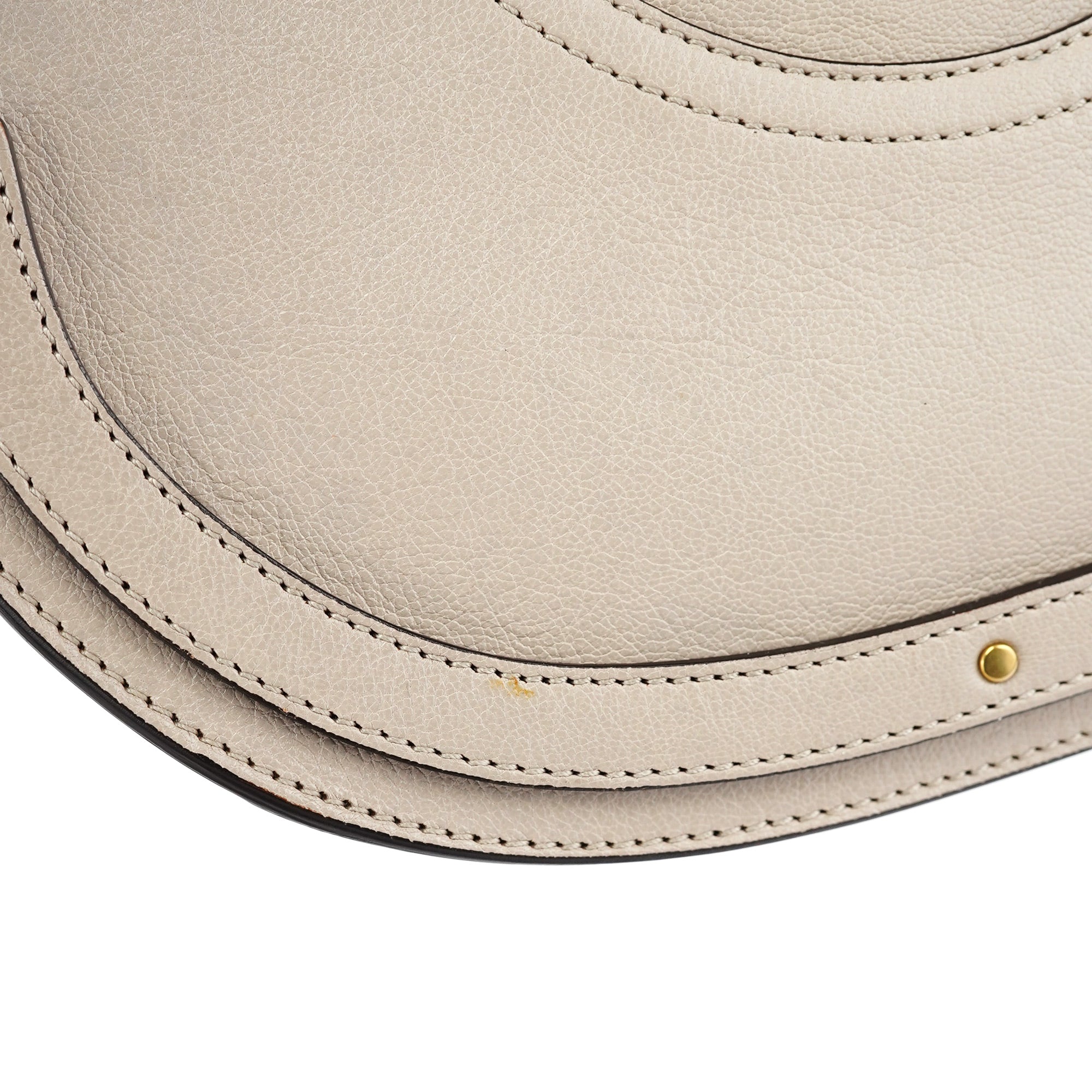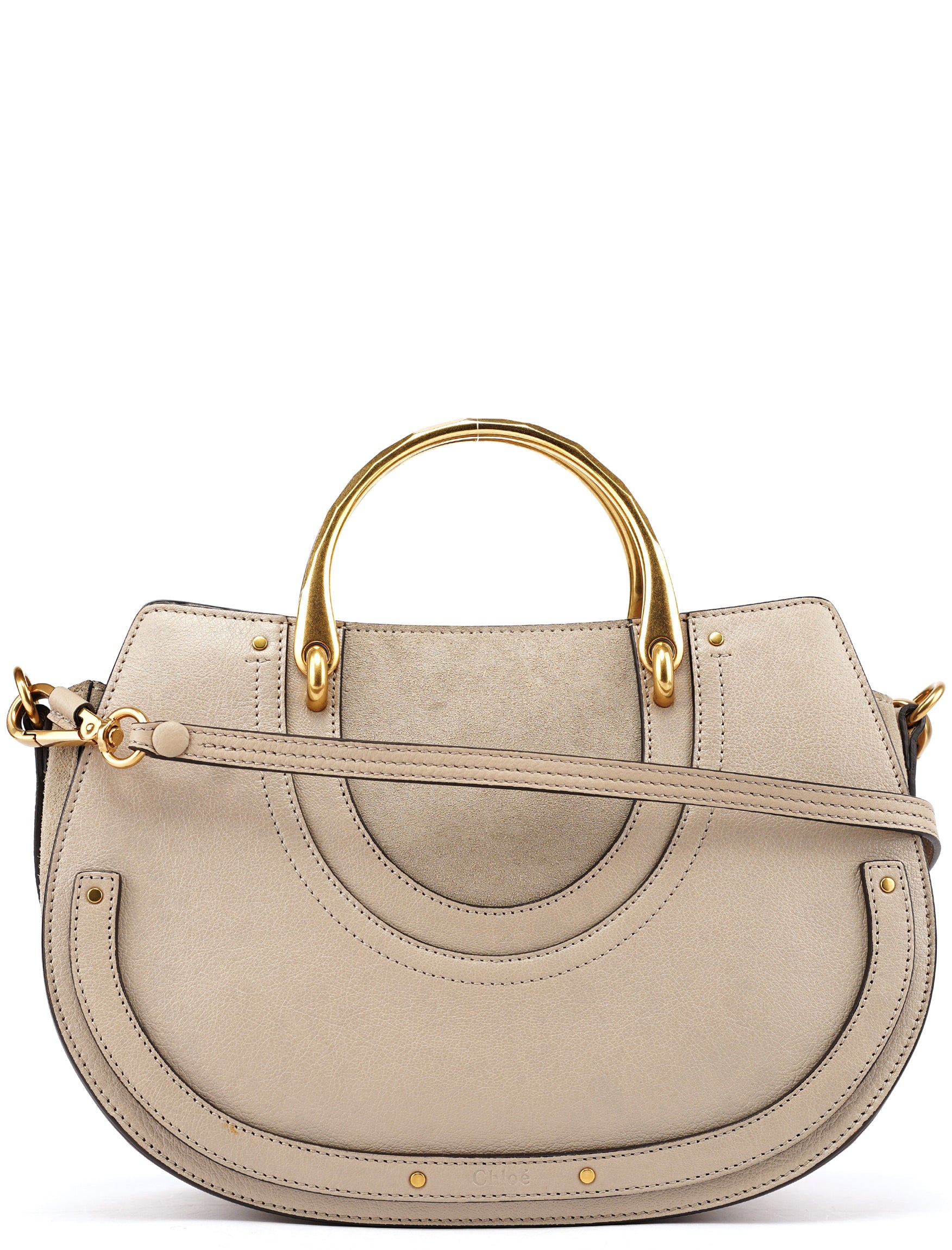 Designed by Clare Waight Keller for Chloé in the late 2010s, the Nile bracelet bag is handcrafted from taupe grained leather and features a distinctive half-moon silhouette with a gold-tone hardware and metal ring handle. It includes a removable shoulder strap, zipper closure, and a suede-lined interior with a zipper pocket—balancing architectural design with everyday ease.