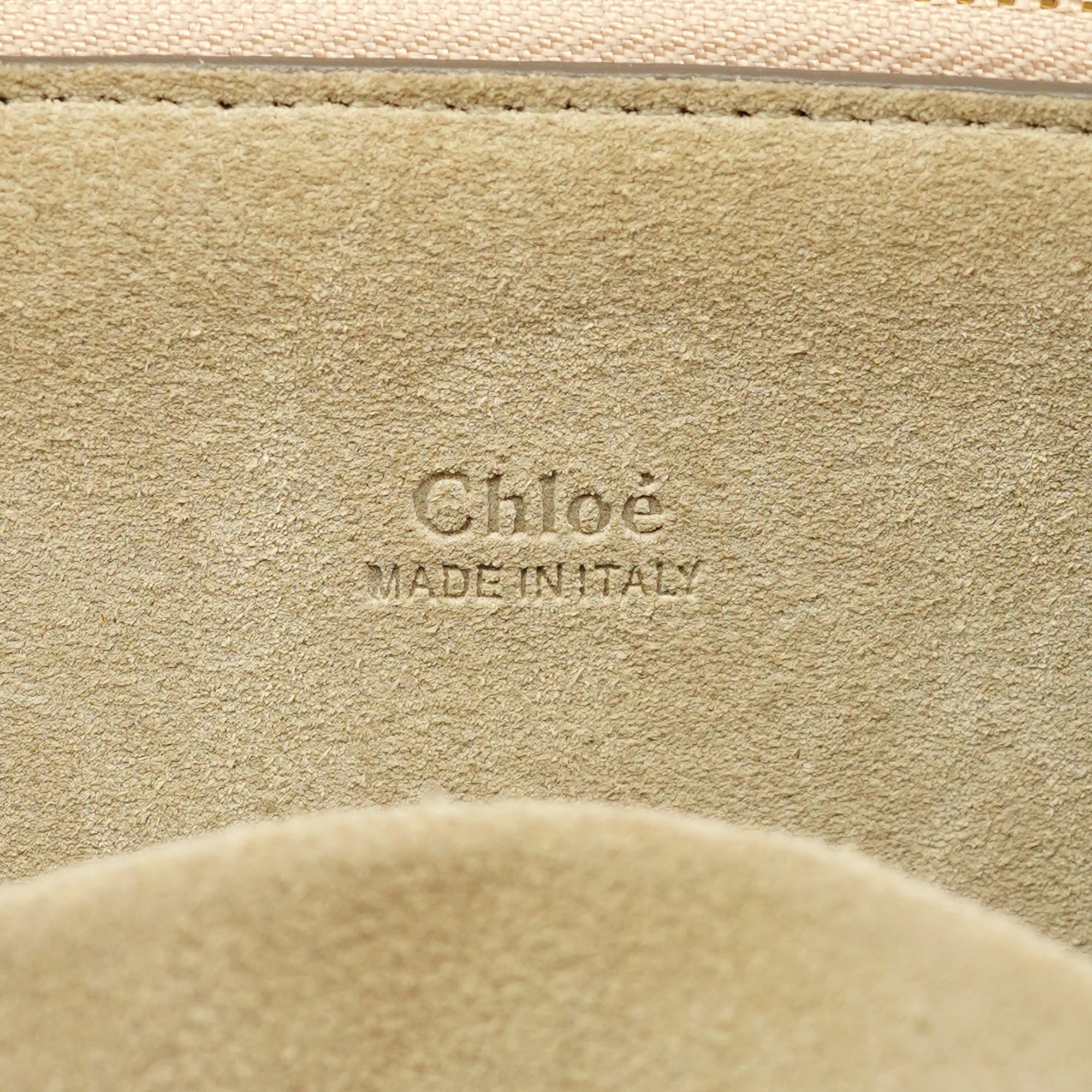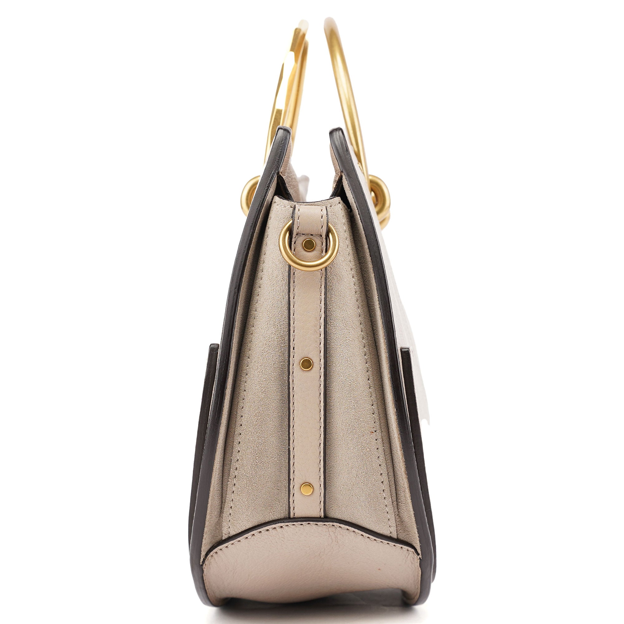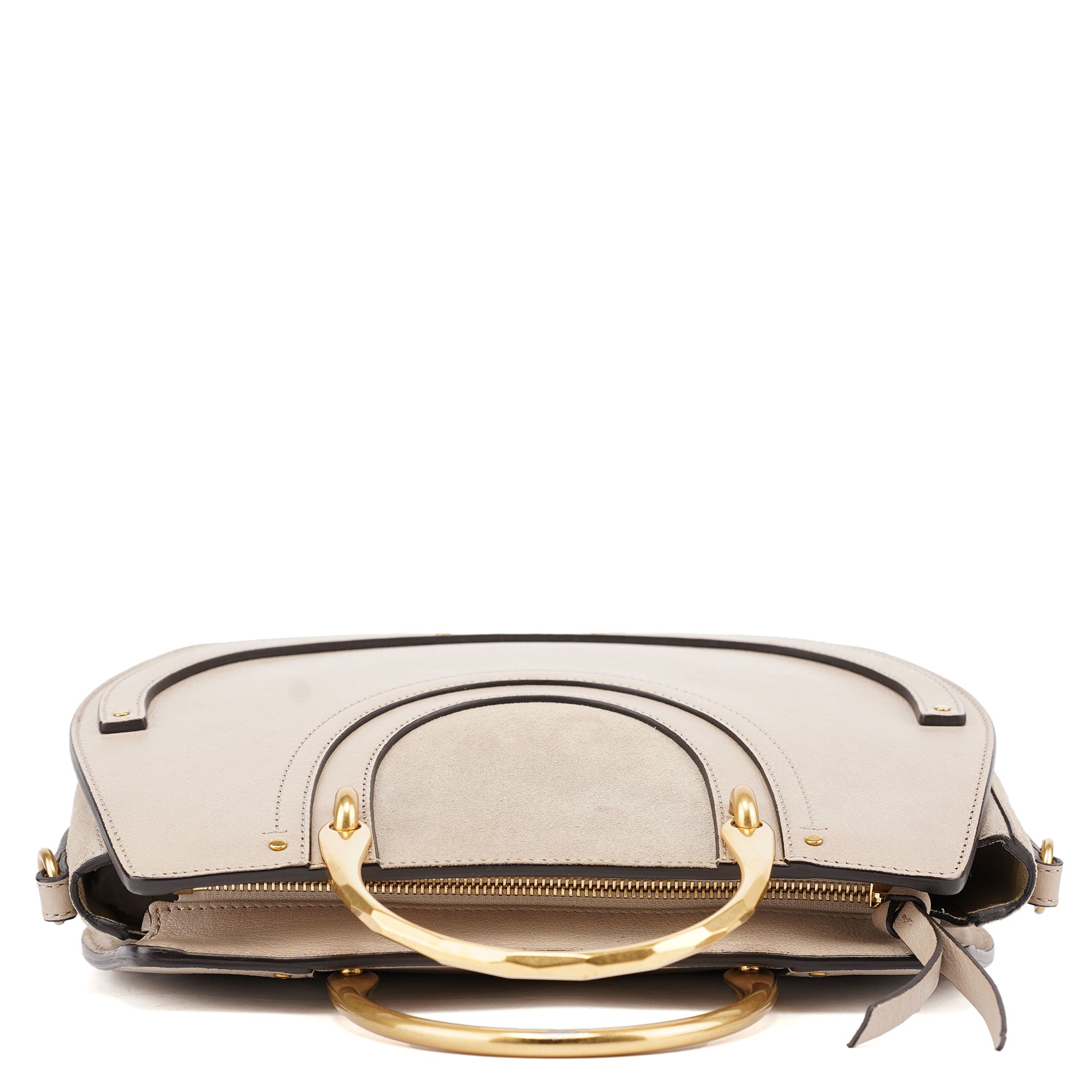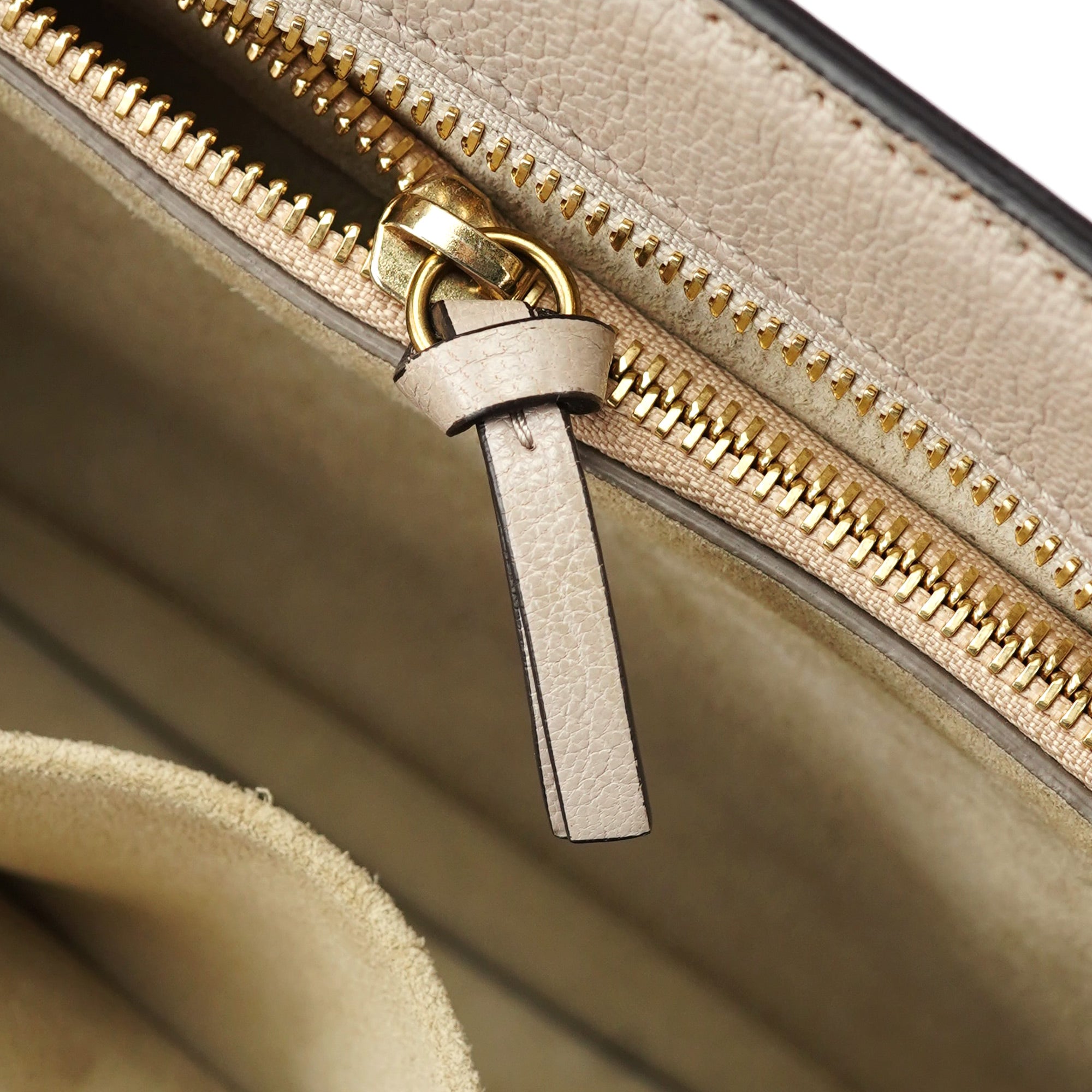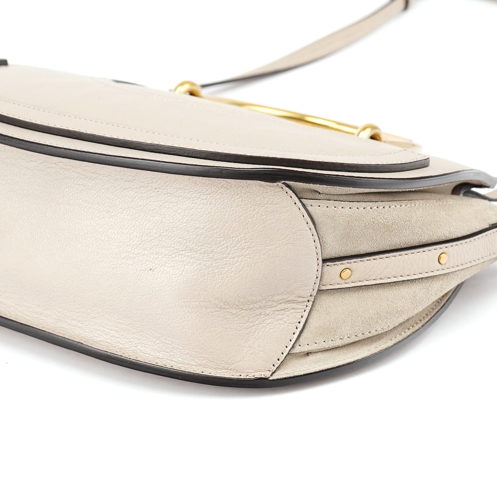 Designed by Clare Waight Keller for Chloé in the late 2010s, the Nile bracelet bag is handcrafted from taupe grained leather and features a distinctive half-moon silhouette with a gold-tone hardware and metal ring handle. It includes a removable shoulder strap, zipper closure, and a suede-lined interior with a zipper pocket—balancing architectural design with everyday ease.