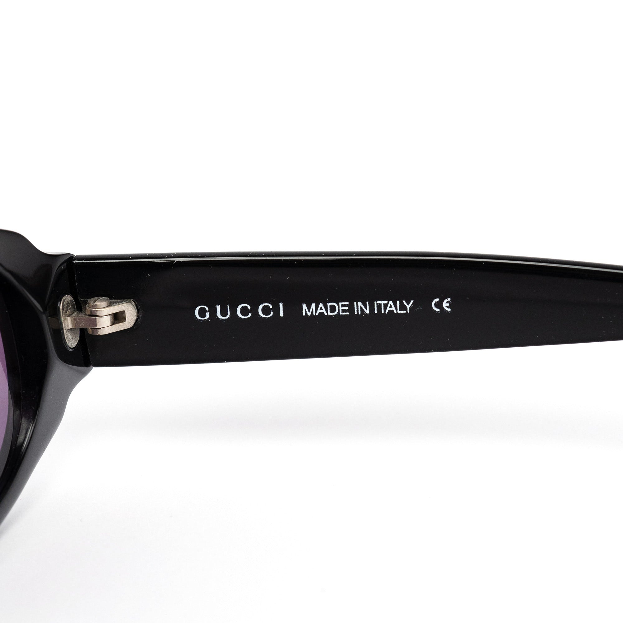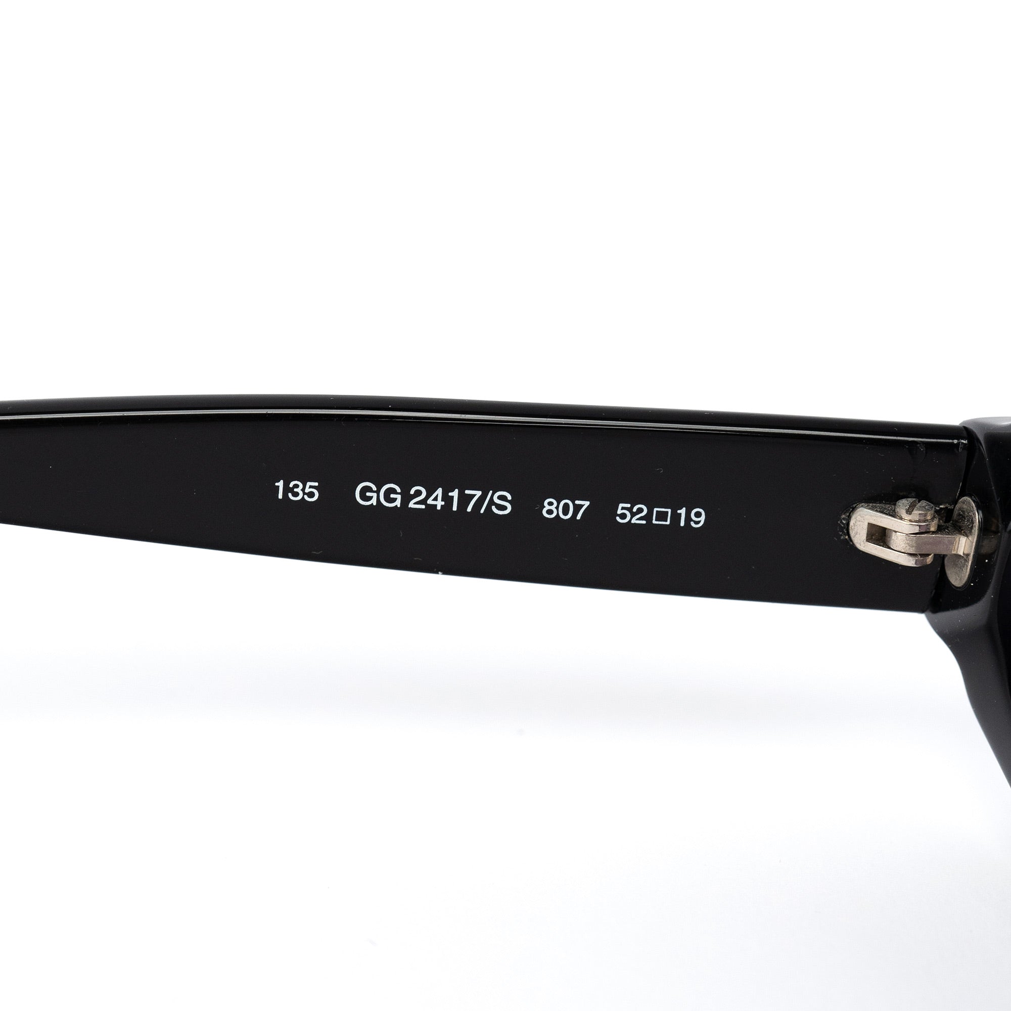 Designed in the late 1990s, these Gucci GG 2413/N/S sunglasses feature a sleek oval silhouette in glossy black acetate with gradient grey lenses. The temples are adorned with silver-tone G logo plaques, a nod to Tom Ford’s minimal branding era. Finished with dual pin rivets at the front and a comfortable curved arm fit.
