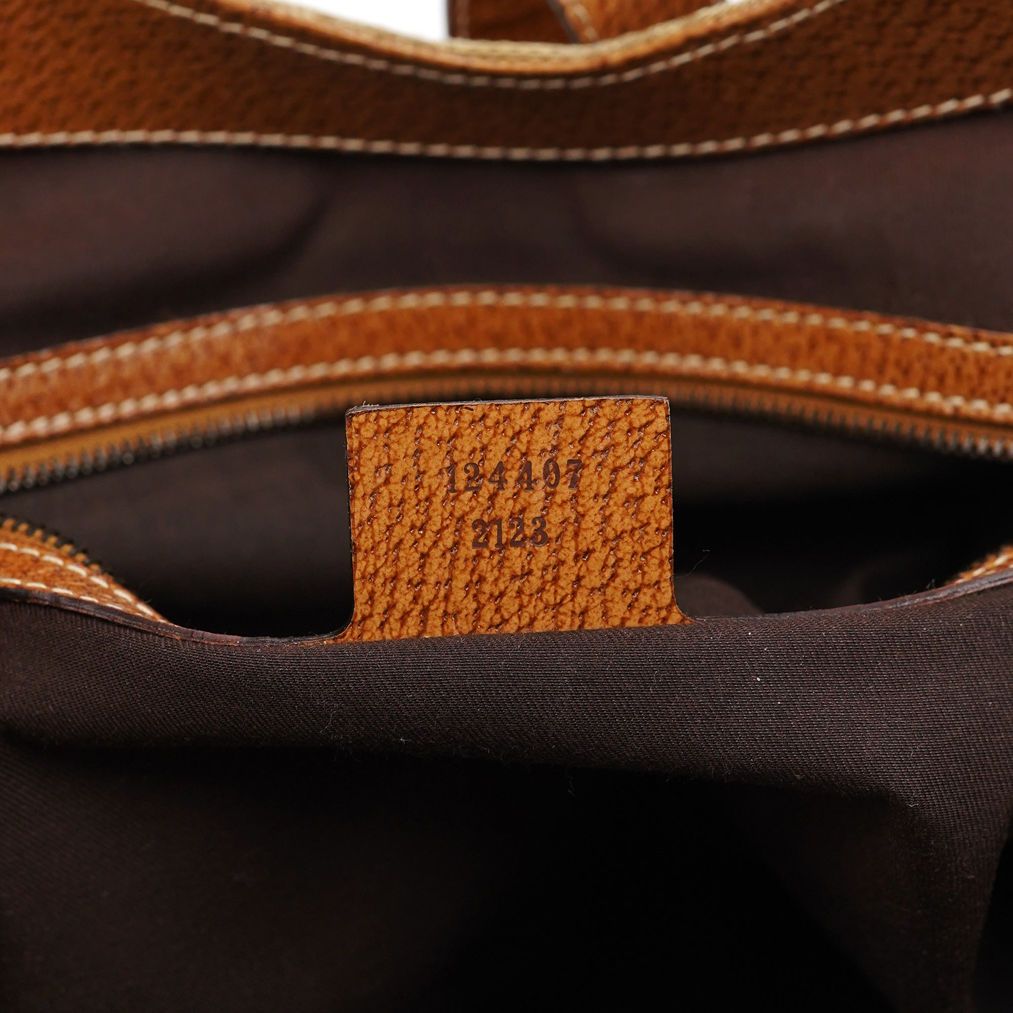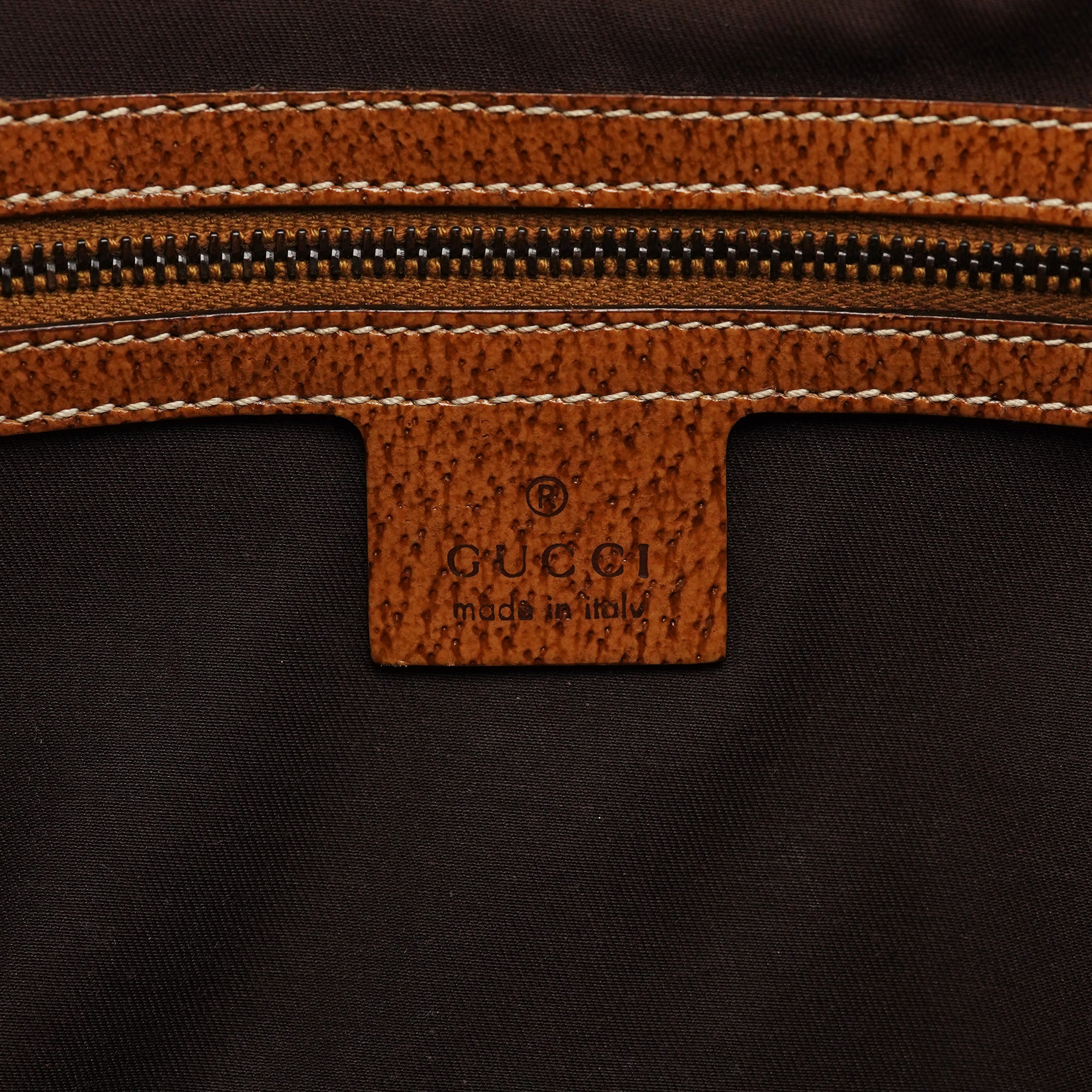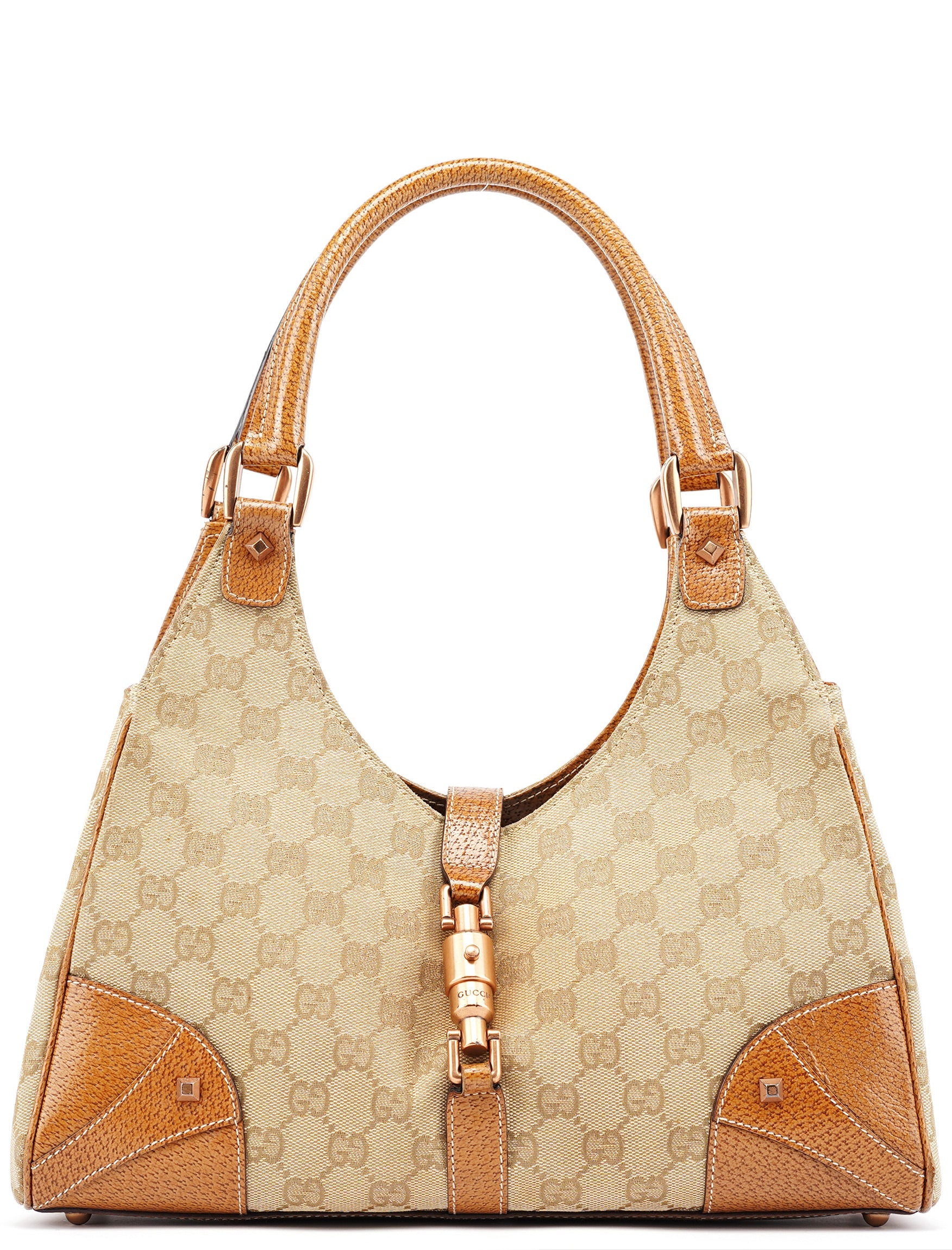 Designed in the early 2000s by Tom Ford, this Gucci GG Jackie shoulder bag features the classic beige and brown GG monogram canvas with textured brown leather trim. Ford's reimagining of the iconic Jackie included the signature piston lock closure with gold-tone hardware and refined proportions. The interior is lined in fabric with compartments for organization.