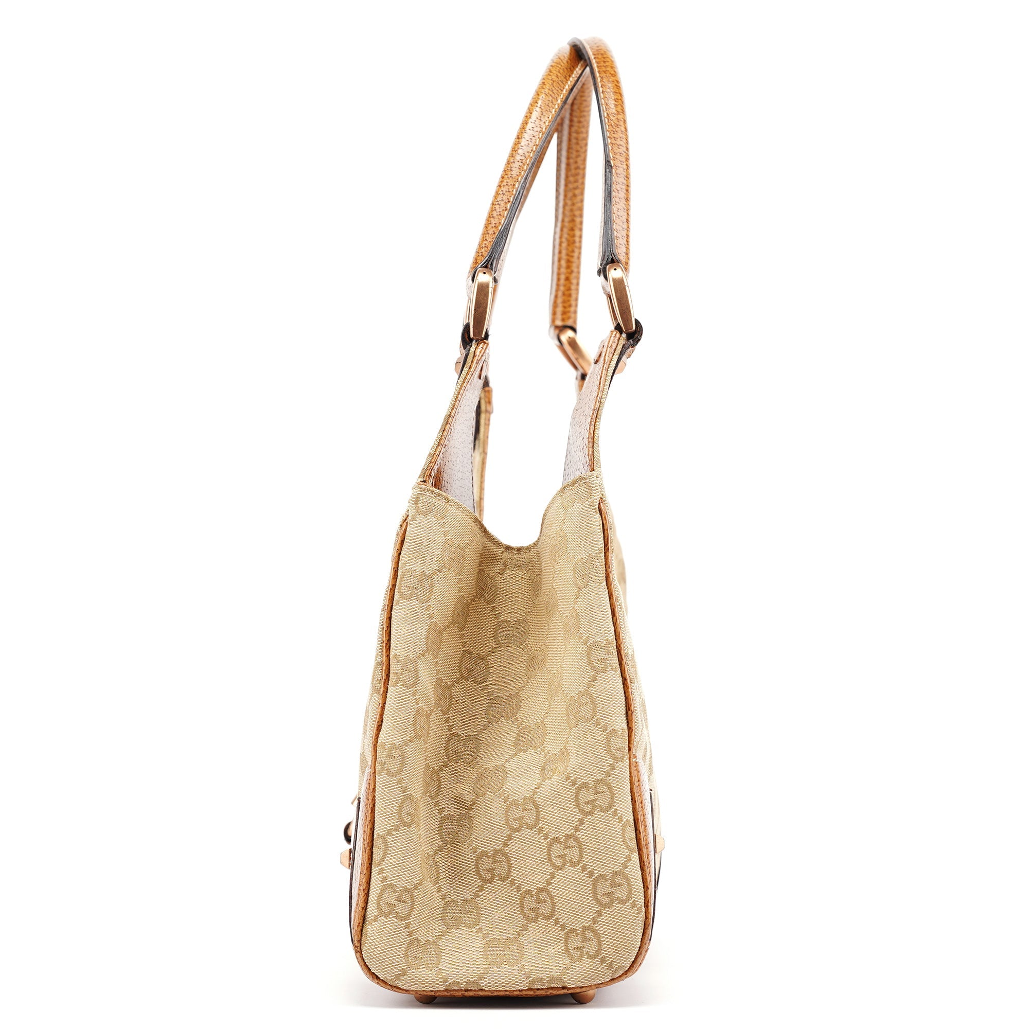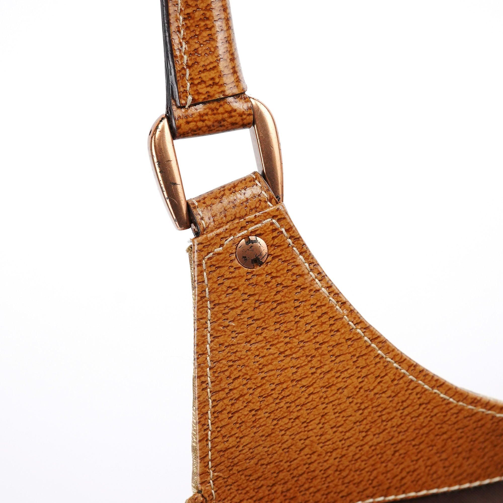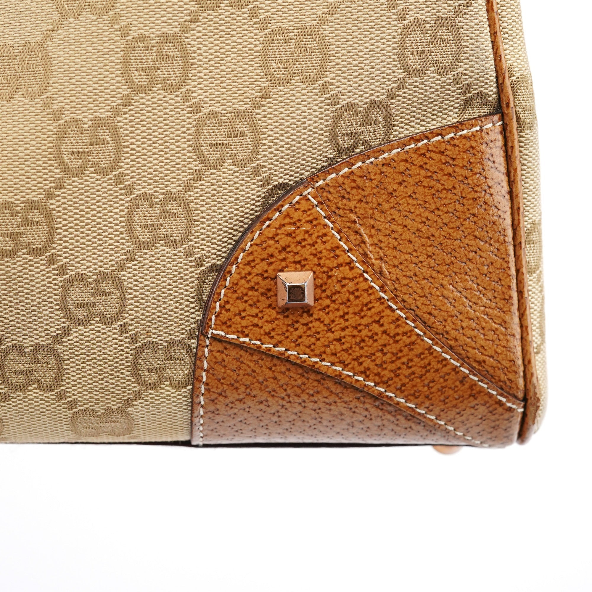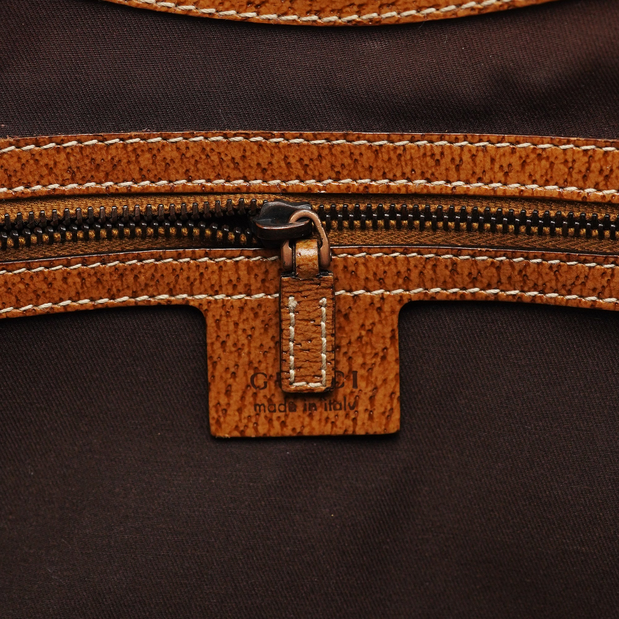 Designed in the early 2000s by Tom Ford, this Gucci GG Jackie shoulder bag features the classic beige and brown GG monogram canvas with textured brown leather trim. Ford's reimagining of the iconic Jackie included the signature piston lock closure with gold-tone hardware and refined proportions. The interior is lined in fabric with compartments for organization.