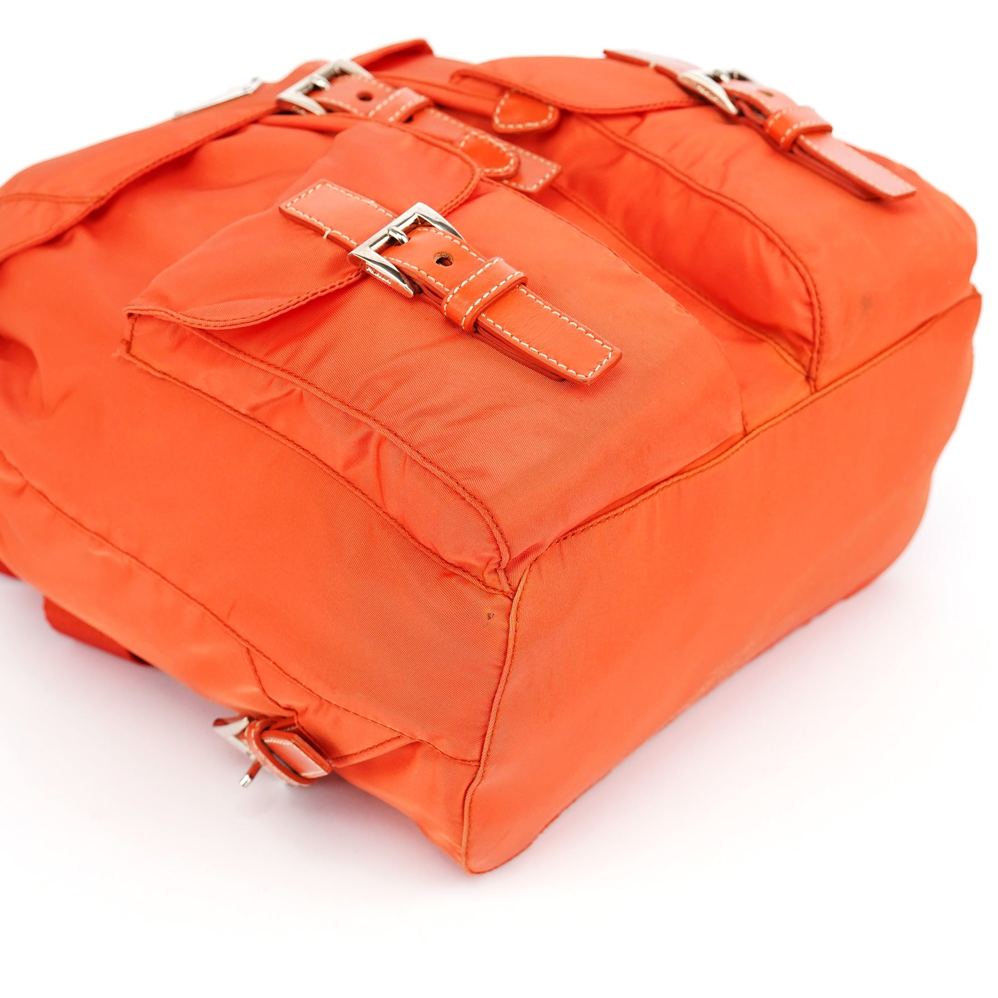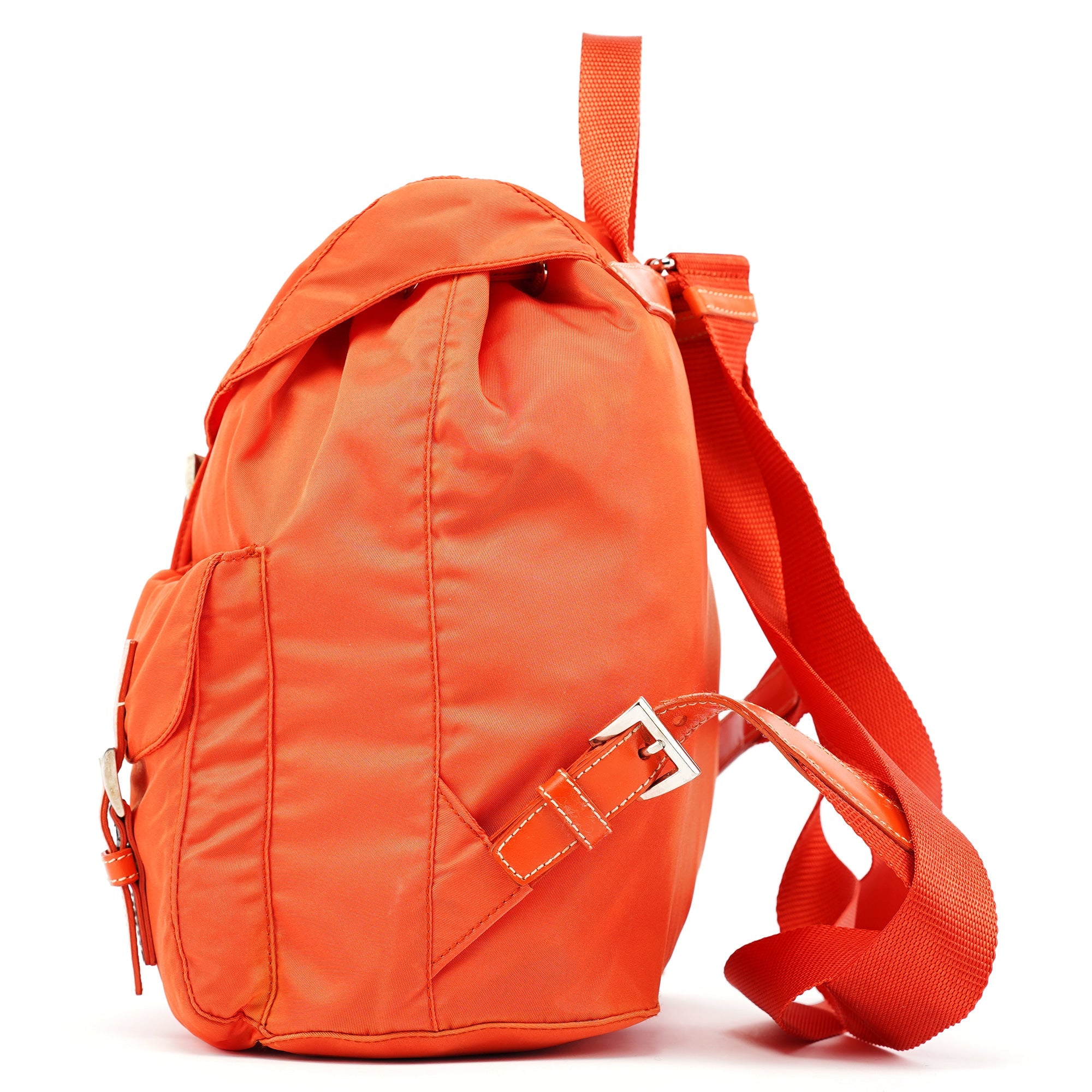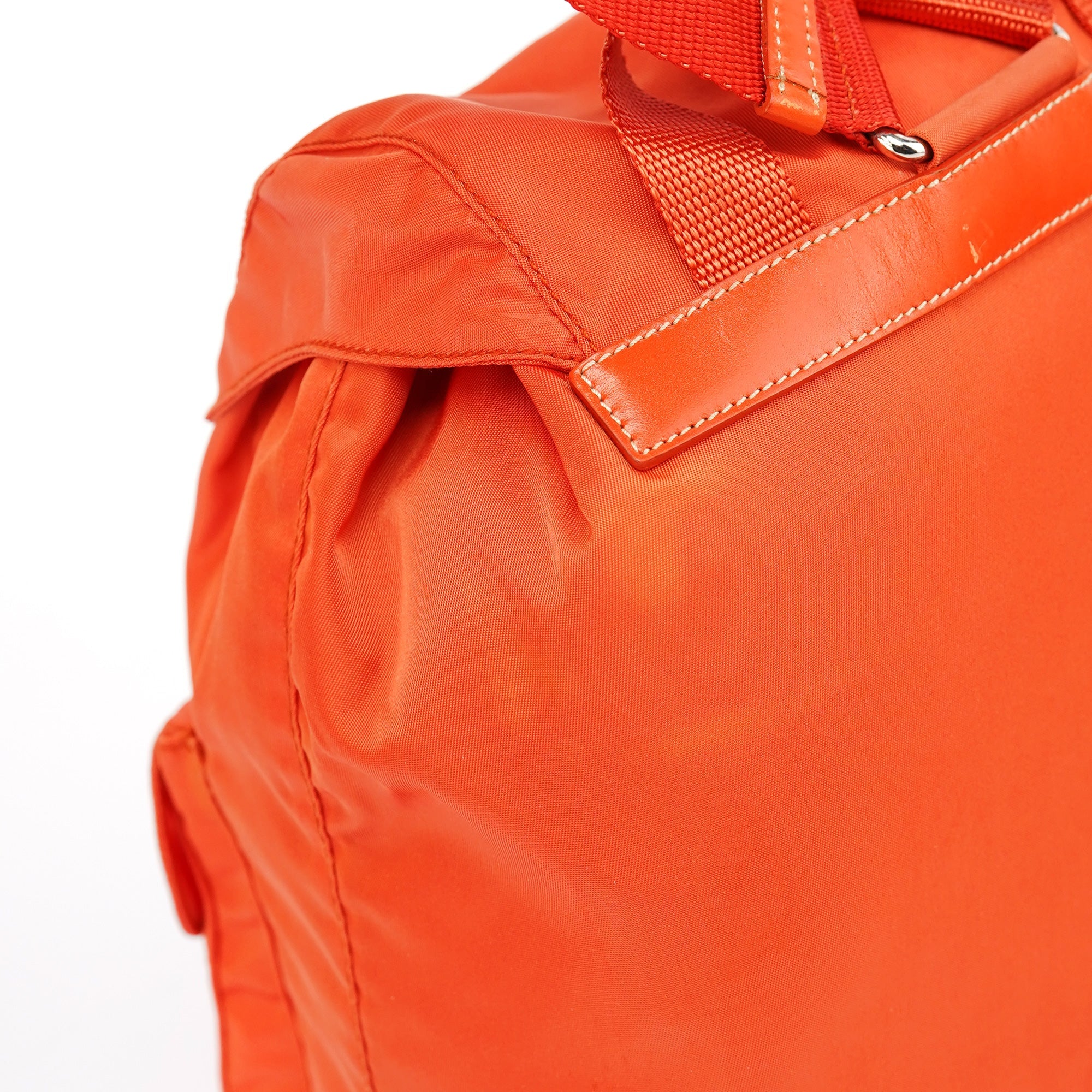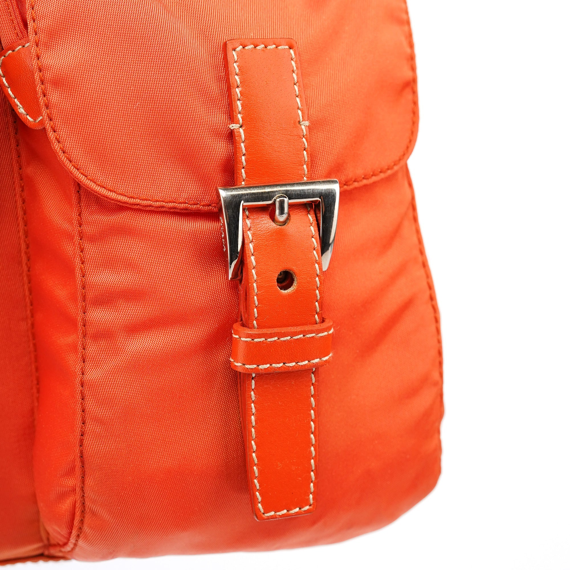Designed in the early 2000s by Miuccia Prada, this Tessuto Vela backpack is crafted in vibrant orange nylon with red leather trim and silver-tone hardware. It features a flap top with buckle closure, two exterior front pockets, and a spacious interior lined in signature Prada jacquard with a zip pocket. The iconic enamel triangle logo sits at the front, completing the archival design.