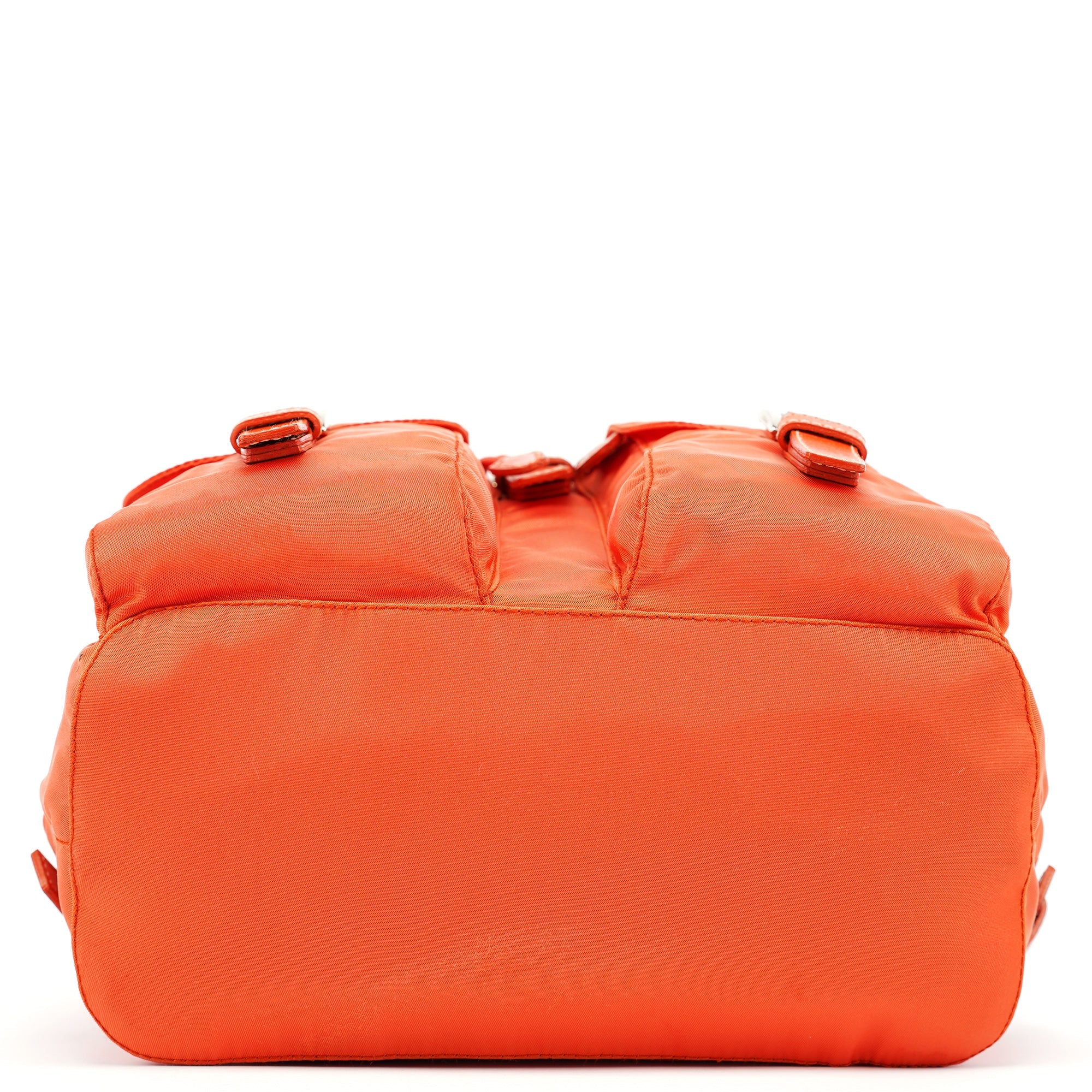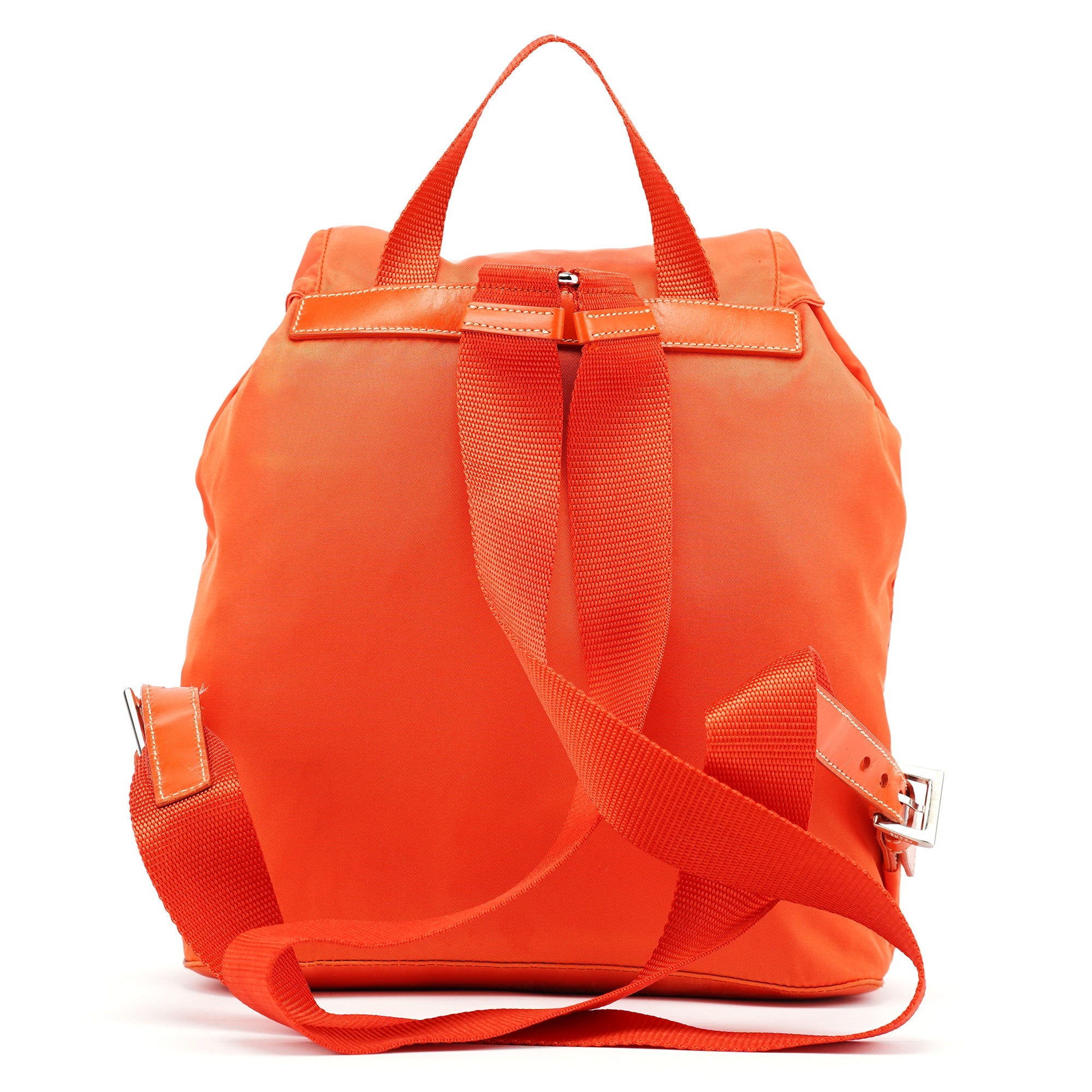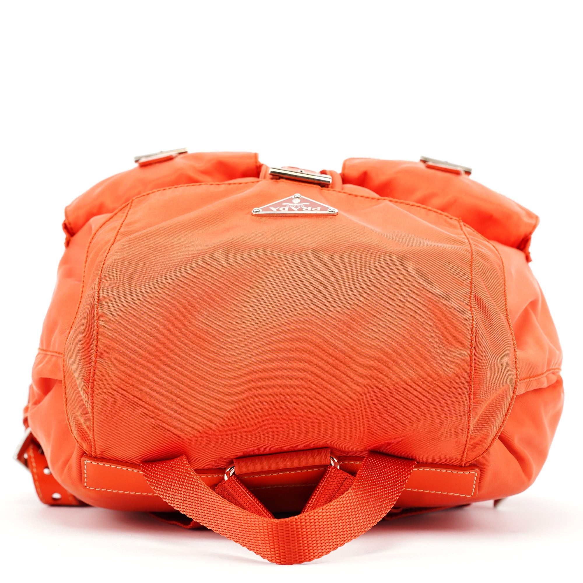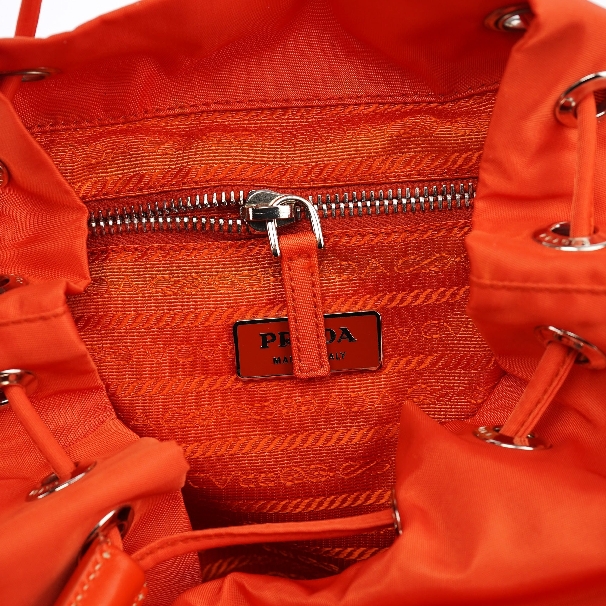Designed in the early 2000s by Miuccia Prada, this Tessuto Vela backpack is crafted in vibrant orange nylon with red leather trim and silver-tone hardware. It features a flap top with buckle closure, two exterior front pockets, and a spacious interior lined in signature Prada jacquard with a zip pocket. The iconic enamel triangle logo sits at the front, completing the archival design.