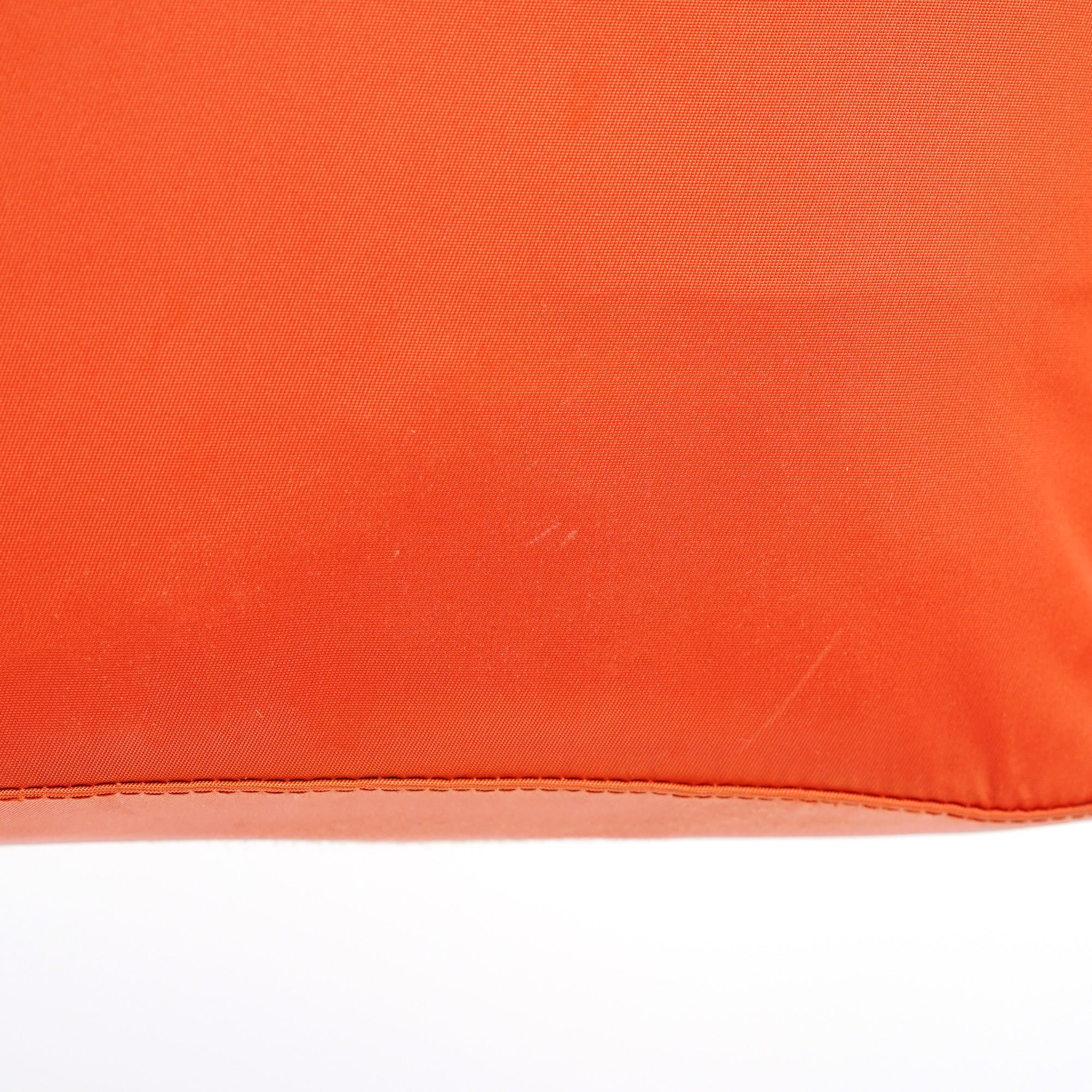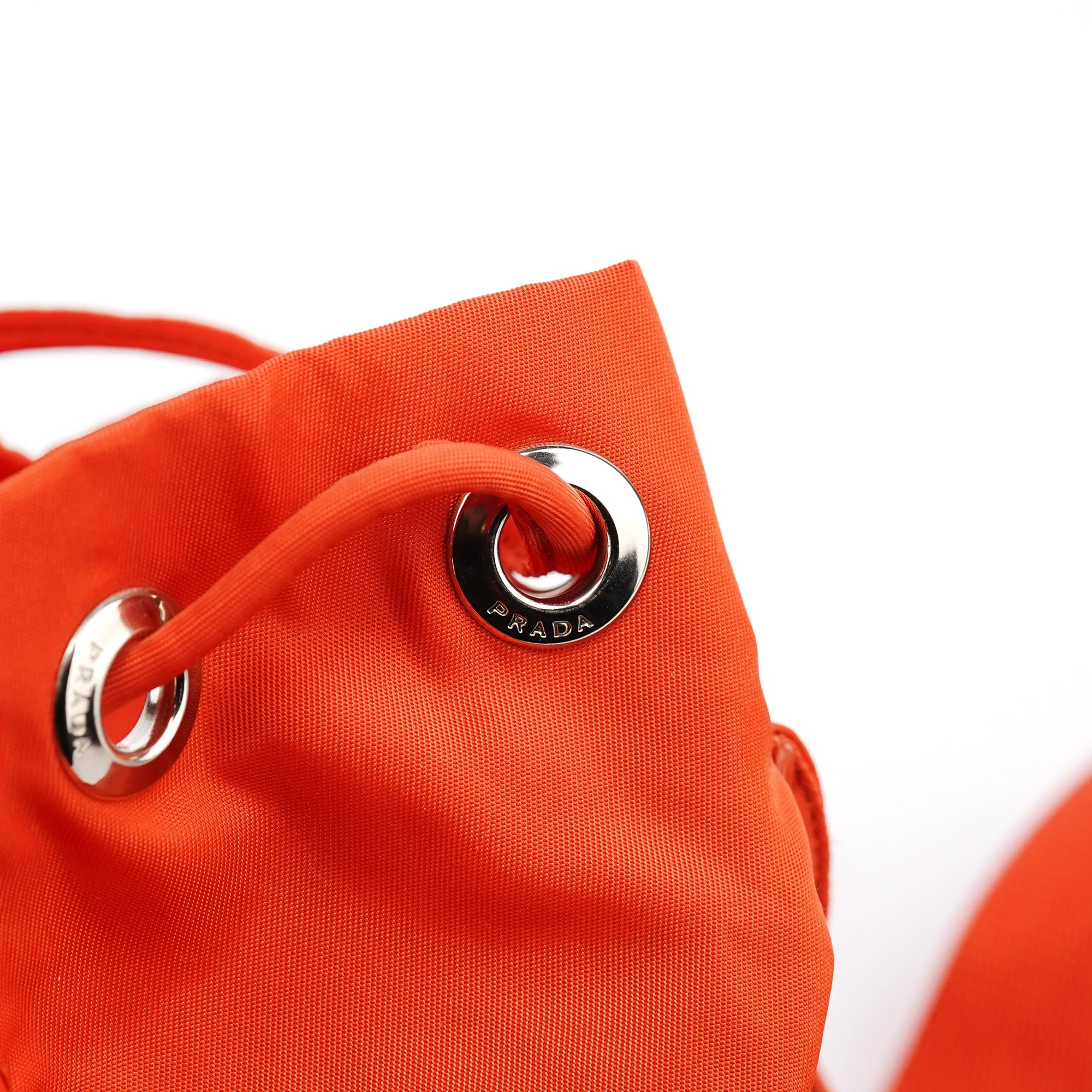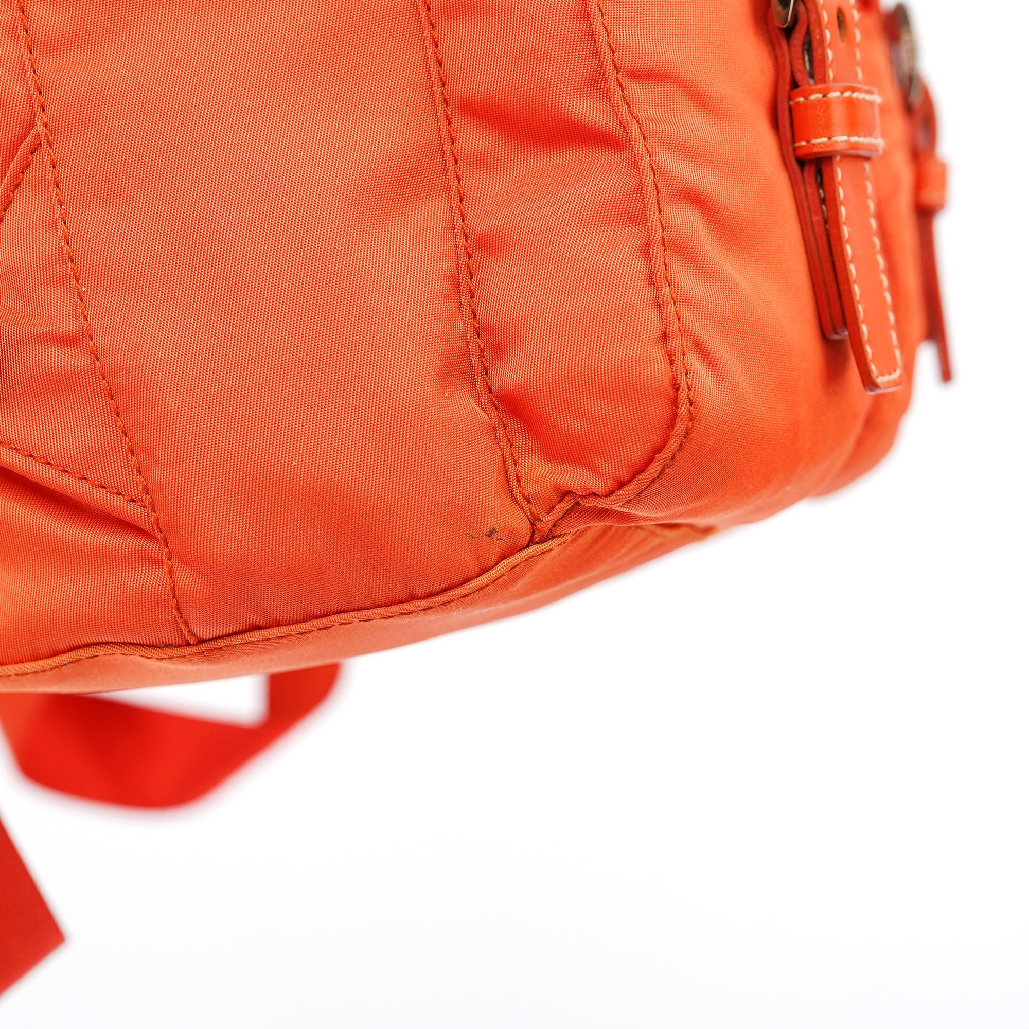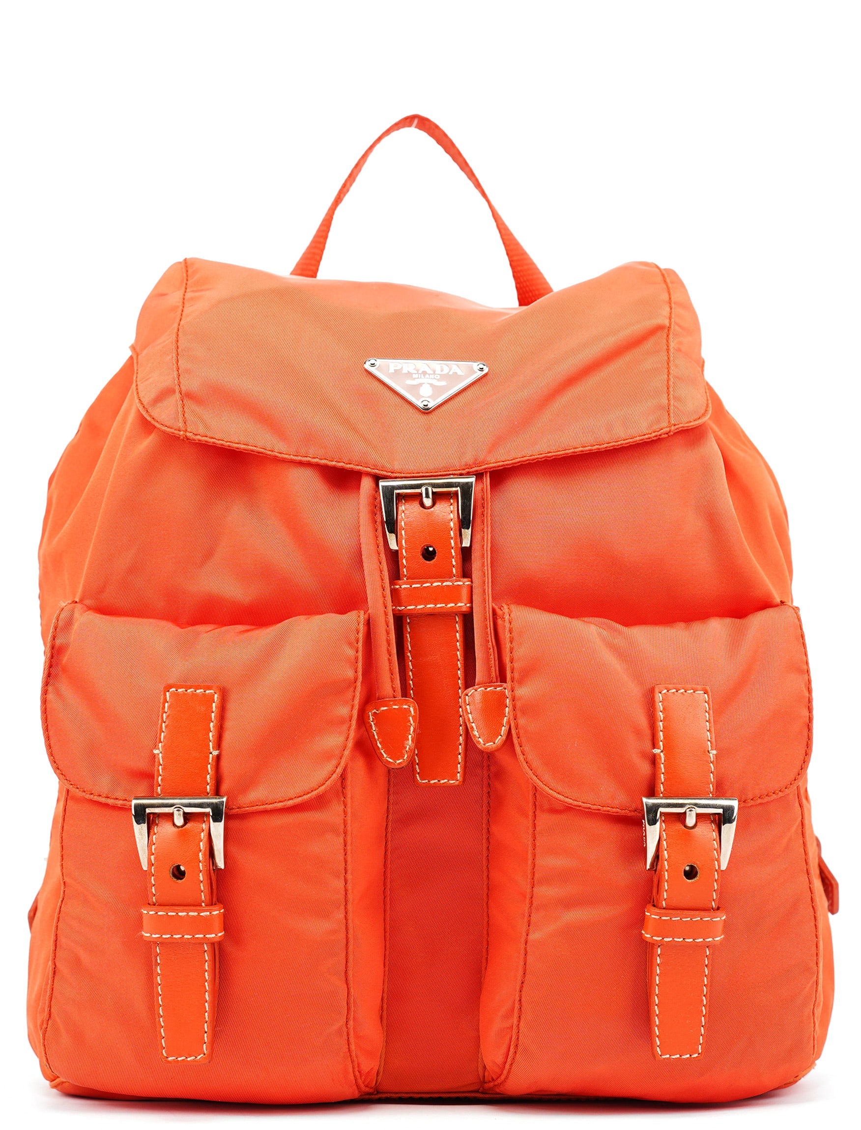 Designed in the early 2000s by Miuccia Prada, this Tessuto Vela backpack is crafted in vibrant orange nylon with red leather trim and silver-tone hardware. It features a flap top with buckle closure, two exterior front pockets, and a spacious interior lined in signature Prada jacquard with a zip pocket. The iconic enamel triangle logo sits at the front, completing the archival design.