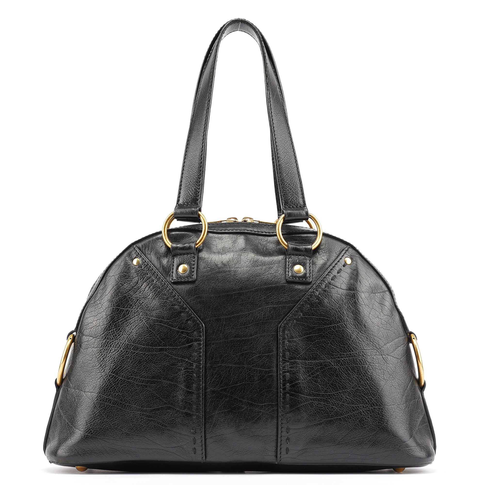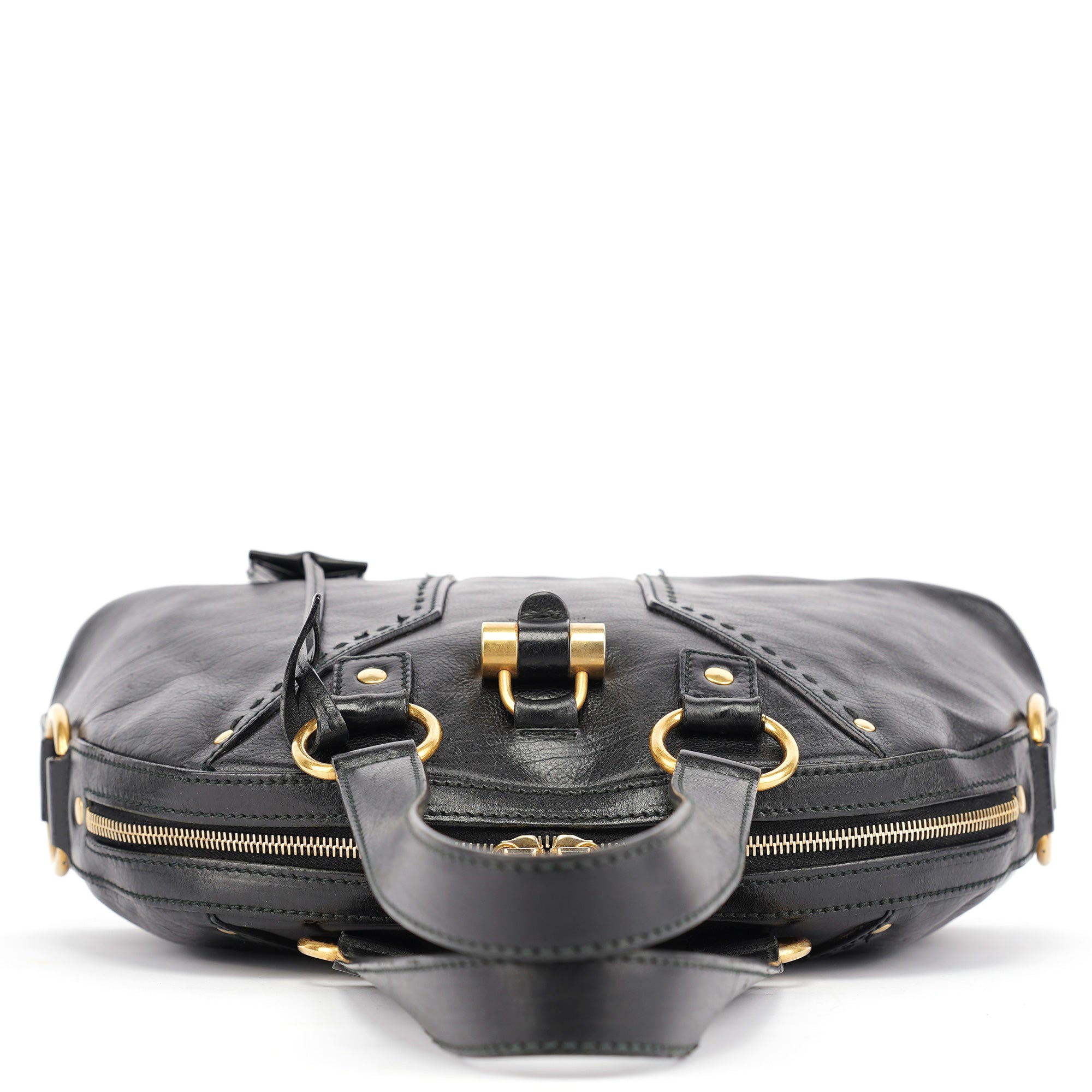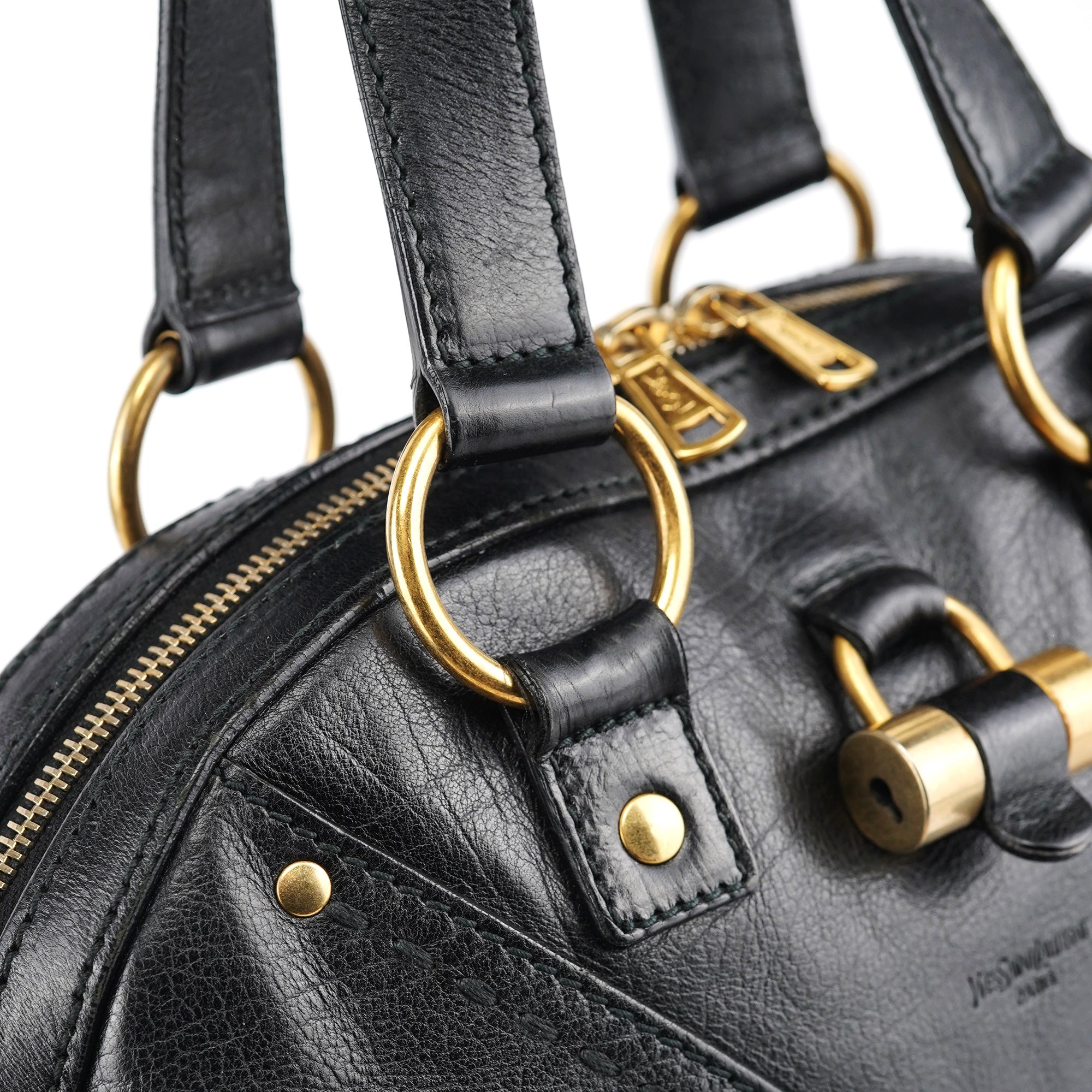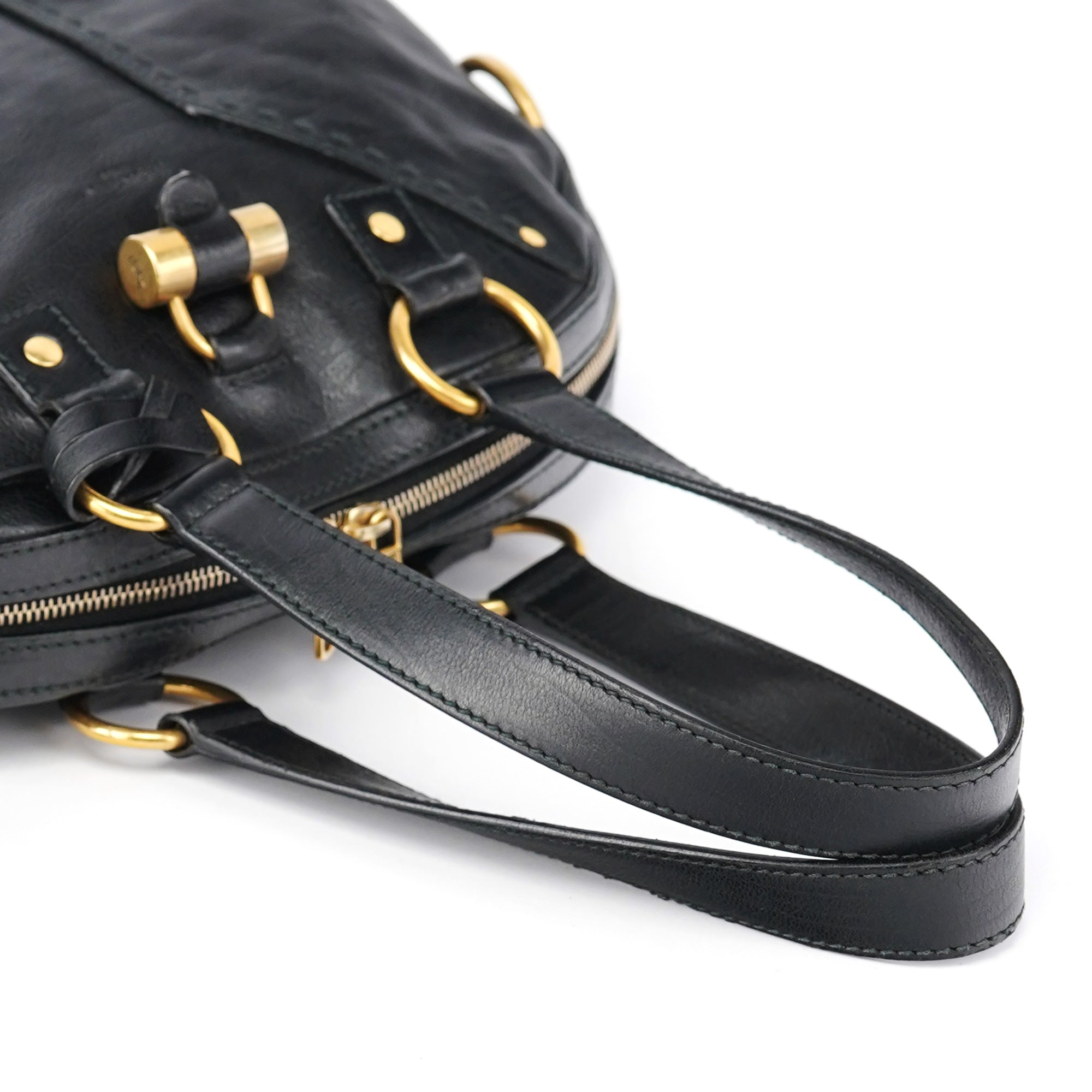 Designed in the late 2000s, this vintage Yves Saint Laurent Muse shoulder bag exemplifies the model's architectural elegance in smooth black leather. The iconic dome silhouette features the signature oversized gold-tone hardware, including bamboo-inspired ring handles and the distinctive turn-lock closure that made this design a modern classic.