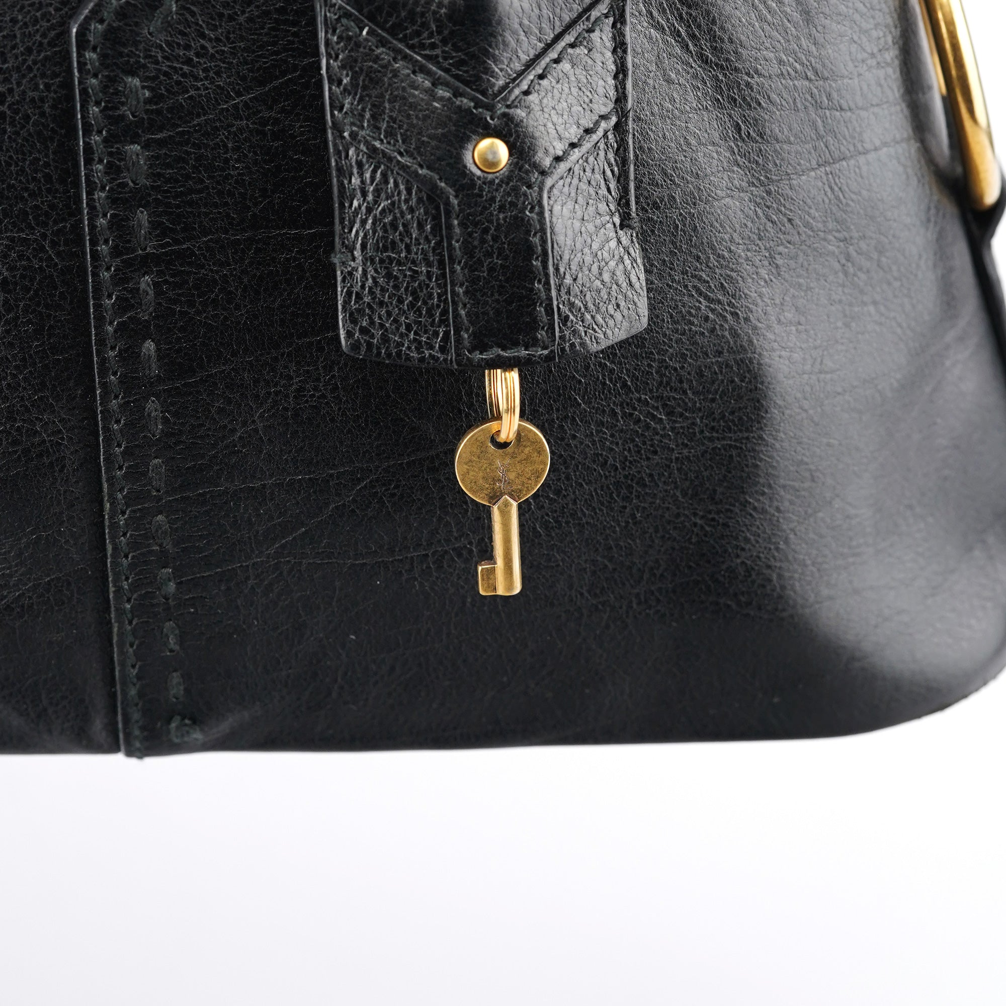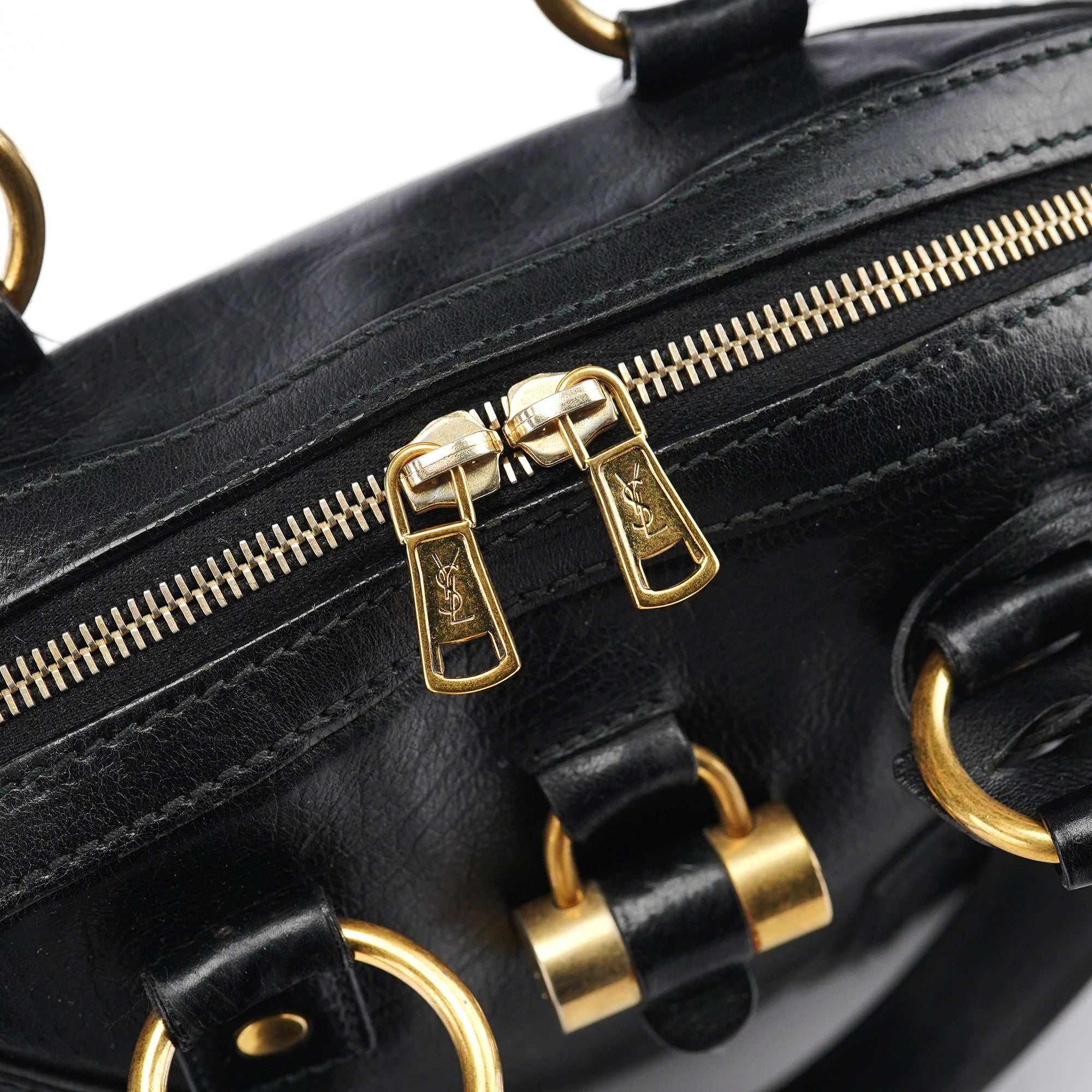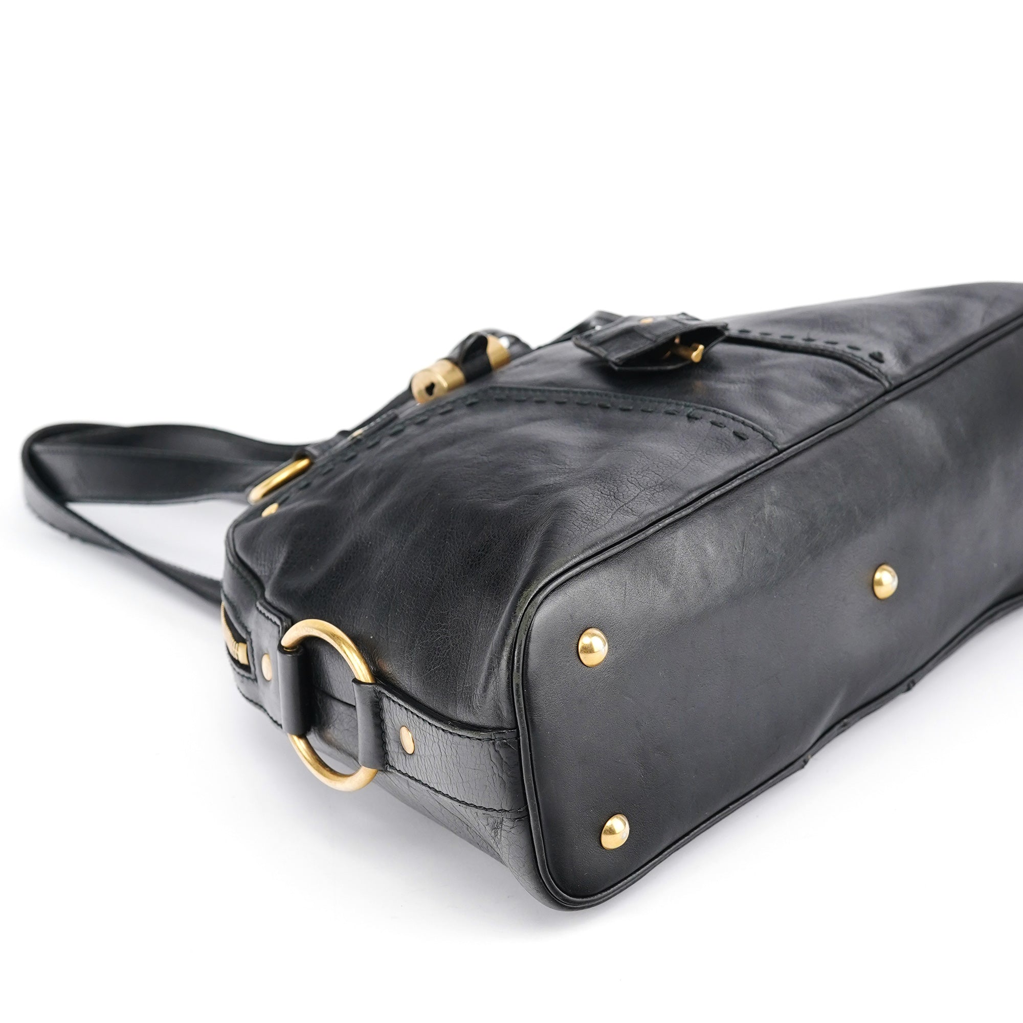 Designed in the late 2000s, this vintage Yves Saint Laurent Muse shoulder bag exemplifies the model's architectural elegance in smooth black leather. The iconic dome silhouette features the signature oversized gold-tone hardware, including bamboo-inspired ring handles and the distinctive turn-lock closure that made this design a modern classic.