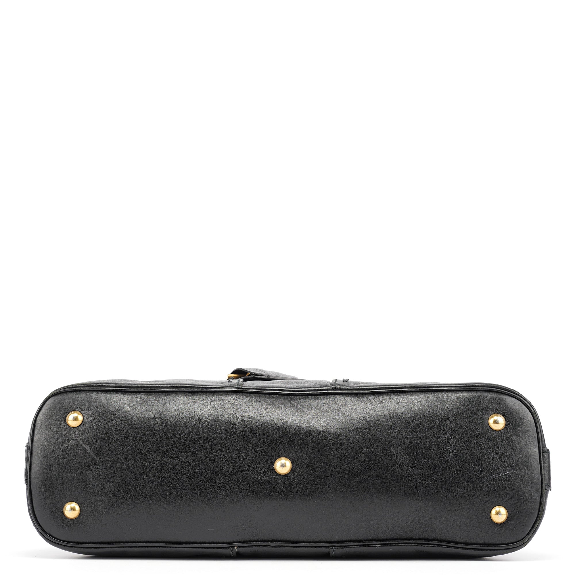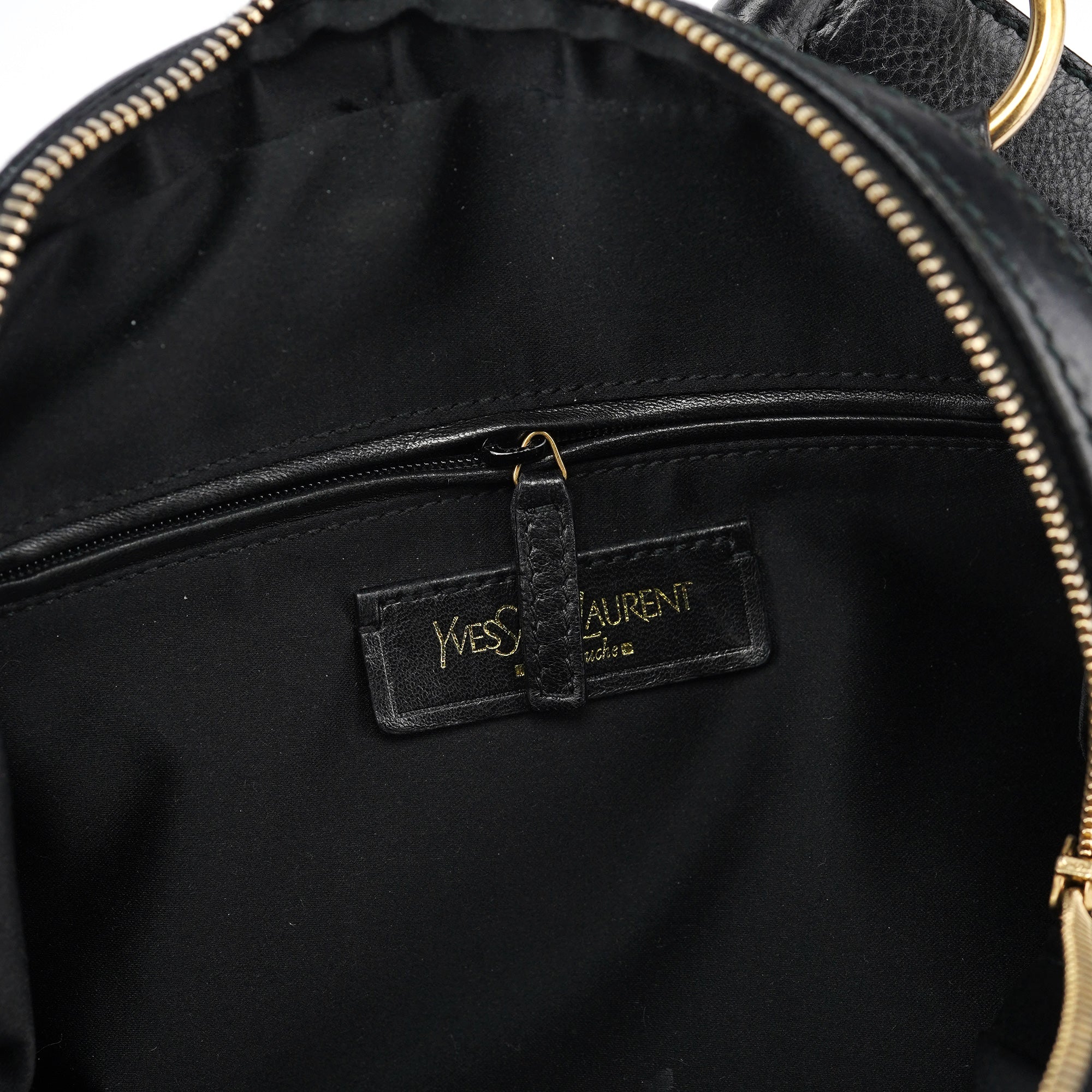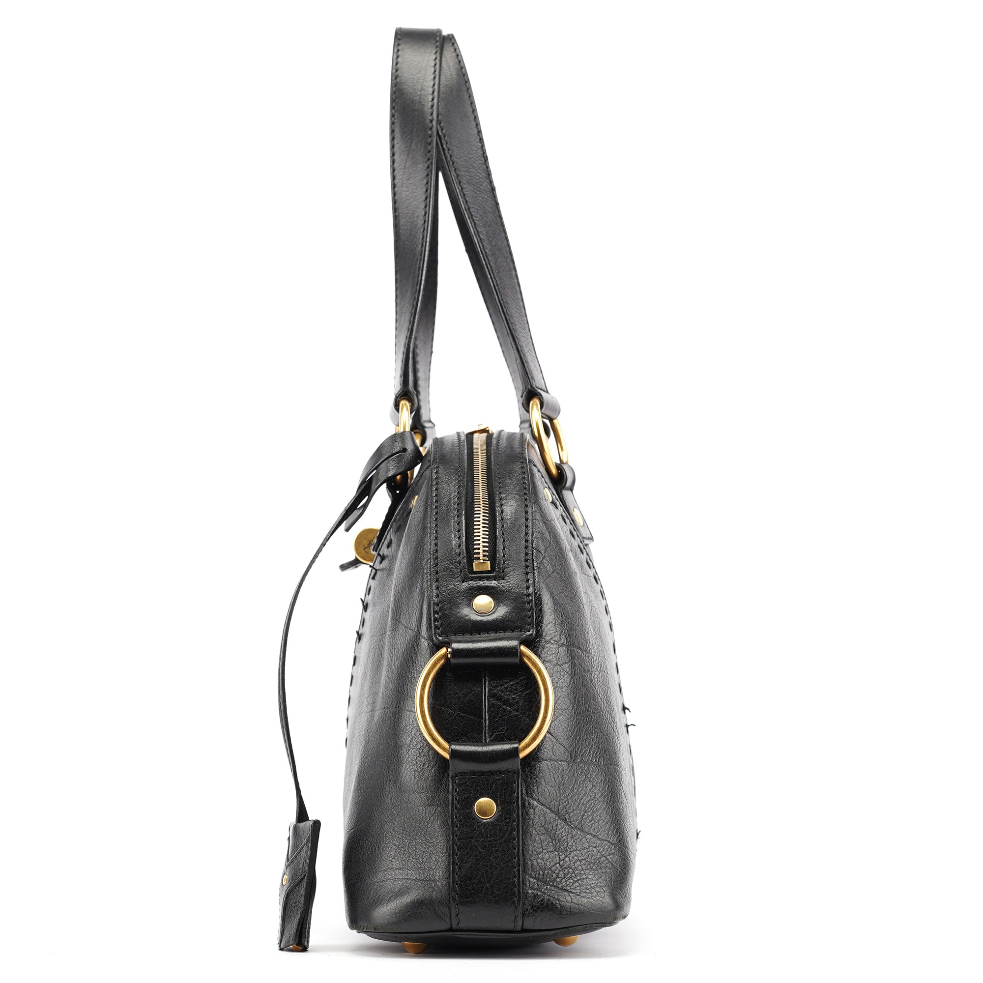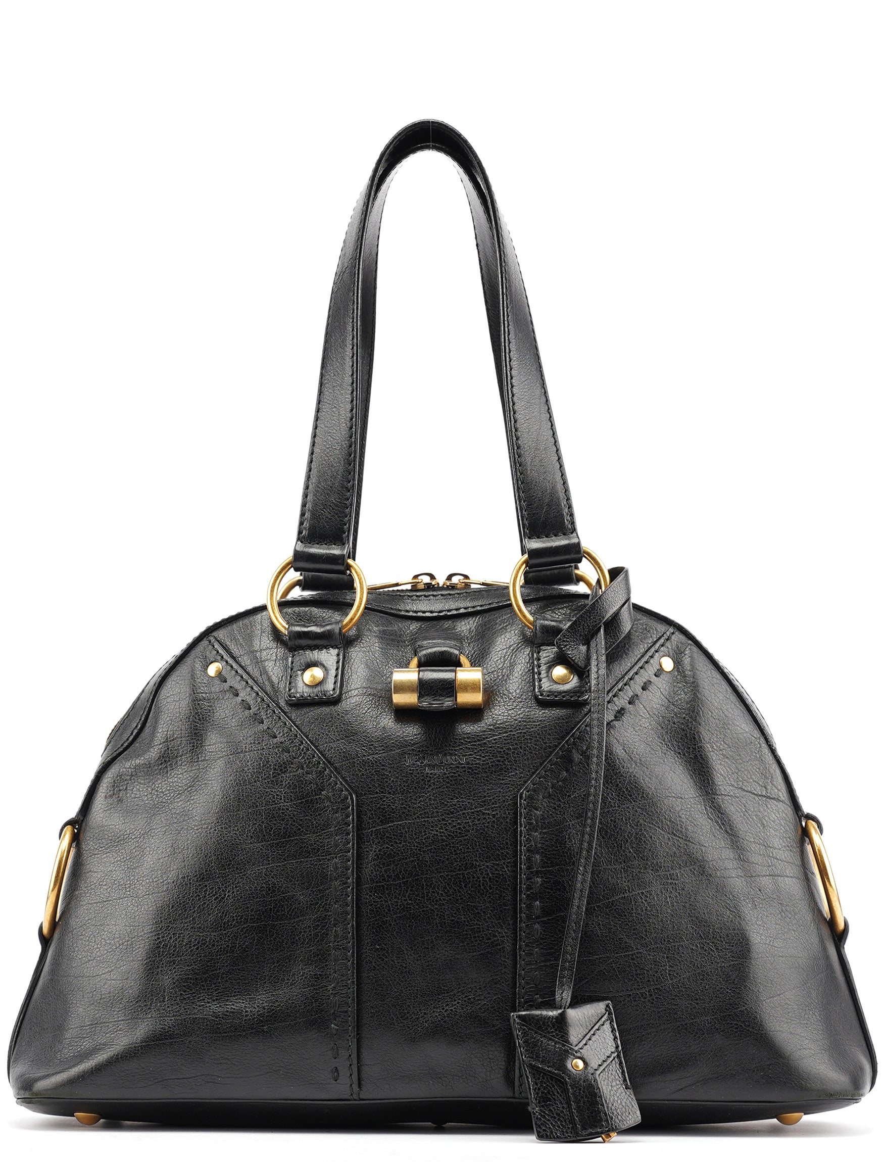 Designed in the late 2000s, this vintage Yves Saint Laurent Muse shoulder bag exemplifies the model's architectural elegance in smooth black leather. The iconic dome silhouette features the signature oversized gold-tone hardware, including bamboo-inspired ring handles and the distinctive turn-lock closure that made this design a modern classic.