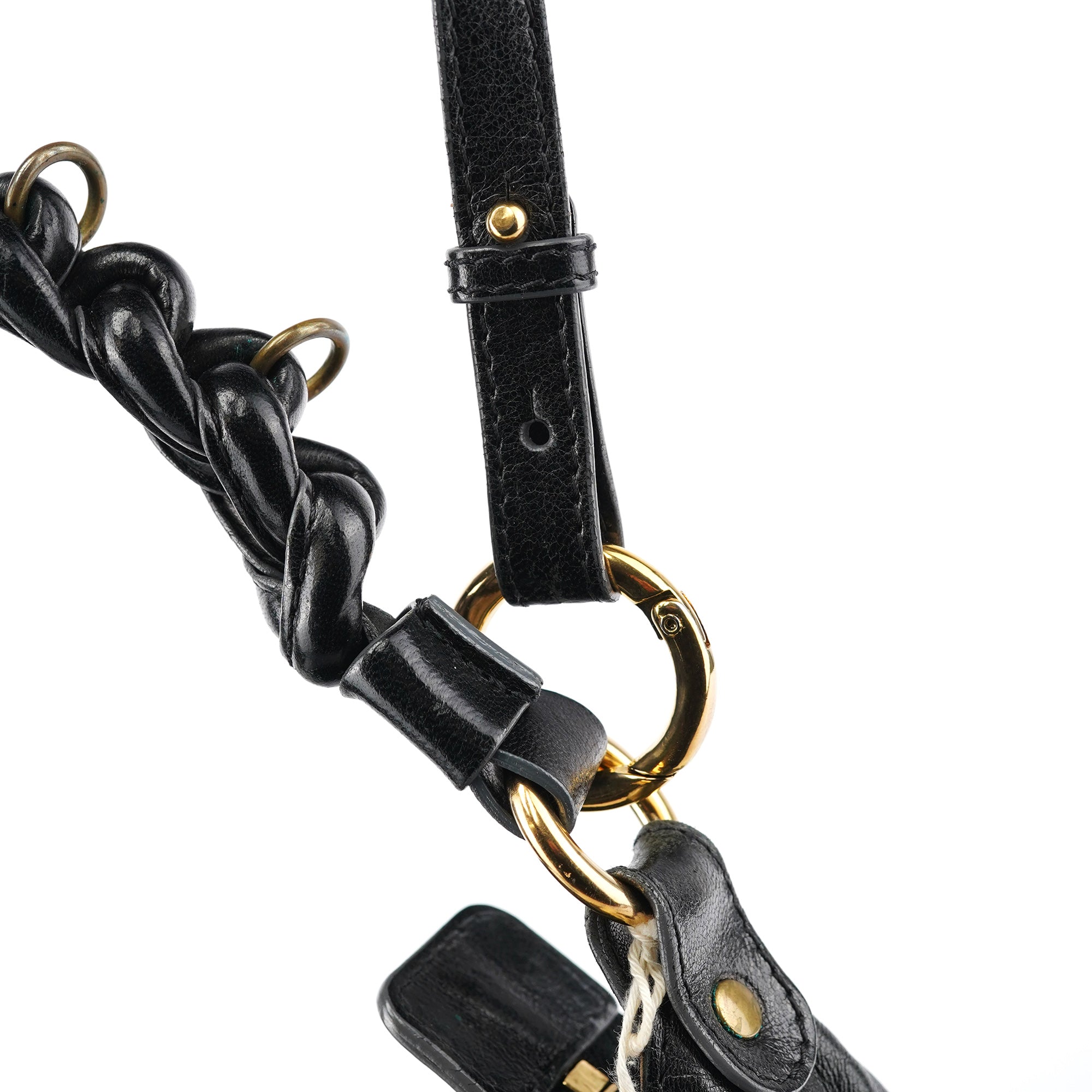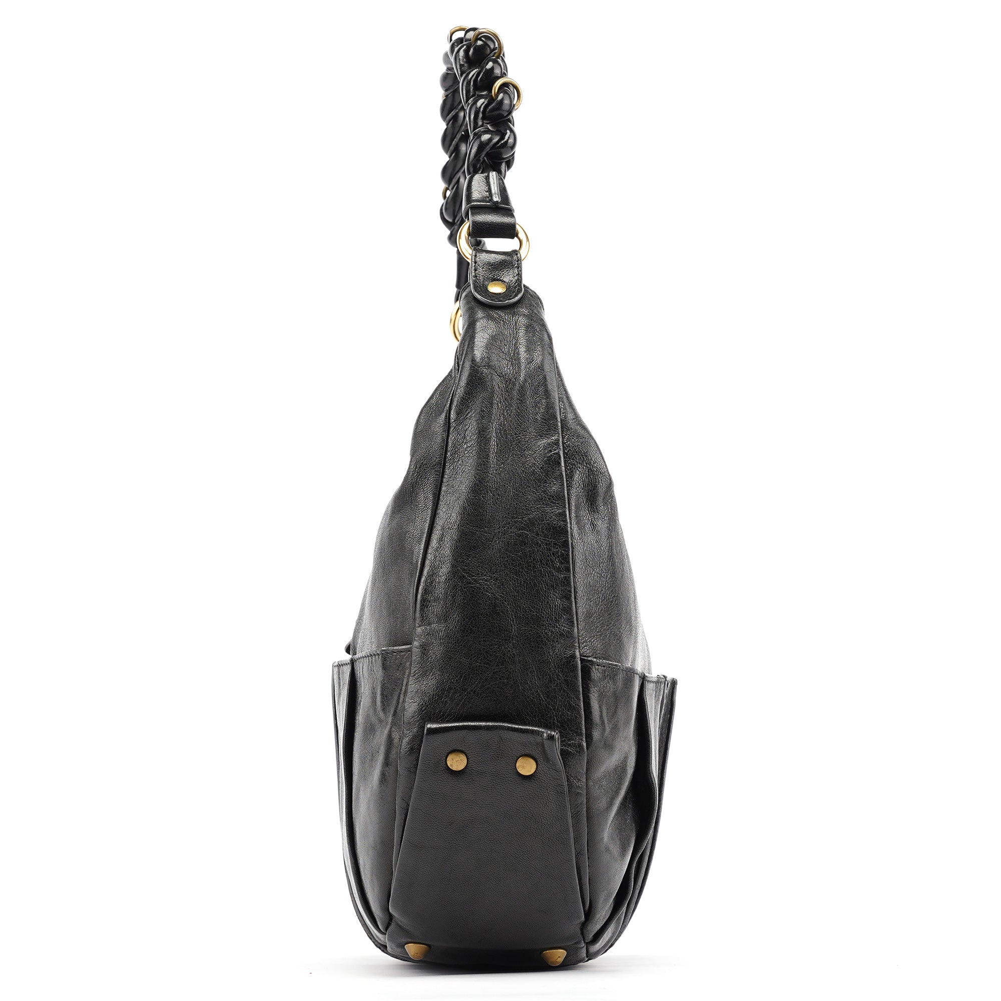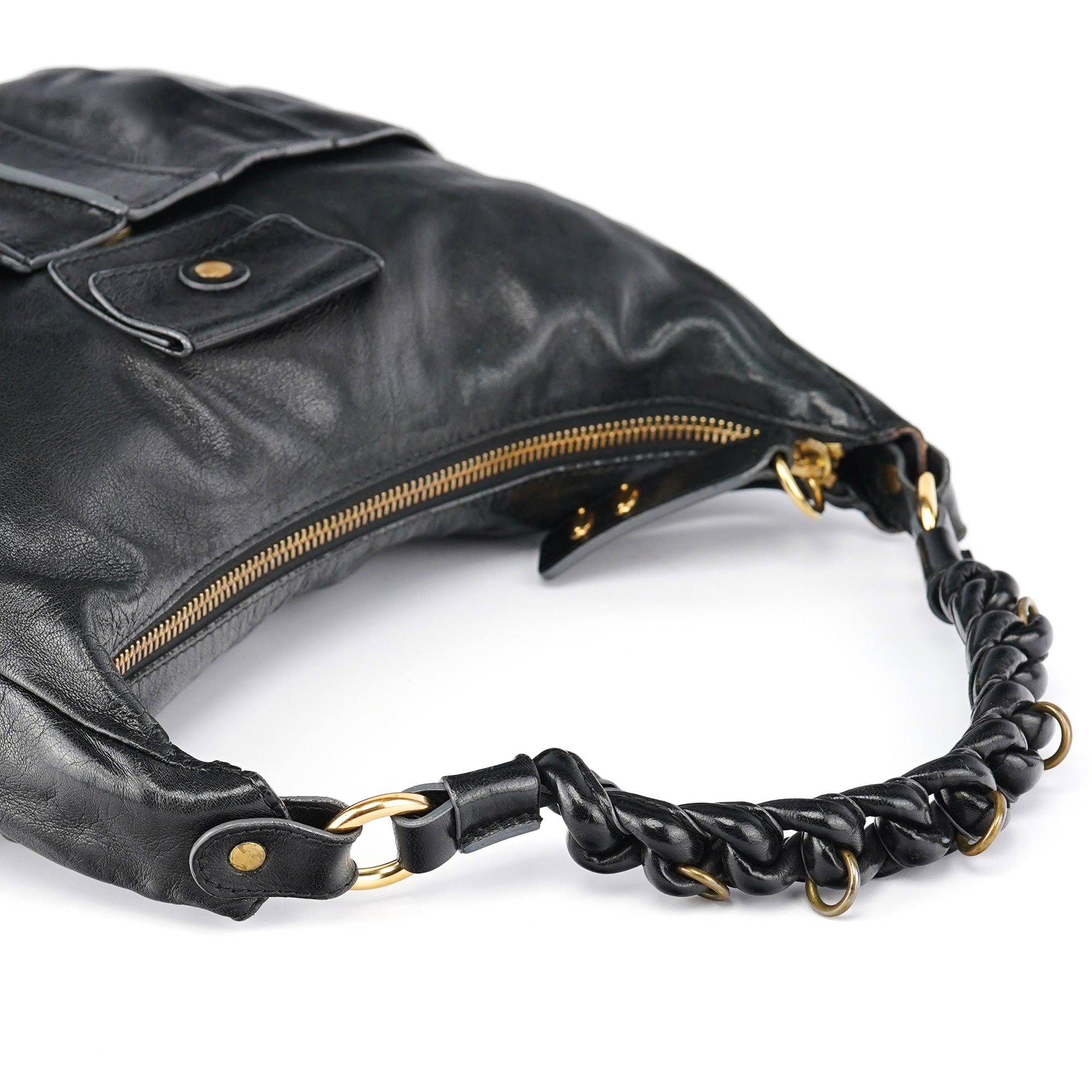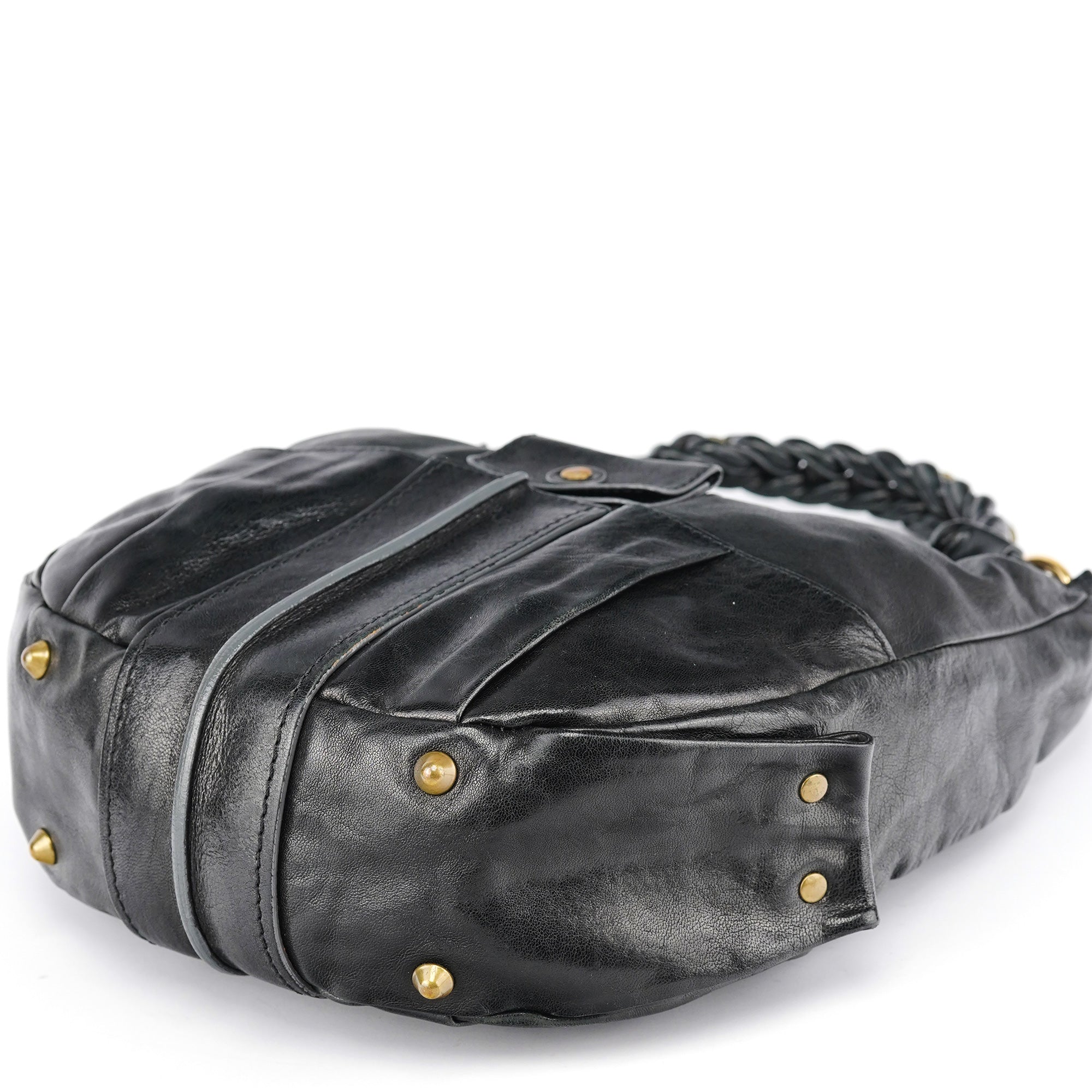 Designed in the mid-2000s by Phoebe Philo, this vintage Chloé Heloise 2-way hobo shoulder bag showcases supple black leather with the model's signature bobby braided detailing. The distinctive curved silhouette features gold-tone hardware throughout, including decorative studs and a snap closure, with a spacious interior lined in beige canvas housing two exterior pockets and one inner pocket.