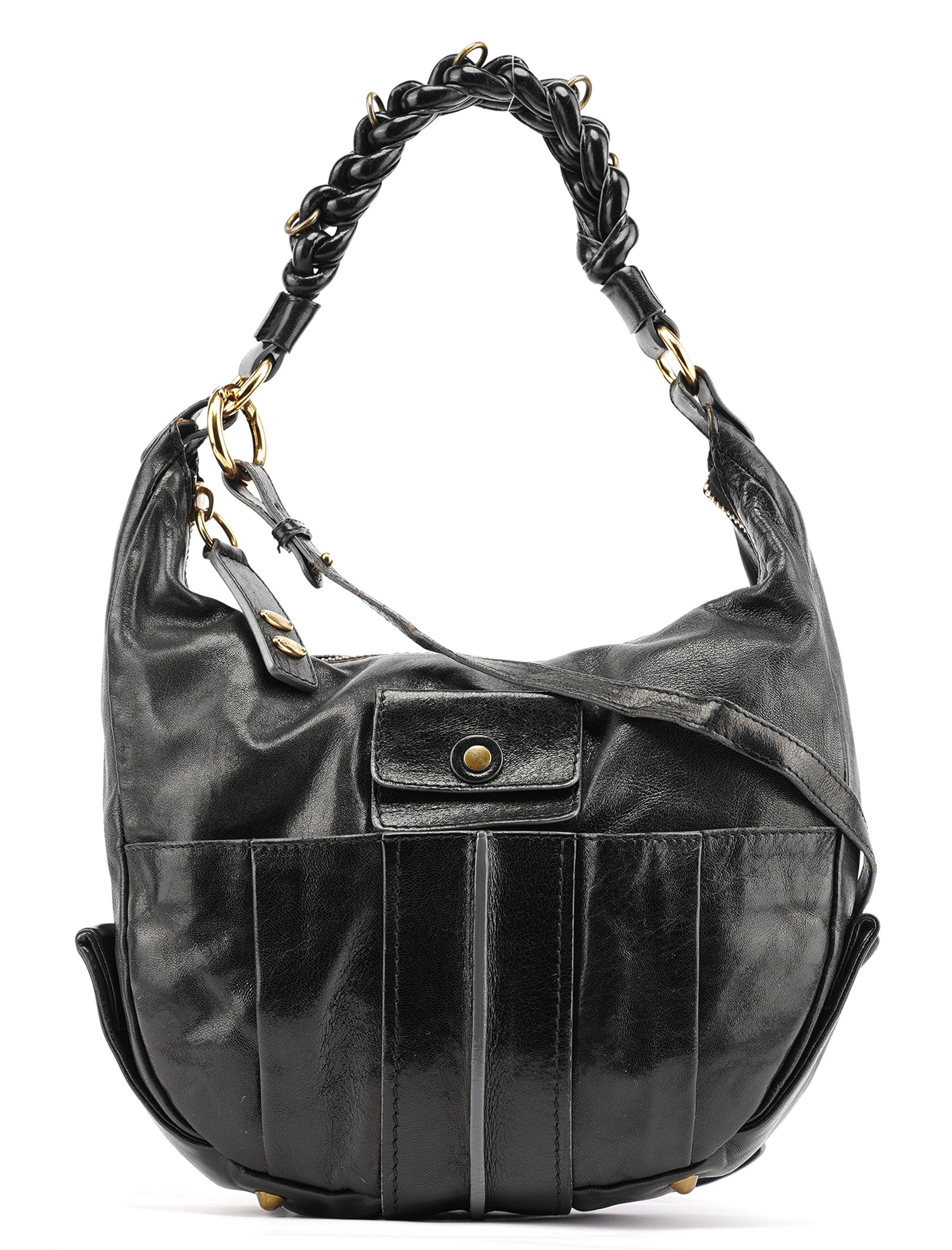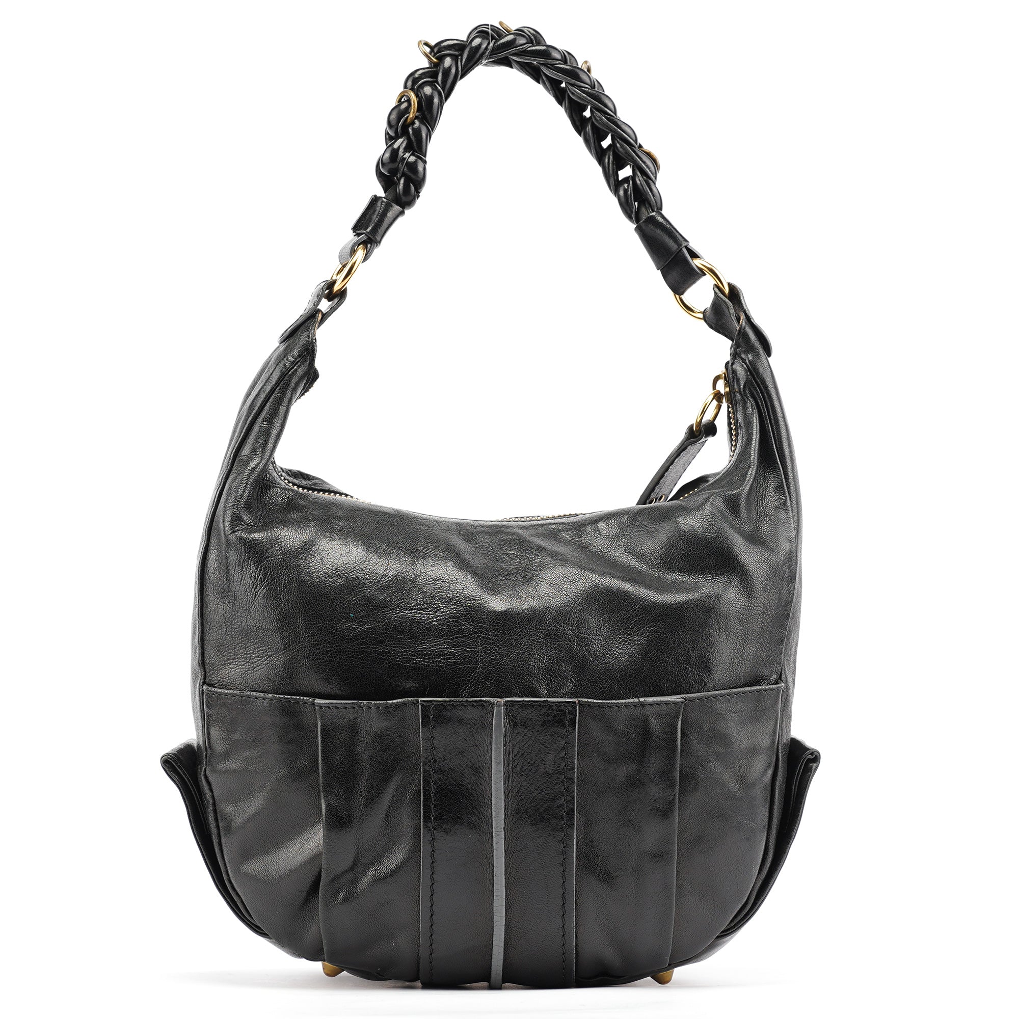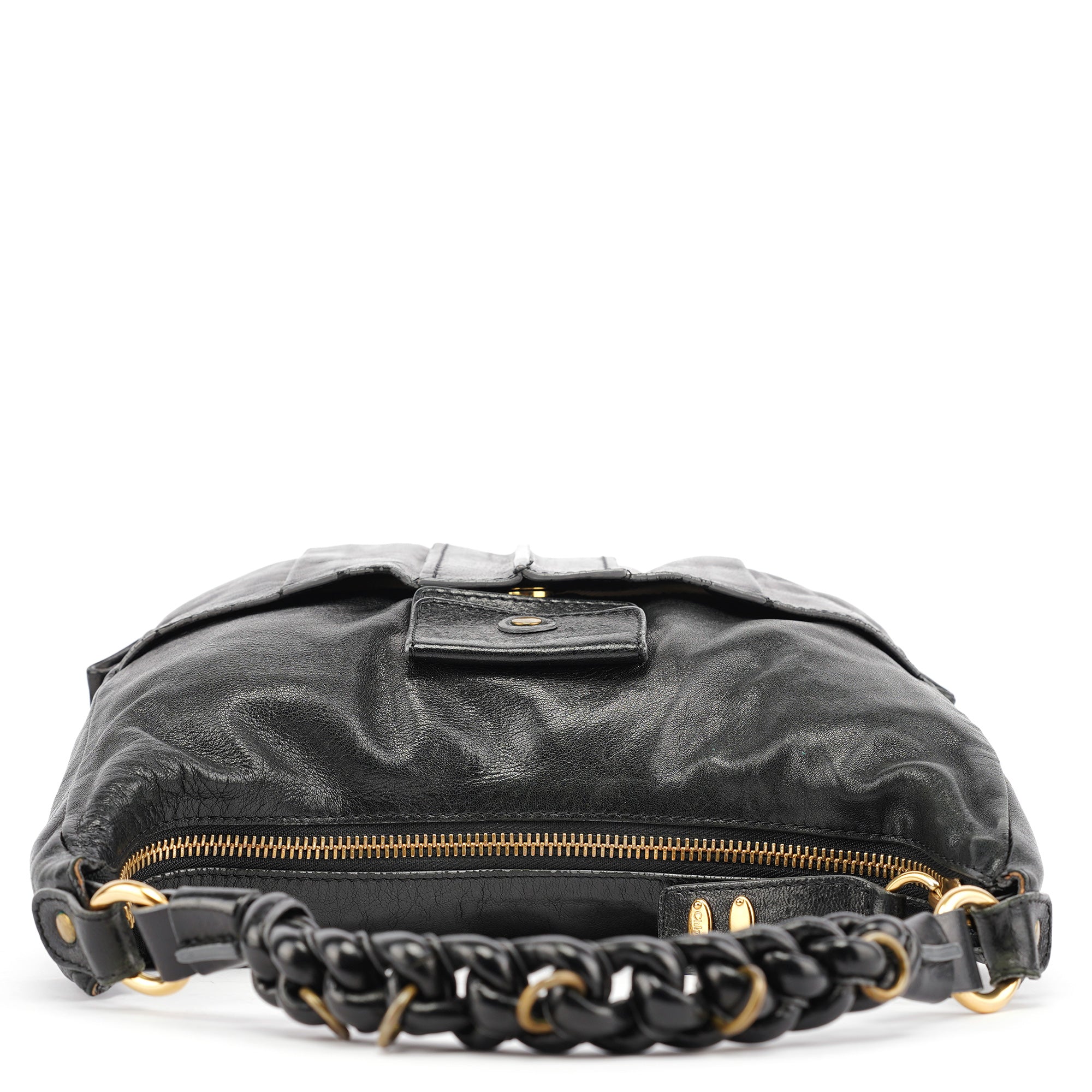 Designed in the mid-2000s by Phoebe Philo, this vintage Chloé Heloise 2-way hobo shoulder bag showcases supple black leather with the model's signature bobby braided detailing. The distinctive curved silhouette features gold-tone hardware throughout, including decorative studs and a snap closure, with a spacious interior lined in beige canvas housing two exterior pockets and one inner pocket.