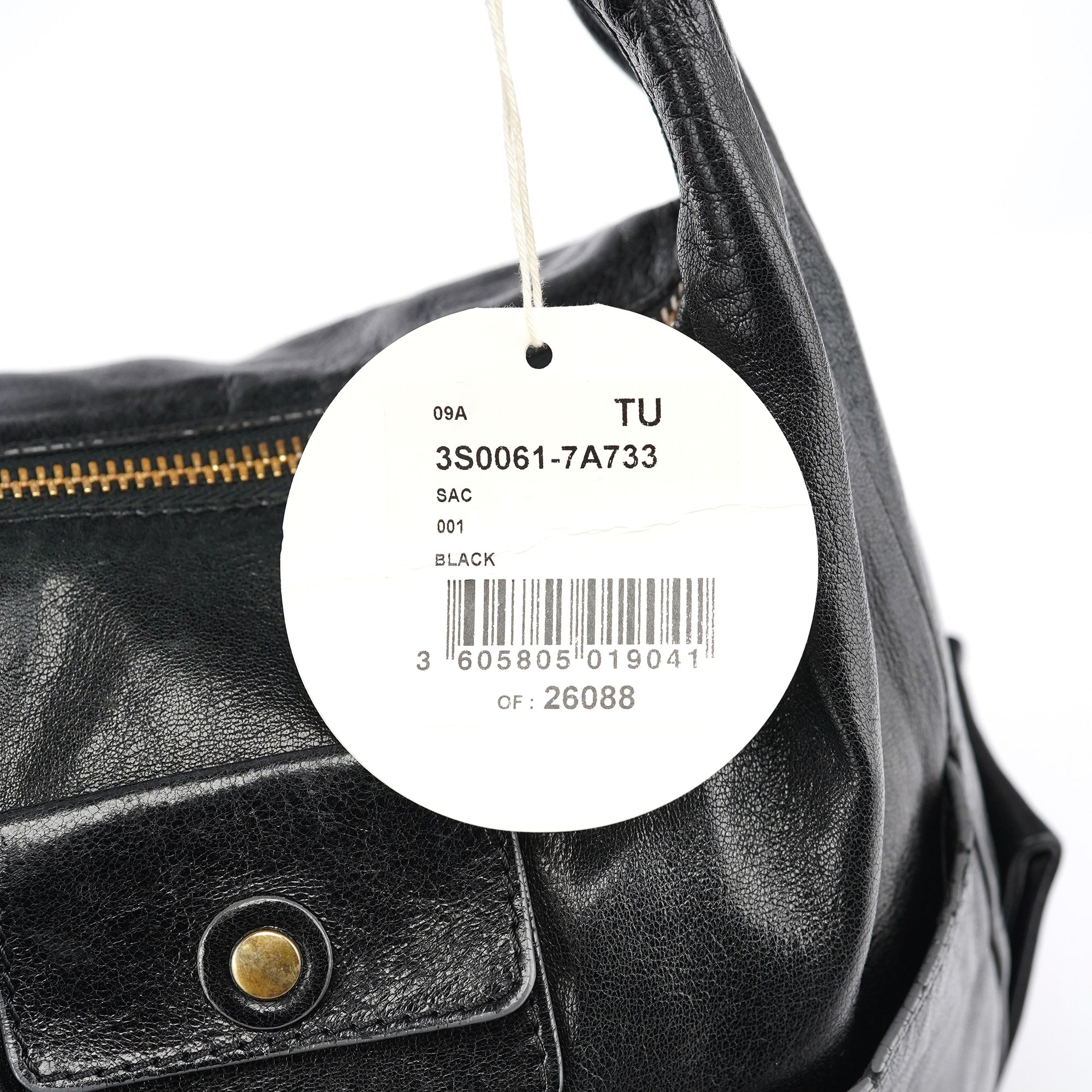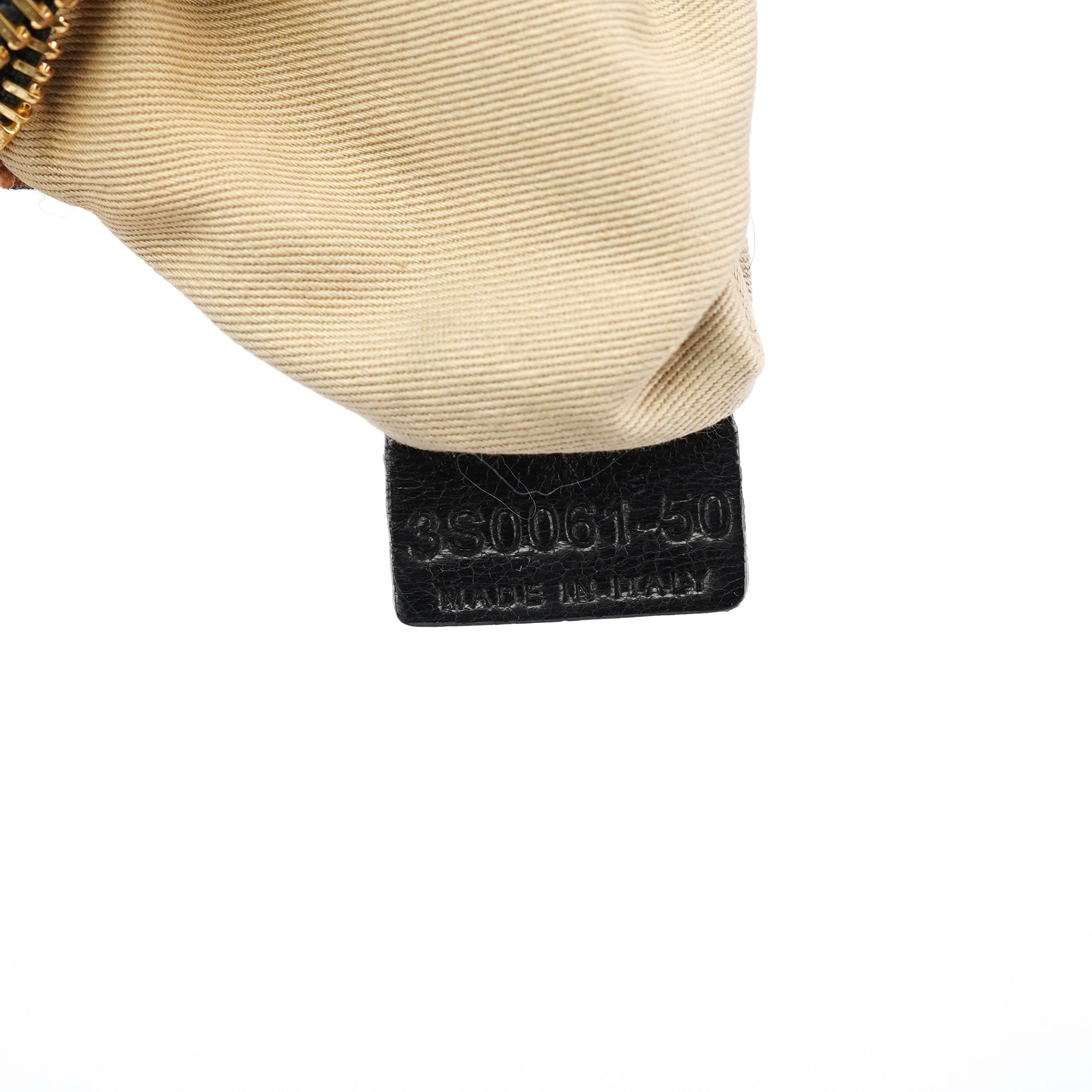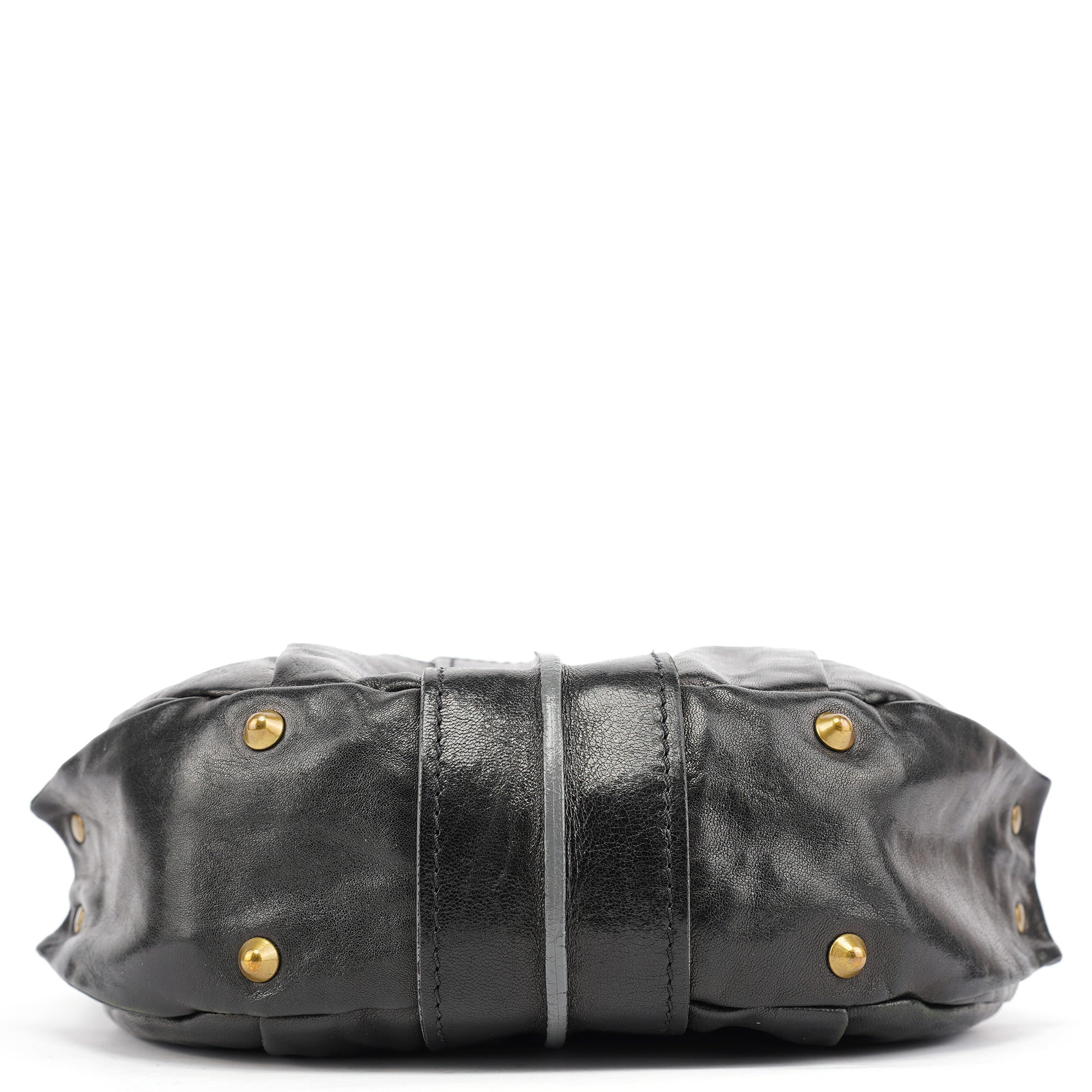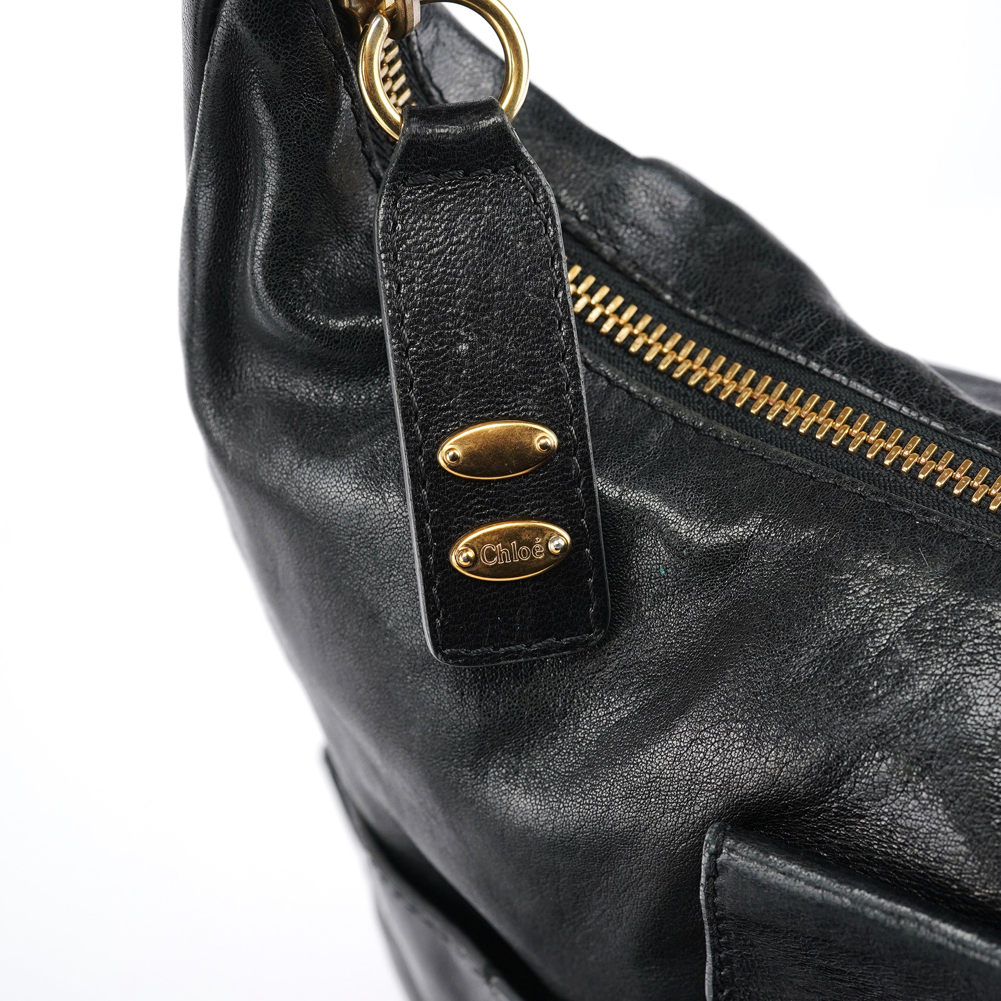 Designed in the mid-2000s by Phoebe Philo, this vintage Chloé Heloise 2-way hobo shoulder bag showcases supple black leather with the model's signature bobby braided detailing. The distinctive curved silhouette features gold-tone hardware throughout, including decorative studs and a snap closure, with a spacious interior lined in beige canvas housing two exterior pockets and one inner pocket.