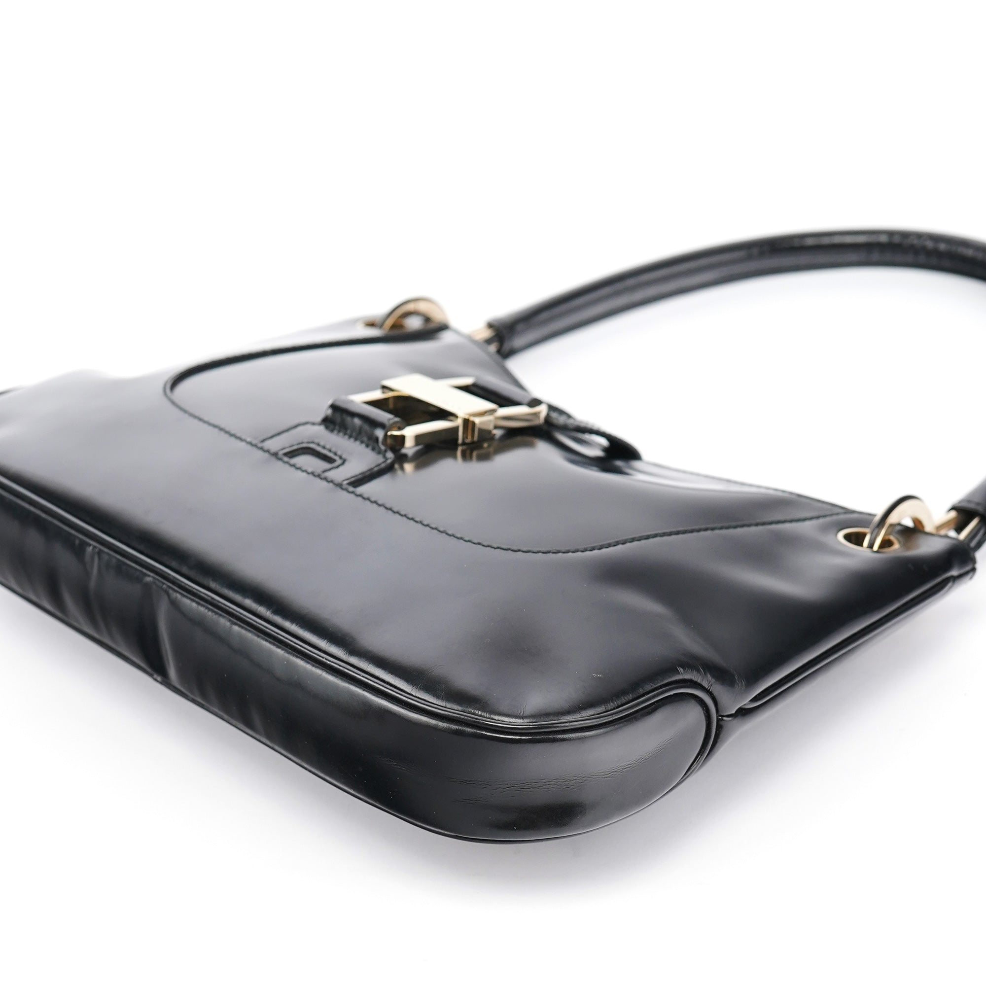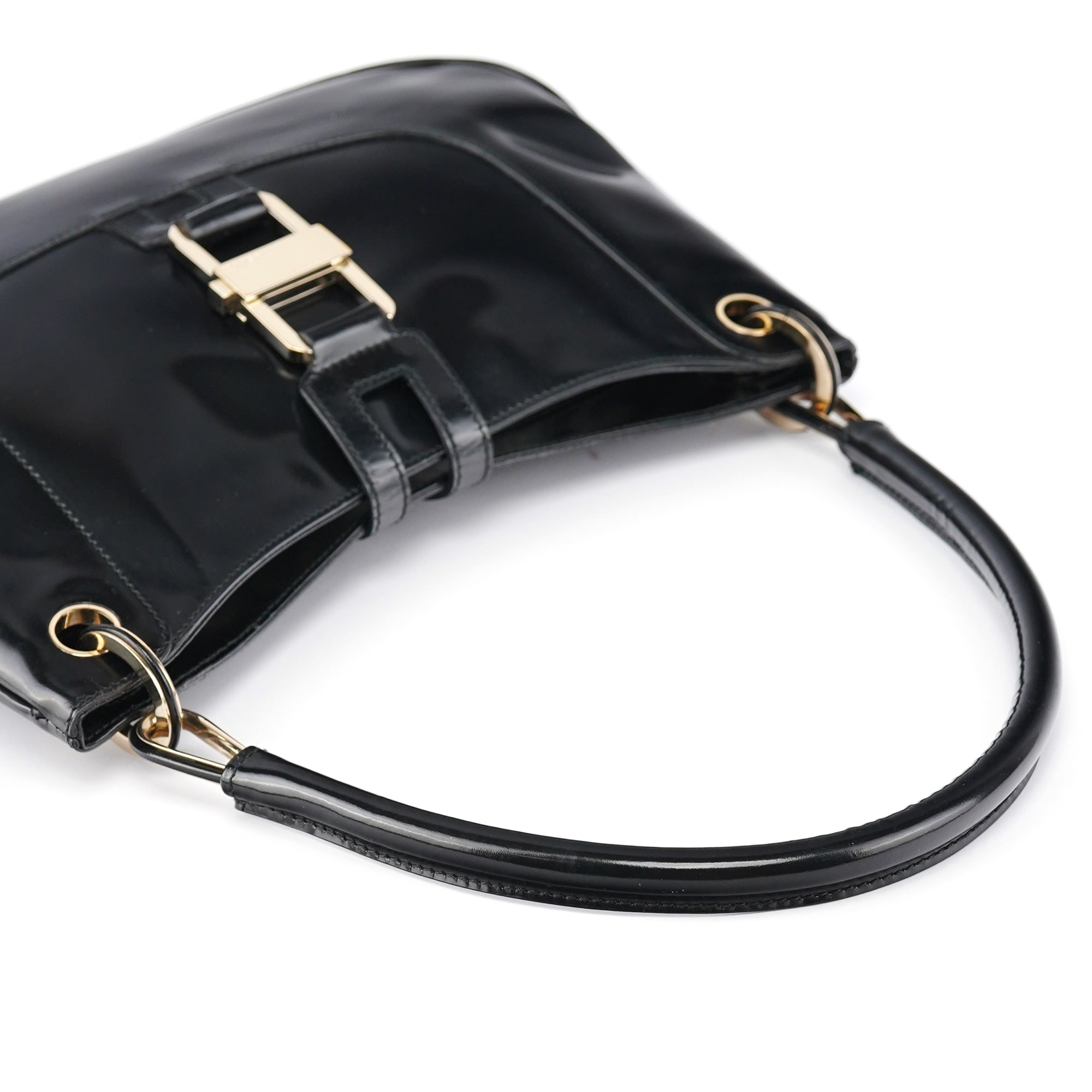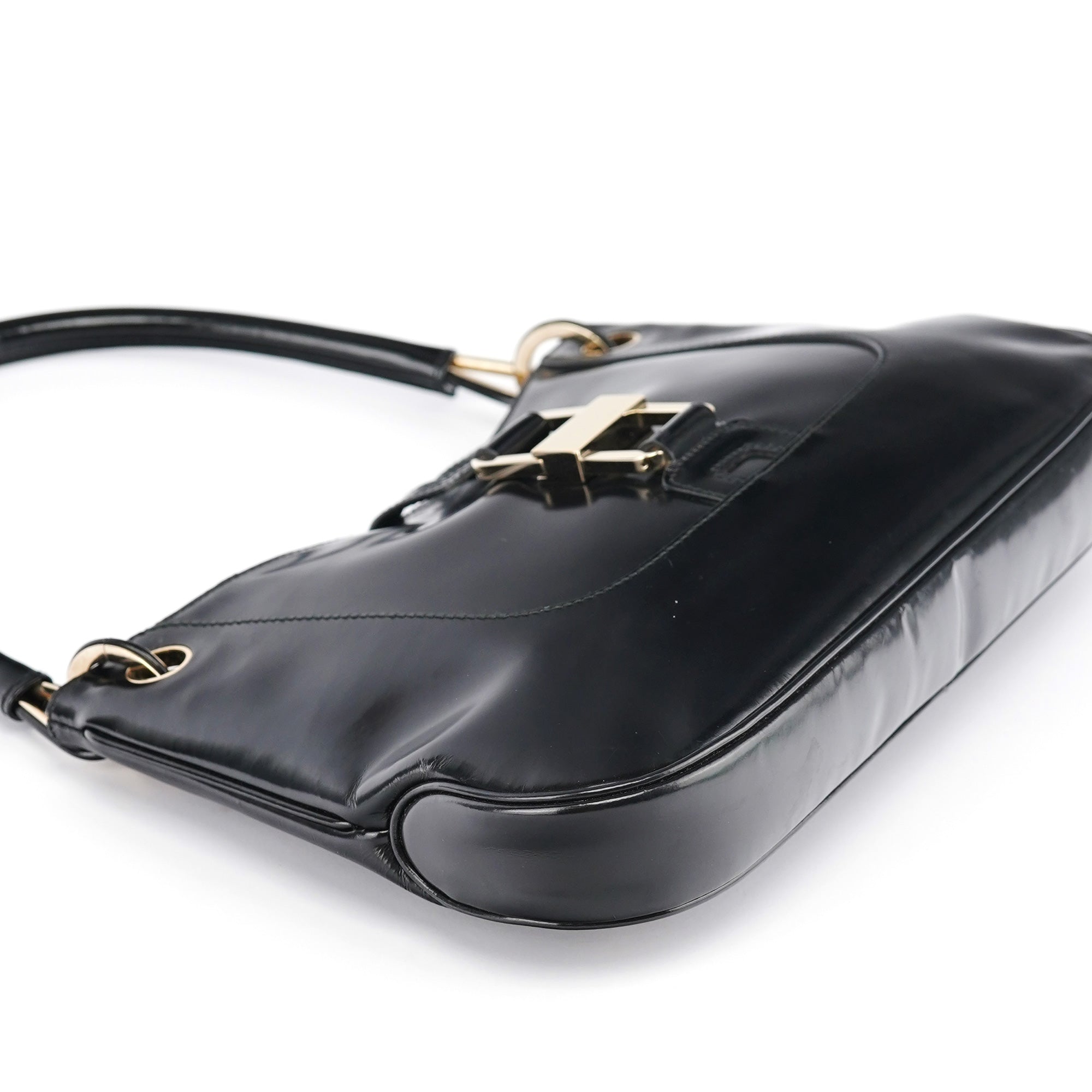 Designed in the early 2000s by Tom Ford, this vintage Gucci Jackie shoulder bag reimagines the house's 1960s icon in glossy black patent leather. The bag features the signature piston closure with gold-tone hardware, single shoulder strap with ring attachments, and the classic hobo silhouette that made the Jackie an enduring symbol of Italian elegance. The interior is lined in monogram fabric with internal pockets for organization.