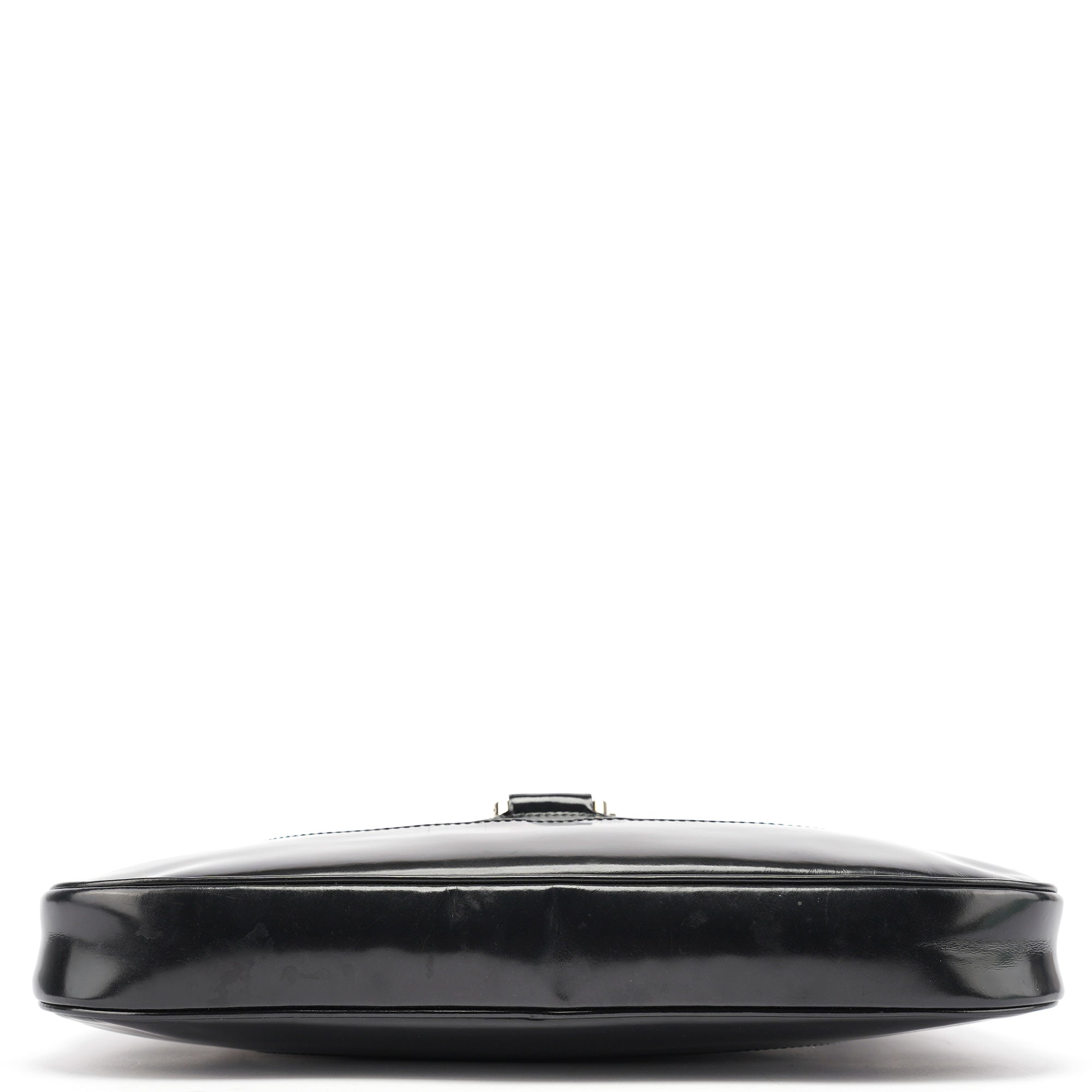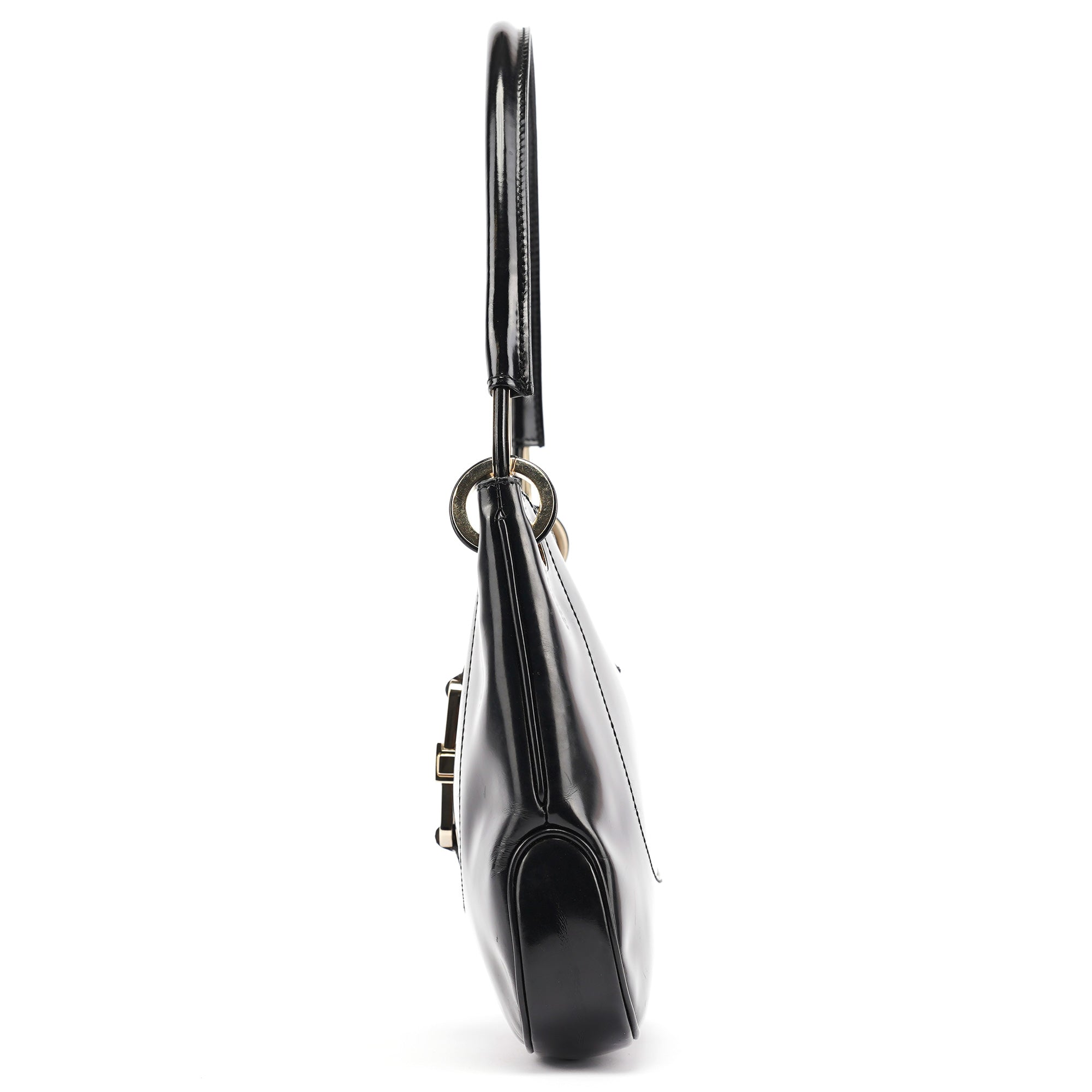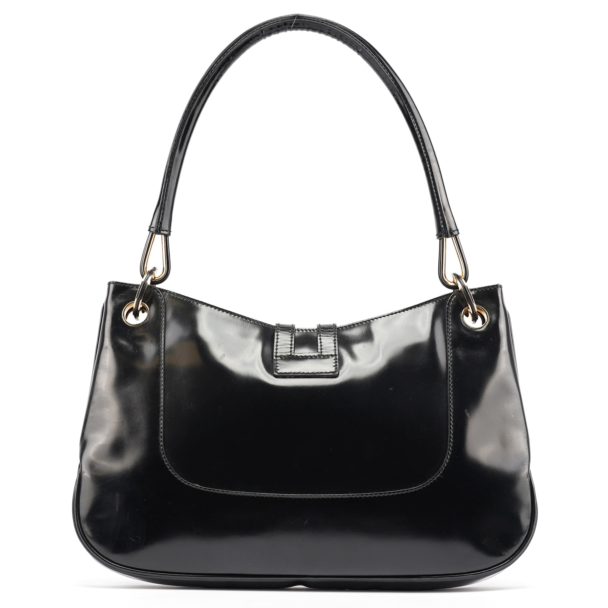 Designed in the early 2000s by Tom Ford, this vintage Gucci Jackie shoulder bag reimagines the house's 1960s icon in glossy black patent leather. The bag features the signature piston closure with gold-tone hardware, single shoulder strap with ring attachments, and the classic hobo silhouette that made the Jackie an enduring symbol of Italian elegance. The interior is lined in monogram fabric with internal pockets for organization.