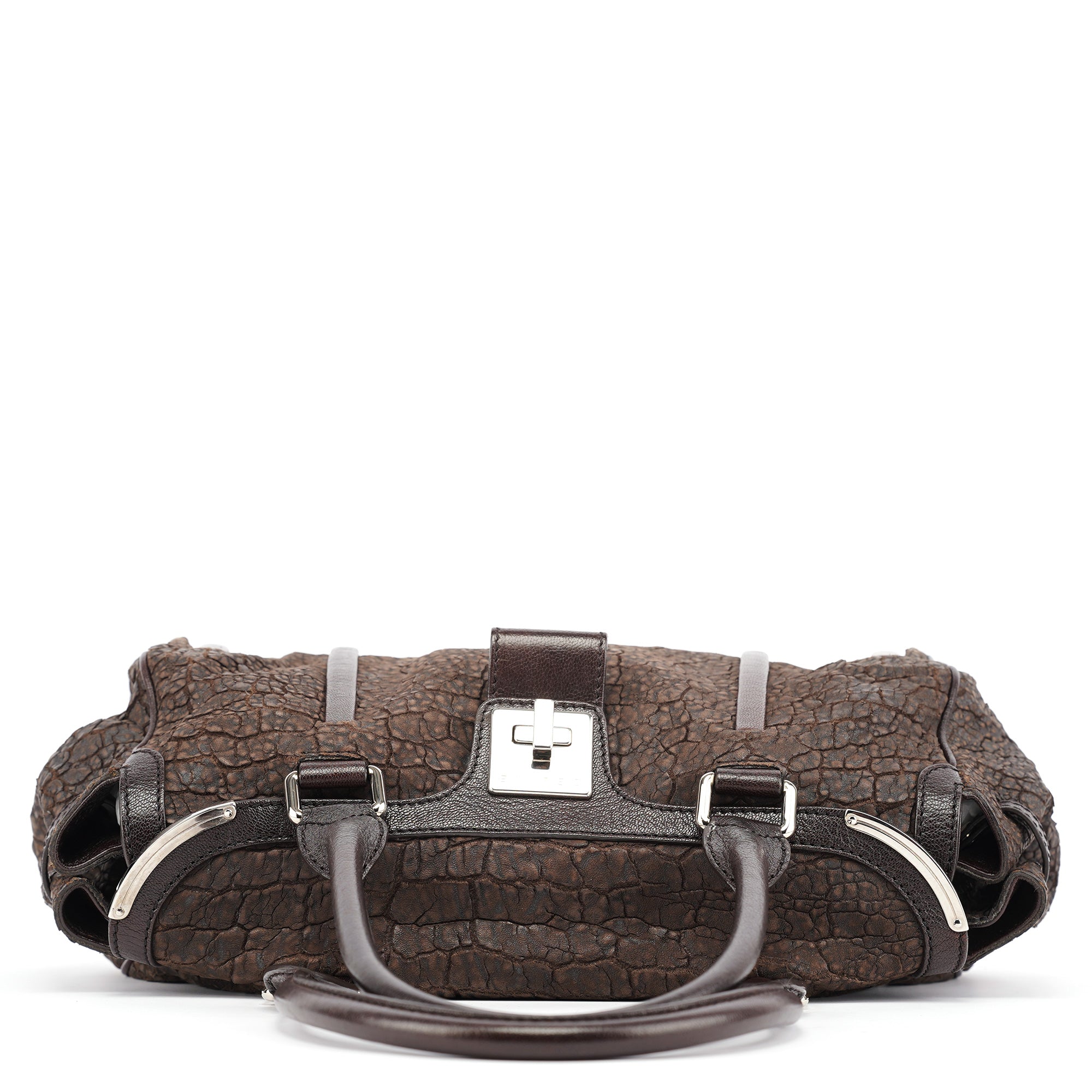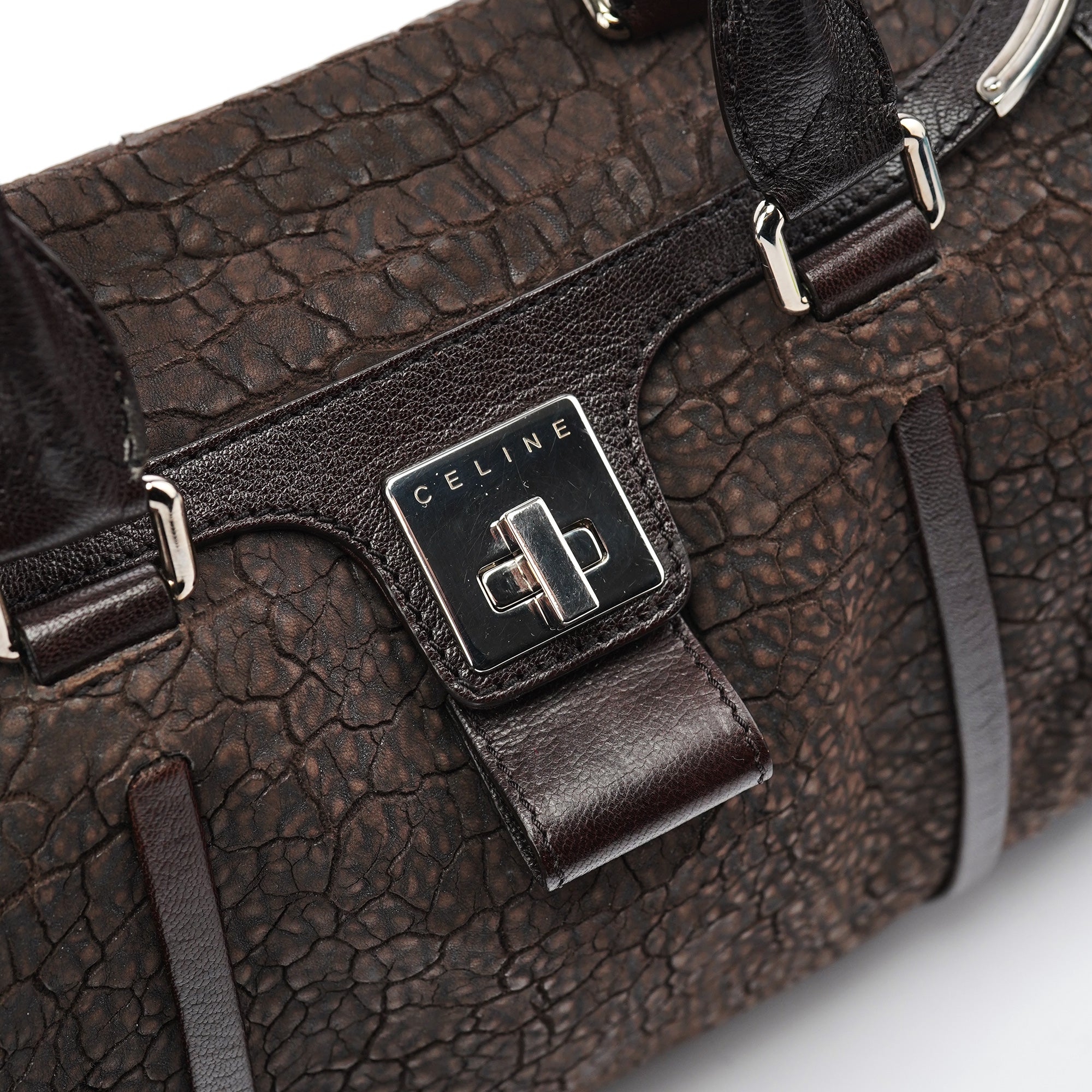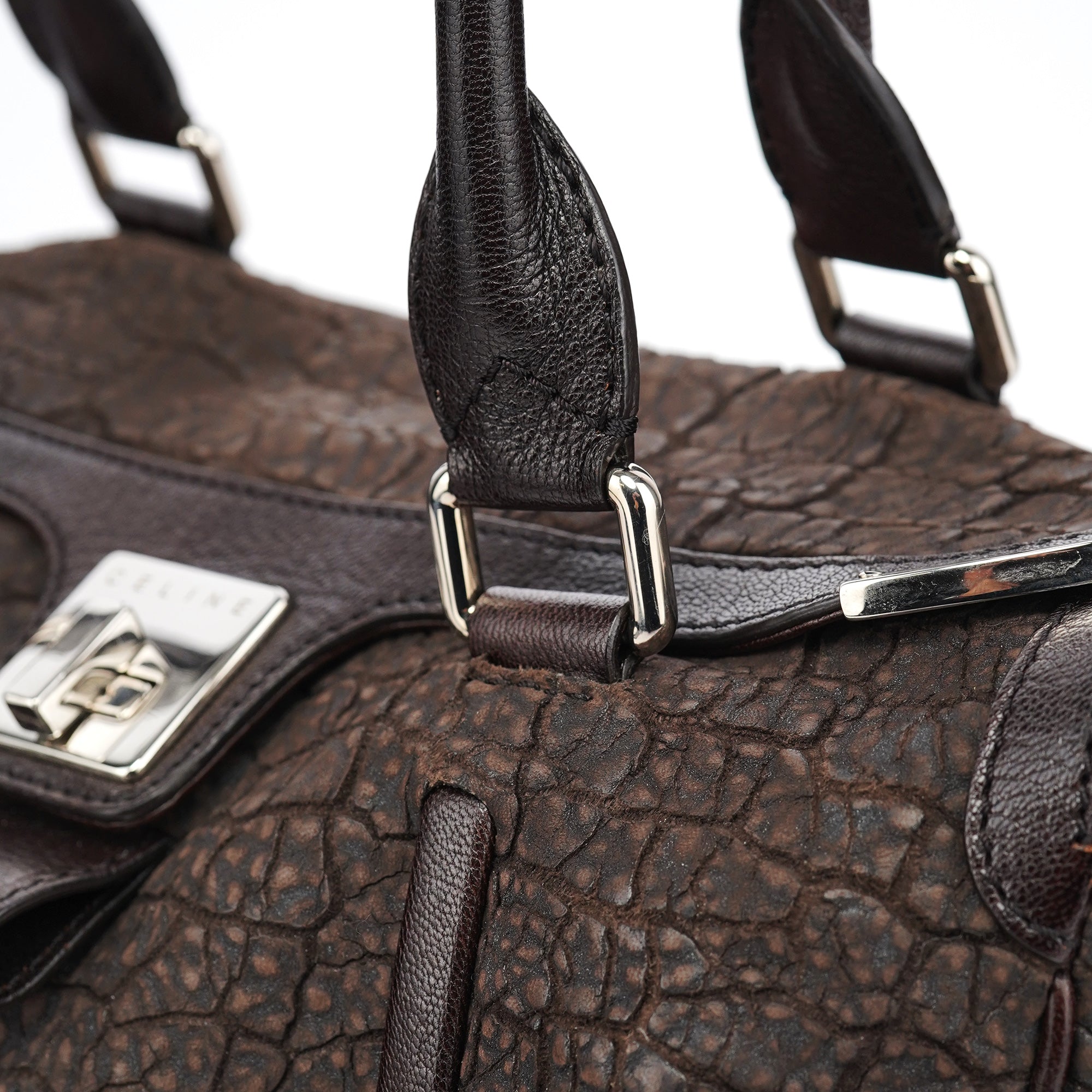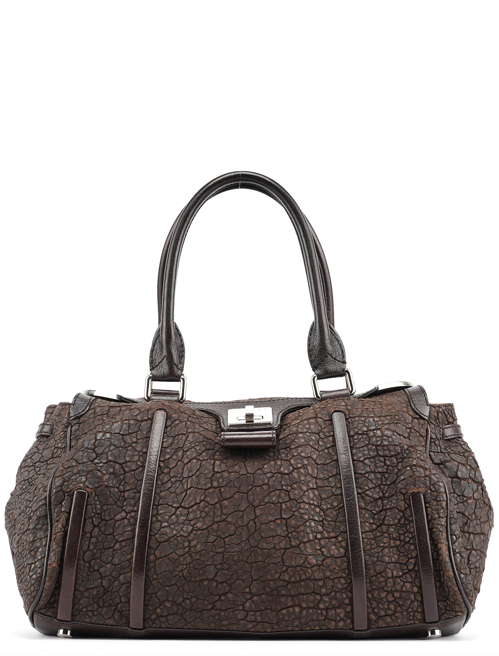 Designed in the mid-2000s, this vintage Céline tote features distinctive crackled brown leather with a unique textured finish. The spacious doctor bag silhouette showcases the signature turnlock closure, dual top handles, and silver-tone hardware. The structured design includes both zippered and open pockets for practical organization.