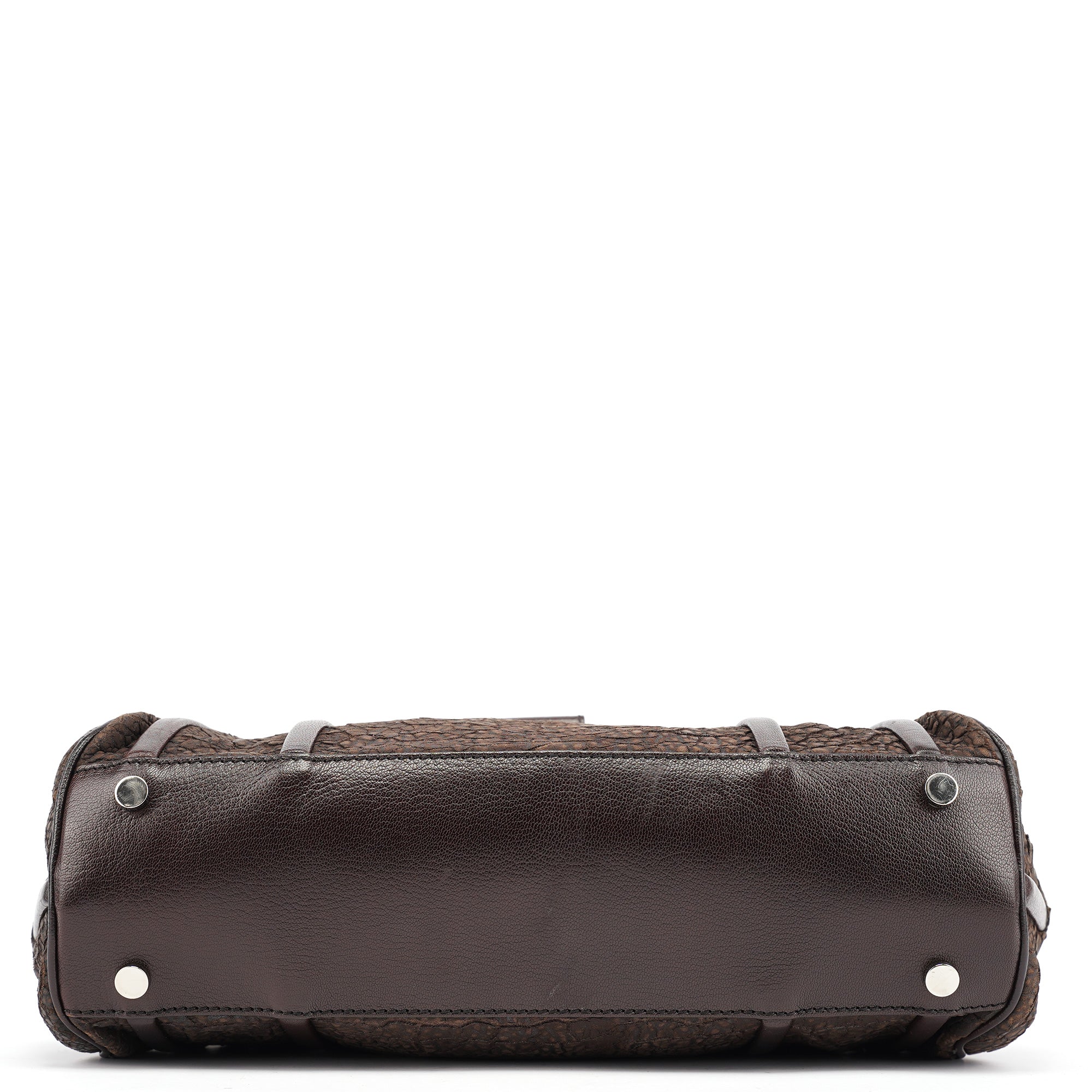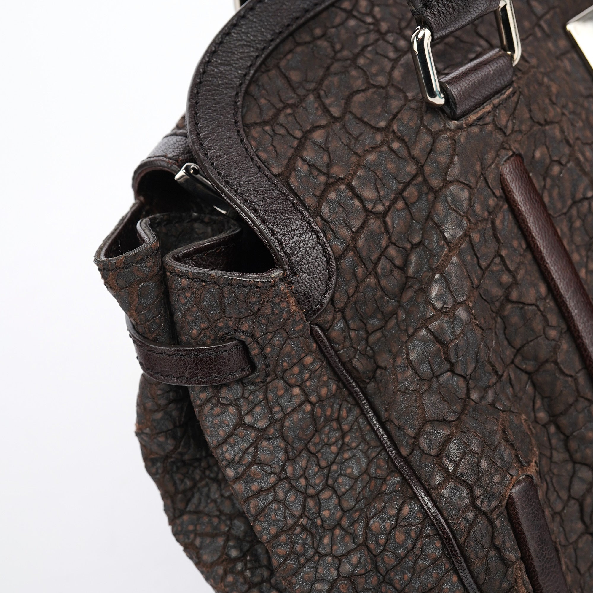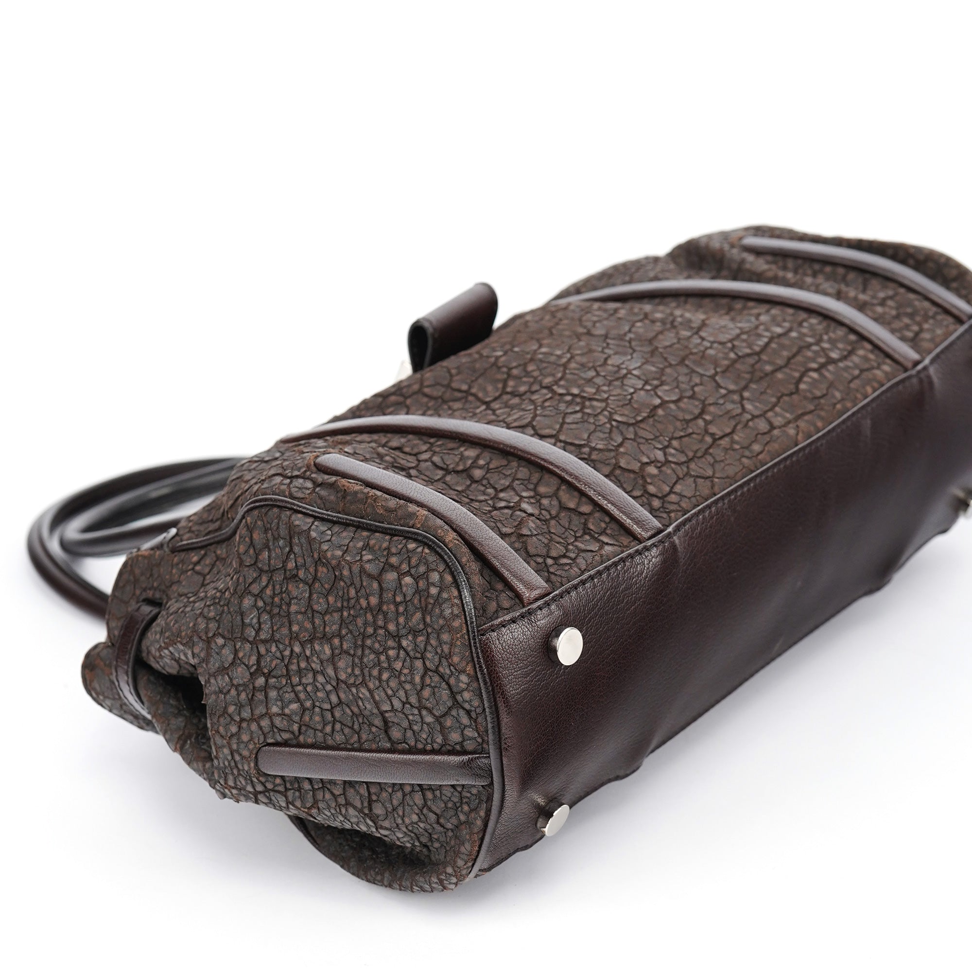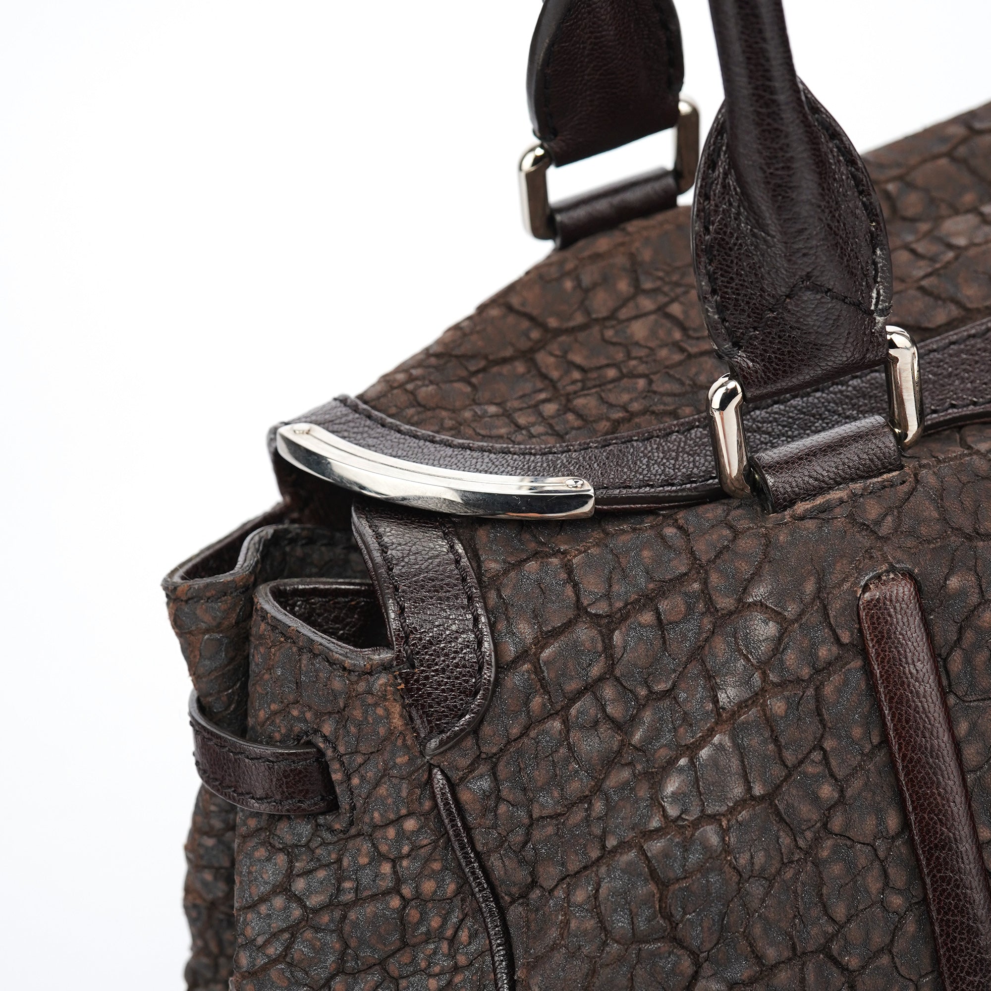 Designed in the mid-2000s, this vintage Céline tote features distinctive crackled brown leather with a unique textured finish. The spacious doctor bag silhouette showcases the signature turnlock closure, dual top handles, and silver-tone hardware. The structured design includes both zippered and open pockets for practical organization.