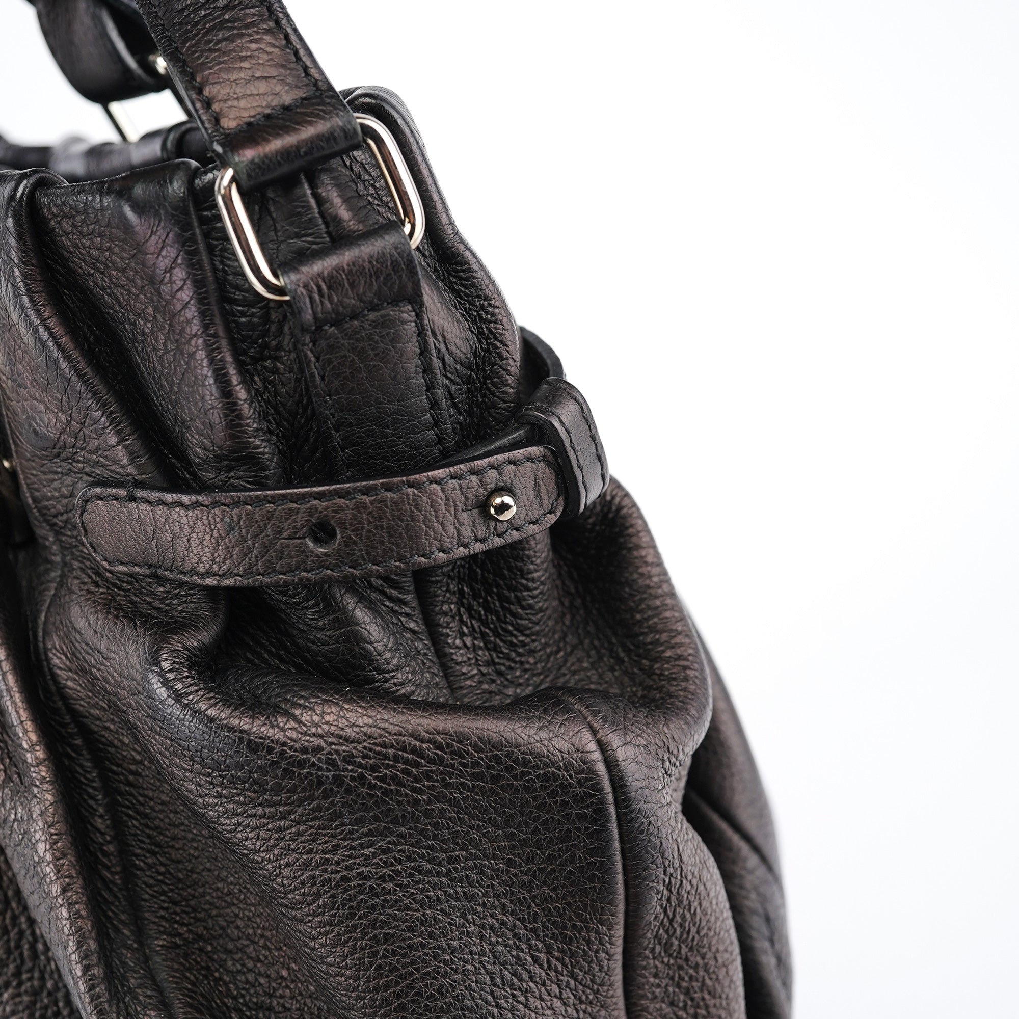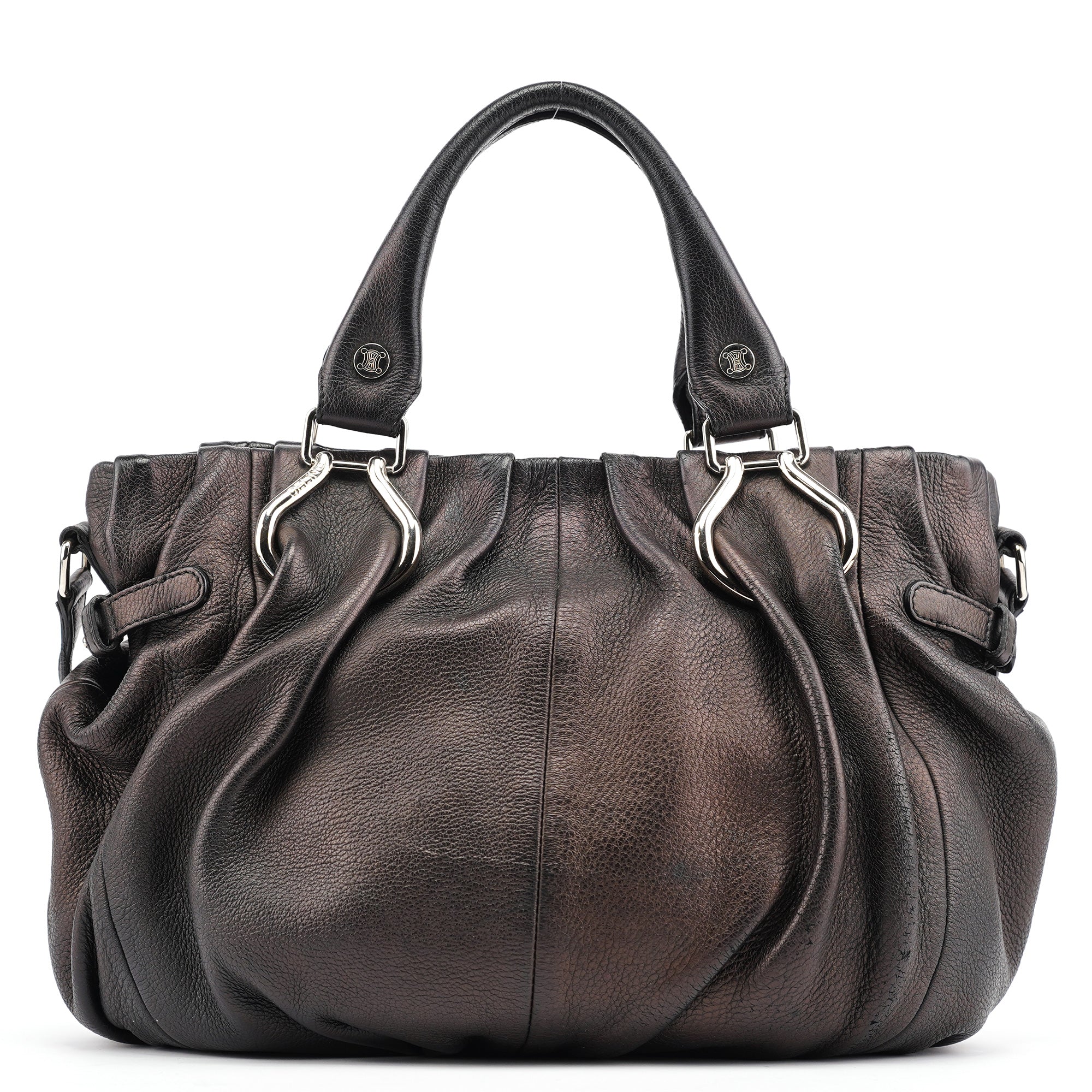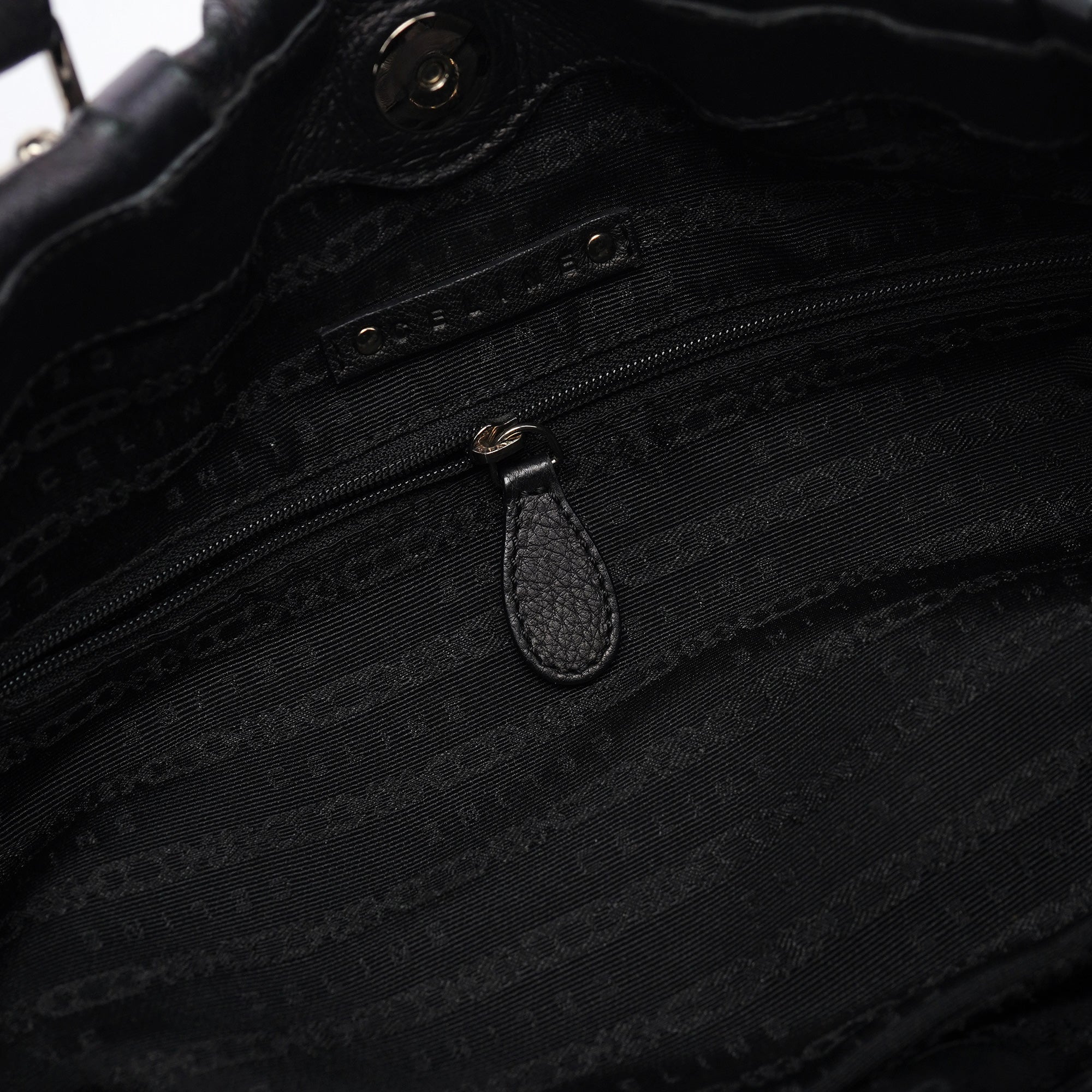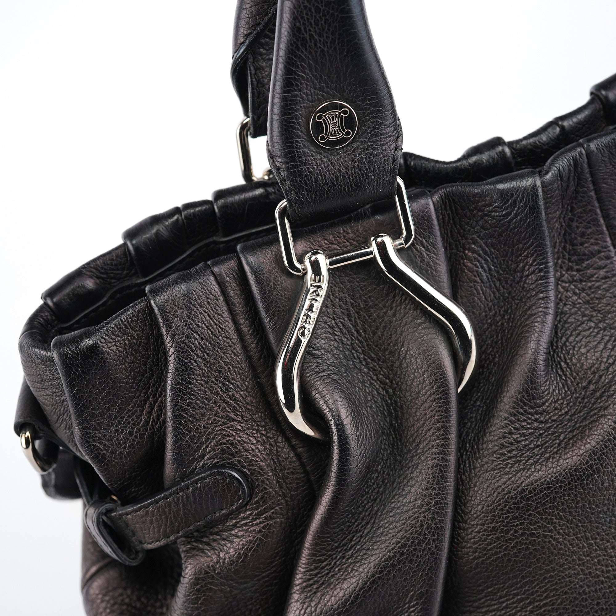 Designed in the early 2000s, this vintage Céline Pillow 2-way tote bag features supple dark metallic pebbled leather in a distinctive gathered pillow silhouette. The relaxed design showcases silver-tone hardware including the engraved triomphe logo charm, dual top handles, and an adjustable shoulder strap for versatile 2-way styling.