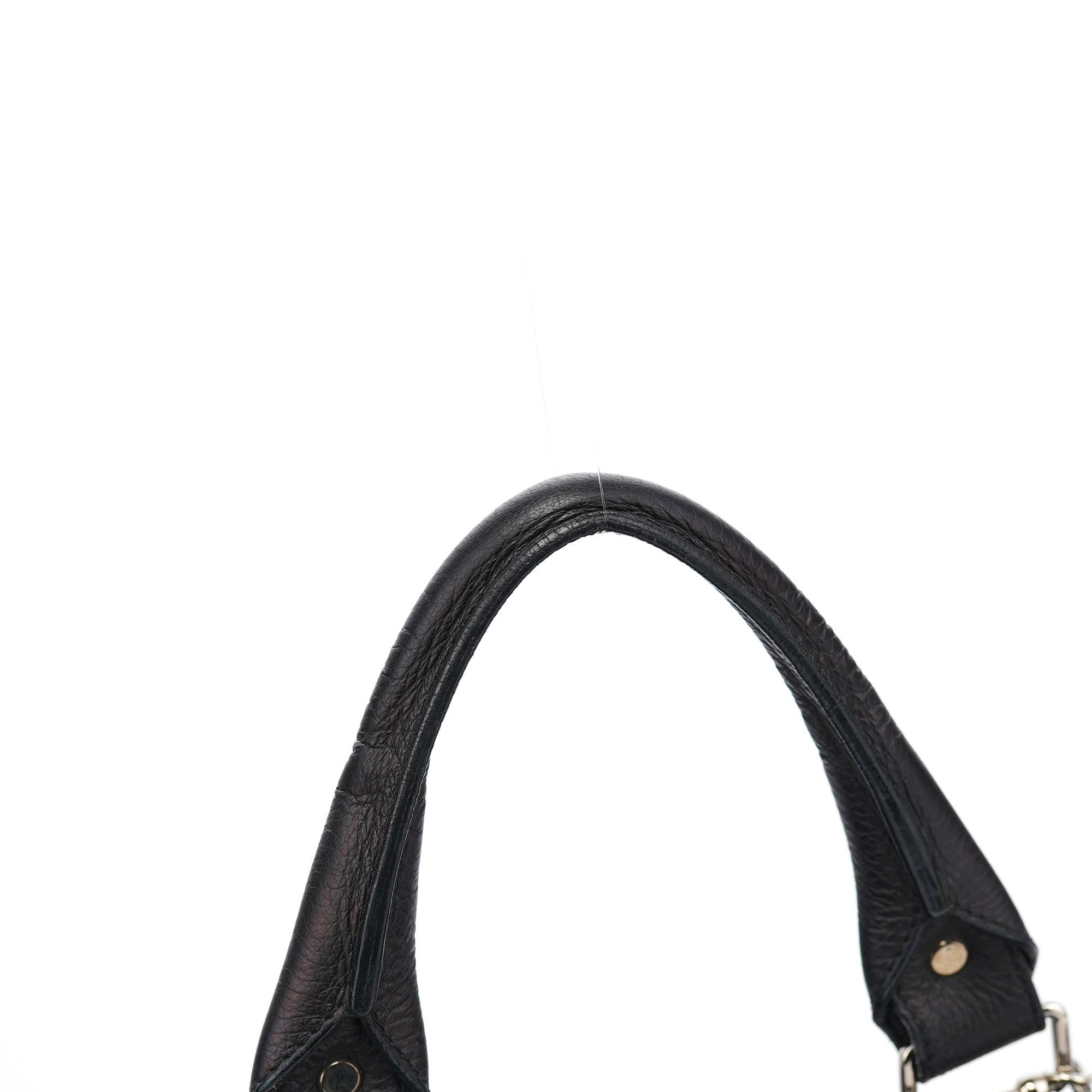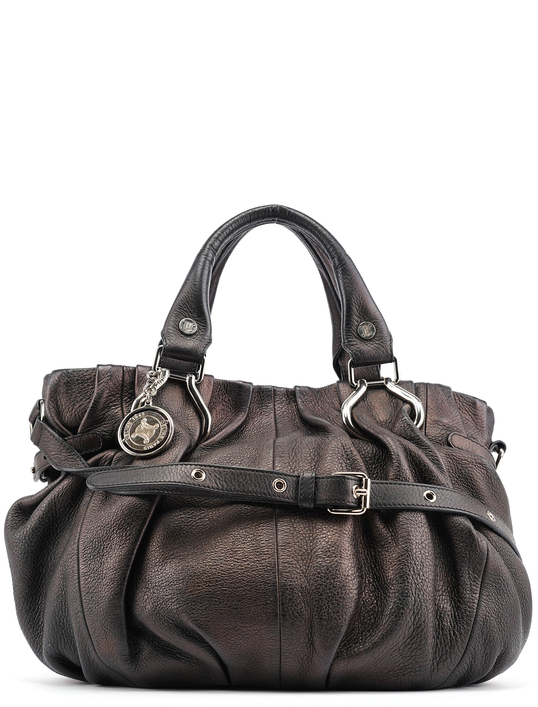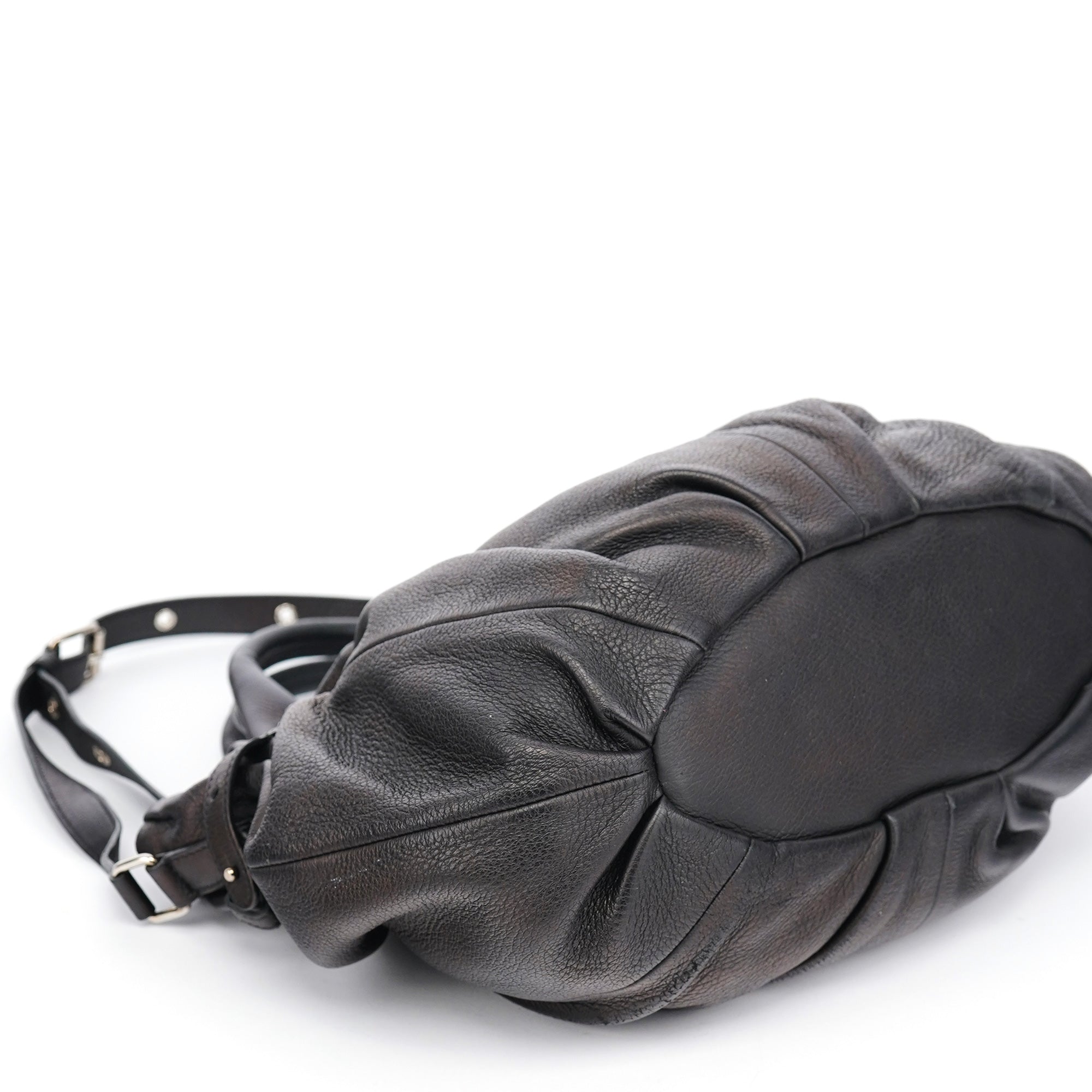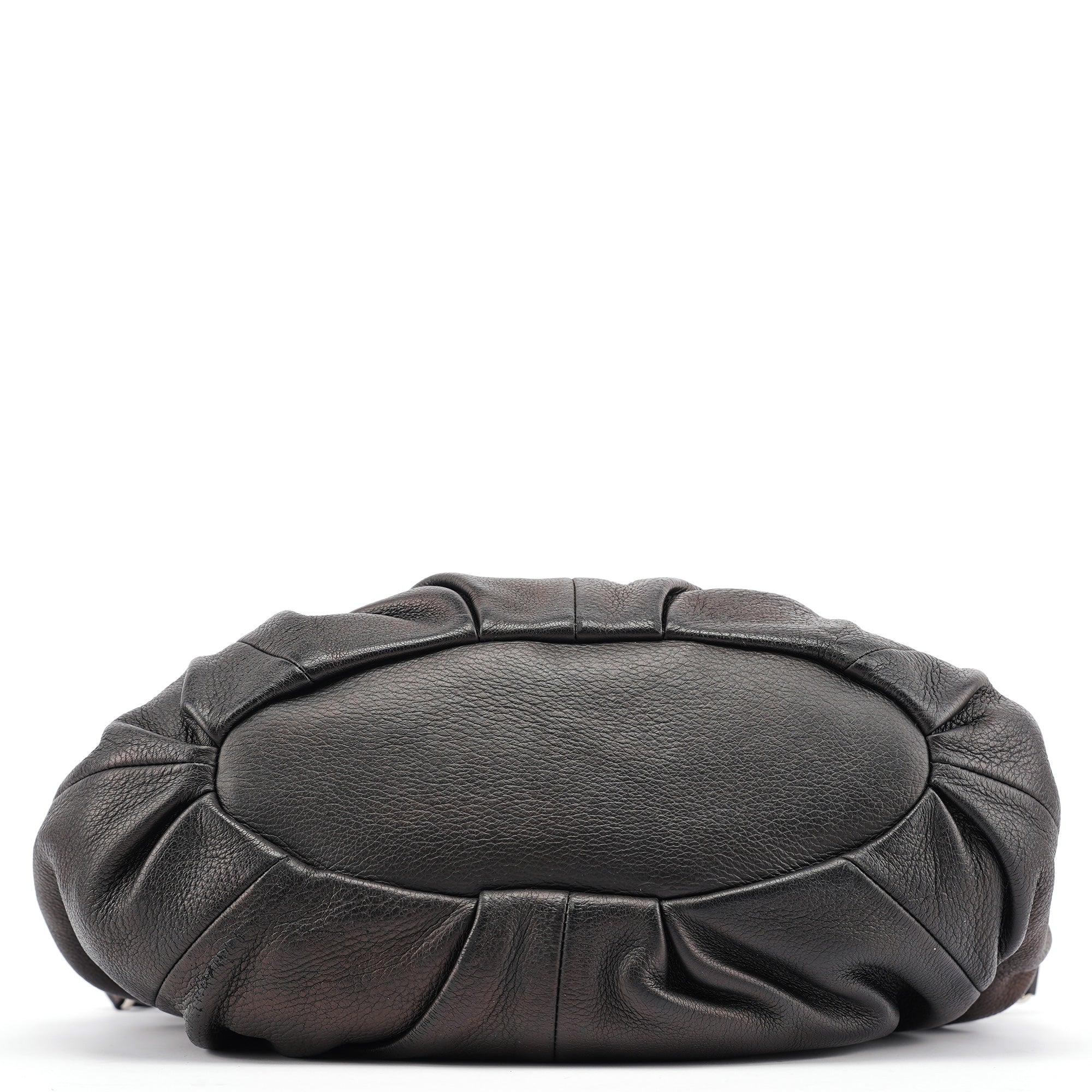 Designed in the early 2000s, this vintage Céline Pillow 2-way tote bag features supple dark metallic pebbled leather in a distinctive gathered pillow silhouette. The relaxed design showcases silver-tone hardware including the engraved triomphe logo charm, dual top handles, and an adjustable shoulder strap for versatile 2-way styling.