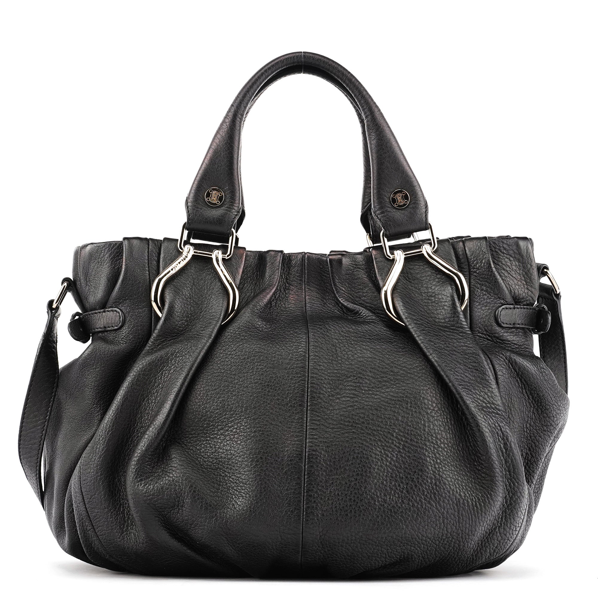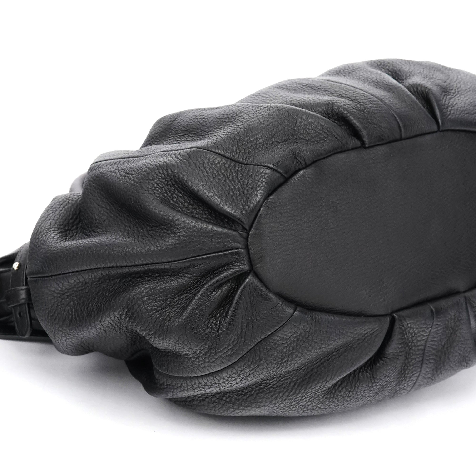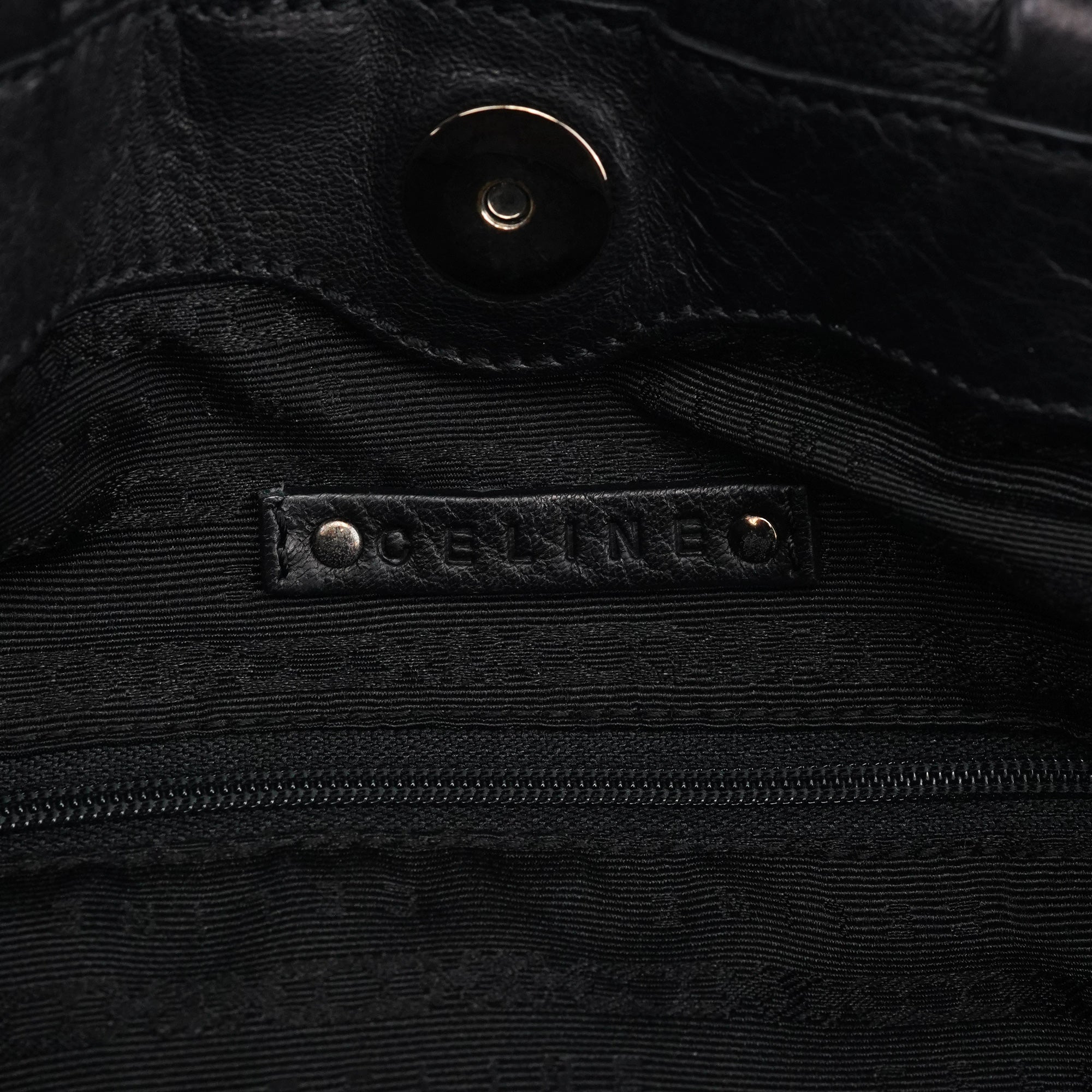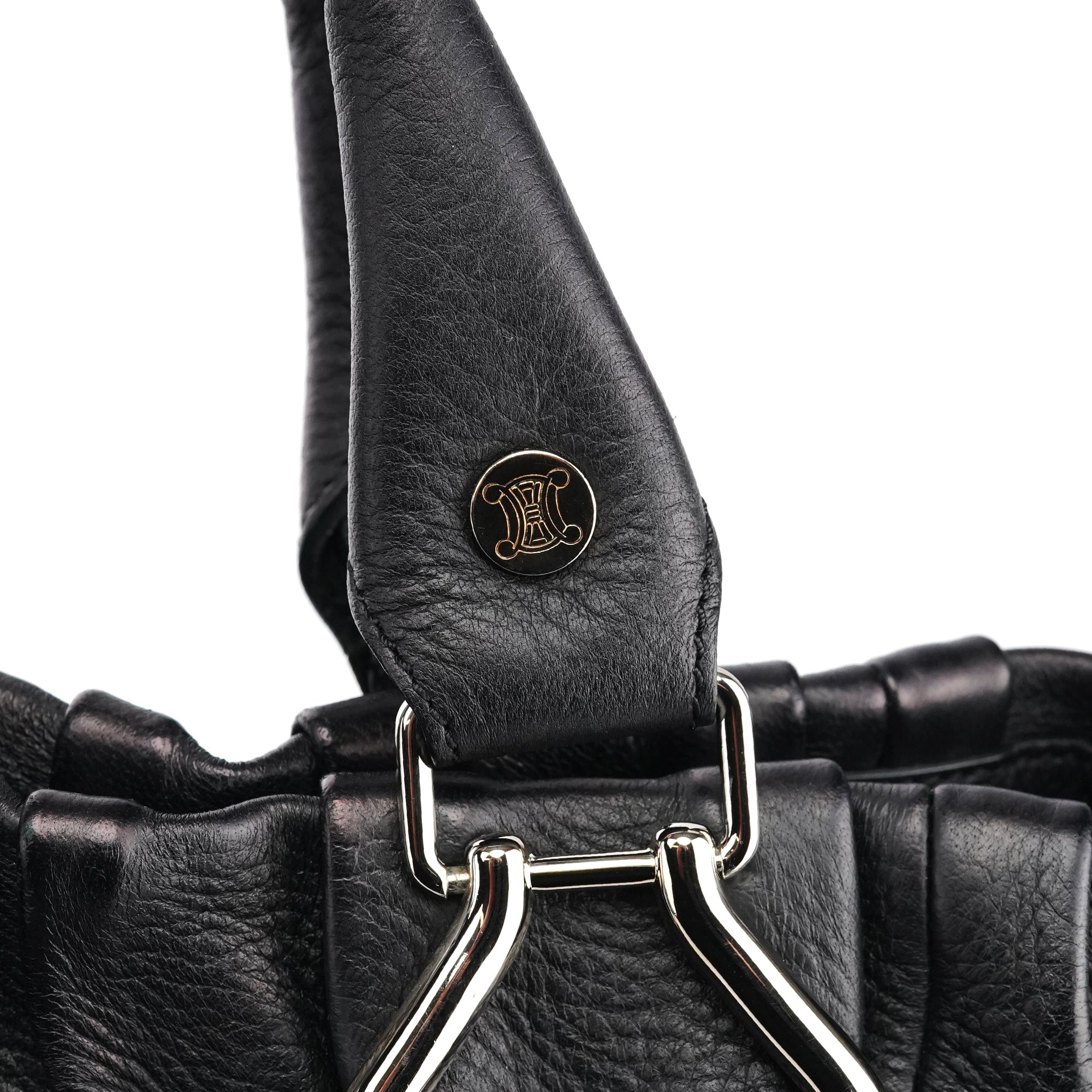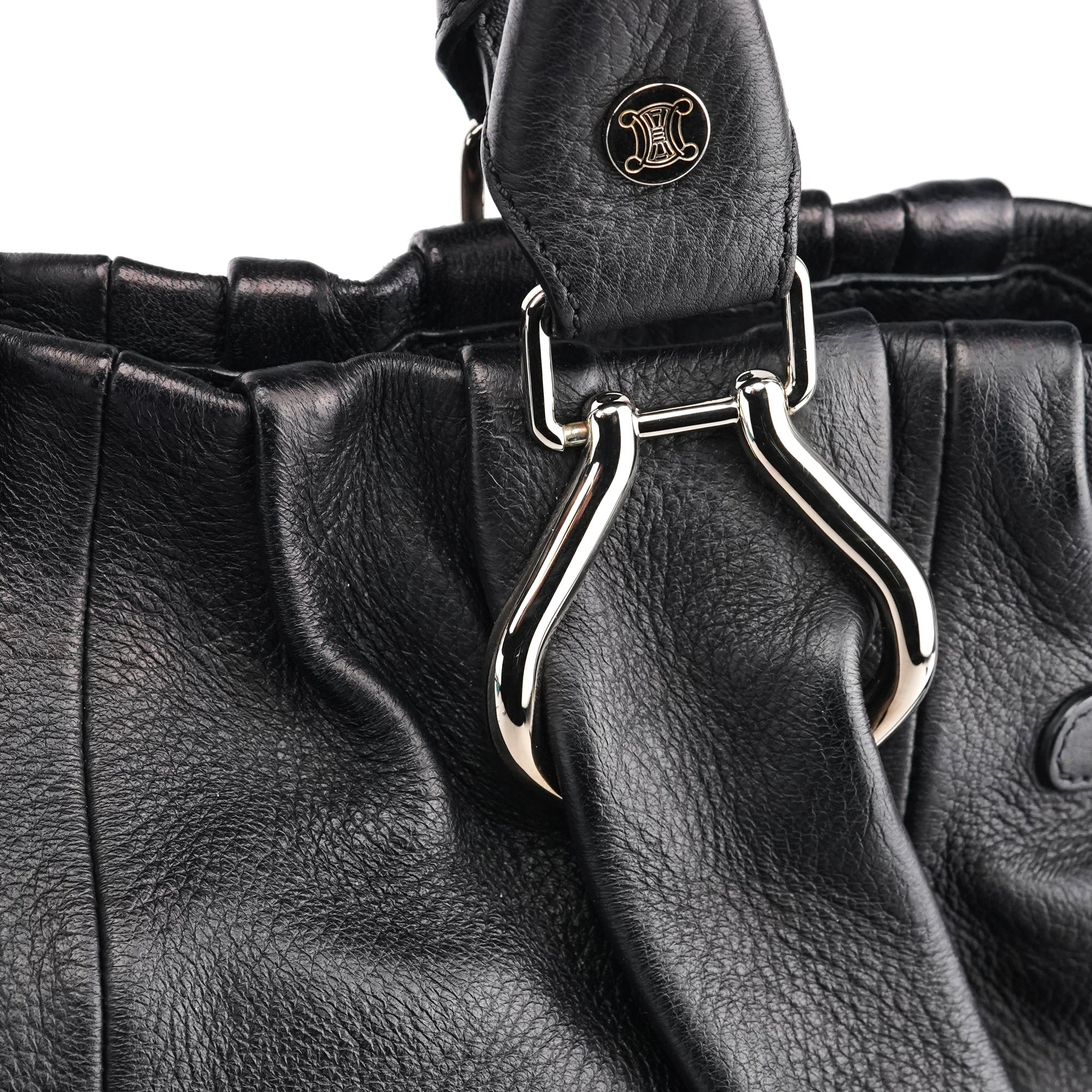 Designed in the early 2000s, this Céline Pillow 2-way tote bag is crafted from soft black leather with a gathered silhouette and polished silver-tone hardware. The design features rolled top handles, a detachable shoulder strap with buckle detailing, and signature Triomphe-stamped studs. The open top reveals a spacious interior lined with Céline-monogram fabric and includes a secure zip pocket for essentials.