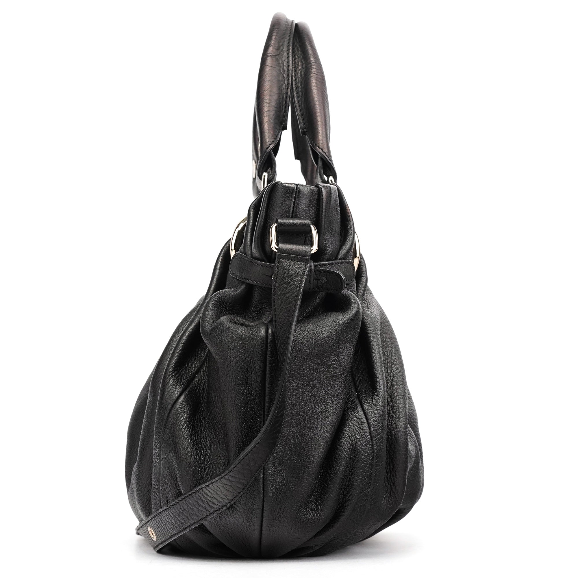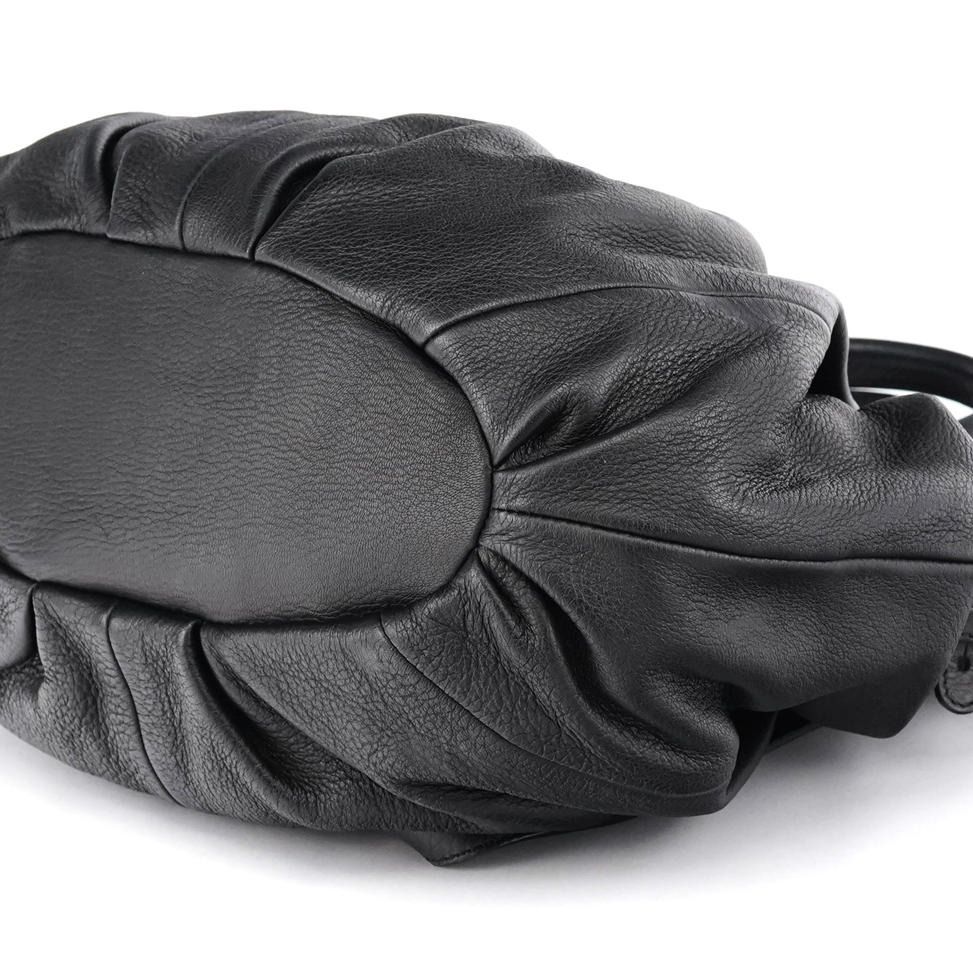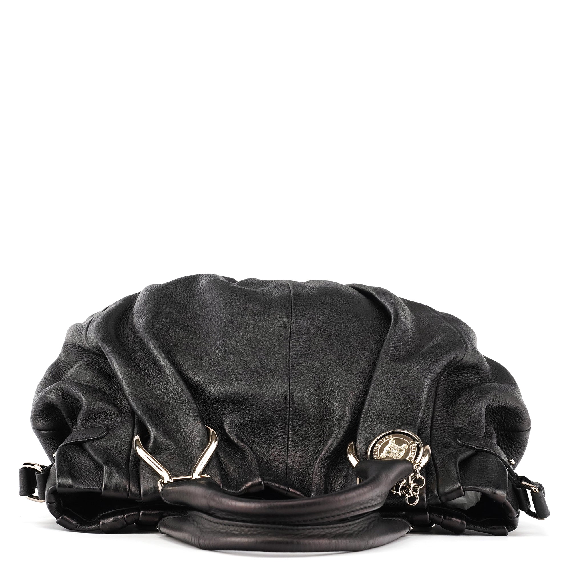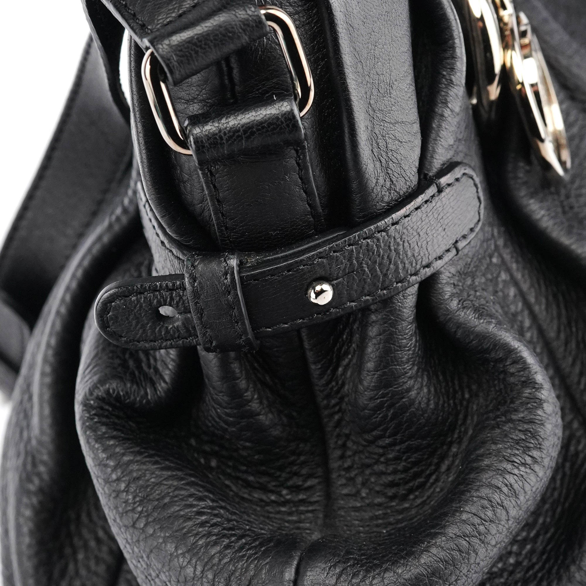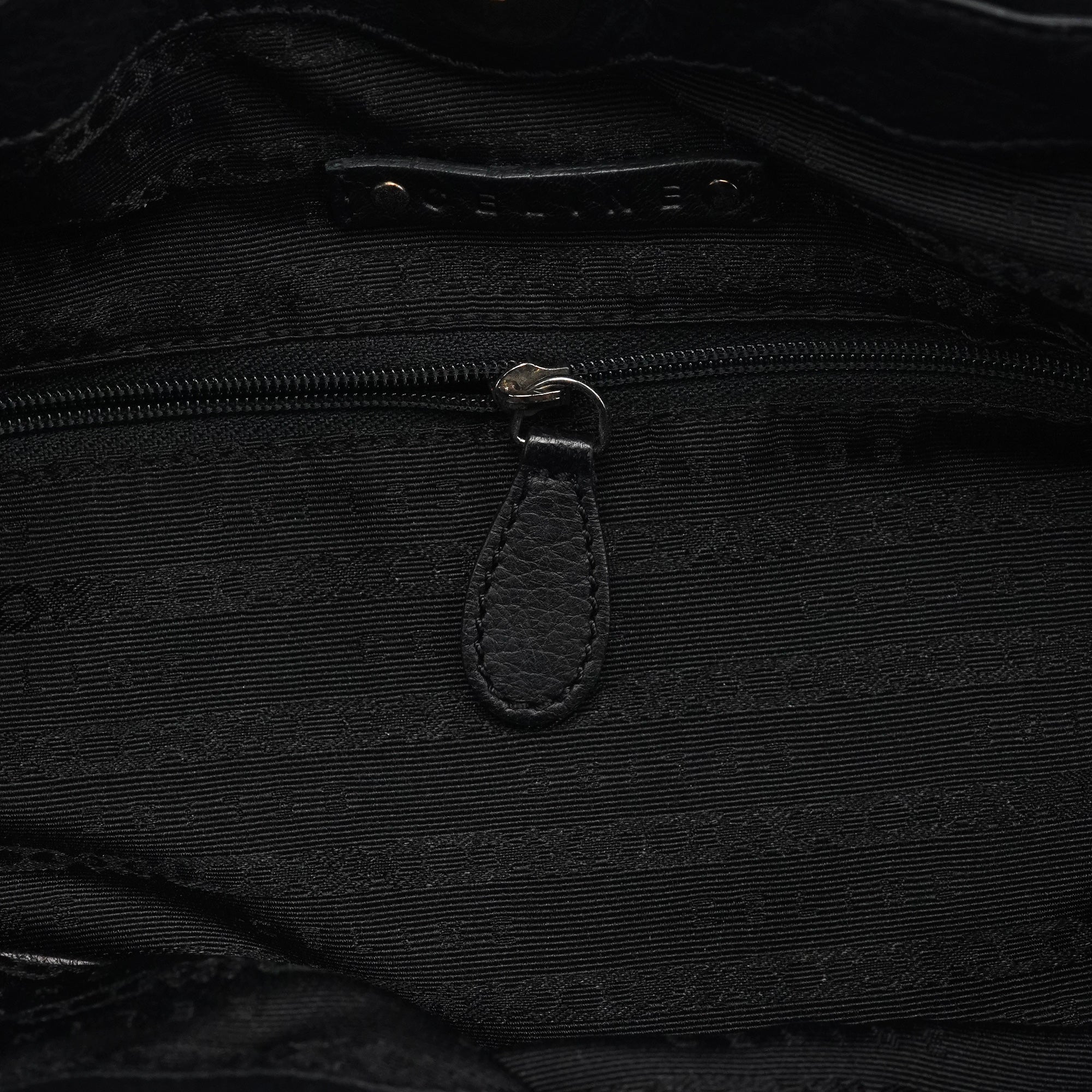 Designed in the early 2000s, this Céline Pillow 2-way tote bag is crafted from soft black leather with a gathered silhouette and polished silver-tone hardware. The design features rolled top handles, a detachable shoulder strap with buckle detailing, and signature Triomphe-stamped studs. The open top reveals a spacious interior lined with Céline-monogram fabric and includes a secure zip pocket for essentials.