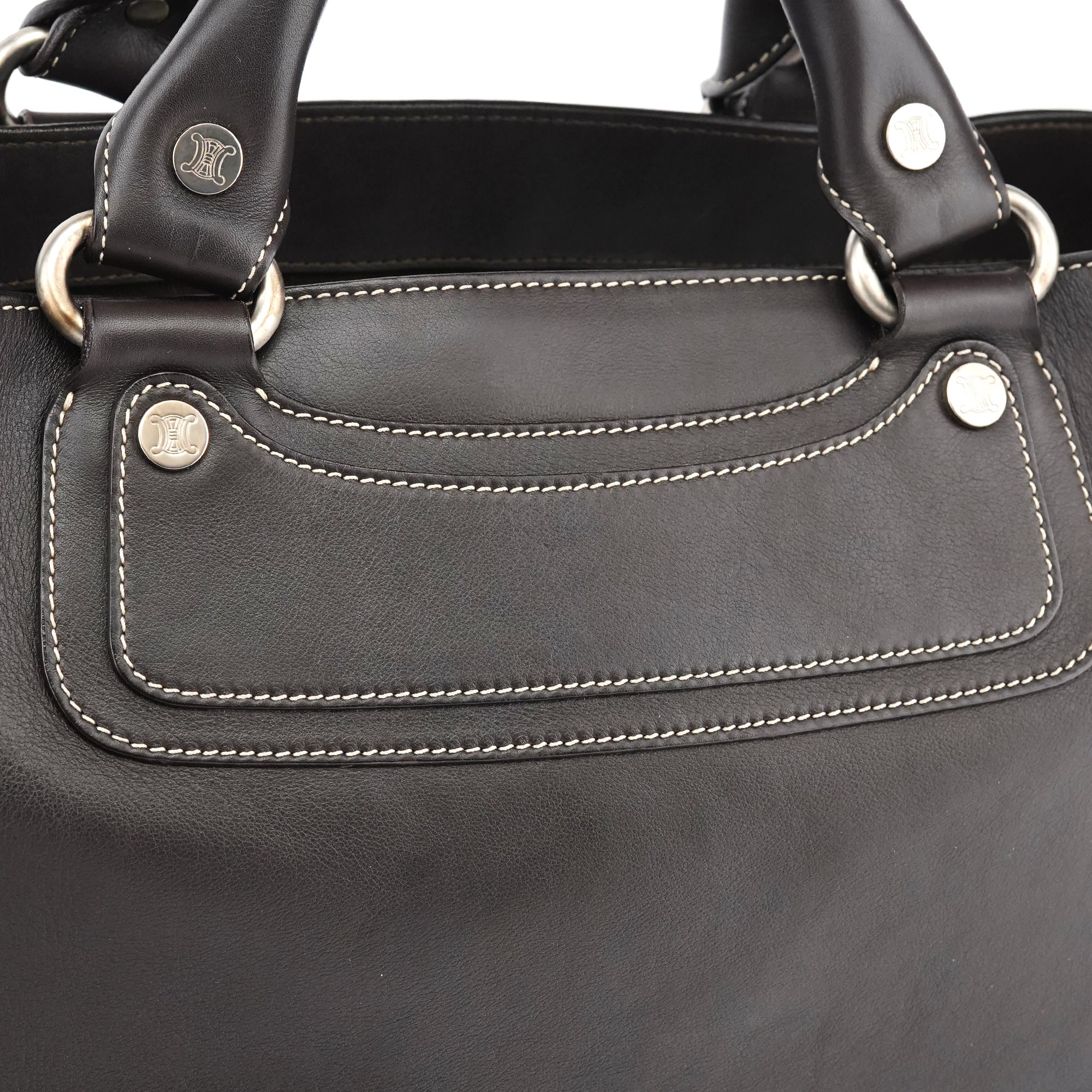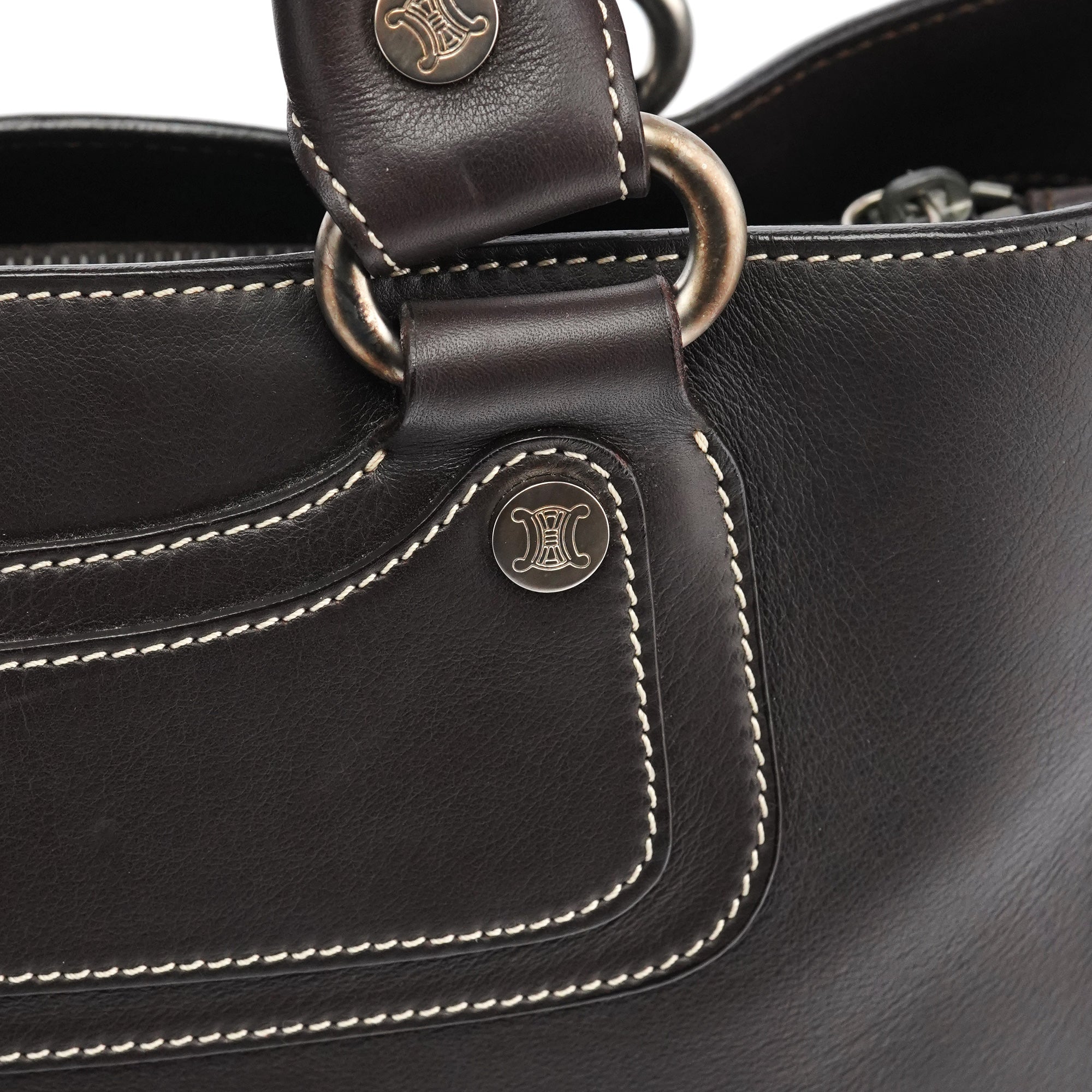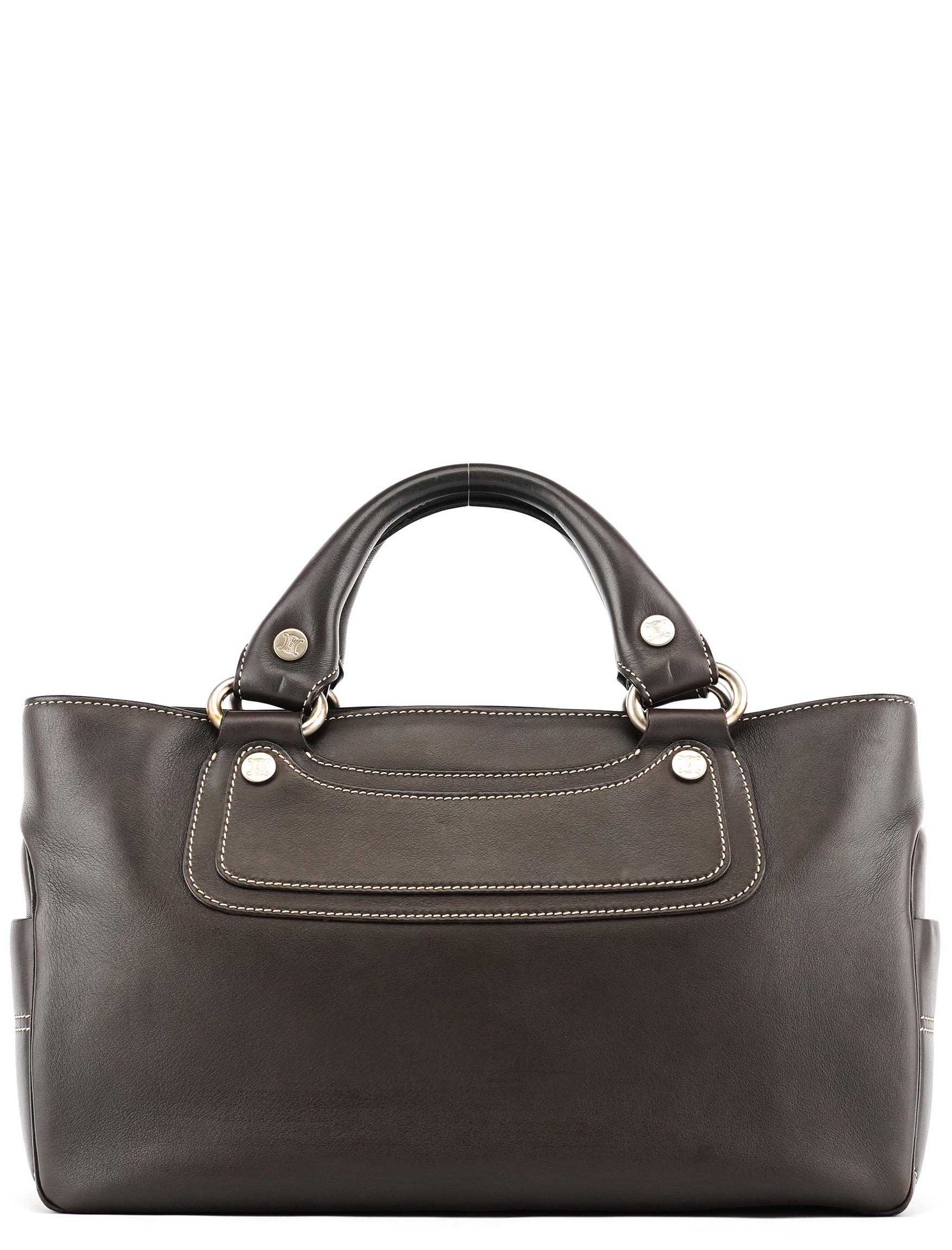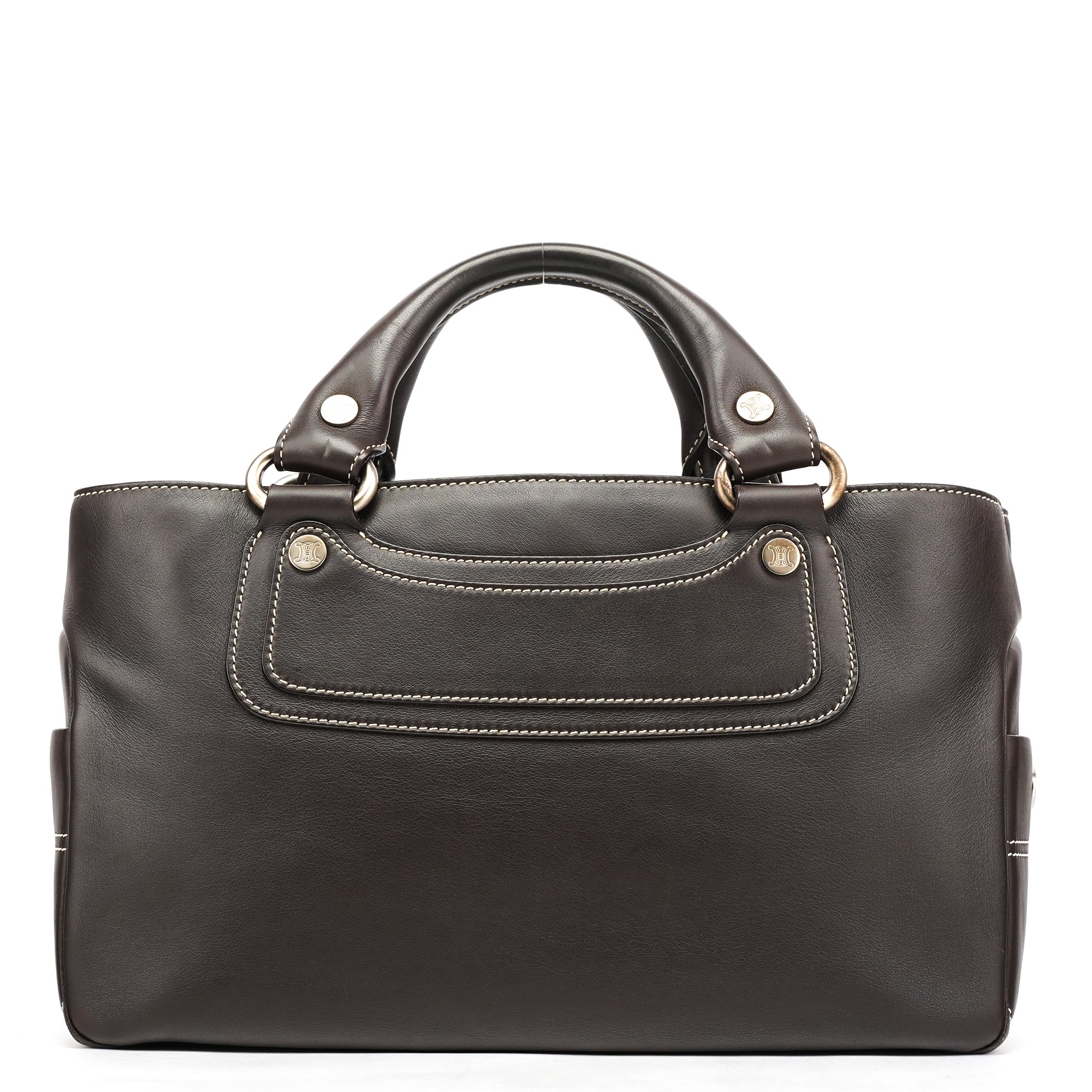Designed in the early 2000s, the Céline Boogie tote is crafted in smooth dark brown calfskin with contrast ivory topstitching and silver-tone stud accents. The structured silhouette features dual rolled handles and a front panel with the signature oval Triomphe plaque. The interior is lined in brown fabric with a zipped pocket.