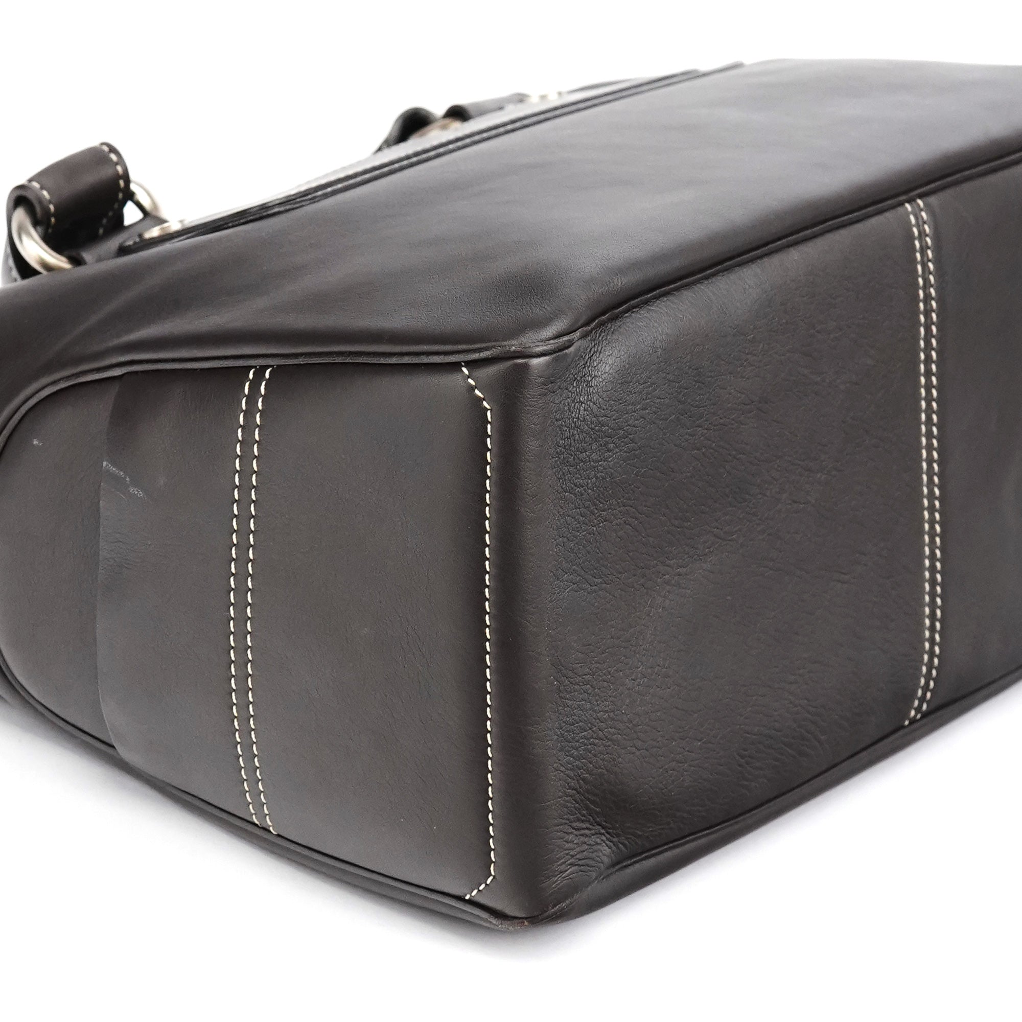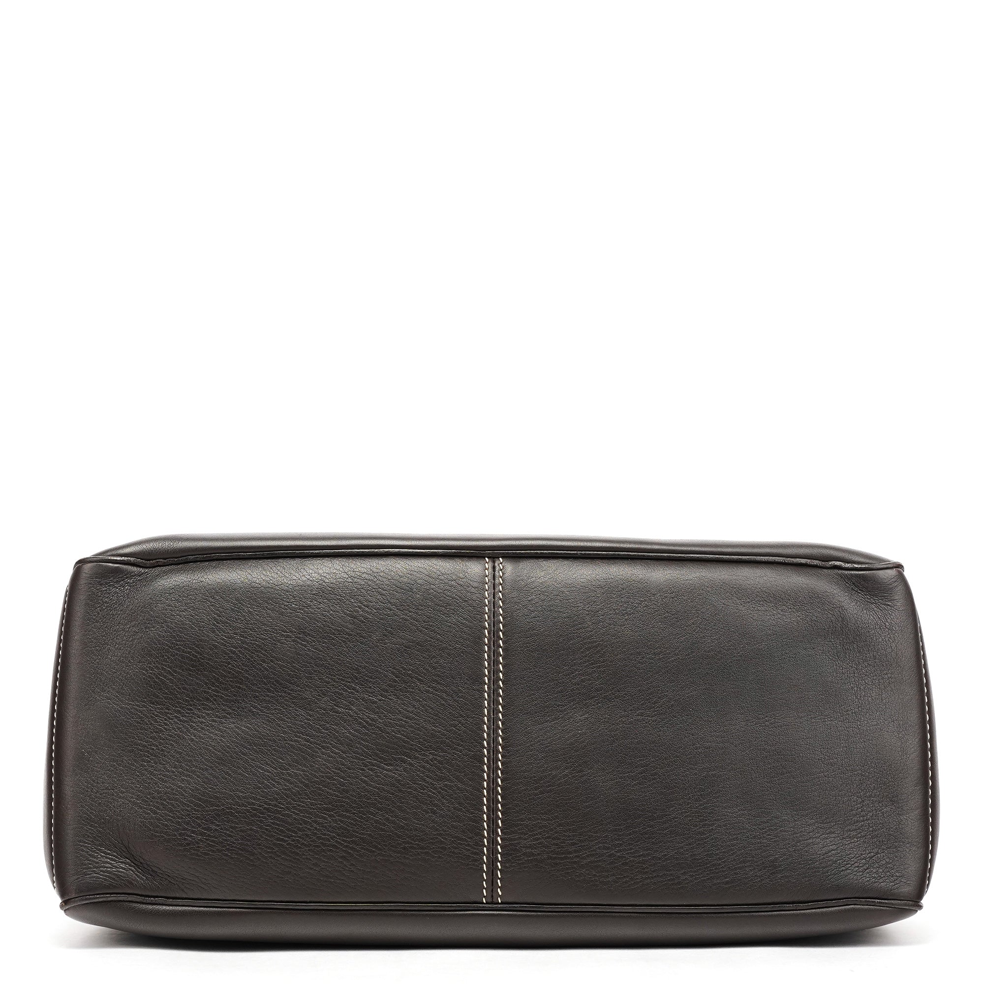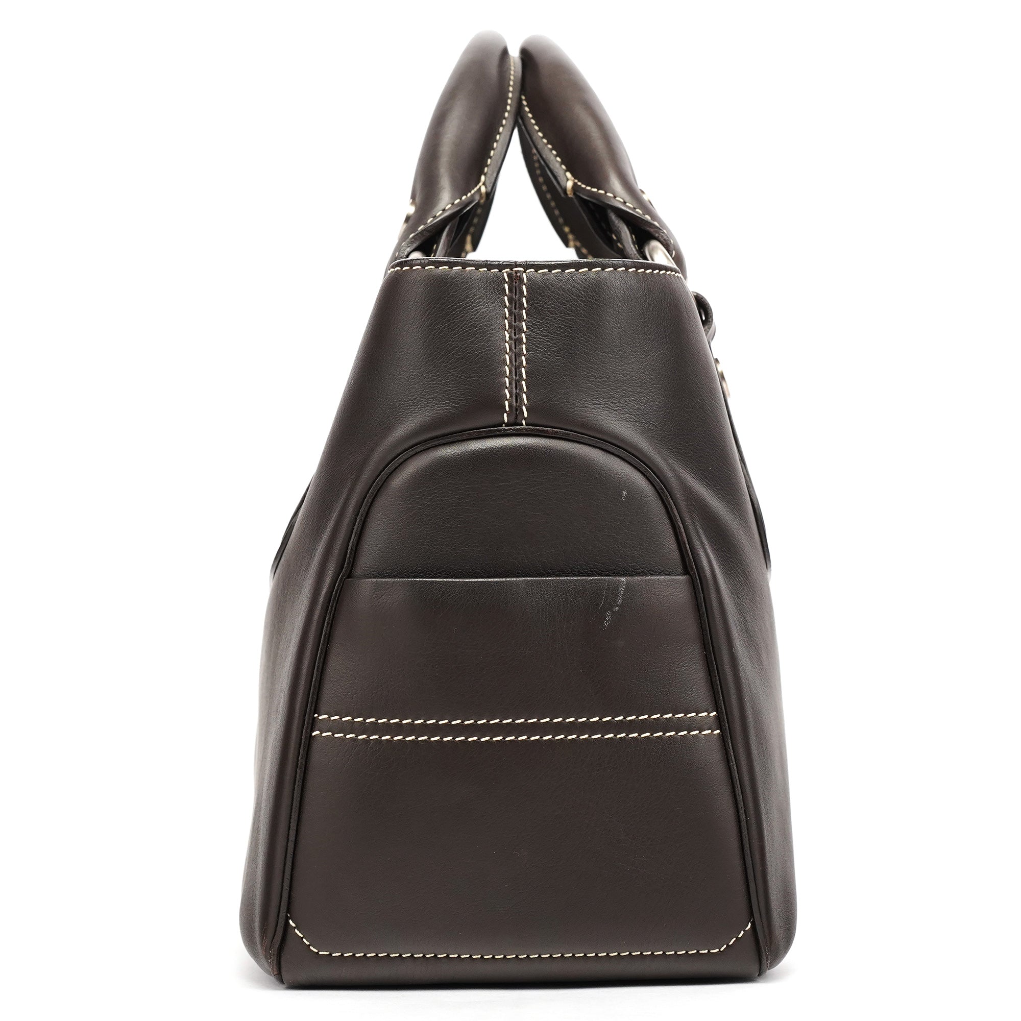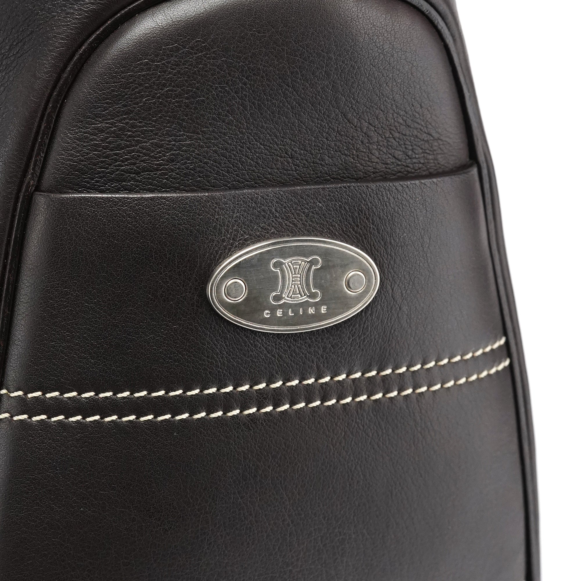 Designed in the early 2000s, the Céline Boogie tote is crafted in smooth dark brown calfskin with contrast ivory topstitching and silver-tone stud accents. The structured silhouette features dual rolled handles and a front panel with the signature oval Triomphe plaque. The interior is lined in brown fabric with a zipped pocket.