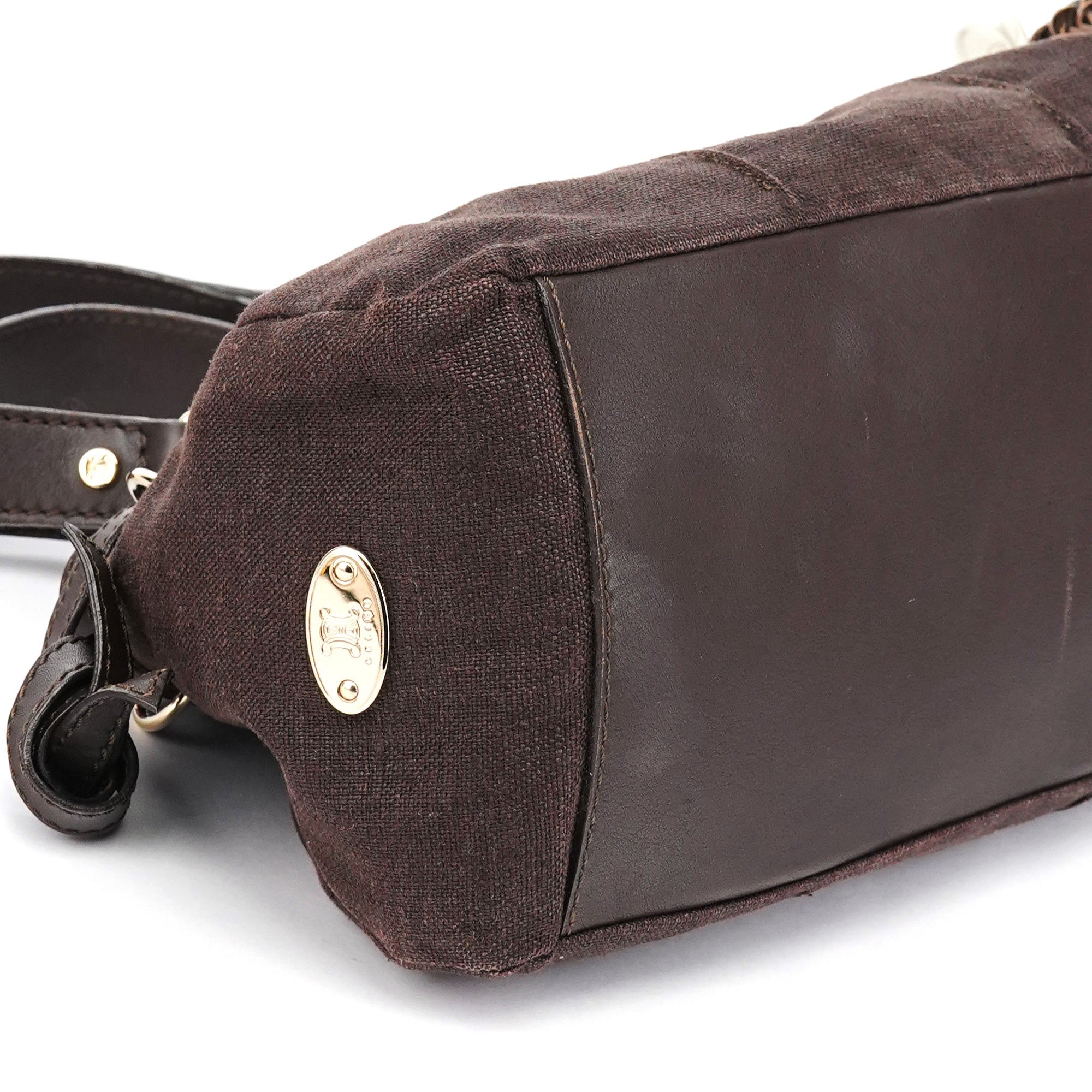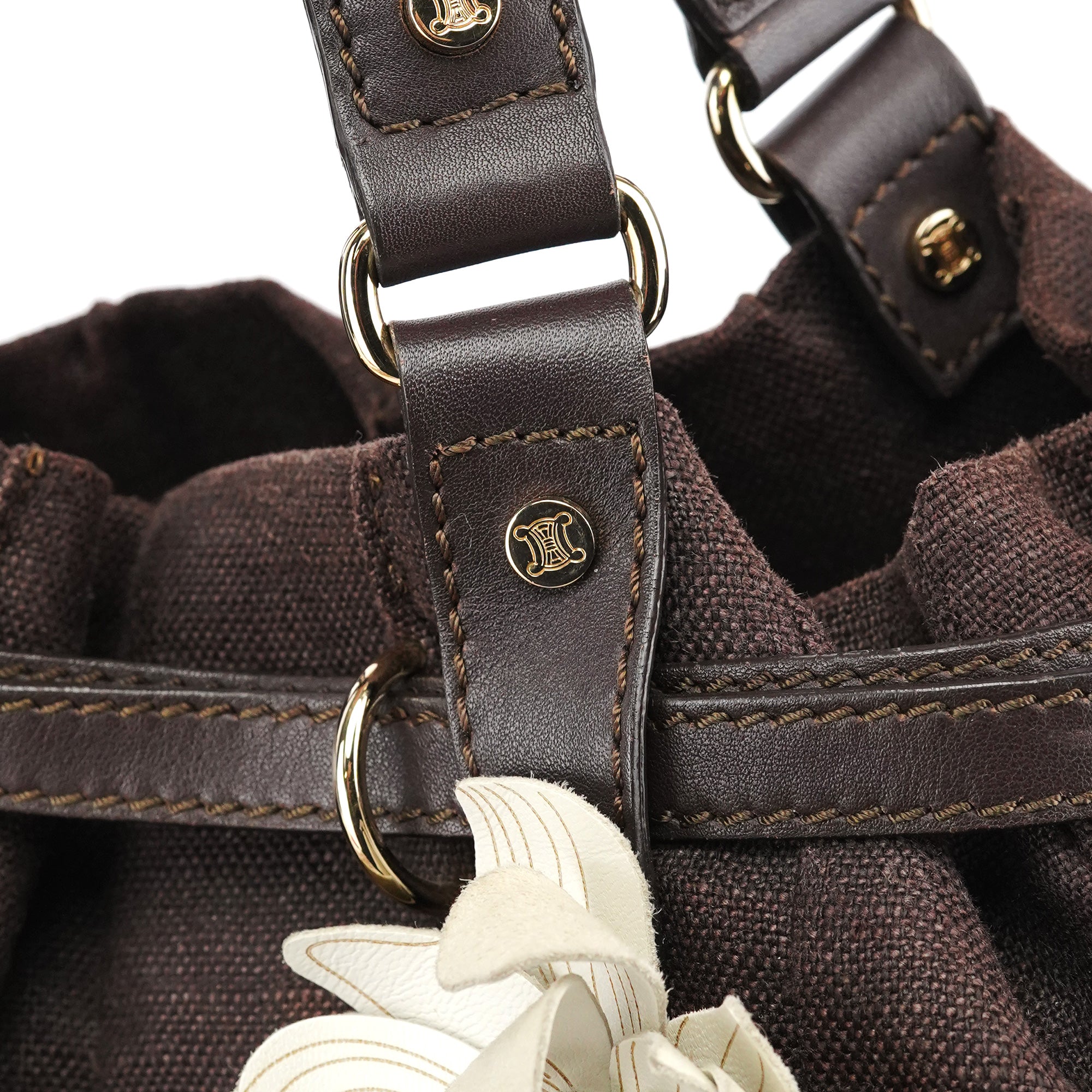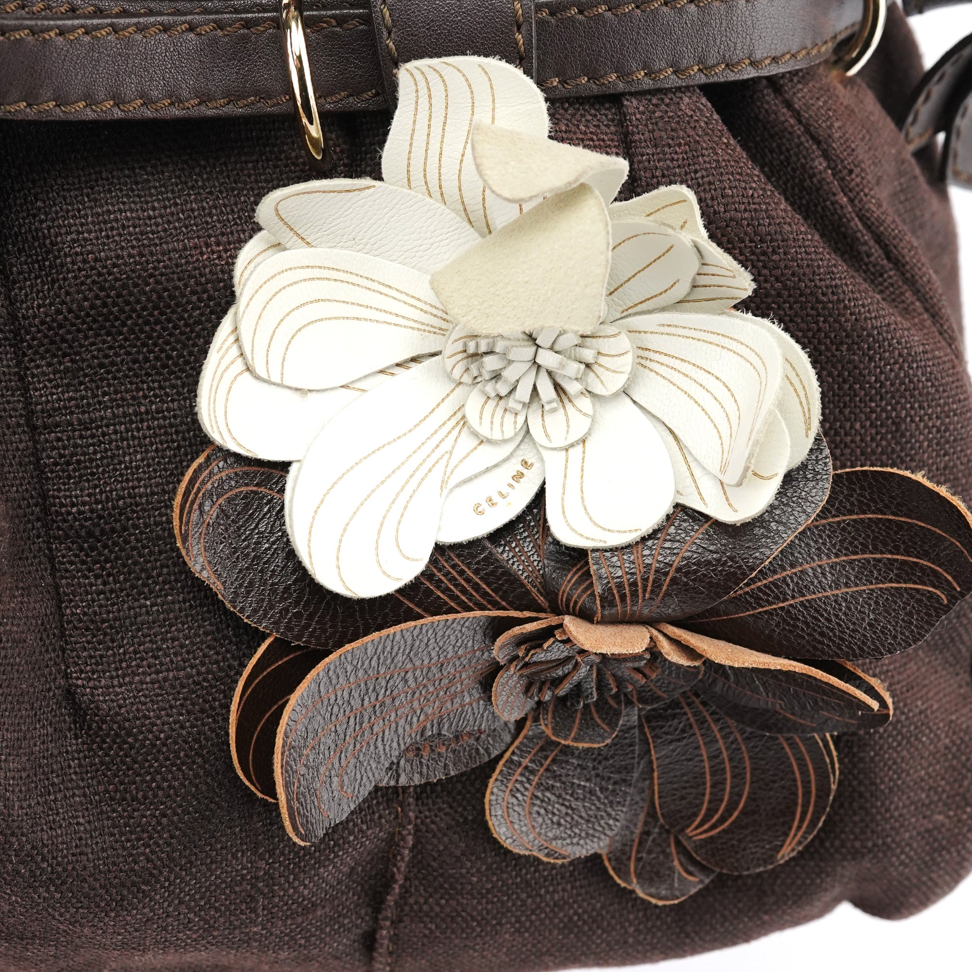 Designed in the early 2000s, this vintage Céline shoulder bag is crafted in brown canvas with leather trim and finished with layered floral appliqués. The design features gold-tone ring hardware, Triomphe-stamped studs, adjustable leather handles, and an open-top construction with an interior zip pocket.