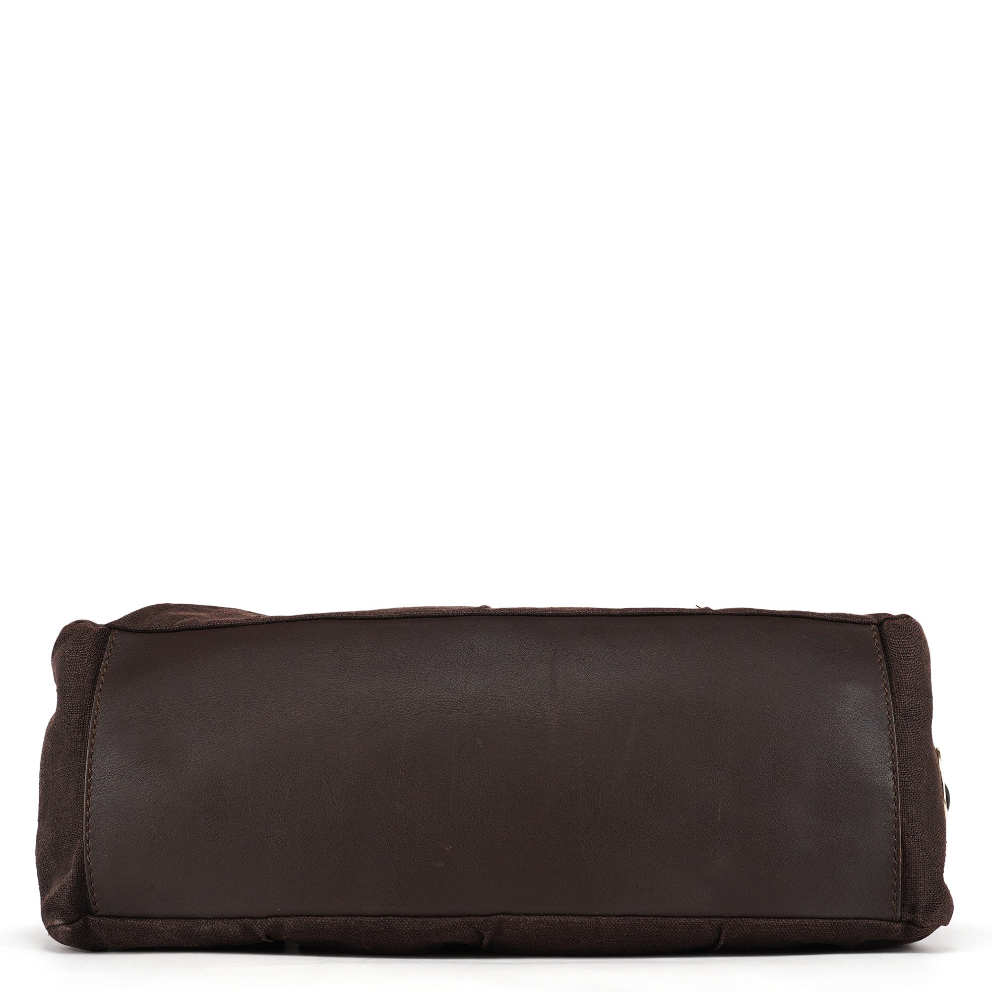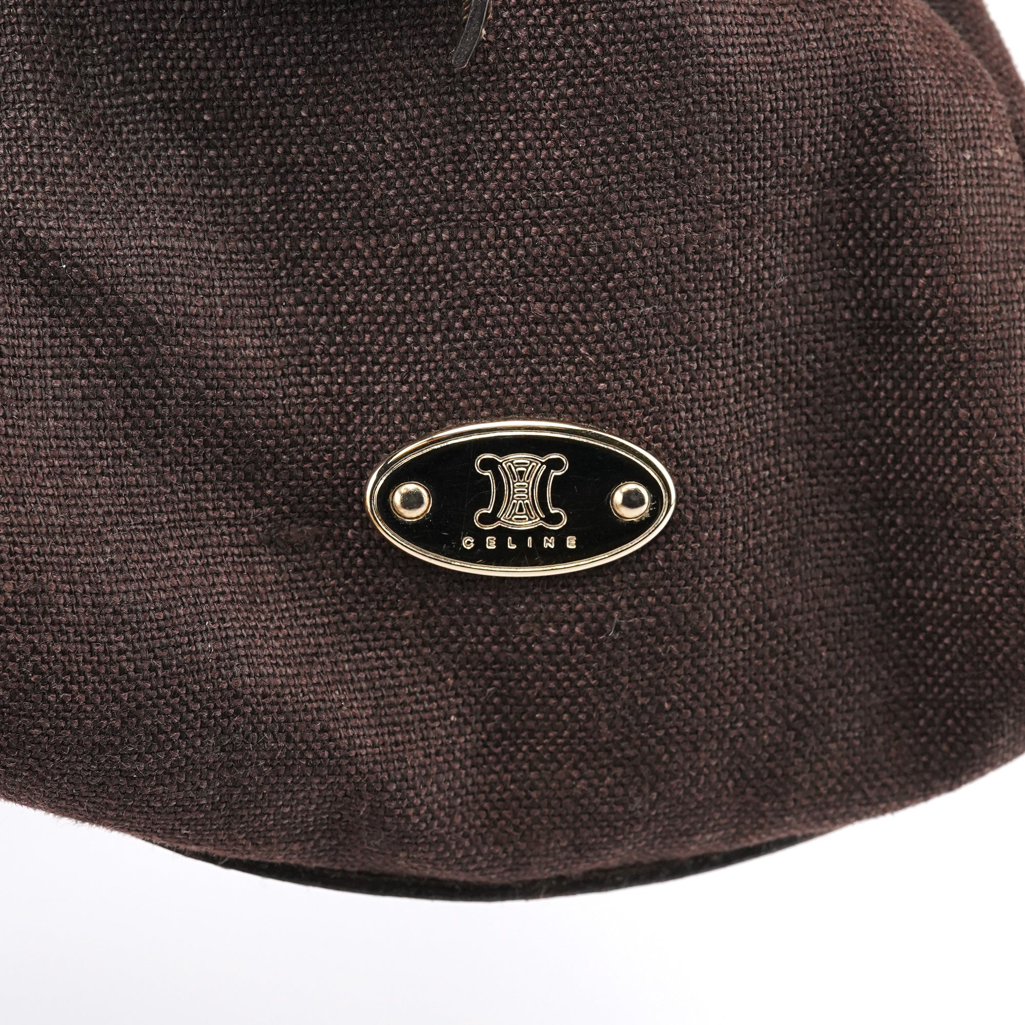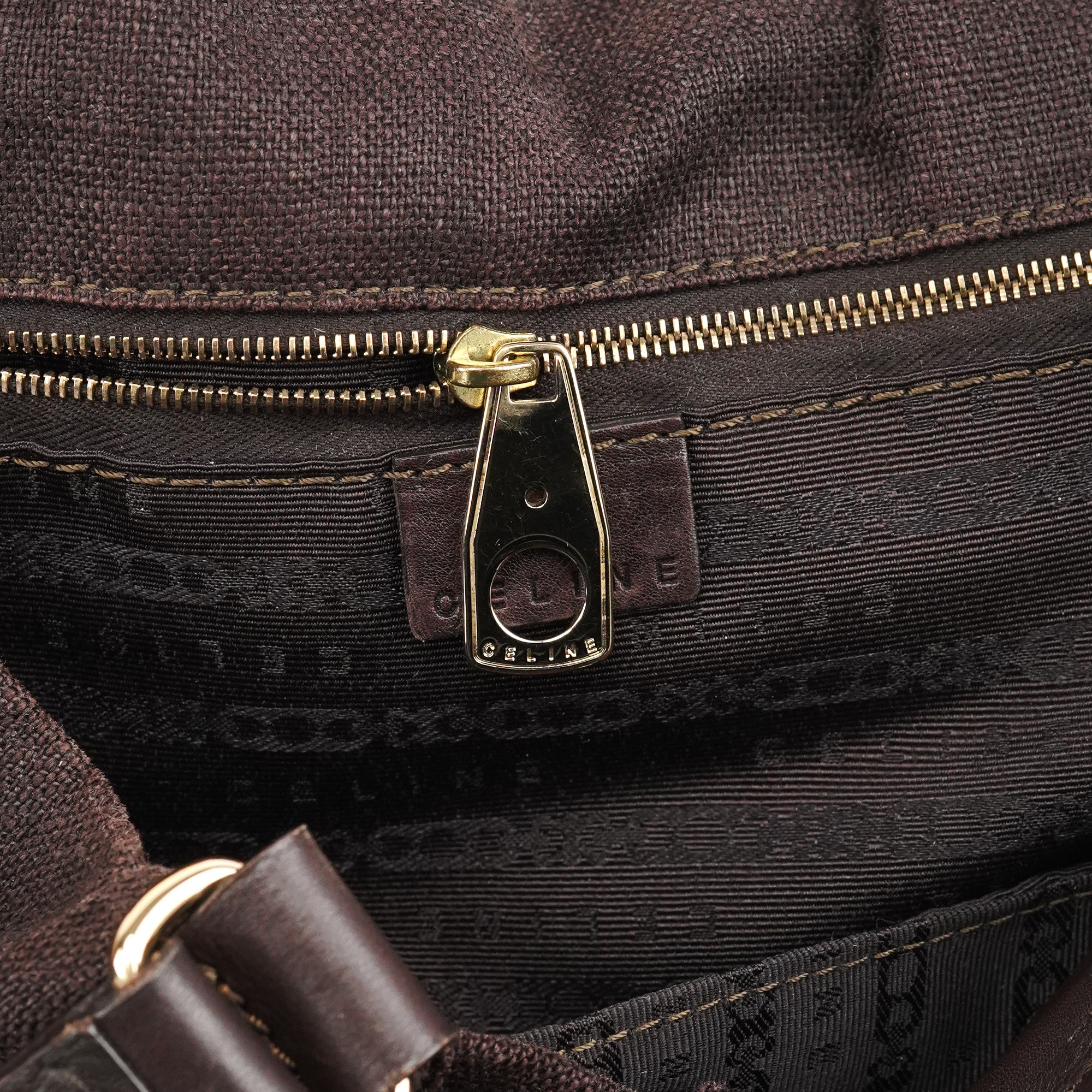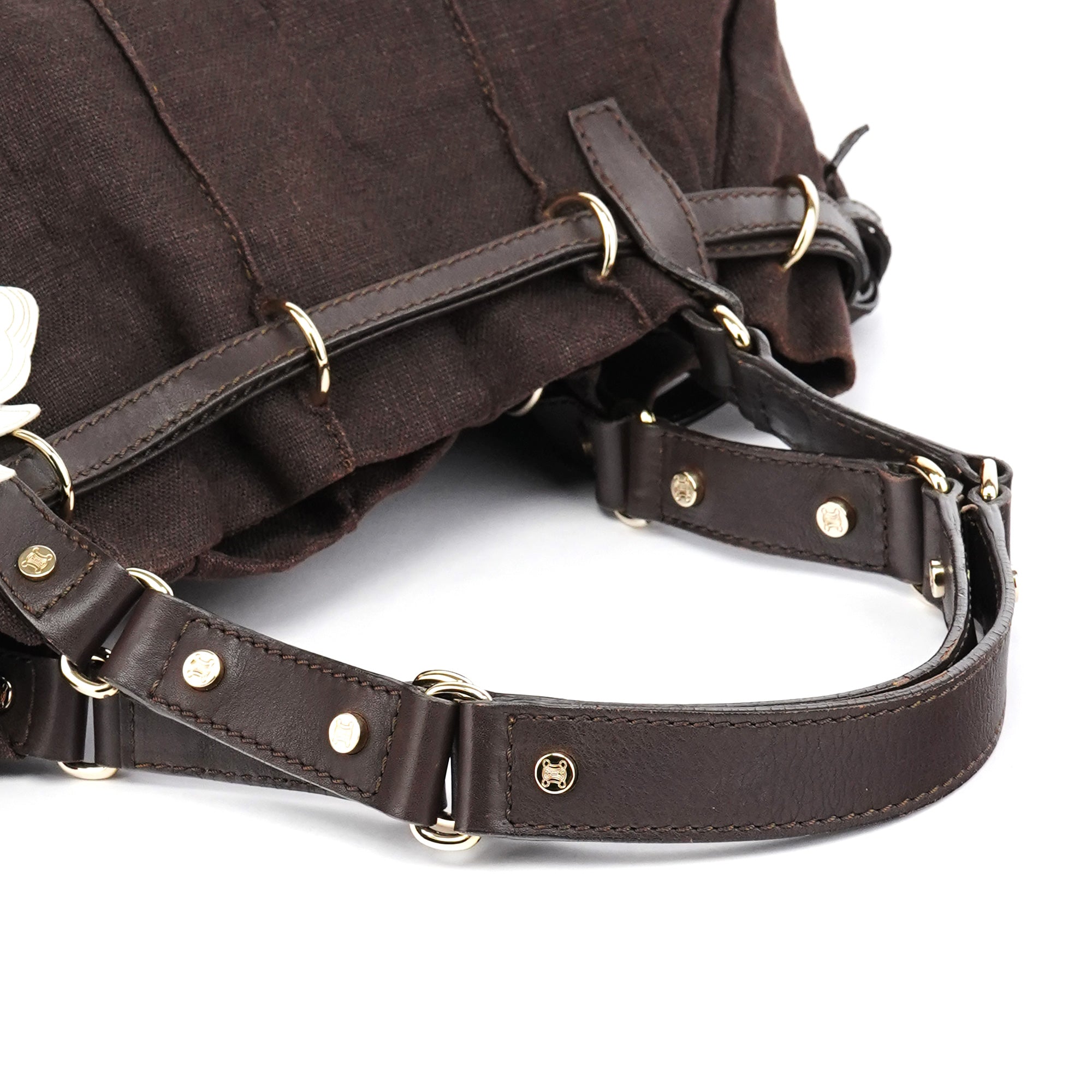 Designed in the early 2000s, this vintage Céline shoulder bag is crafted in brown canvas with leather trim and finished with layered floral appliqués. The design features gold-tone ring hardware, Triomphe-stamped studs, adjustable leather handles, and an open-top construction with an interior zip pocket.