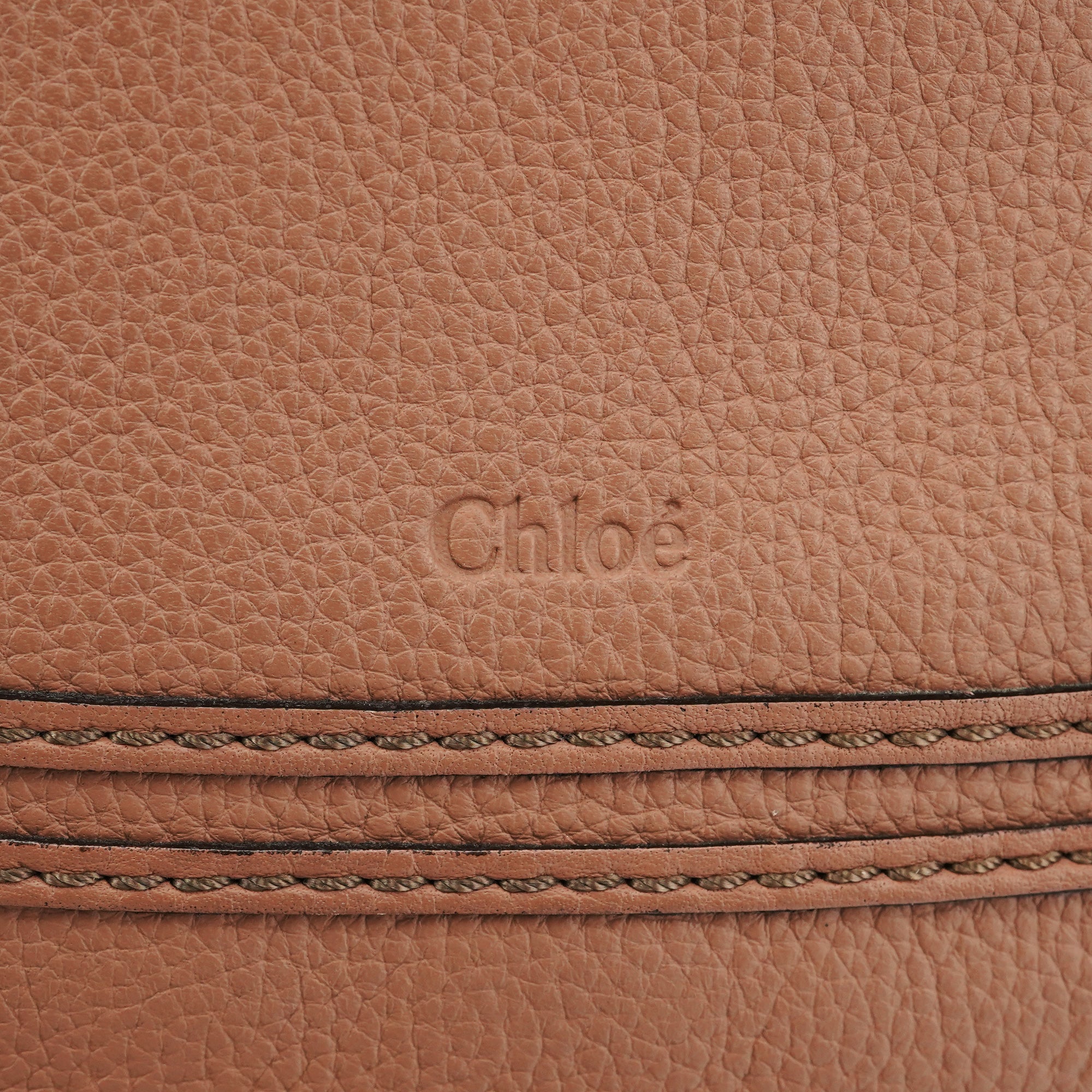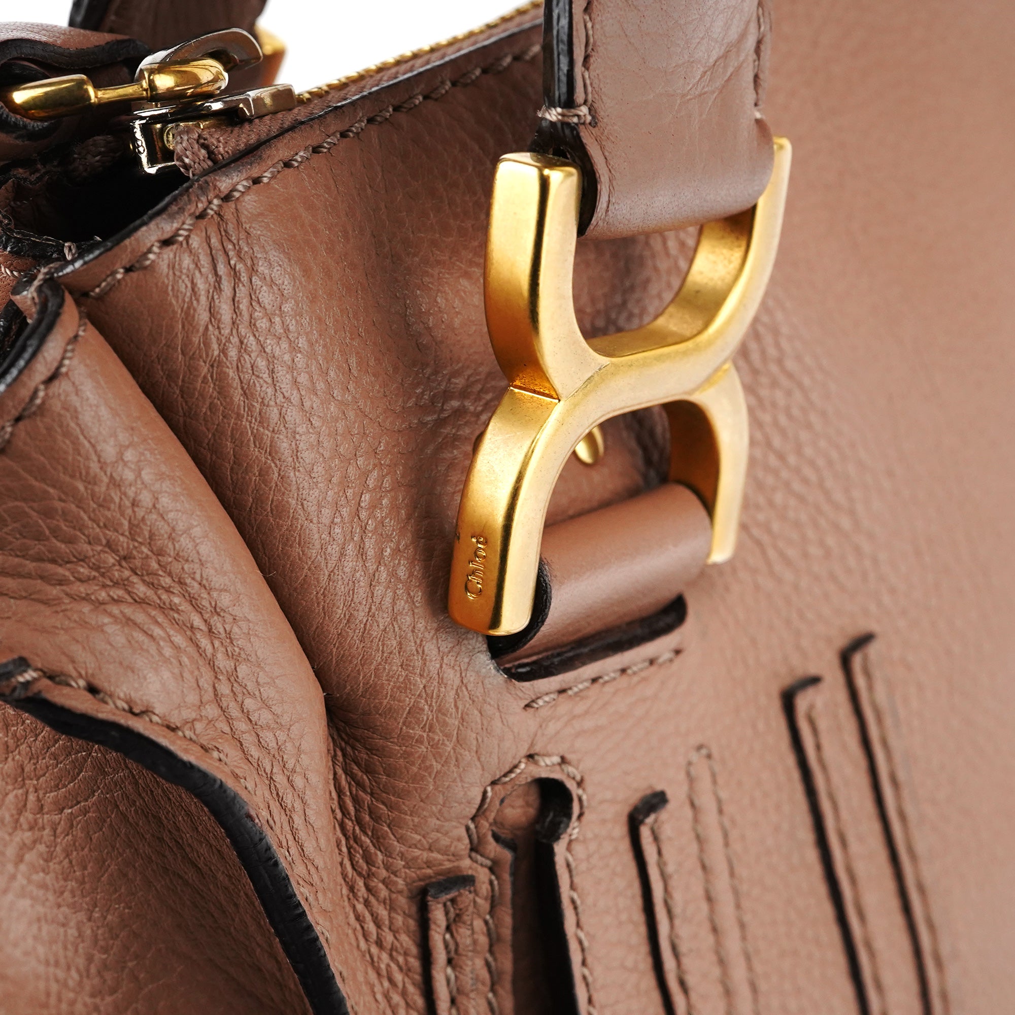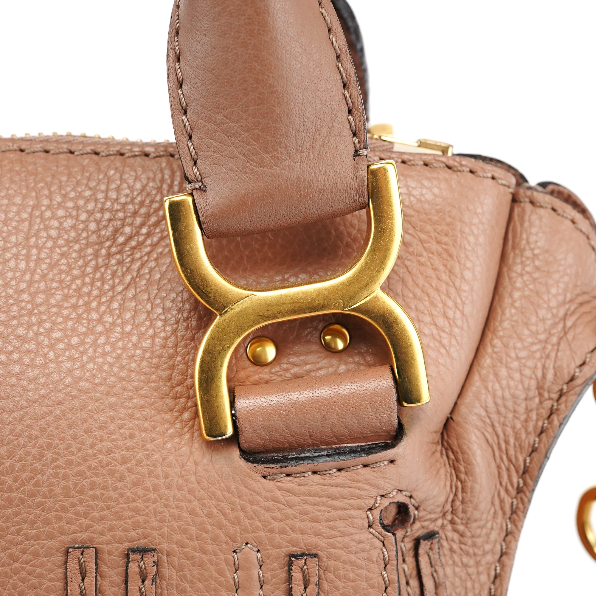 Designed in 2010 by Hannah MacGibbon, this Chloé Marcie shoulder bag is crafted from dusty rose grained leather in a slouchy, feminine silhouette. It features decorative stitched paneling and signature wrapped leather top handles. The bag includes a detachable long strap, matte gold-tone hardware, and a single khaki fabric-lined interior.