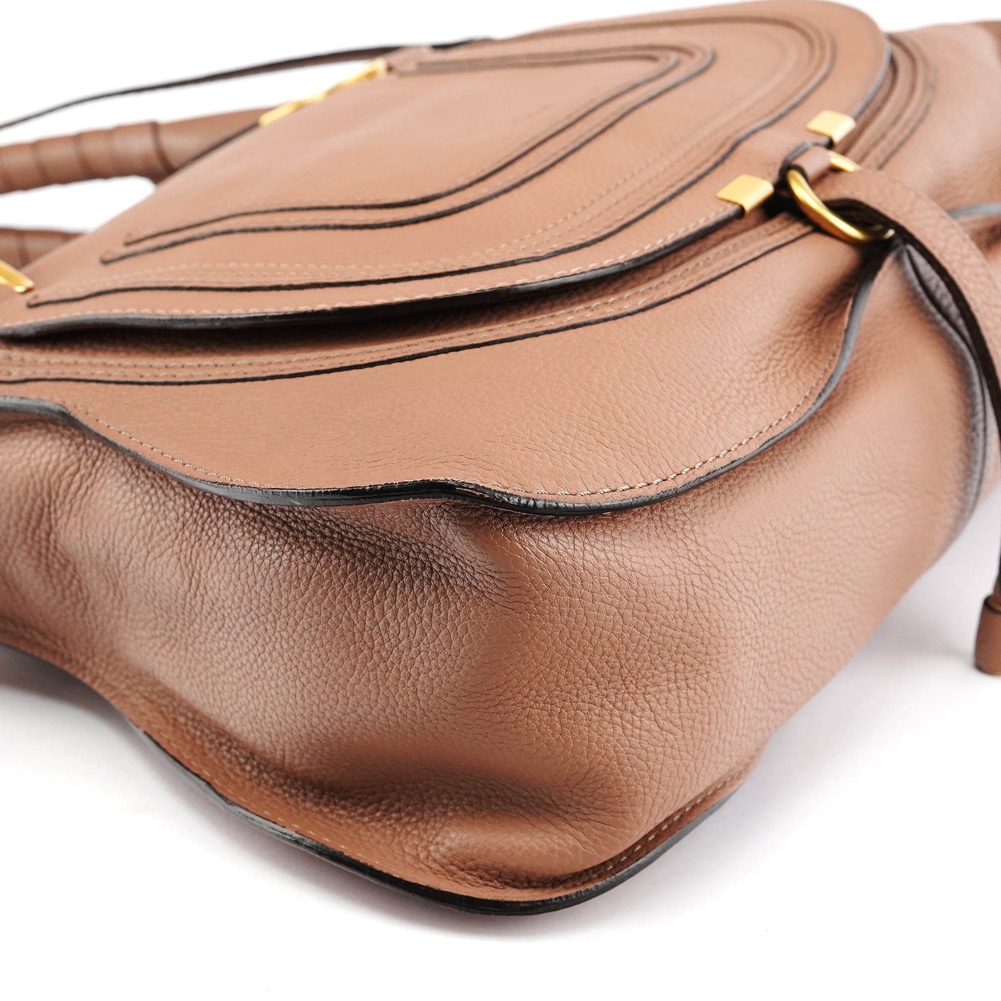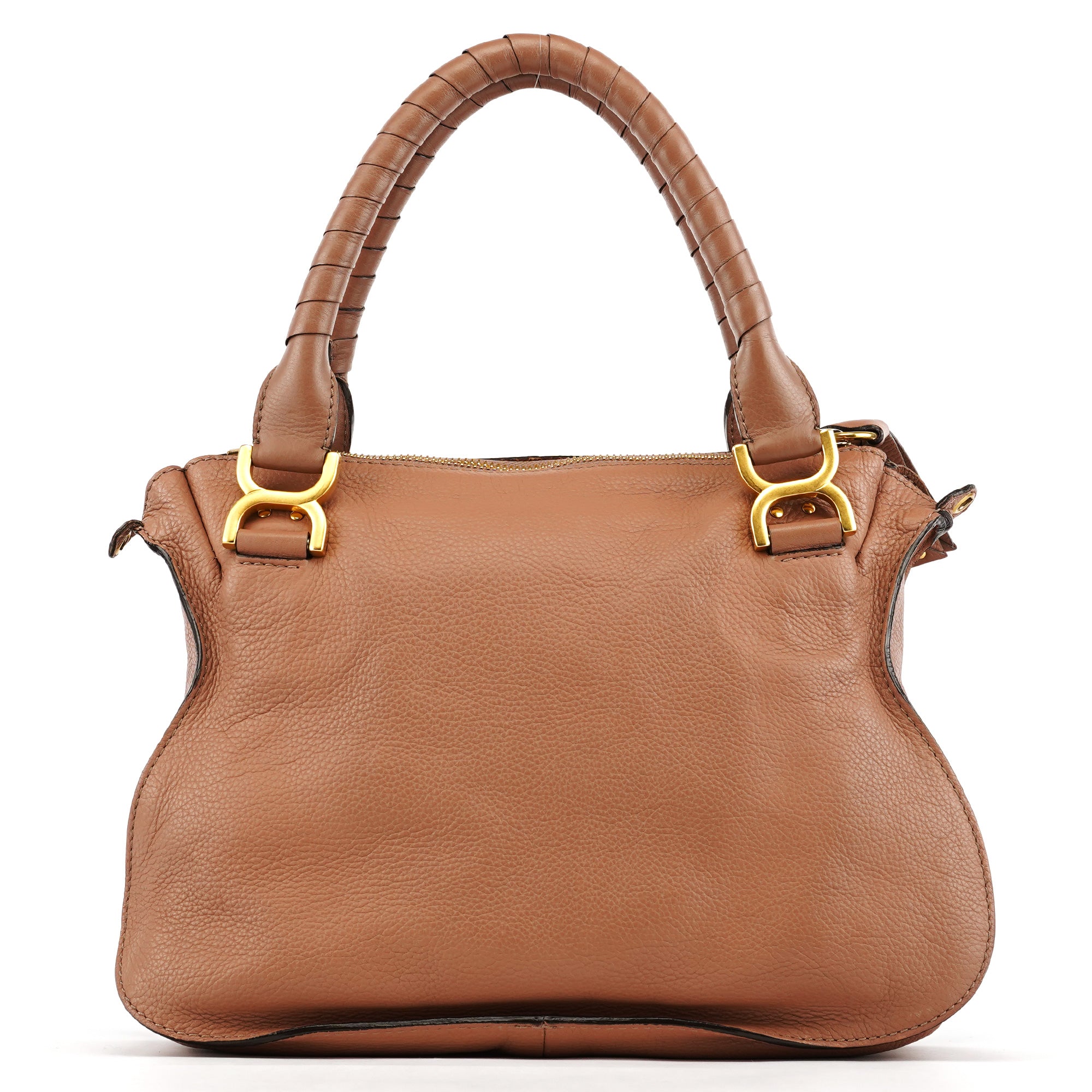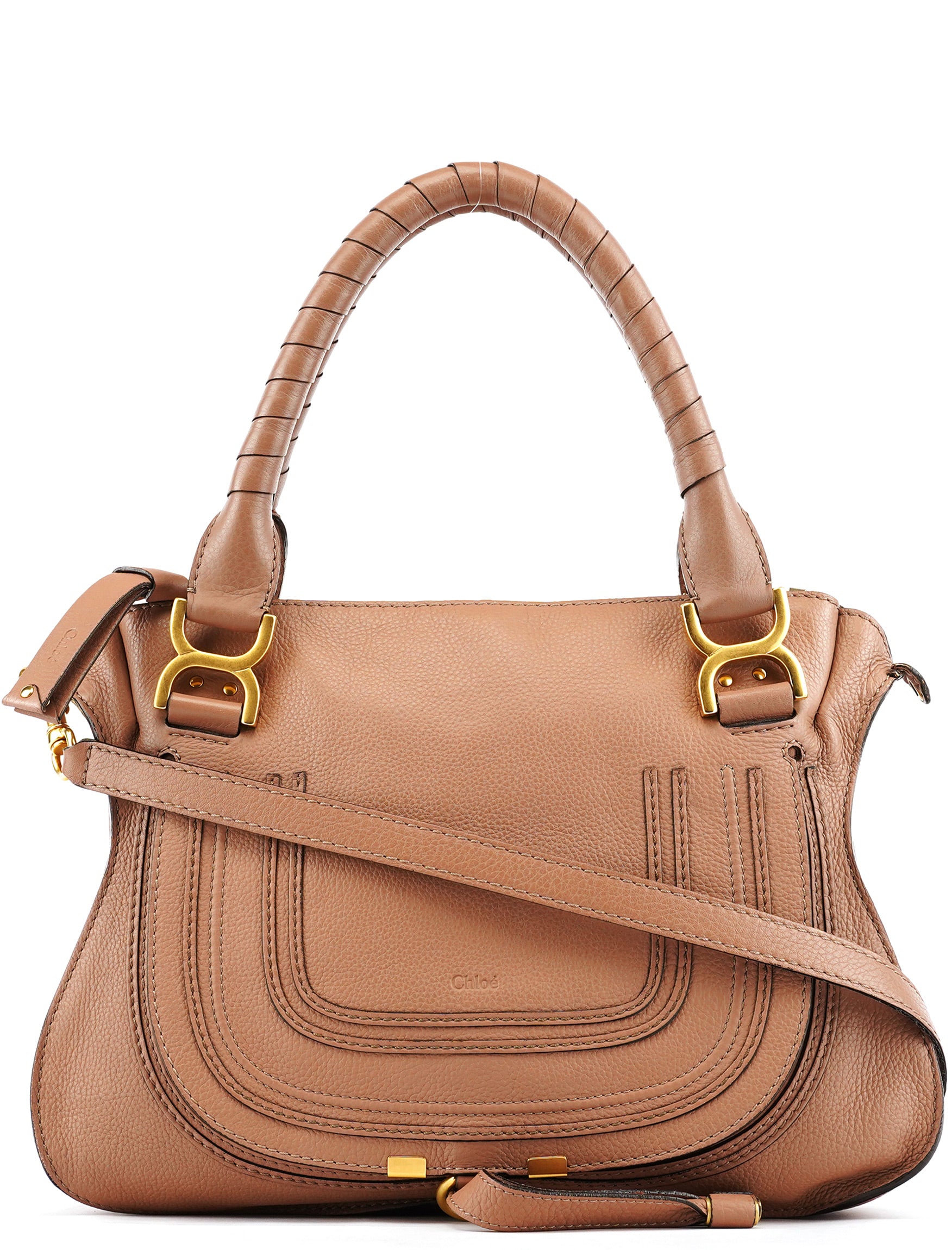 Designed in 2010 by Hannah MacGibbon, this Chloé Marcie shoulder bag is crafted from dusty rose grained leather in a slouchy, feminine silhouette. It features decorative stitched paneling and signature wrapped leather top handles. The bag includes a detachable long strap, matte gold-tone hardware, and a single khaki fabric-lined interior.