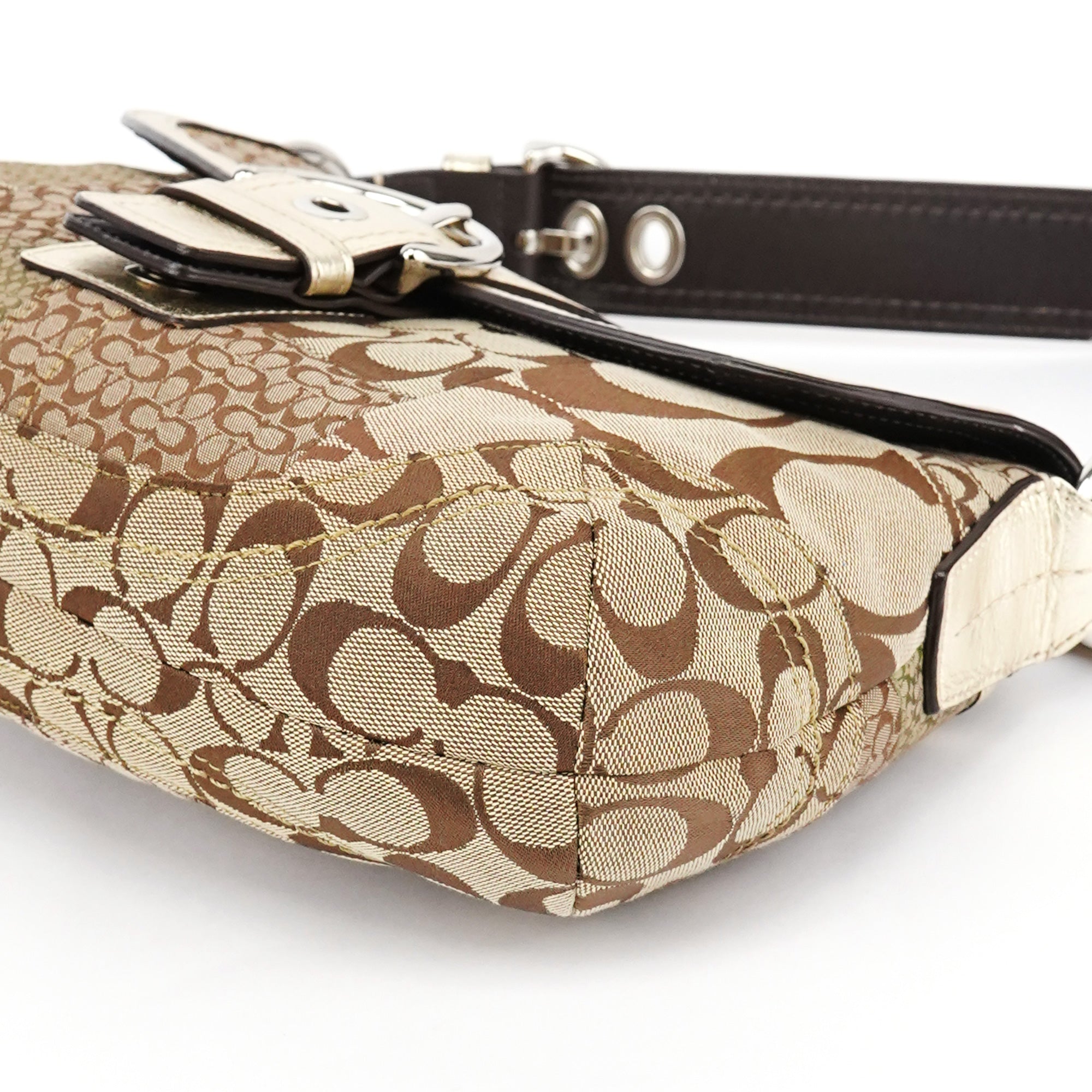 Designed in the early 2000s, this vintage Coach Patchwork Soho shoulder bag features a mixed-media construction of signature Coach canvas and leather in beige tones. The crescent-shaped silhouette showcases the brand's iconic patchwork design with silver-tone hardware and turn-lock closure, representing Coach's heritage craftsmanship and American luxury aesthetic.