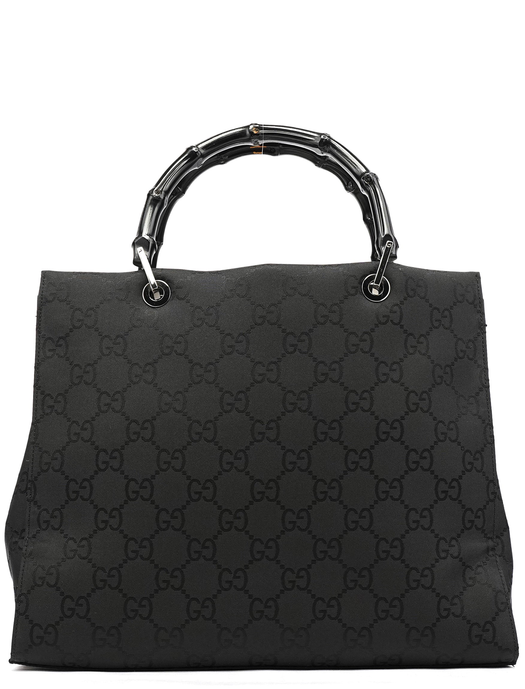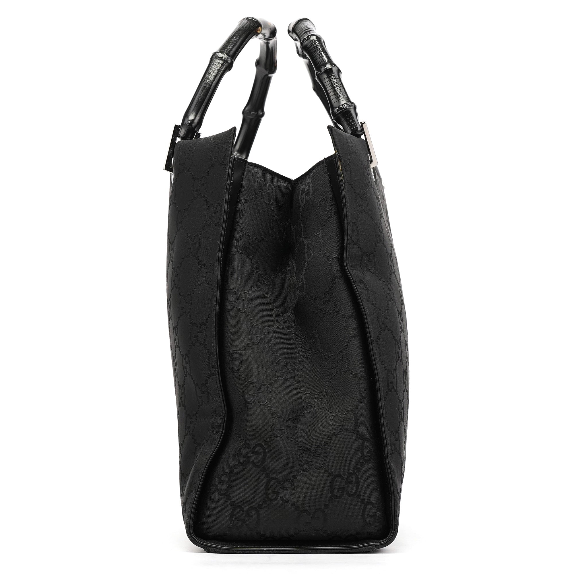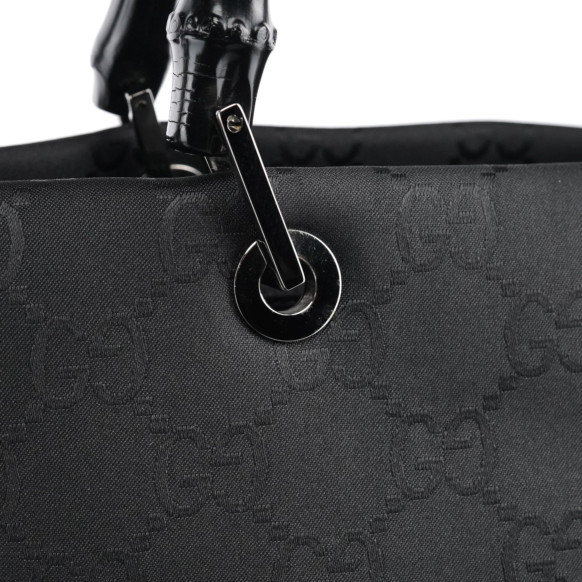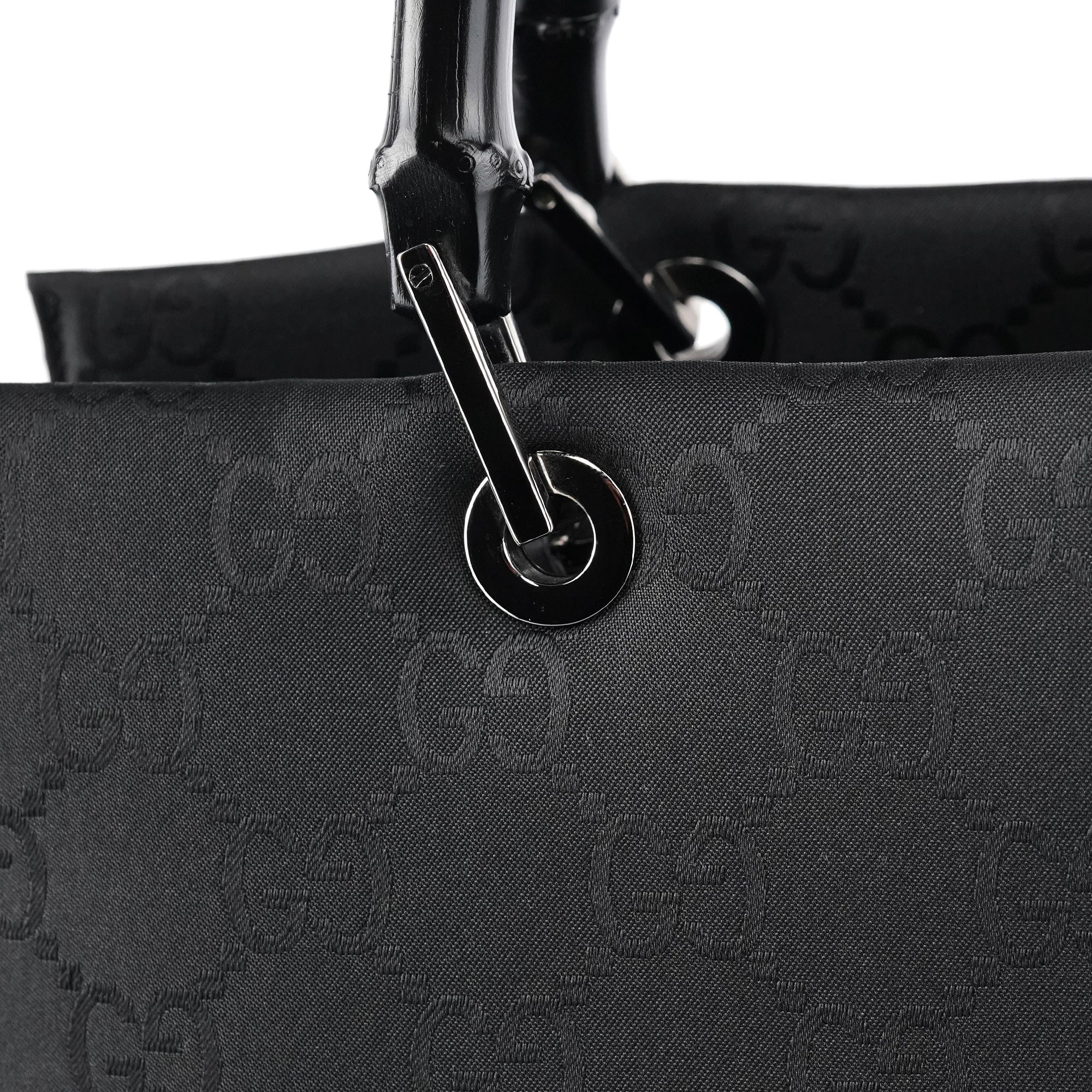 Designed by Tom Ford in the late 1990s, this Gucci Bamboo GG tote bag features two elegant black bamboo handles and silver-tone hardware. Crafted with the iconic GG monogram canvas, it offers three interior compartments lined with satin, including an interior zipper pocket for organized storage, blending luxurious design with practical functionality.