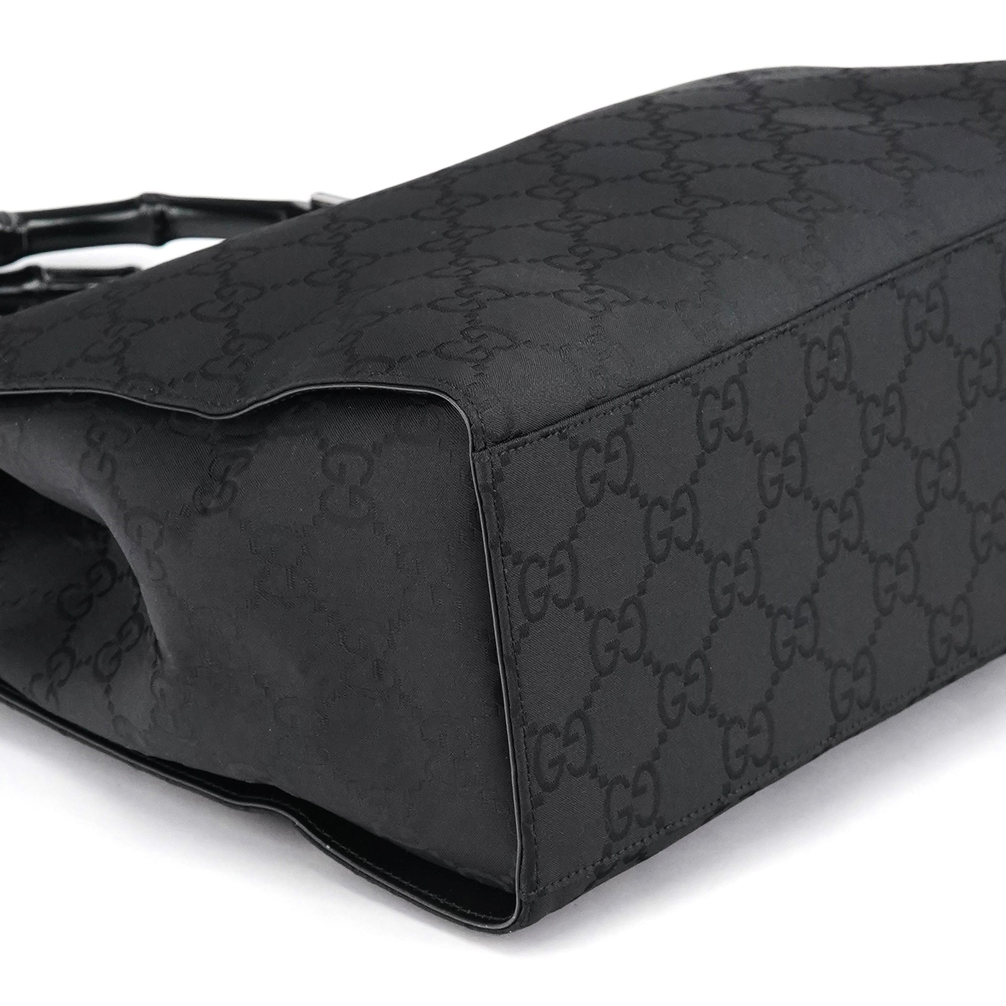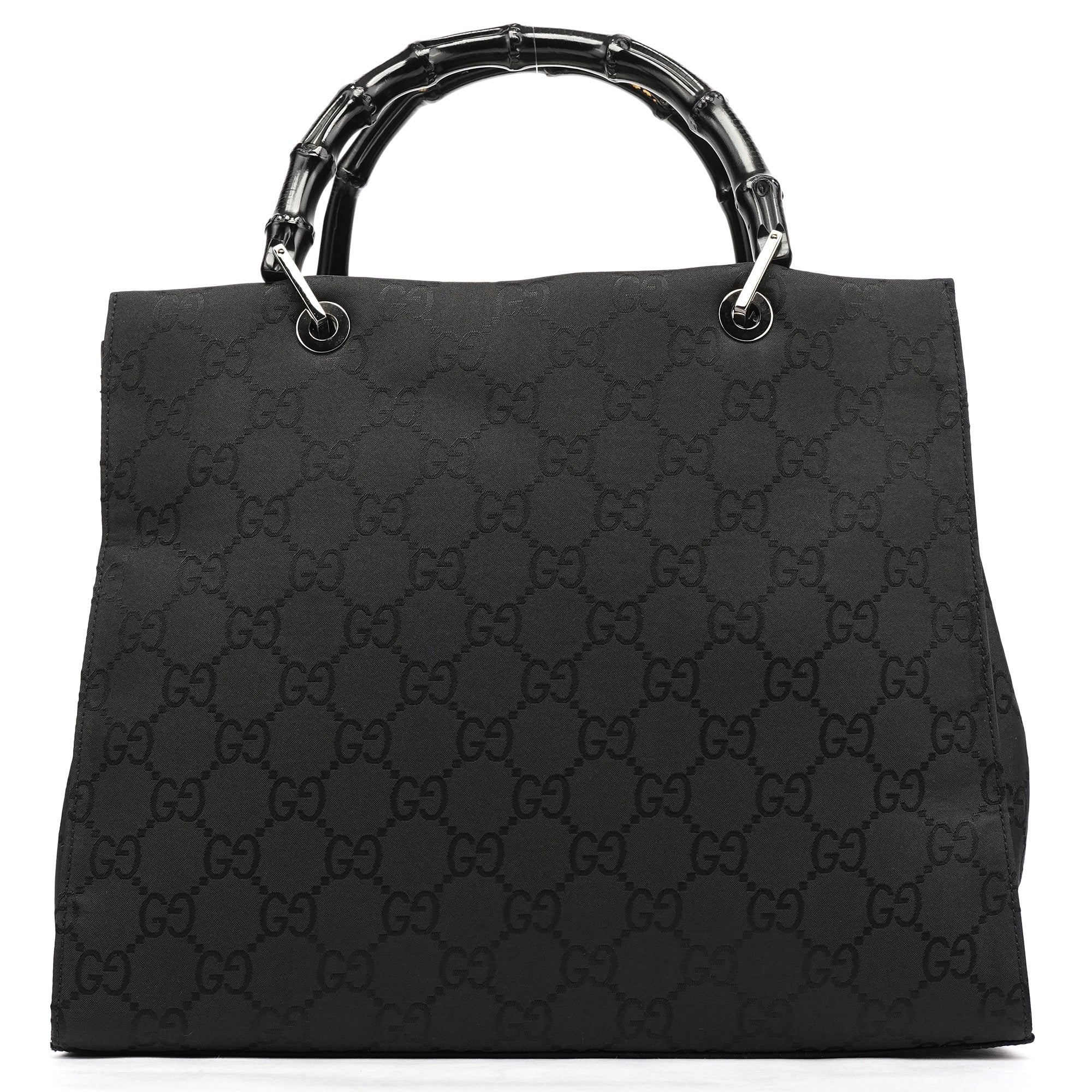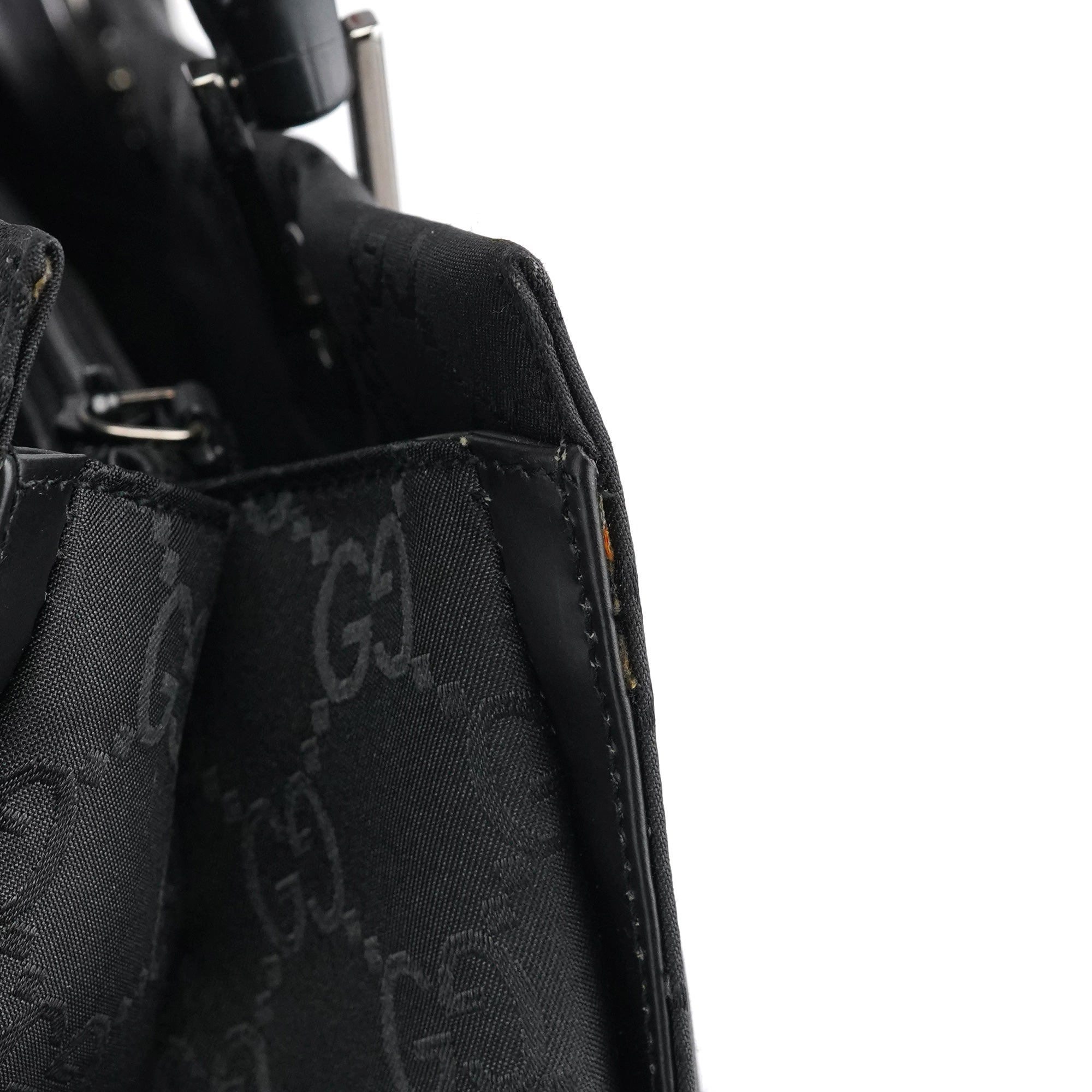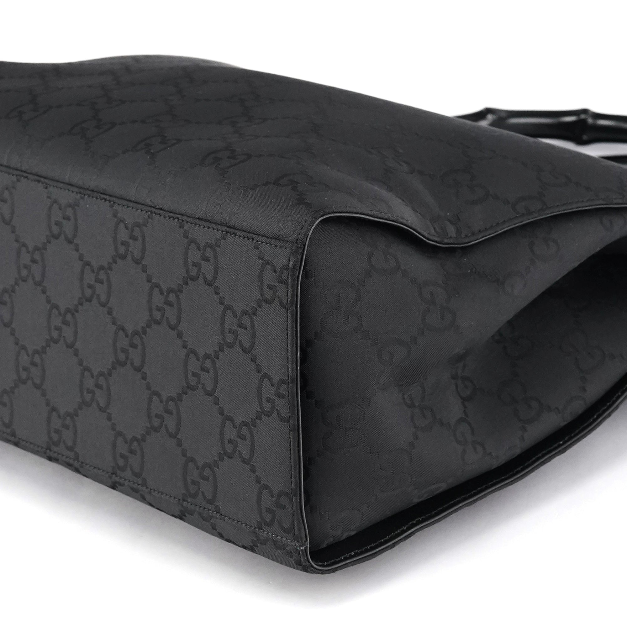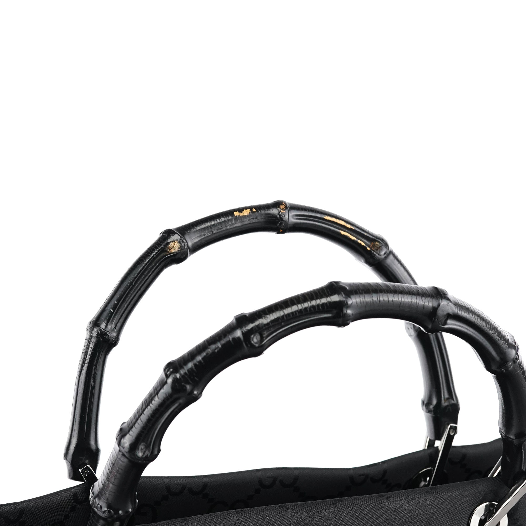 Designed by Tom Ford in the late 1990s, this Gucci Bamboo GG tote bag features two elegant black bamboo handles and silver-tone hardware. Crafted with the iconic GG monogram canvas, it offers three interior compartments lined with satin, including an interior zipper pocket for organized storage, blending luxurious design with practical functionality.