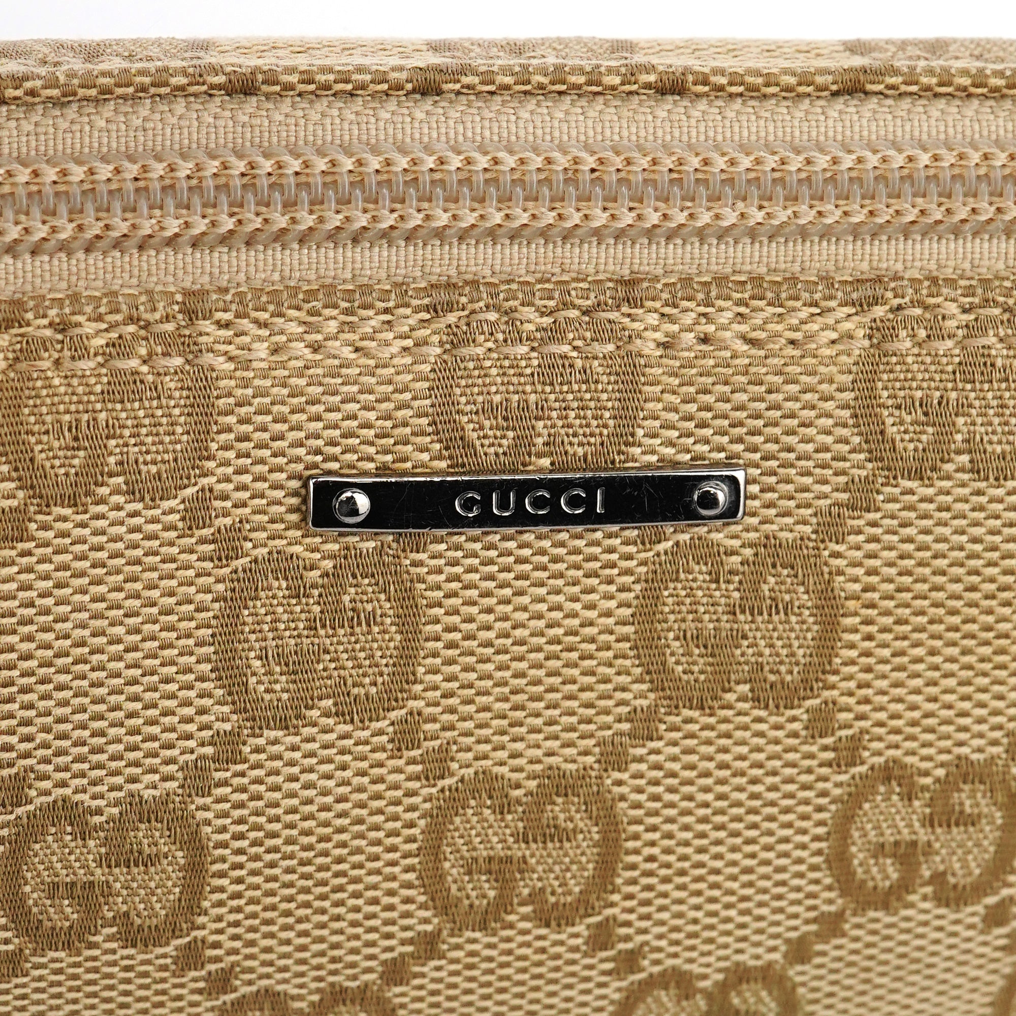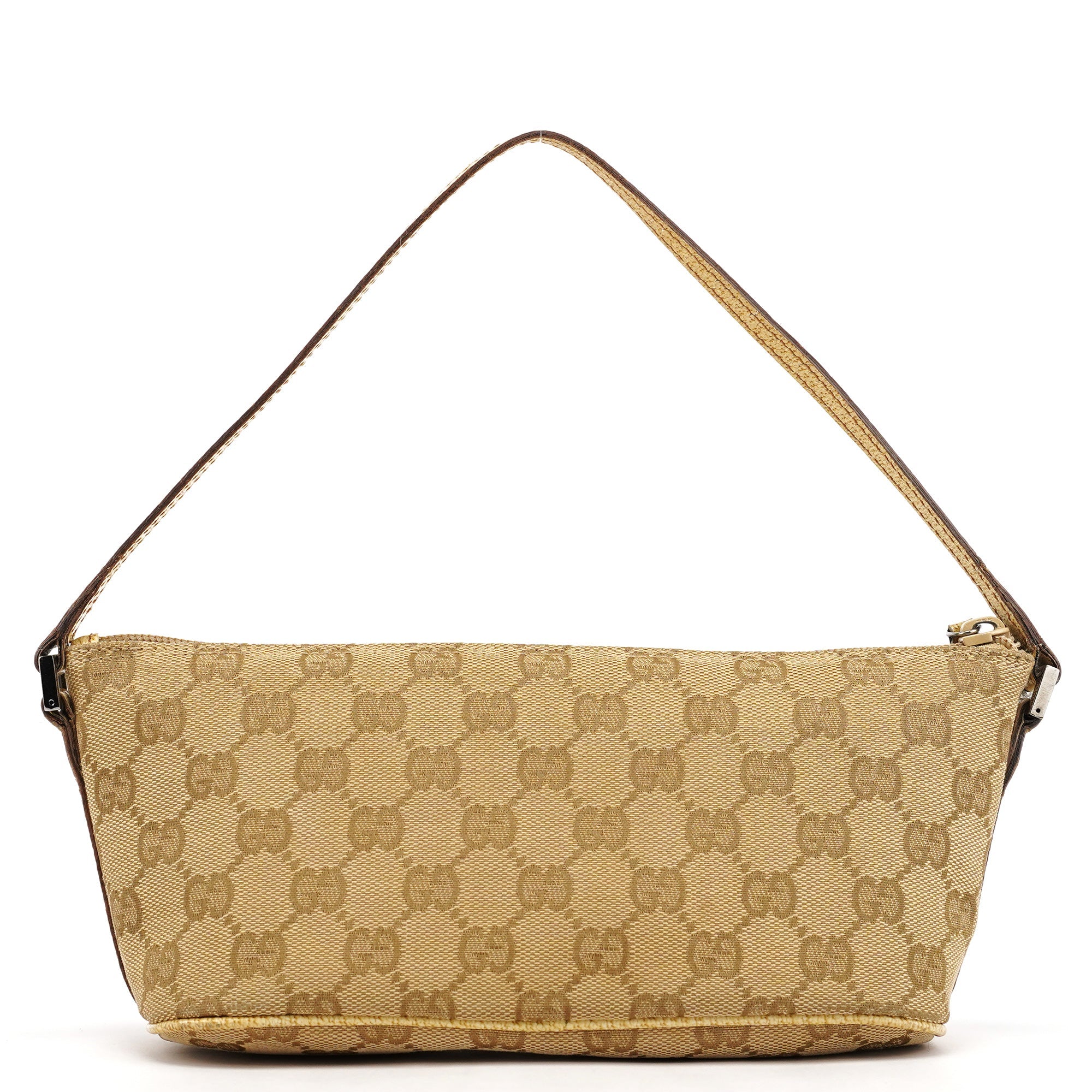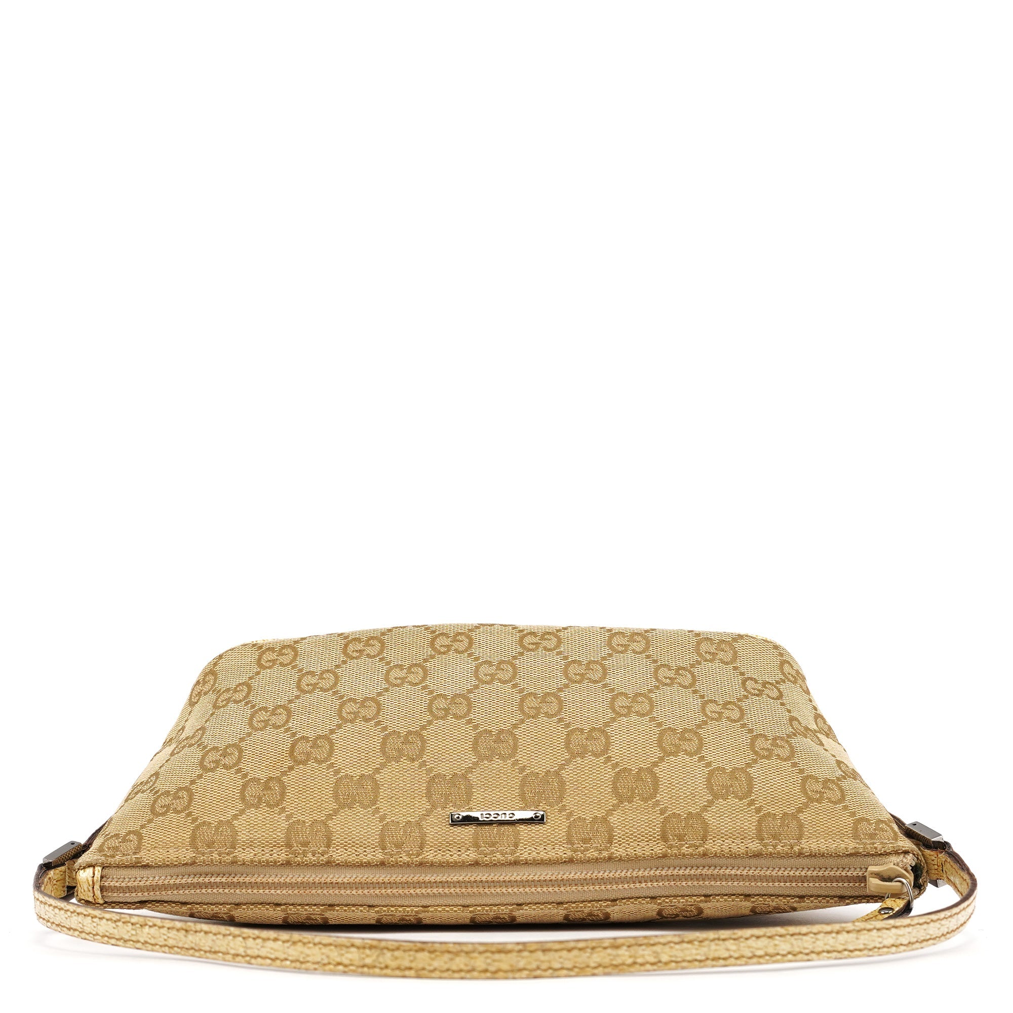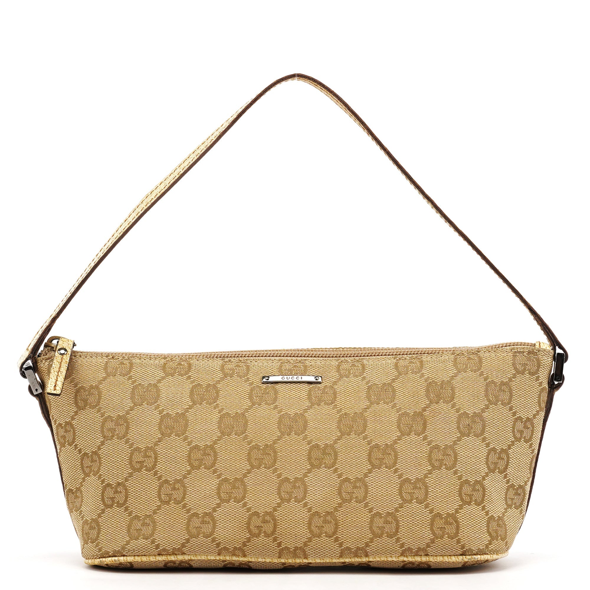 Designed in the early 2000s by Tom Ford, this Gucci GG Boat Pochette is crafted in beige GG monogram canvas with metallic beige leather trim. The slim, elongated silhouette features a top zipper closure and a silver-tone Gucci logo plaque at the front.