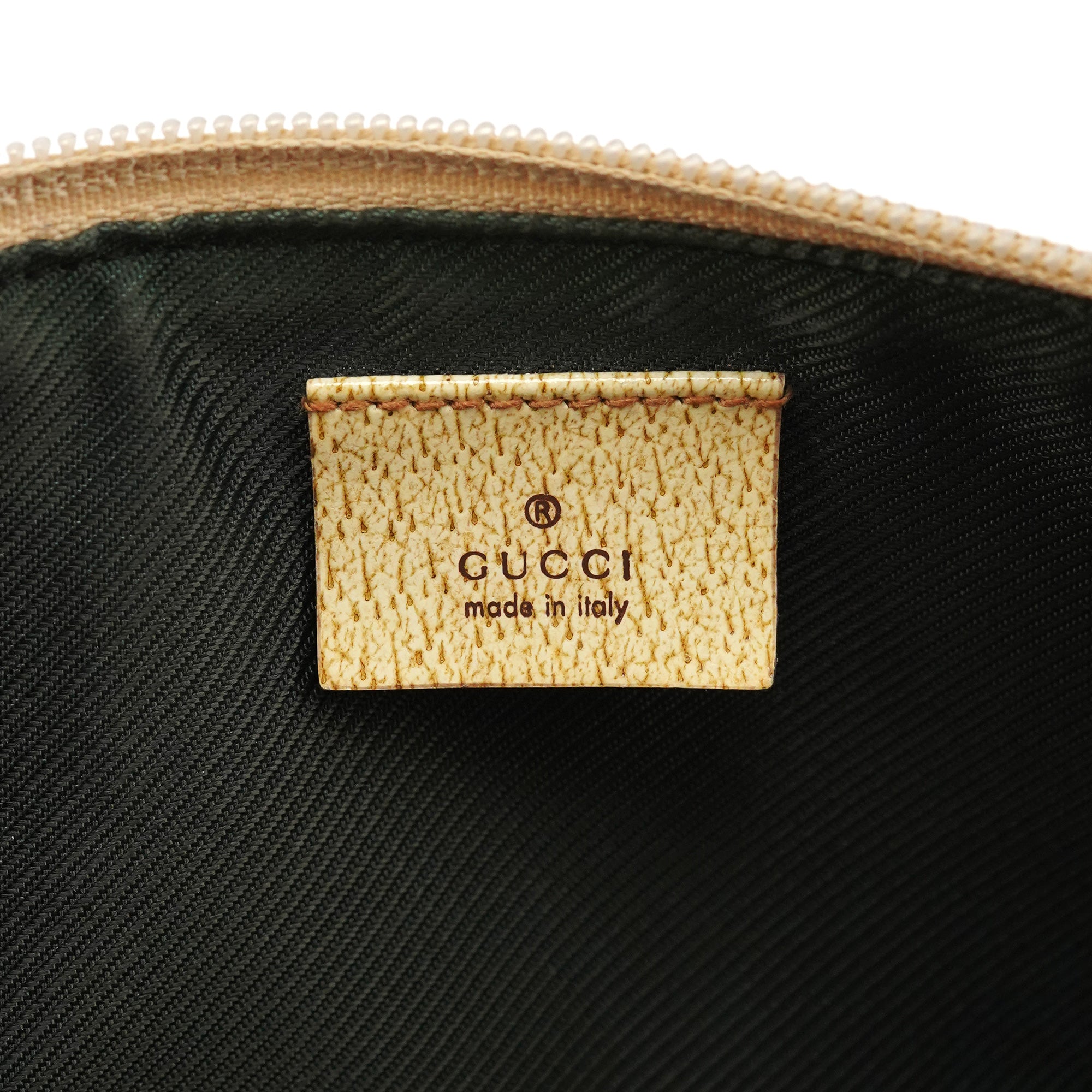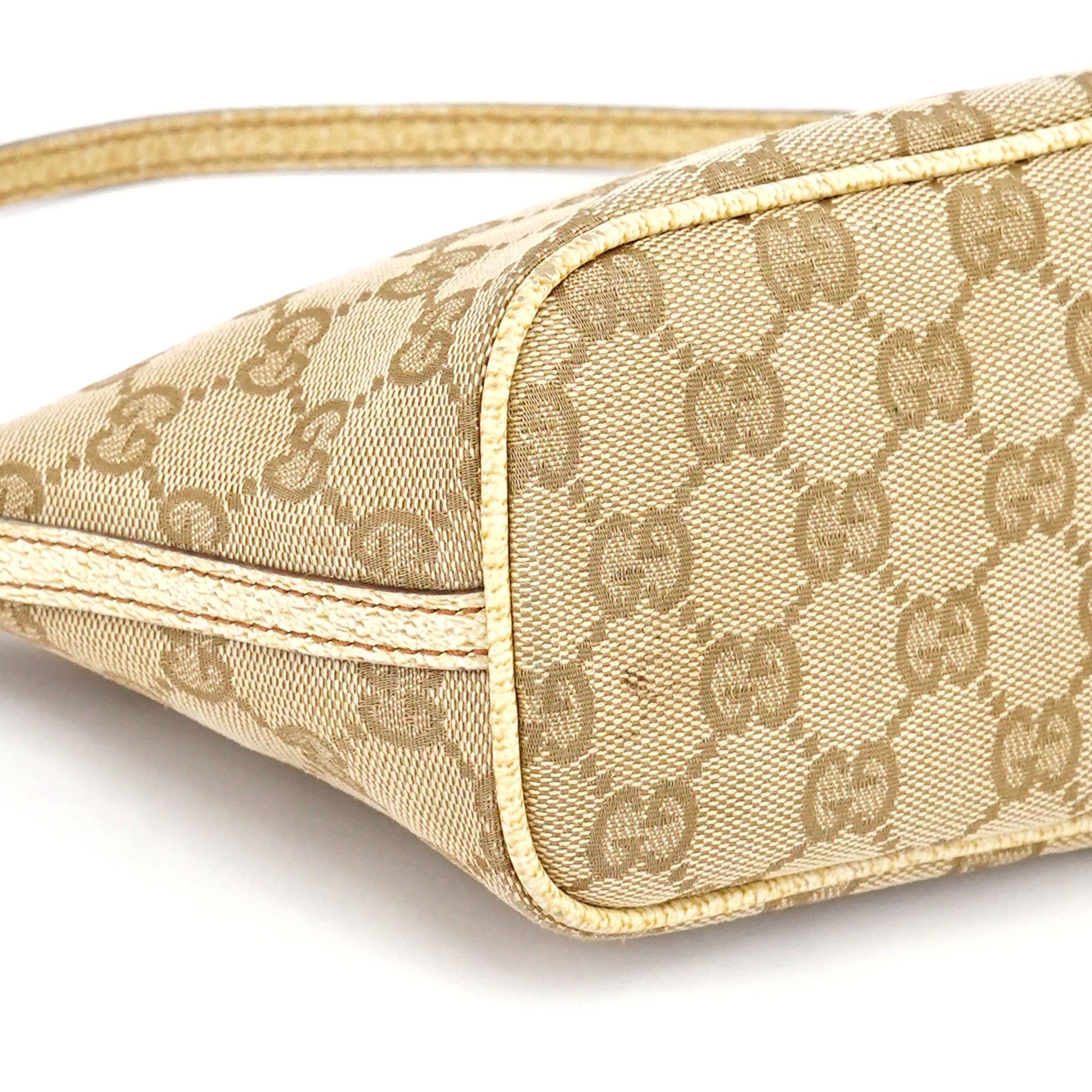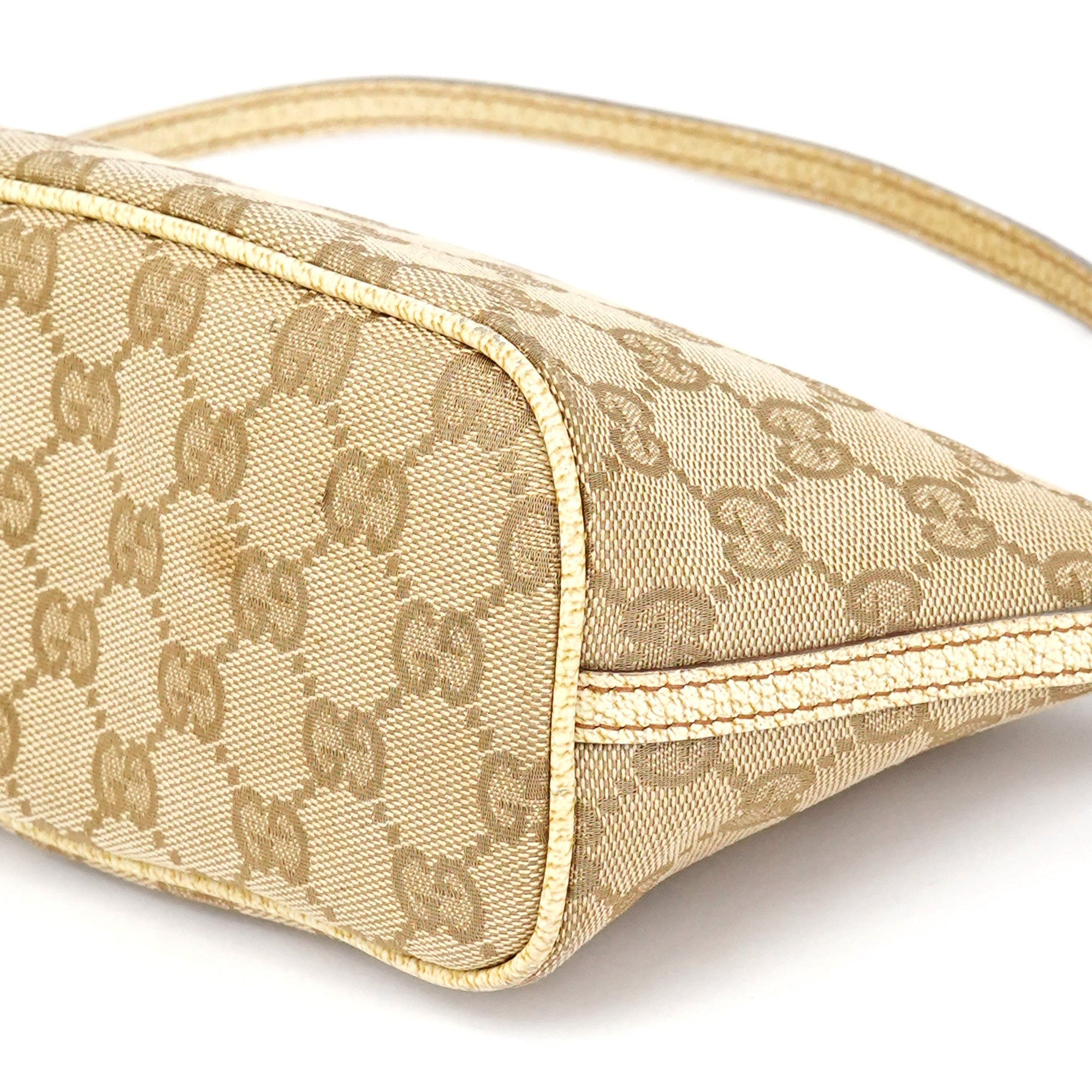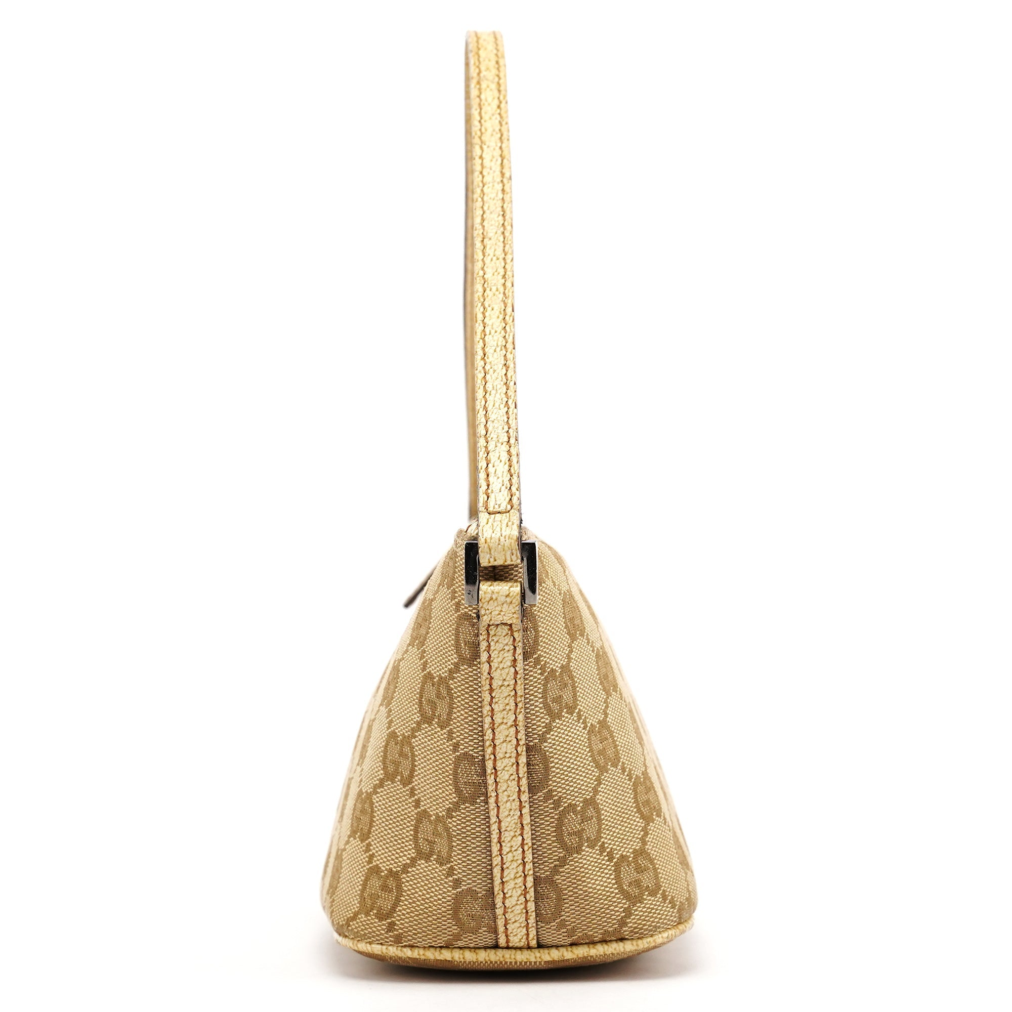 Designed in the early 2000s by Tom Ford, this Gucci GG Boat Pochette is crafted in beige GG monogram canvas with metallic beige leather trim. The slim, elongated silhouette features a top zipper closure and a silver-tone Gucci logo plaque at the front.