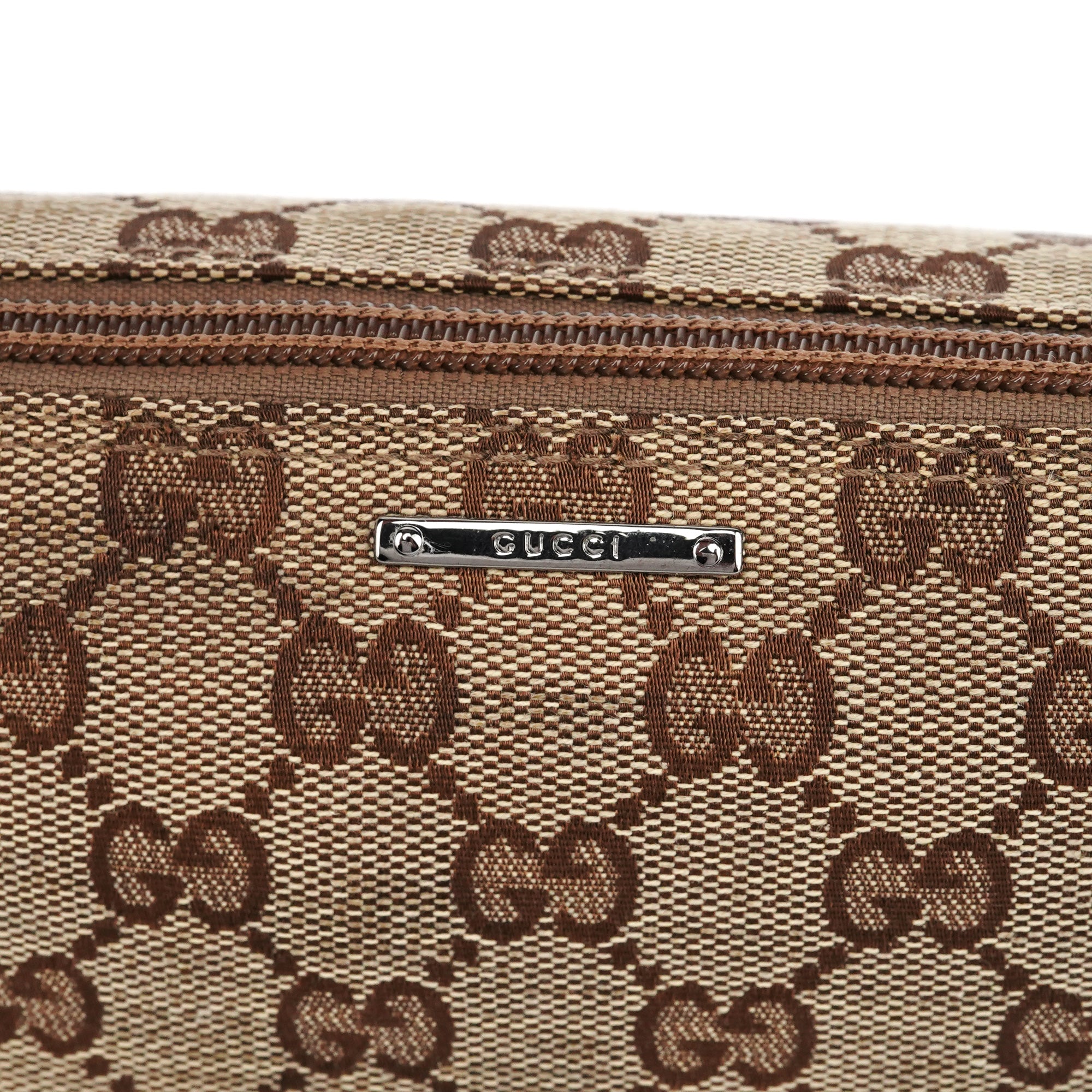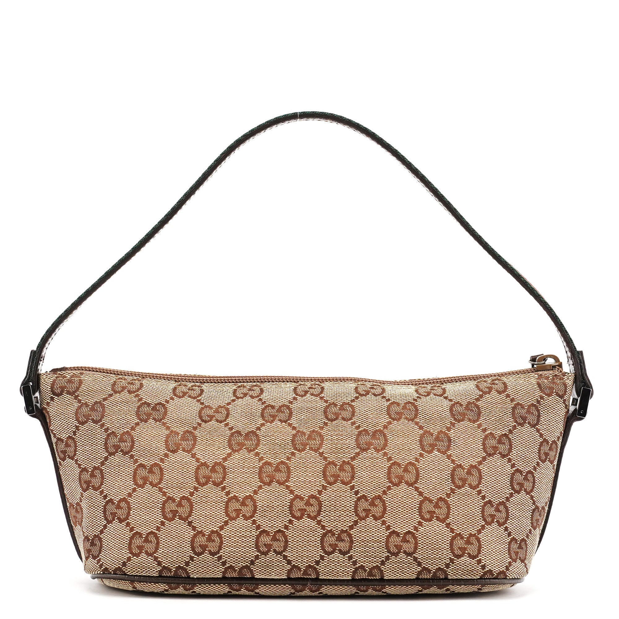 Designed in the early 2000s by Tom Ford, this Gucci Boat Pochette is crafted in beige GG canvas with brown leather trim and a webbed handle in classic Gucci colors. It features silver hardware, a zip closure, and a structured silhouette. The interior is lined in brown fabric with a zip pocket.