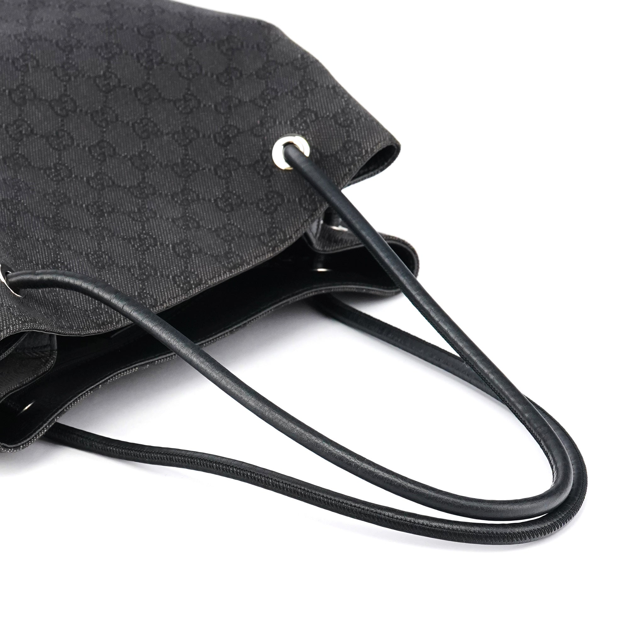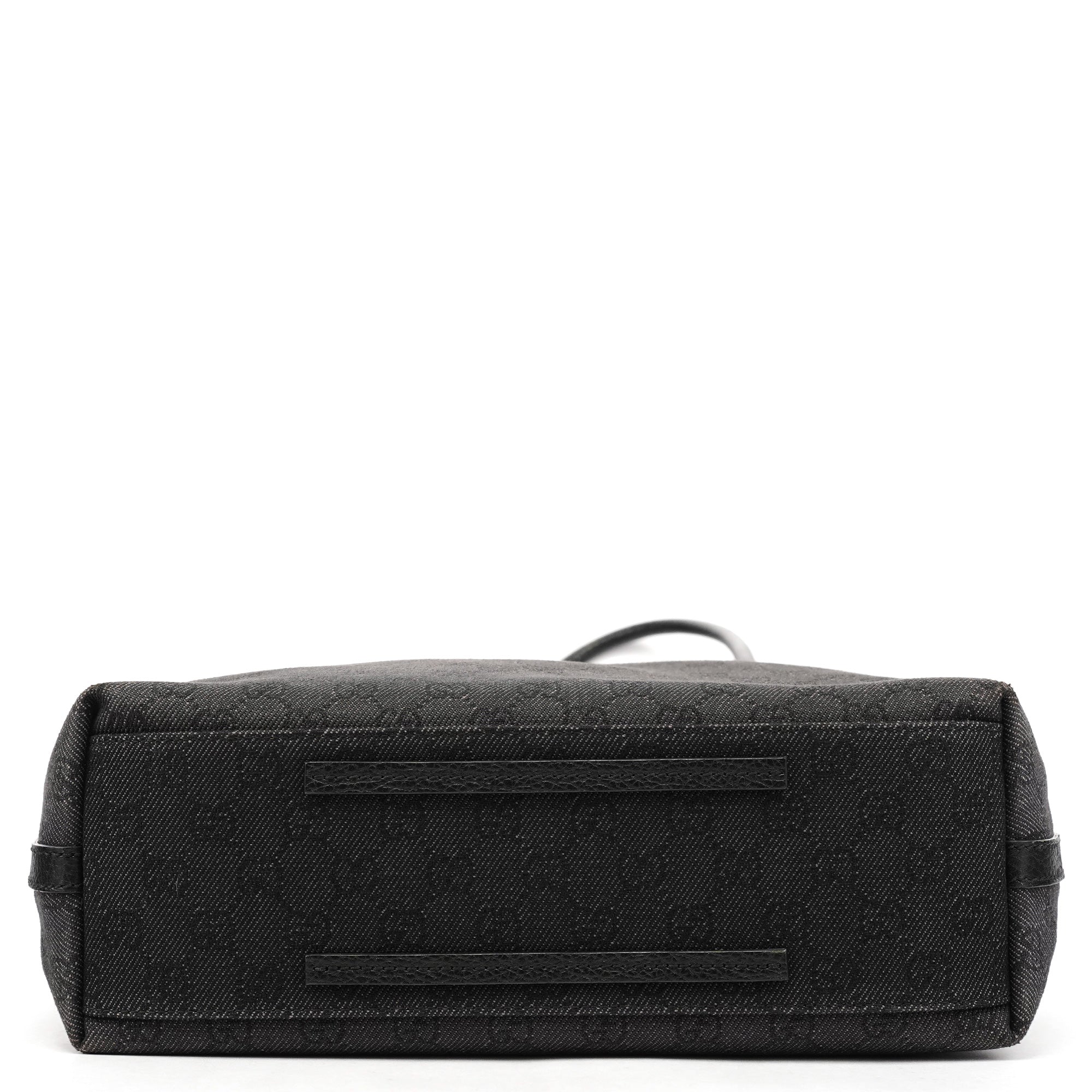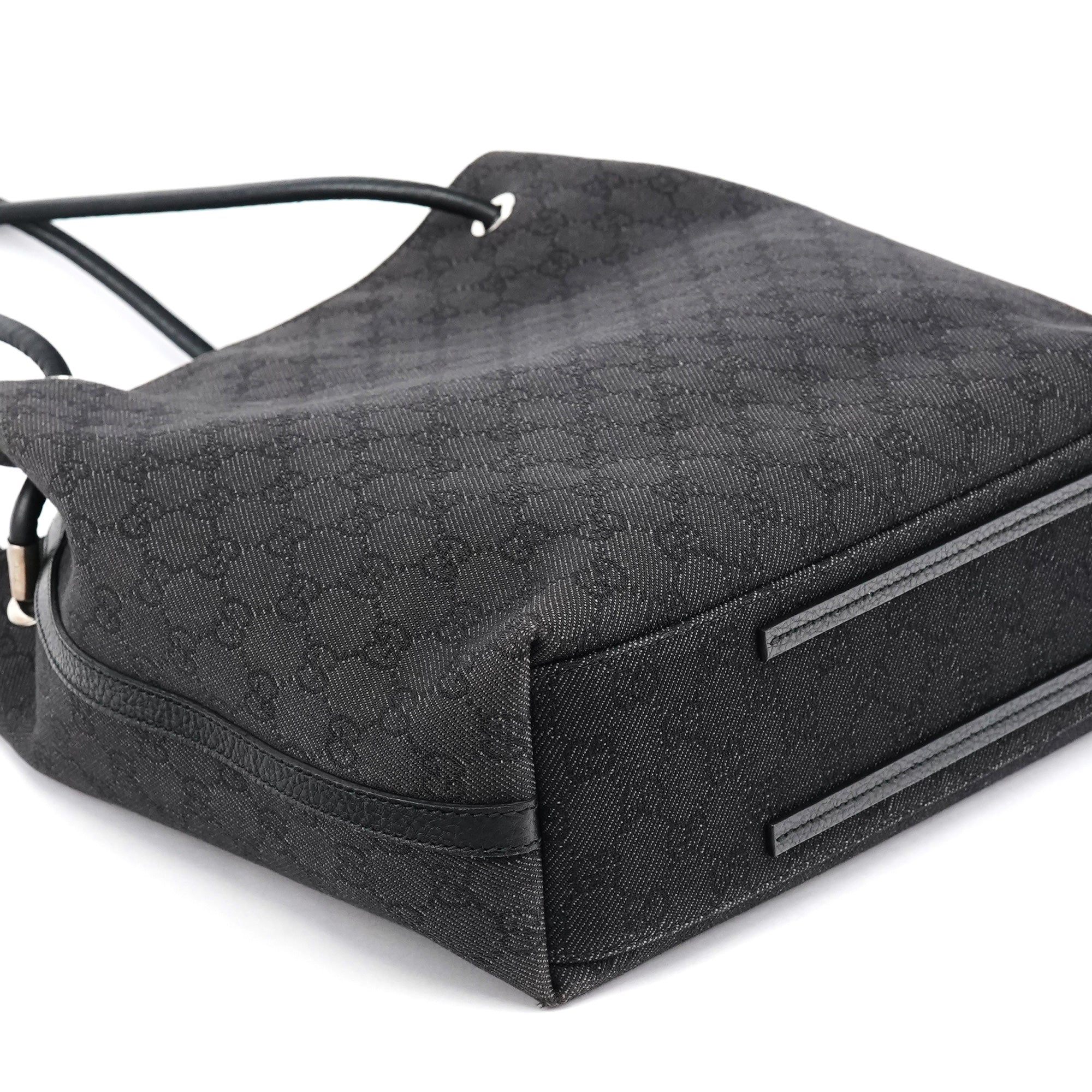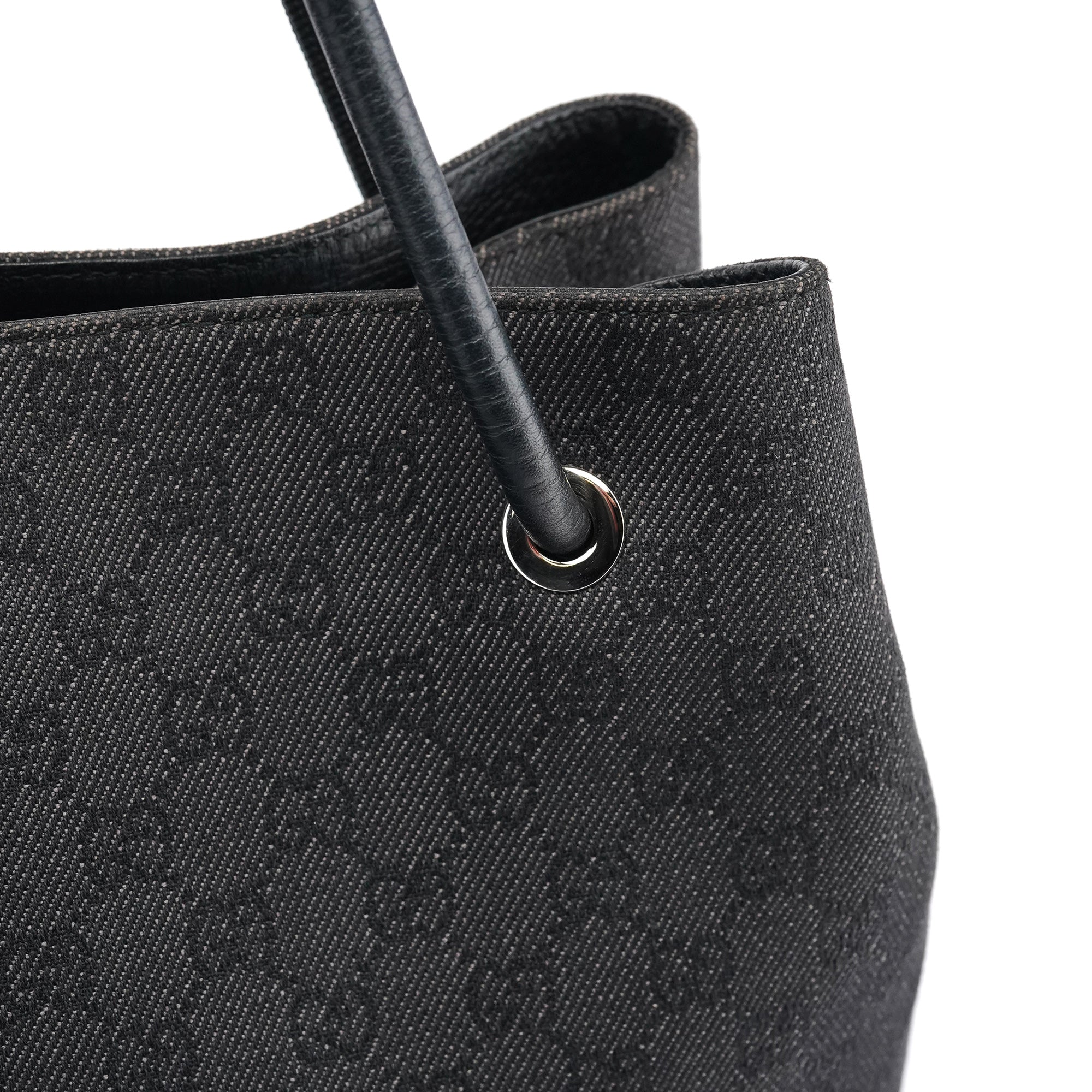 Designed in the early 2000s by Tom Ford, this Gucci GG tote is crafted from dark anthracite denim with an all-over monogram. The structured silhouette utilizes black leather trim and thin leather drawstring straps that cinch the top. It features silver-tone hardware with a subtle engraved Gucci logo and a single black fabric-lined interior.