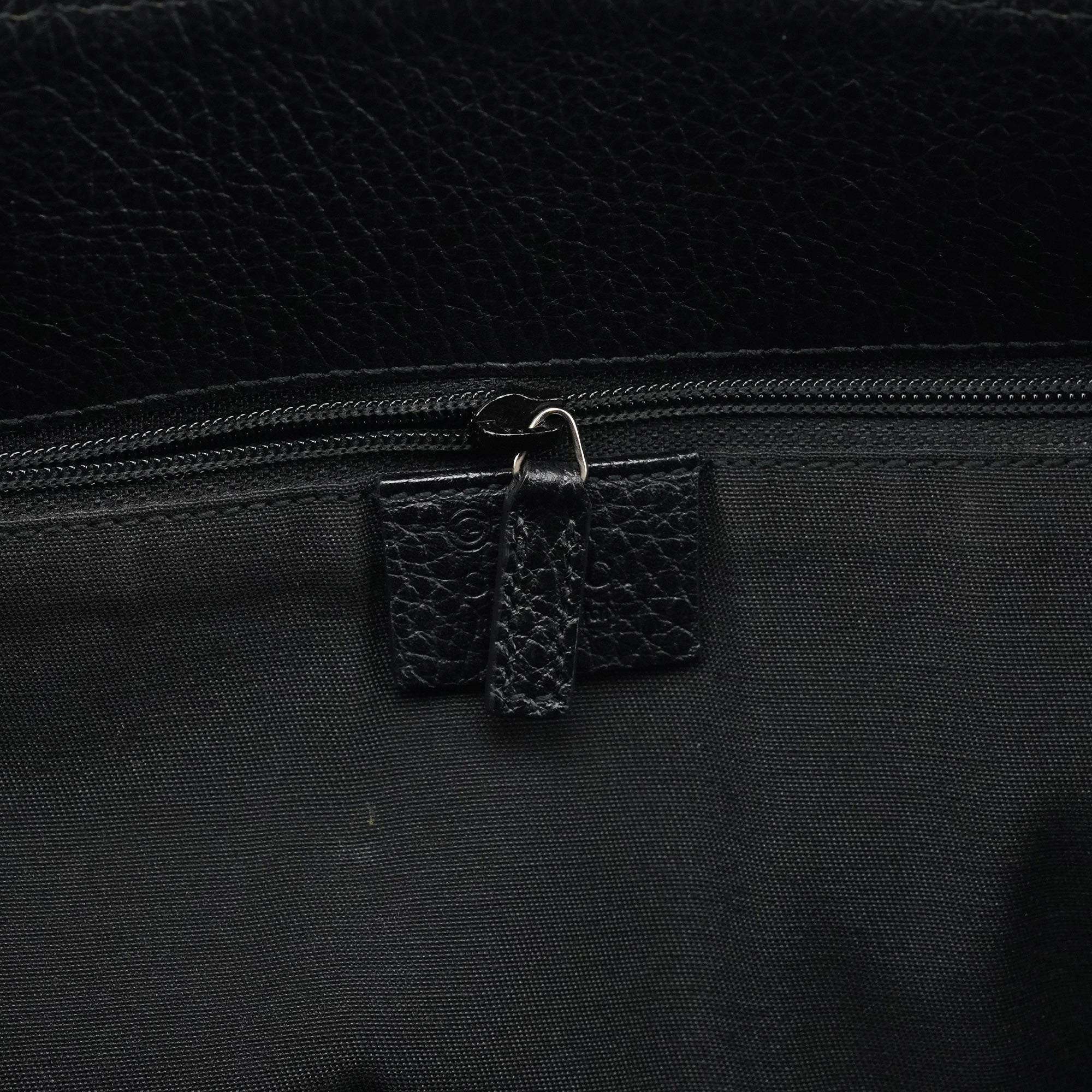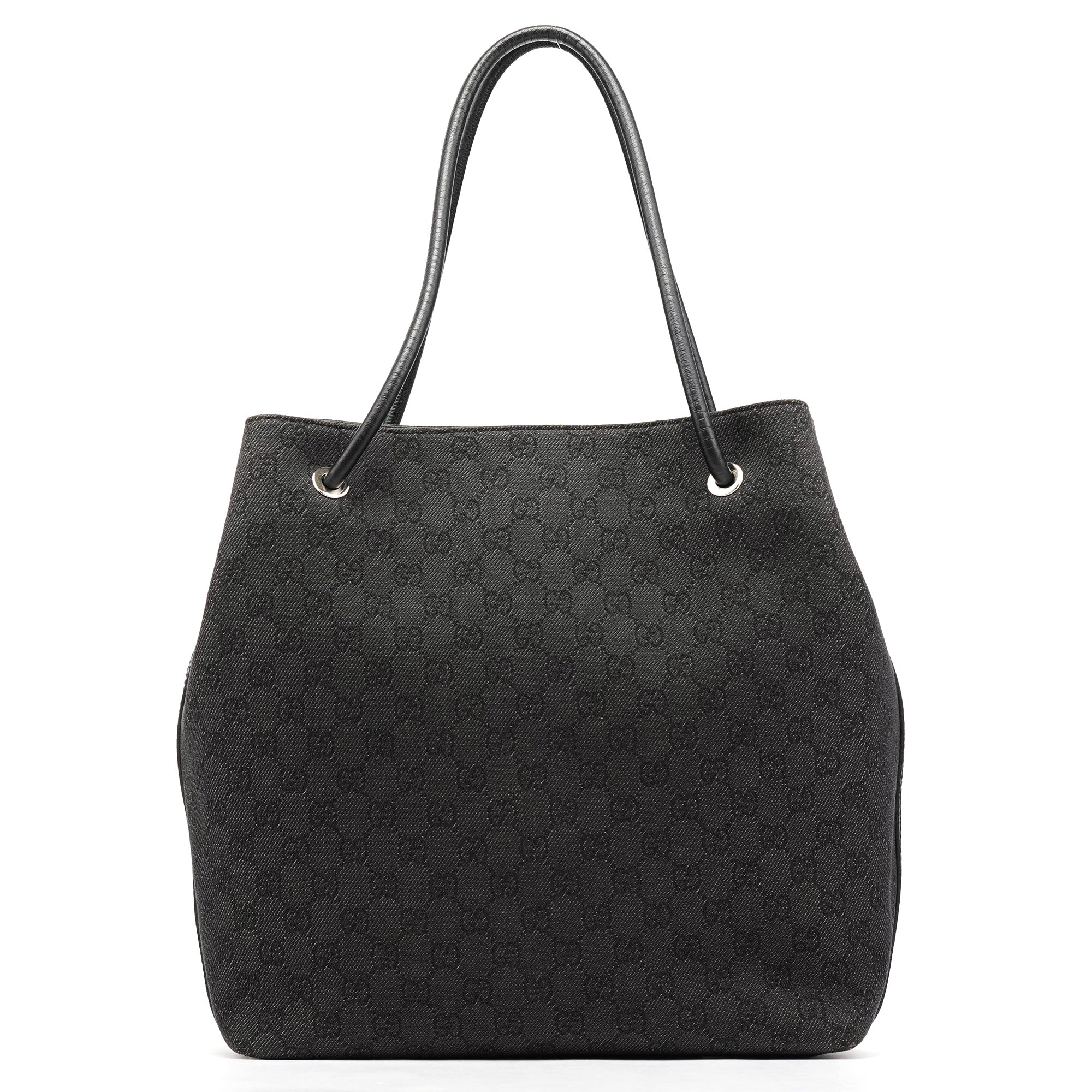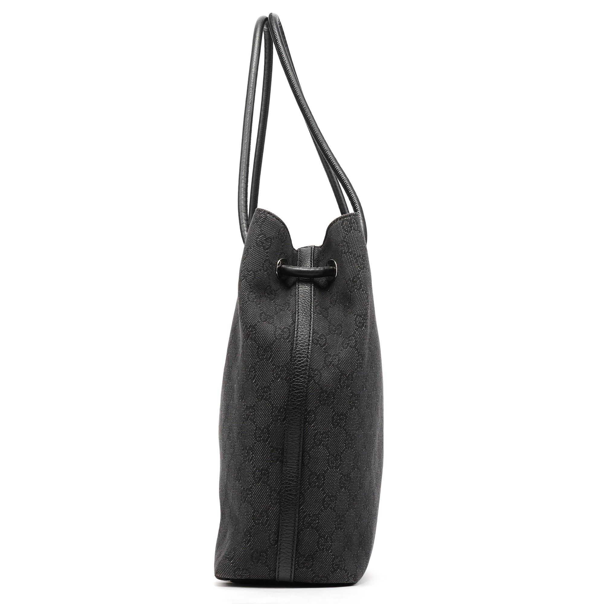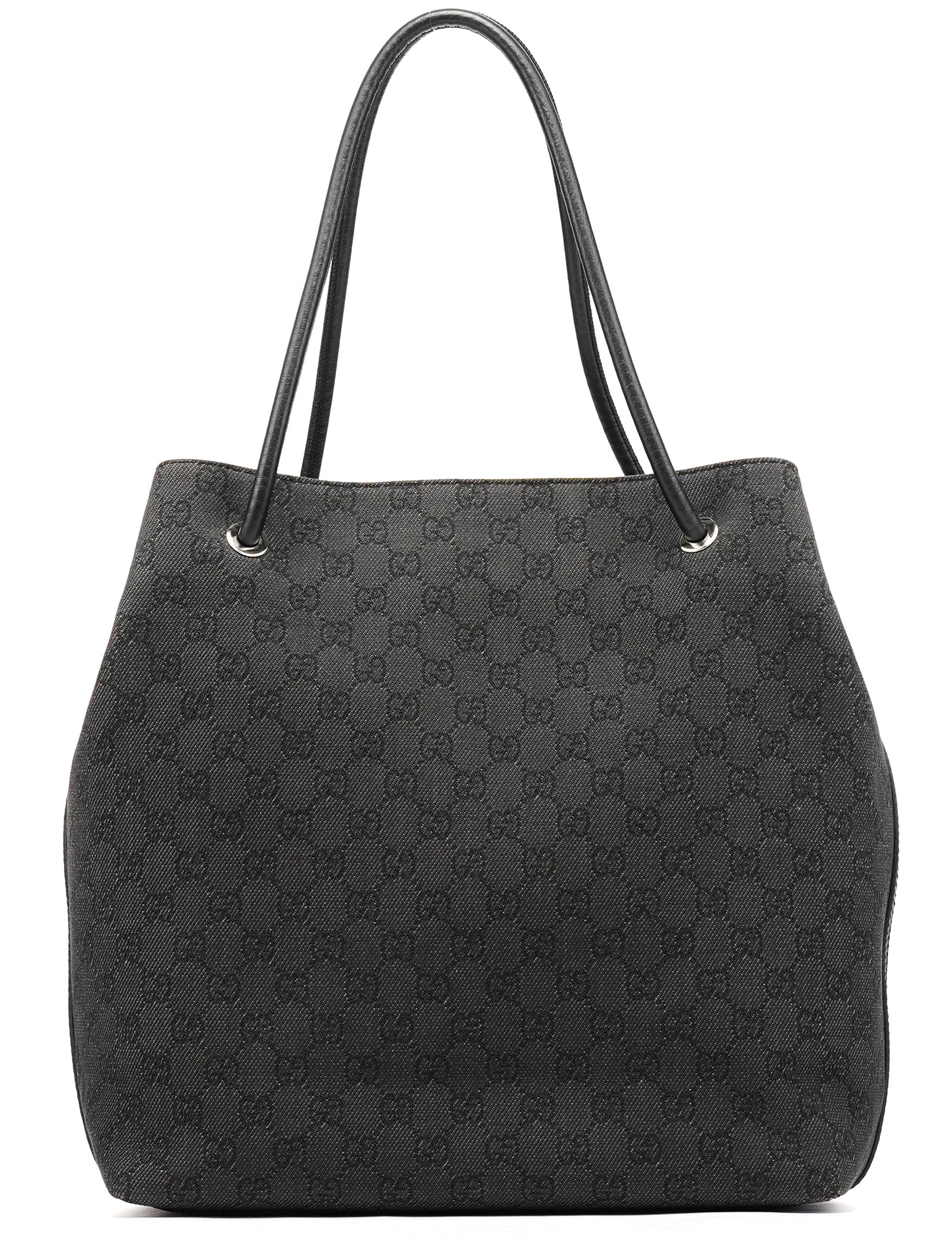 Designed in the early 2000s by Tom Ford, this Gucci GG tote is crafted from dark anthracite denim with an all-over monogram. The structured silhouette utilizes black leather trim and thin leather drawstring straps that cinch the top. It features silver-tone hardware with a subtle engraved Gucci logo and a single black fabric-lined interior.