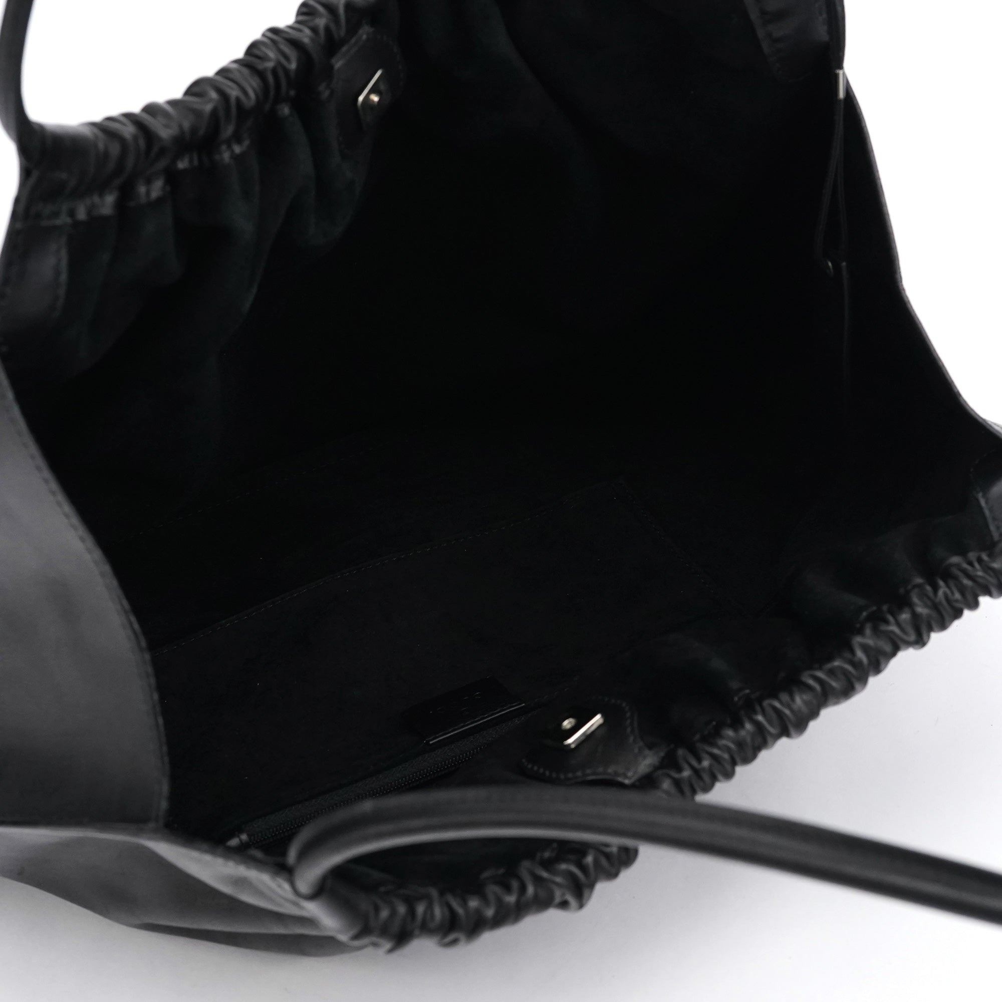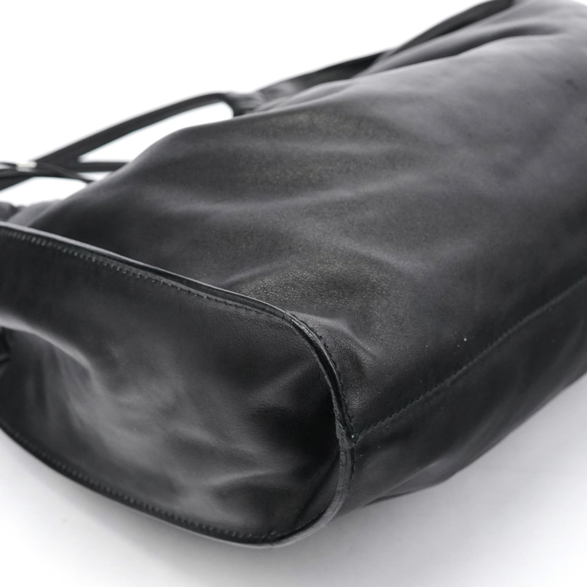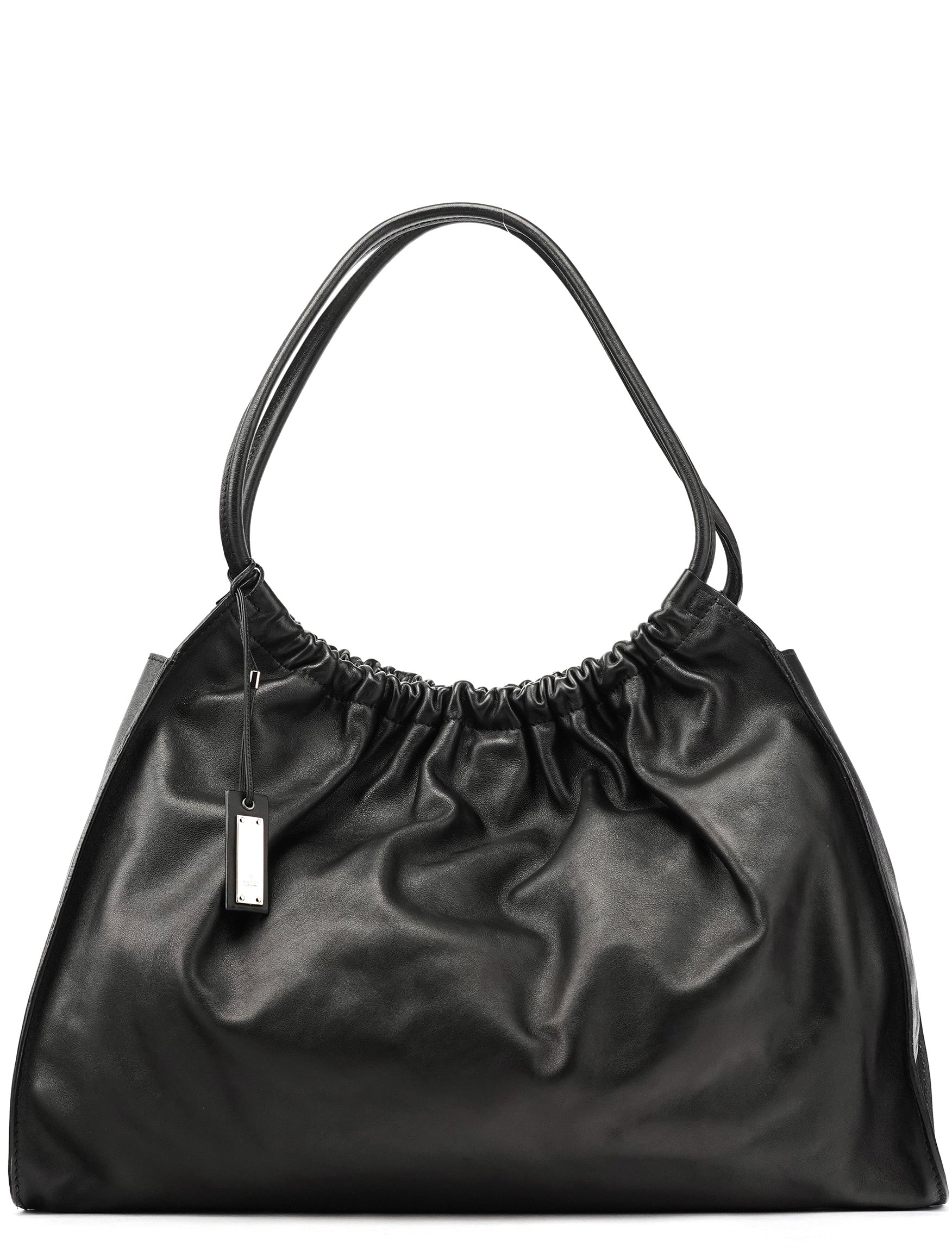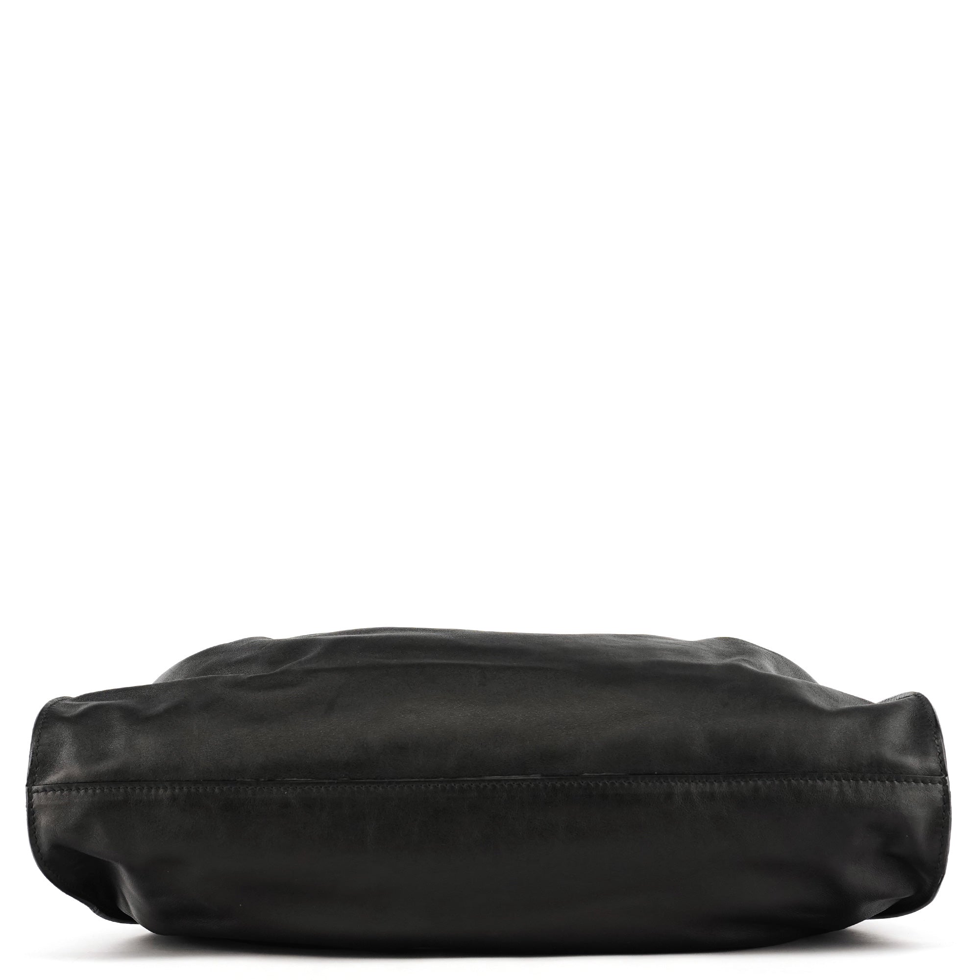 Designed in the late 1990s under Tom Ford’s direction at Gucci, this slouchy hobo is crafted in smooth black calfskin leather with a softly ruched top and minimalist silhouette. It features double shoulder straps, a magnetic snap closure, and a spacious suede-lined interior with a zip pocket. Finished with subtle silver-tone branding, it’s an understated yet refined example of Ford-era Gucci.