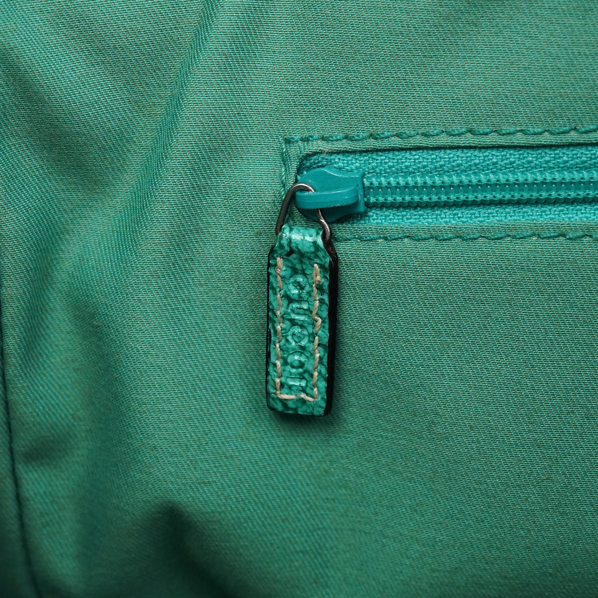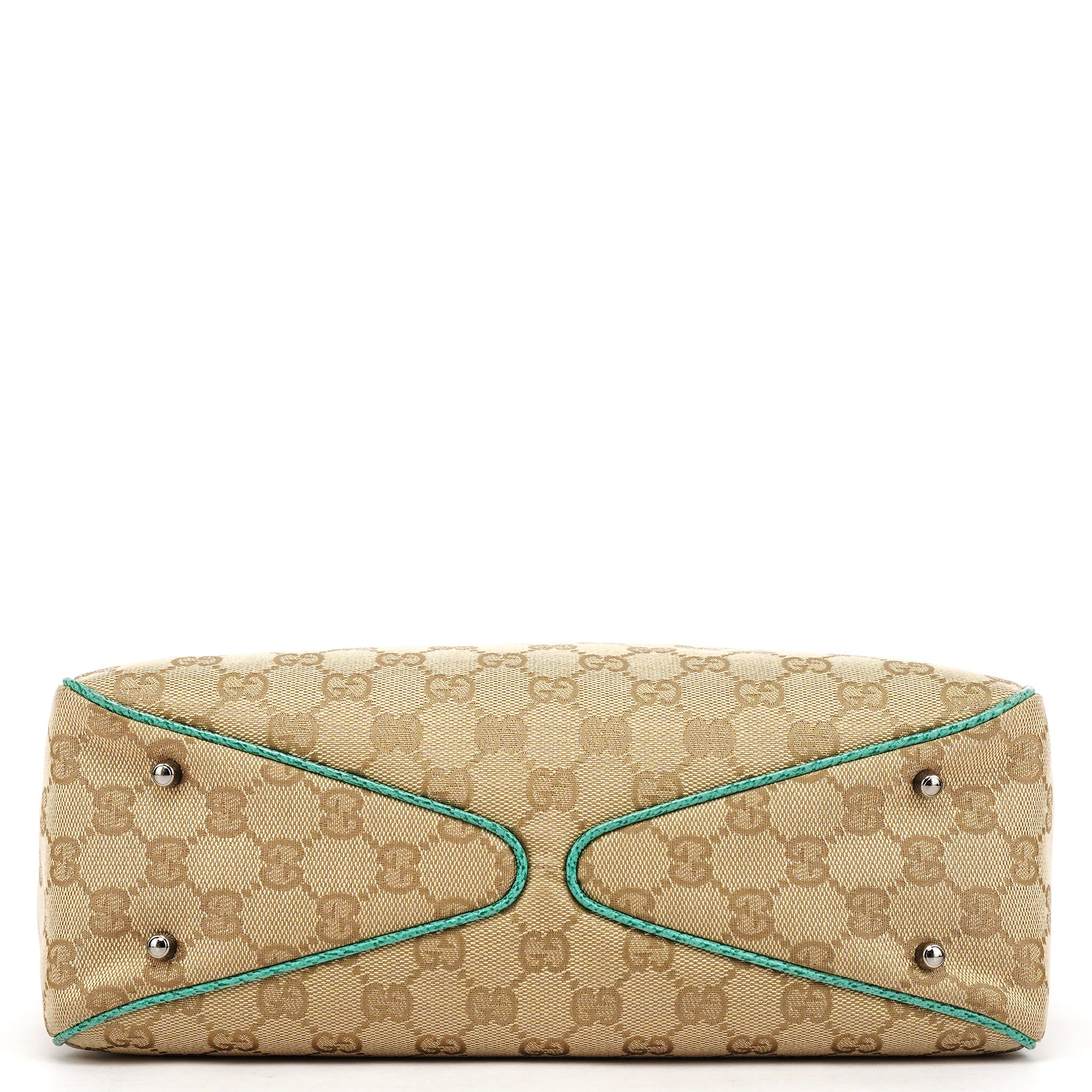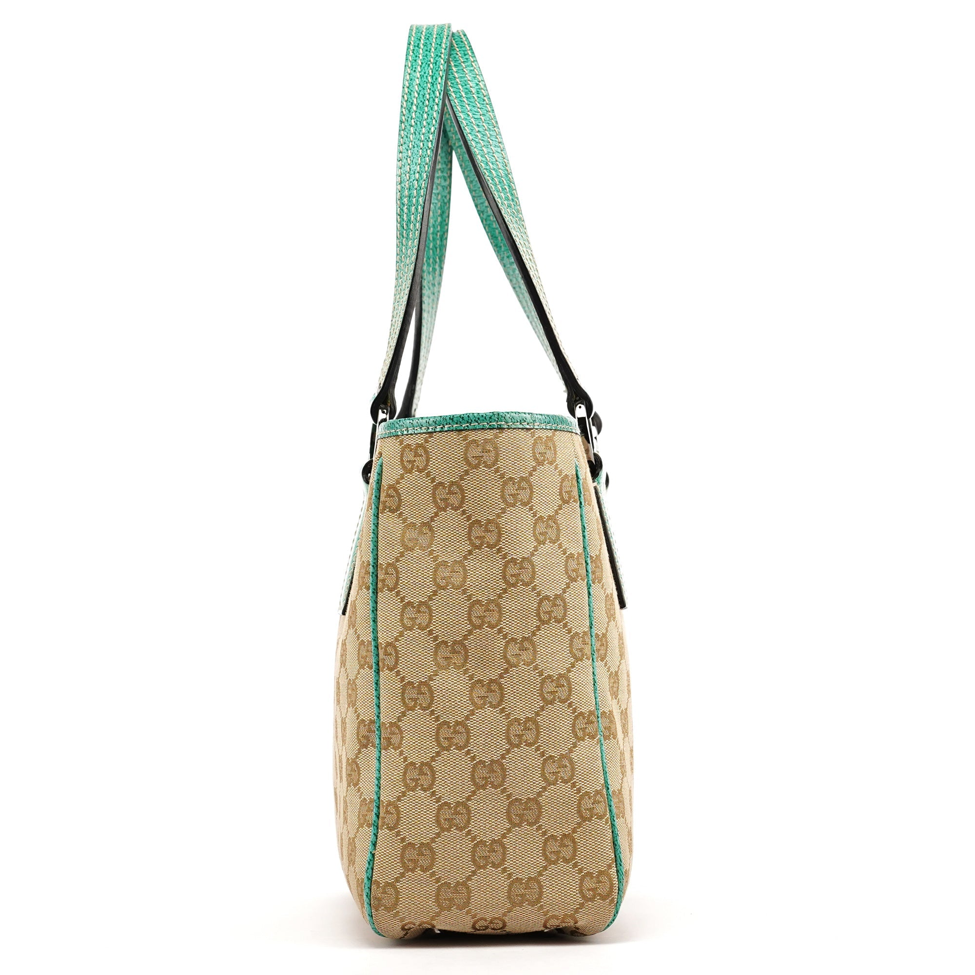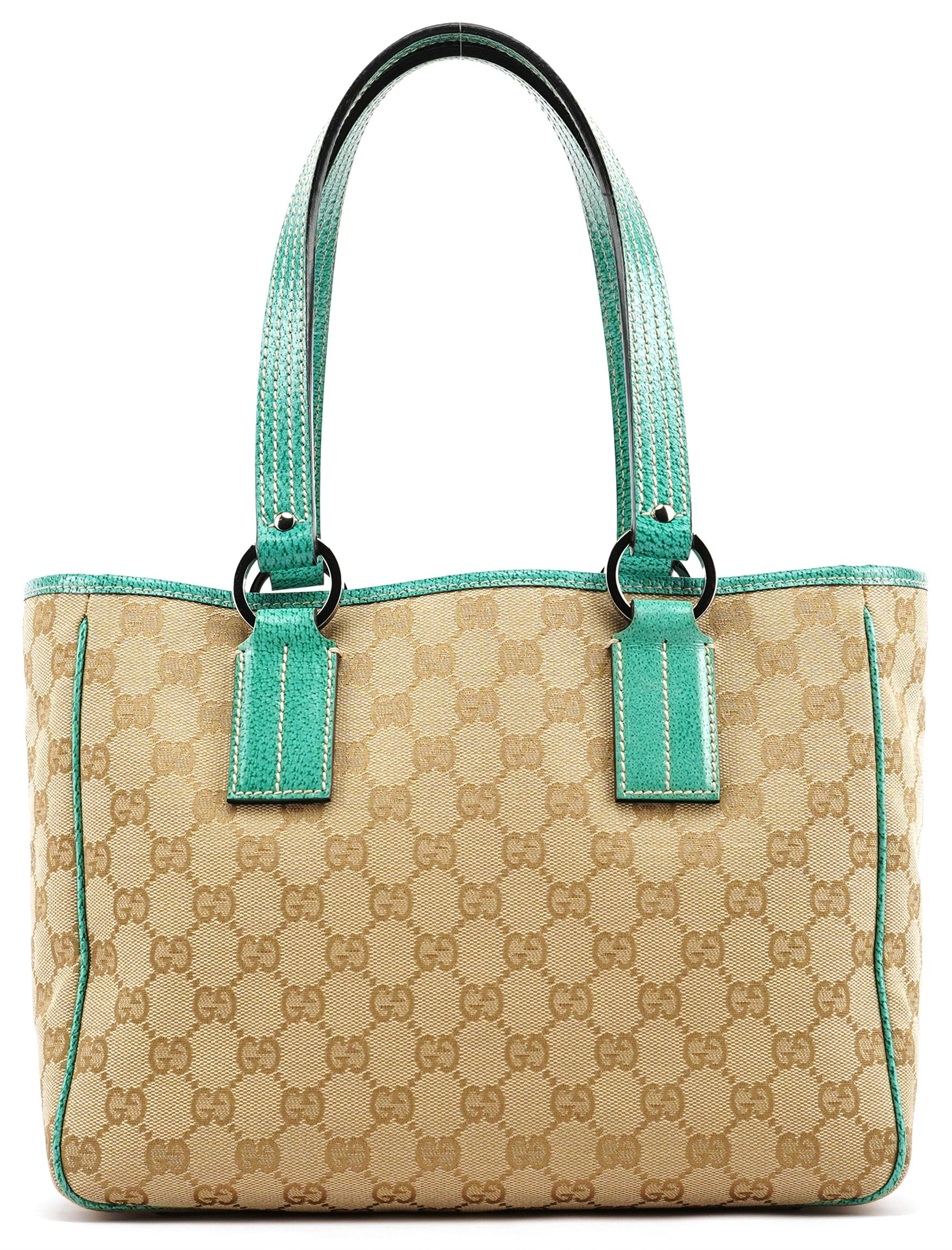 Designed in the early 2000s by Tom Ford, this Gucci tote is crafted from beige GG monogram canvas with turquoise leather trim. The structured silhouette features double leather straps, contrast stitching, and a turquoise fabric-lined interior with a zip pocket and matching leather pull. Silver-tone hardware completes this fresh and vibrant archival design.
