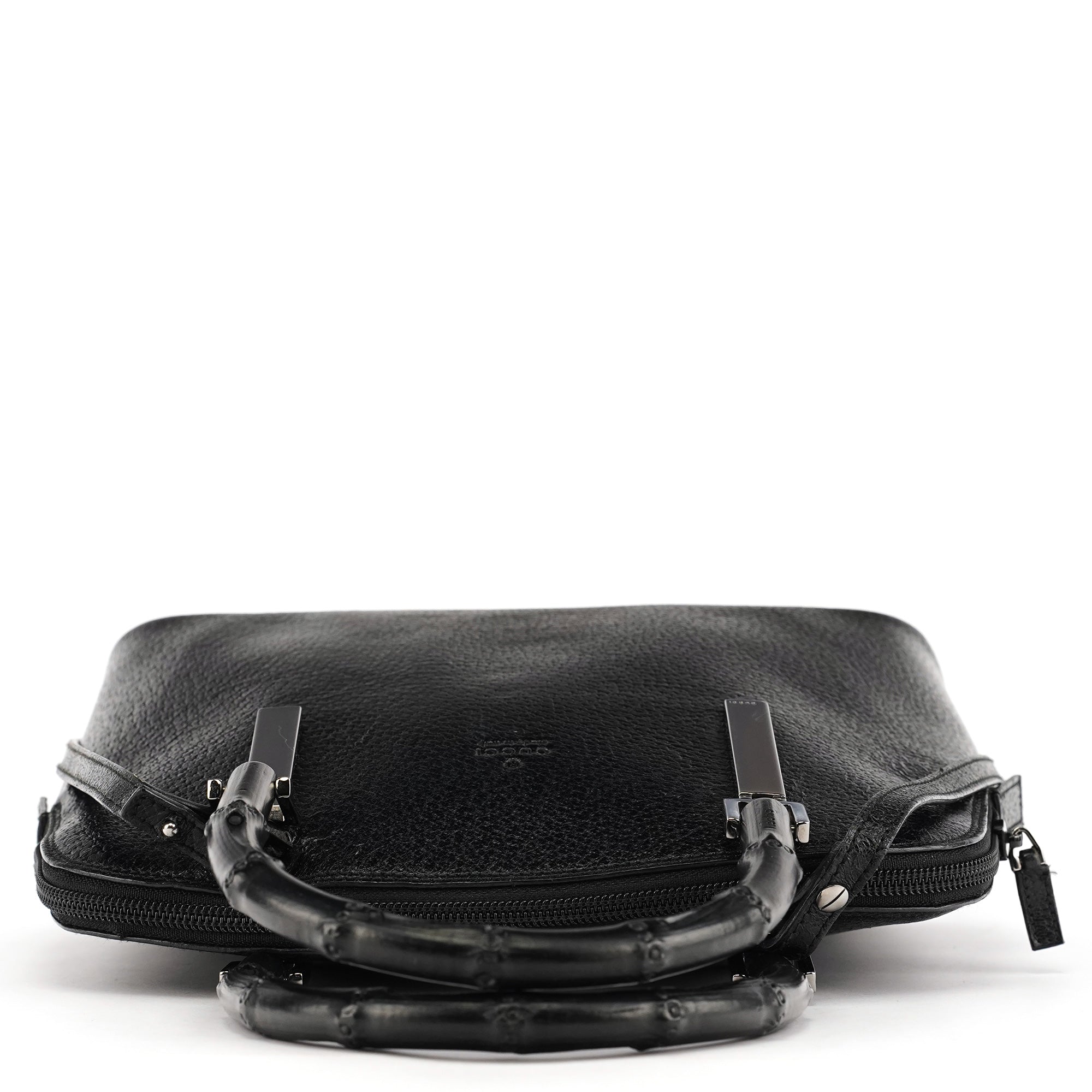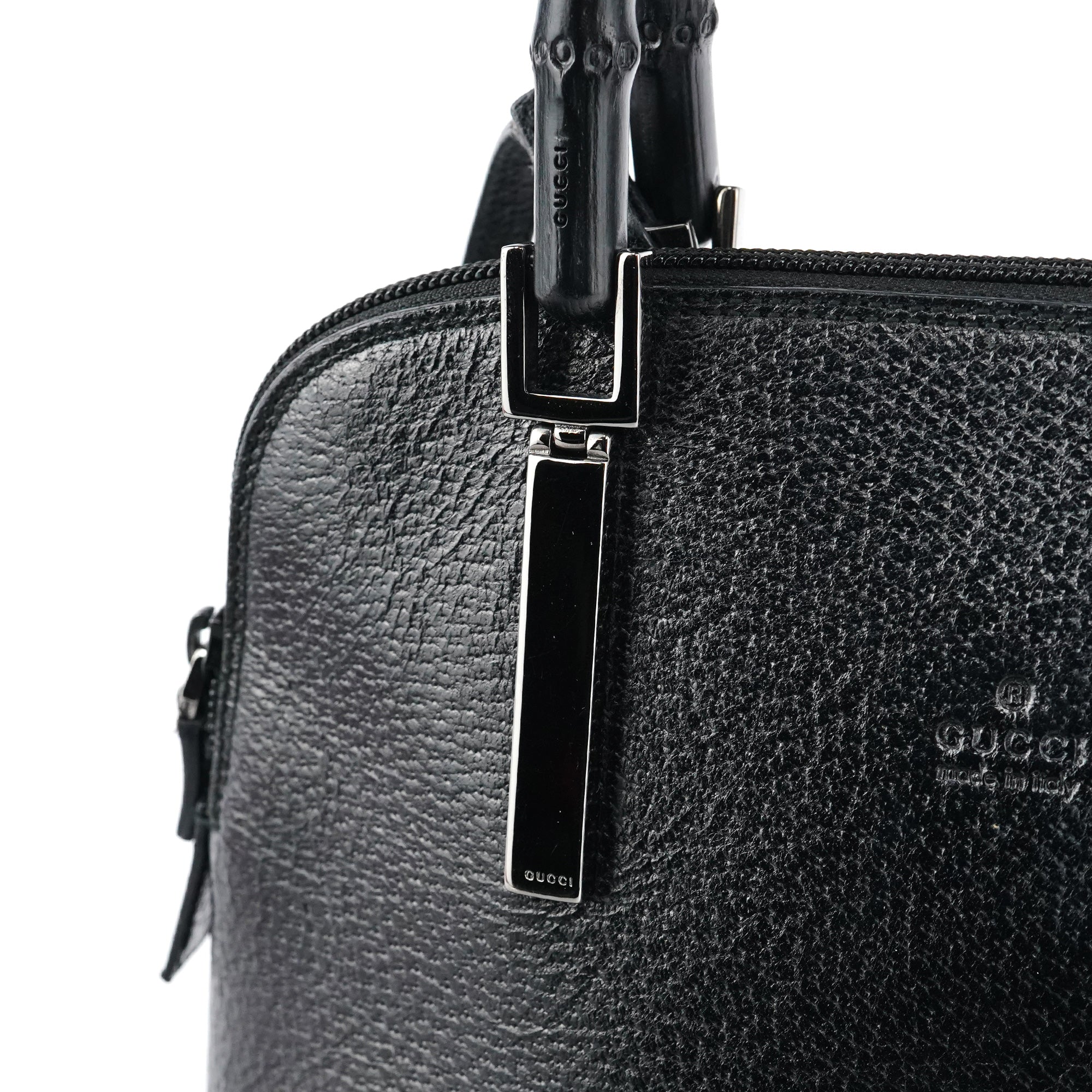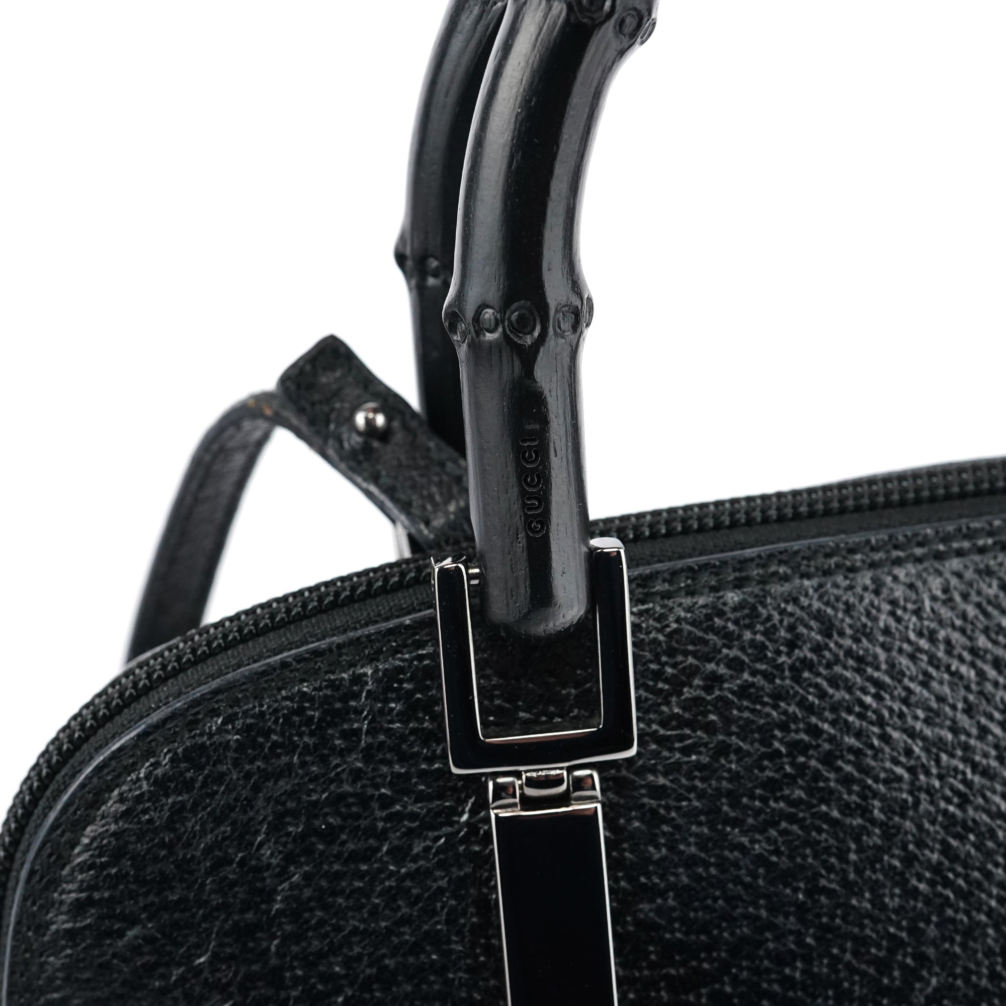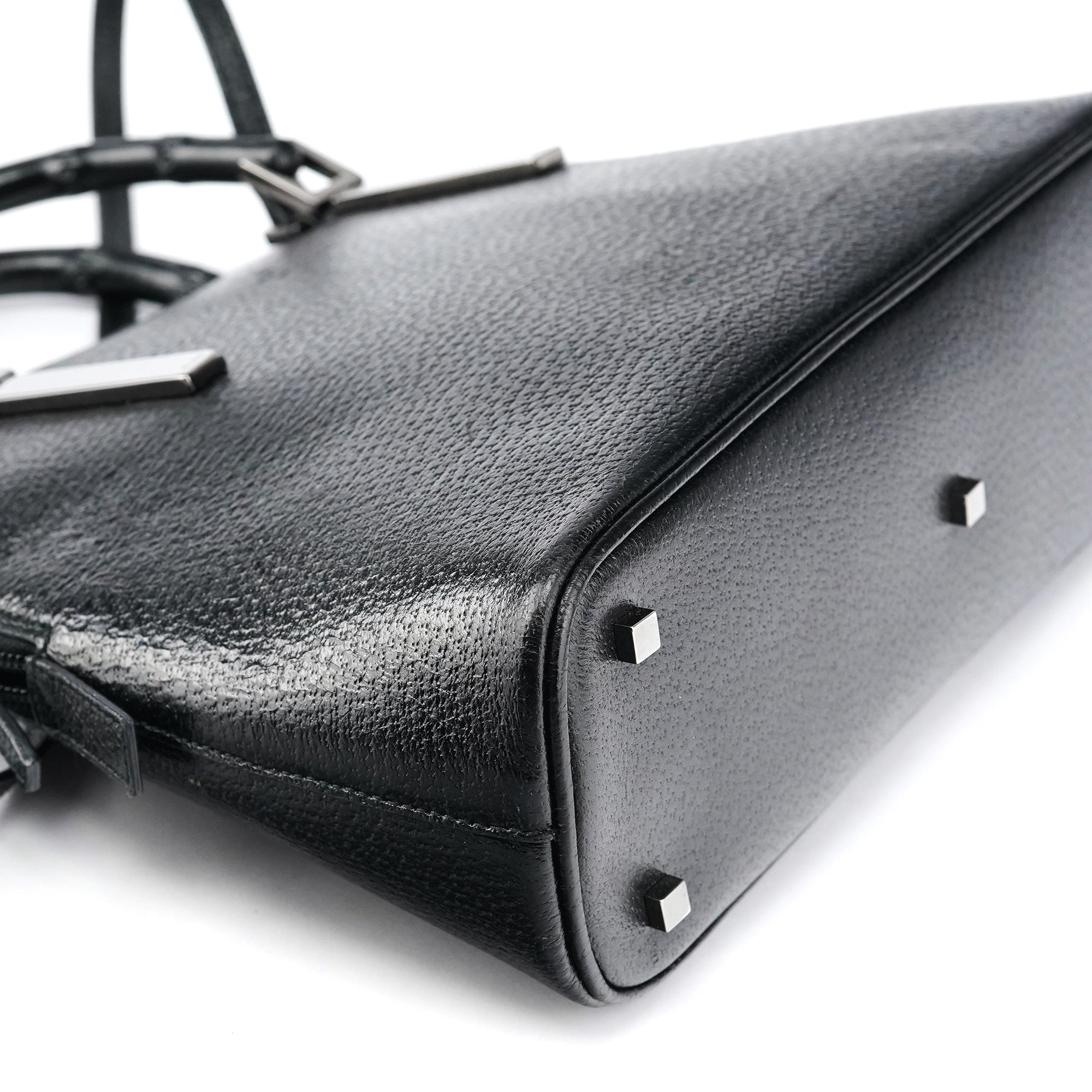 Designed in the late 1990s by Tom Ford, this Gucci Bamboo 2-way tote bag is crafted from black grain leather in a structured silhouette. It features the signature lacquered black bamboo top handle and sleek silver-tone hardware accents. The bag includes a detachable long strap and a zipper closure, opening to a spacious black fabric-lined interior.