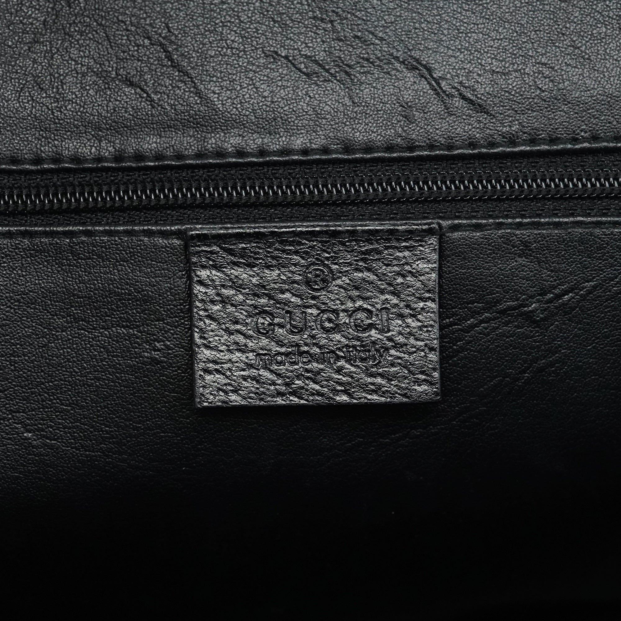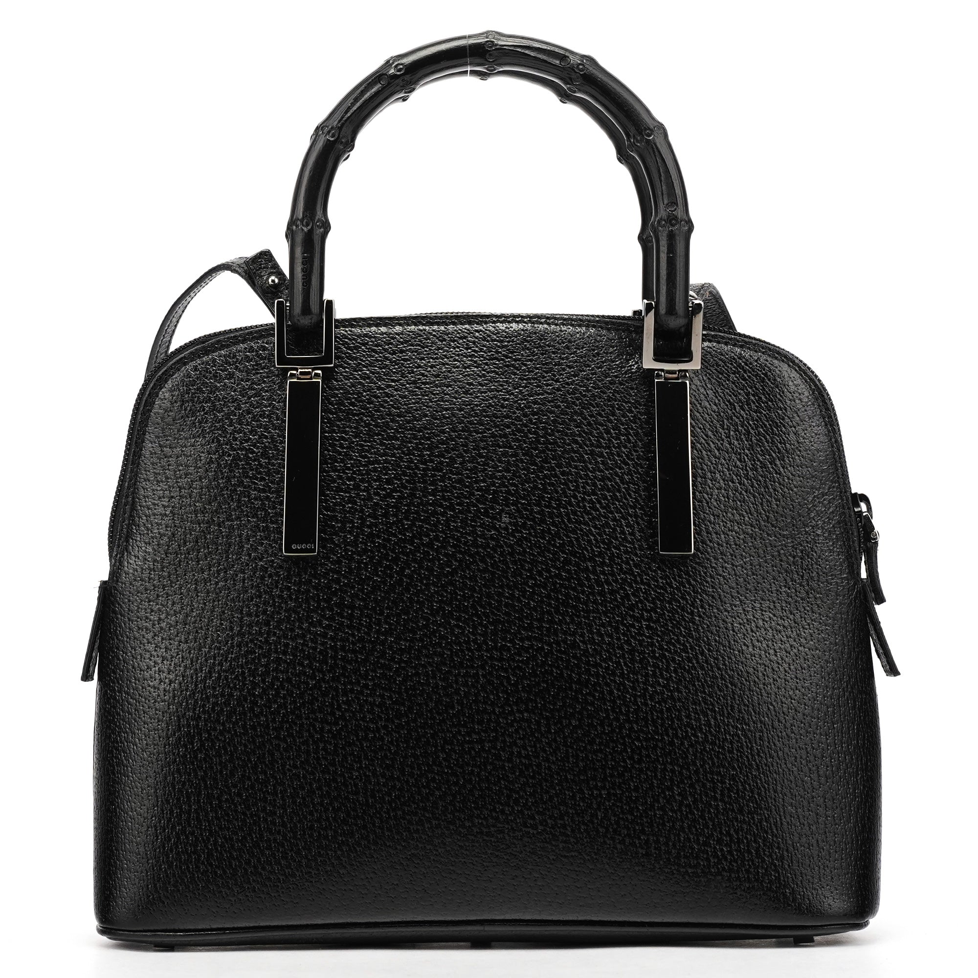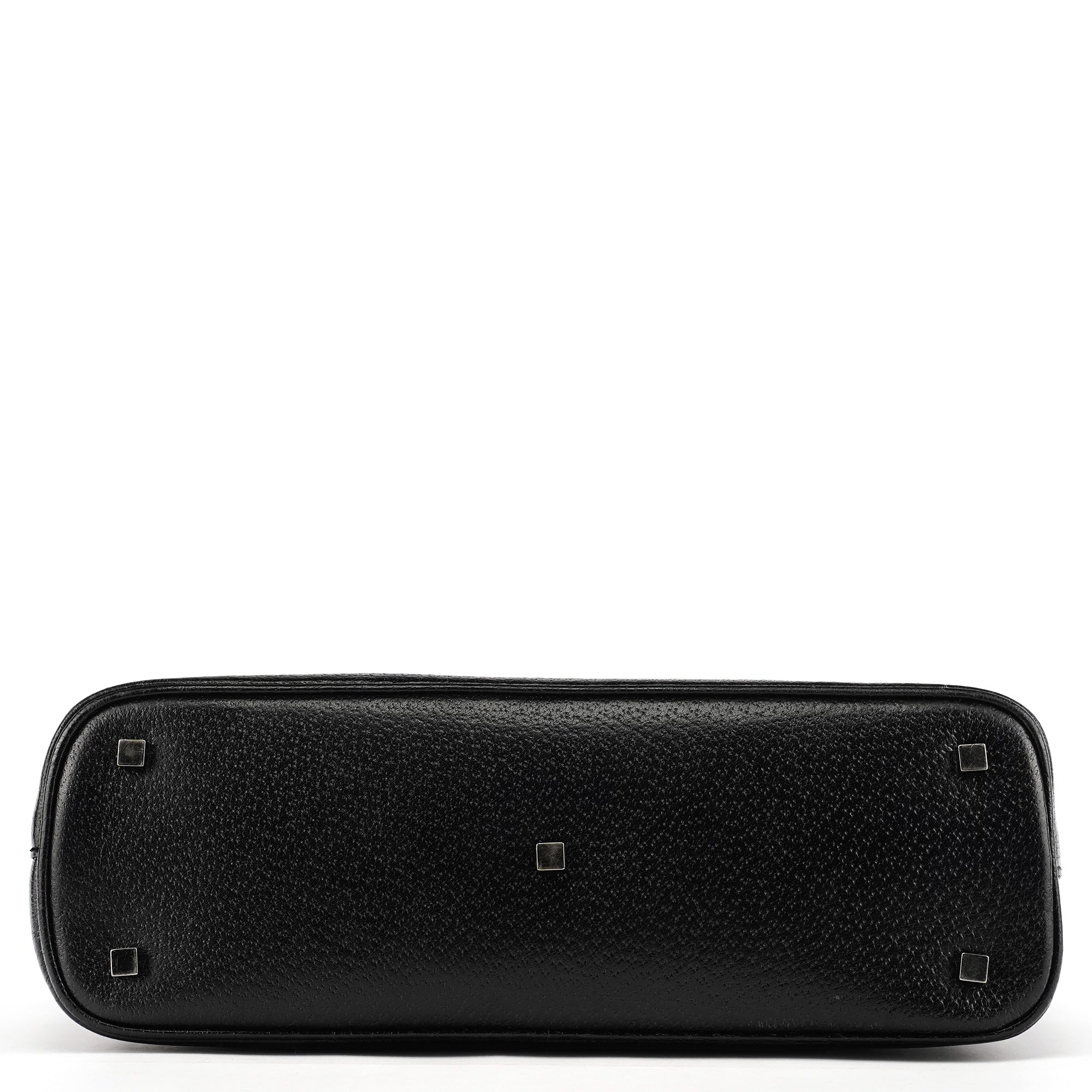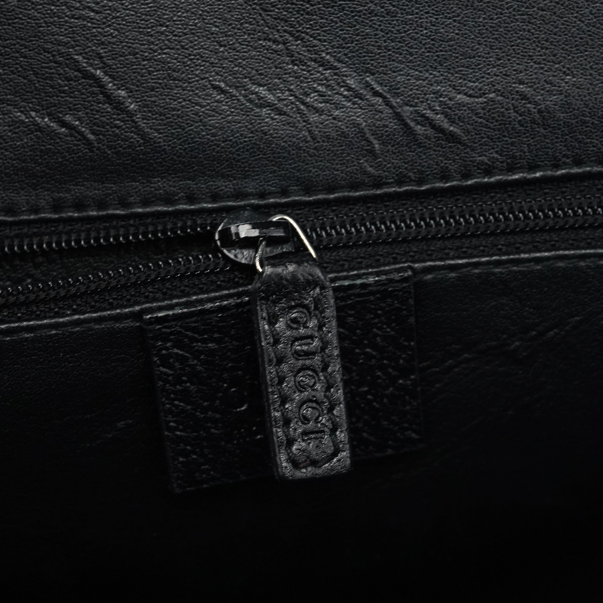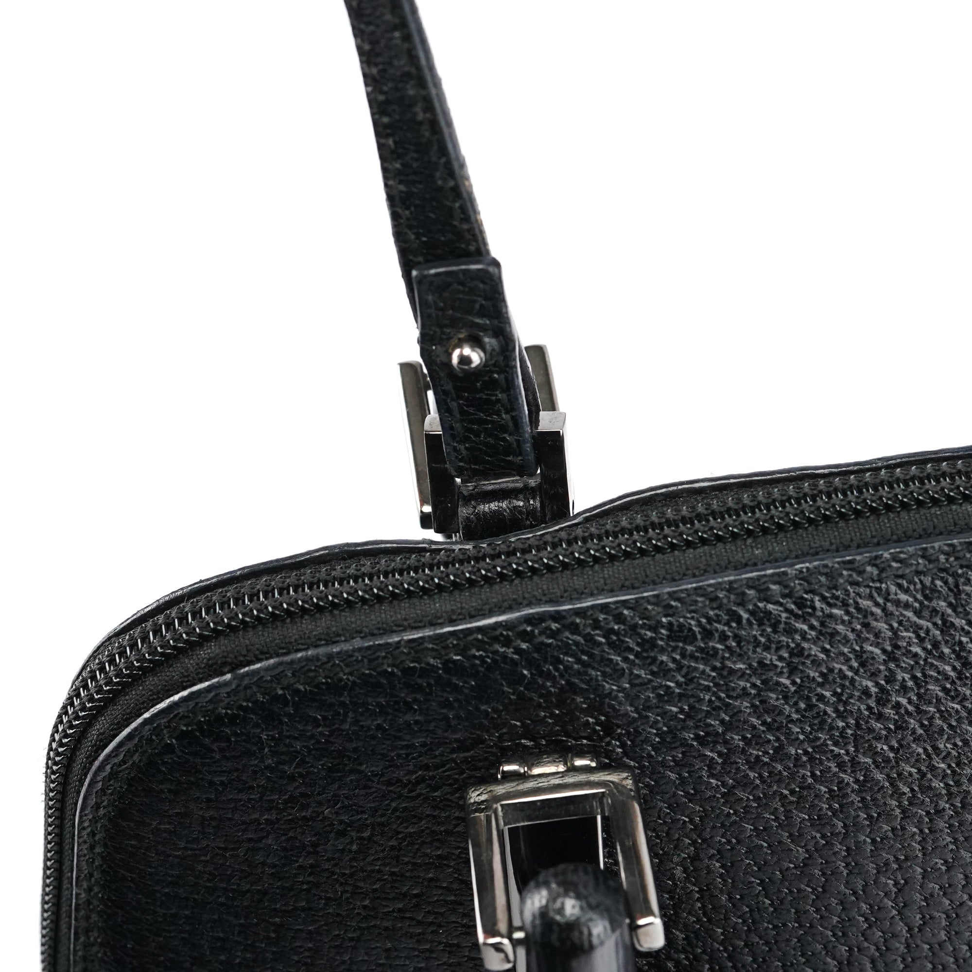 Designed in the late 1990s by Tom Ford, this Gucci Bamboo 2-way tote bag is crafted from black grain leather in a structured silhouette. It features the signature lacquered black bamboo top handle and sleek silver-tone hardware accents. The bag includes a detachable long strap and a zipper closure, opening to a spacious black fabric-lined interior.
