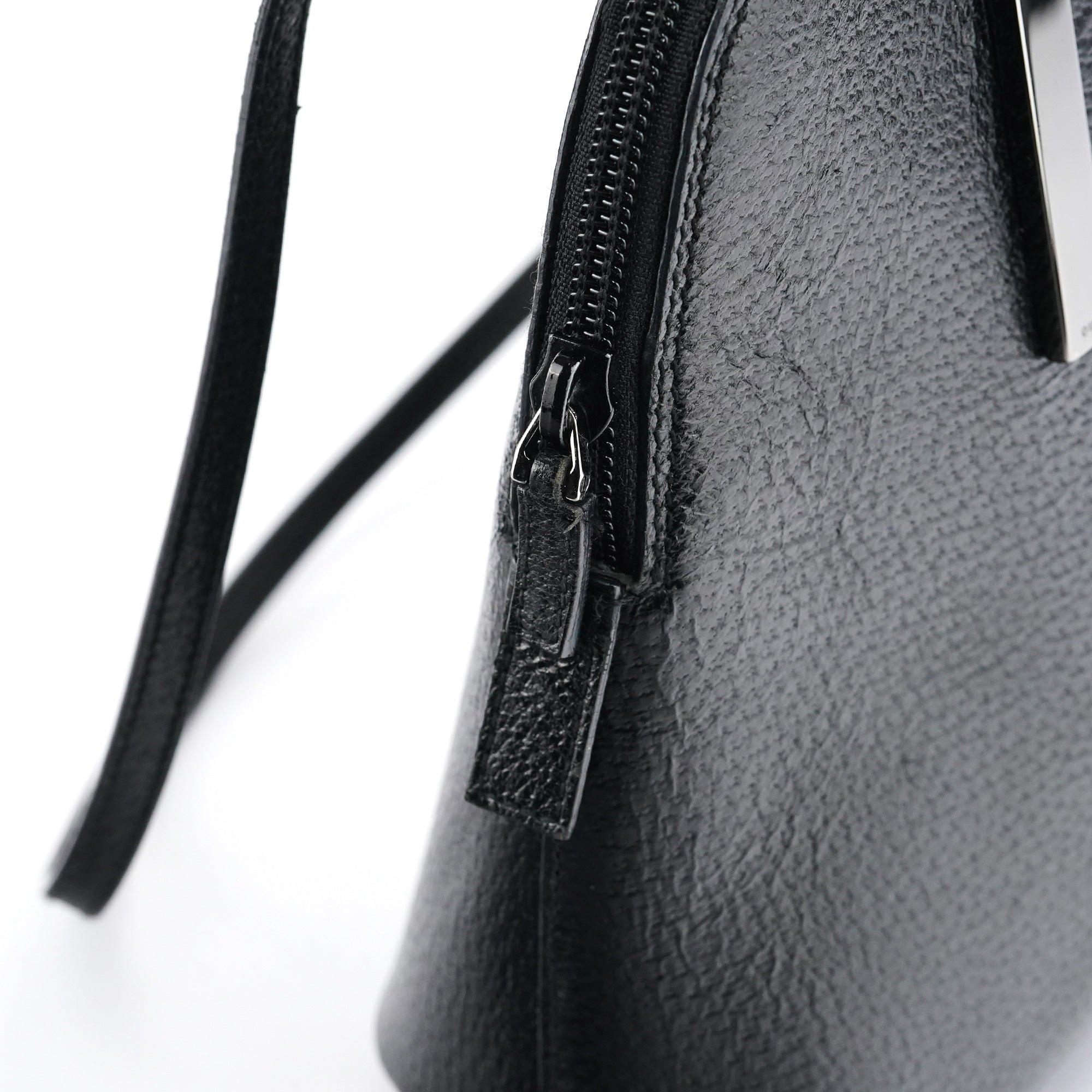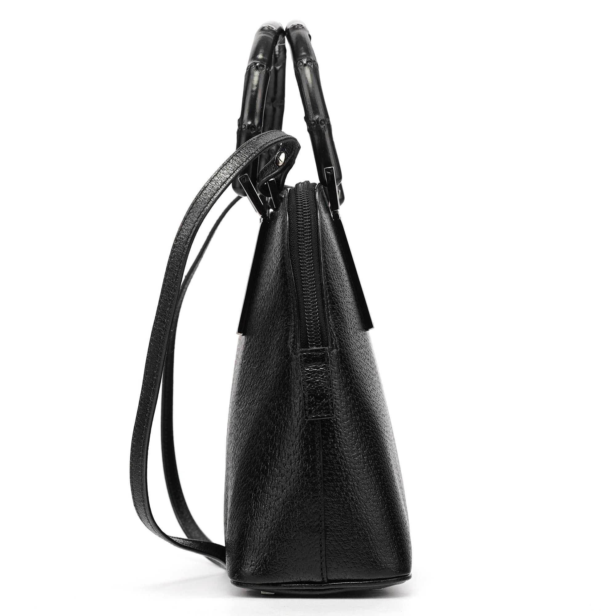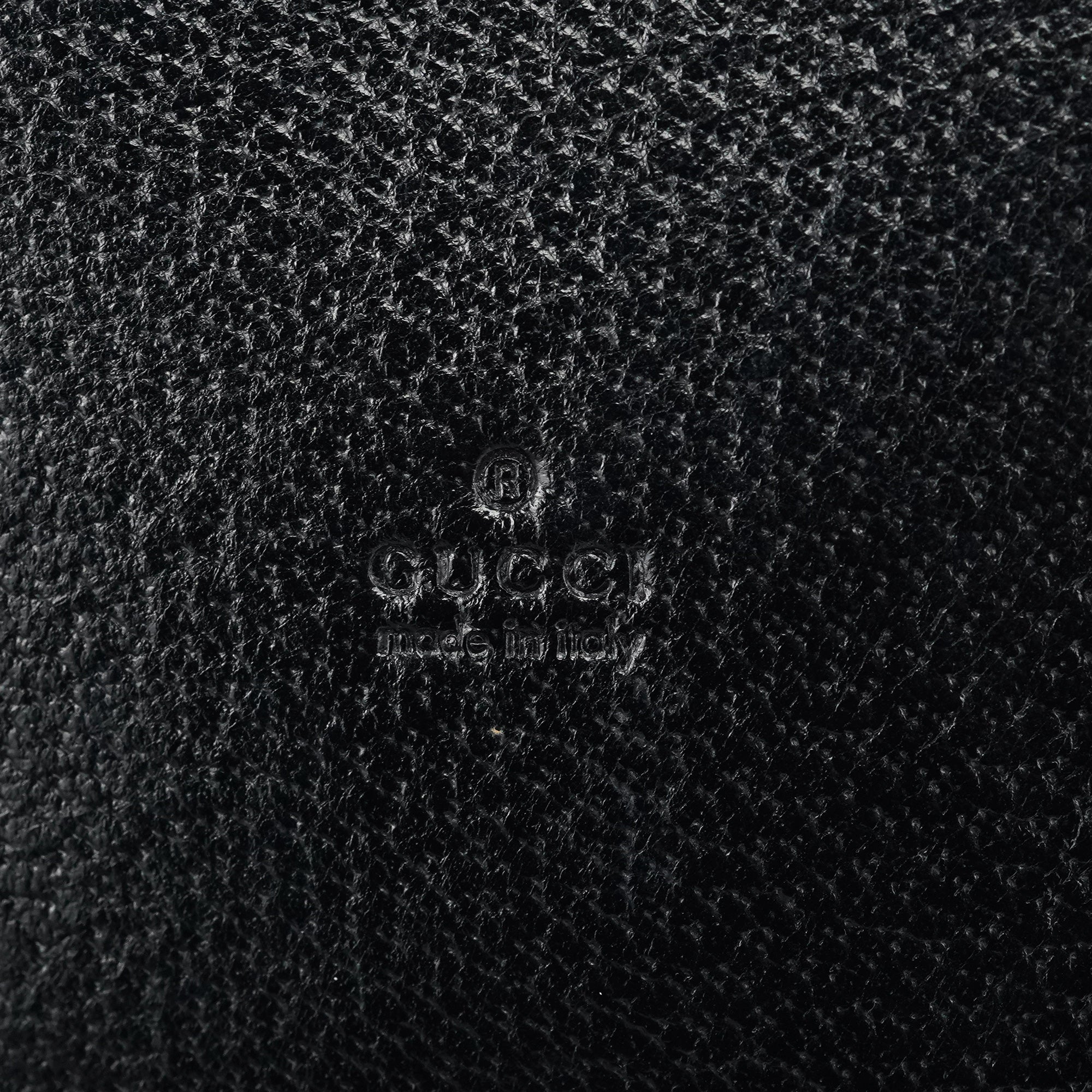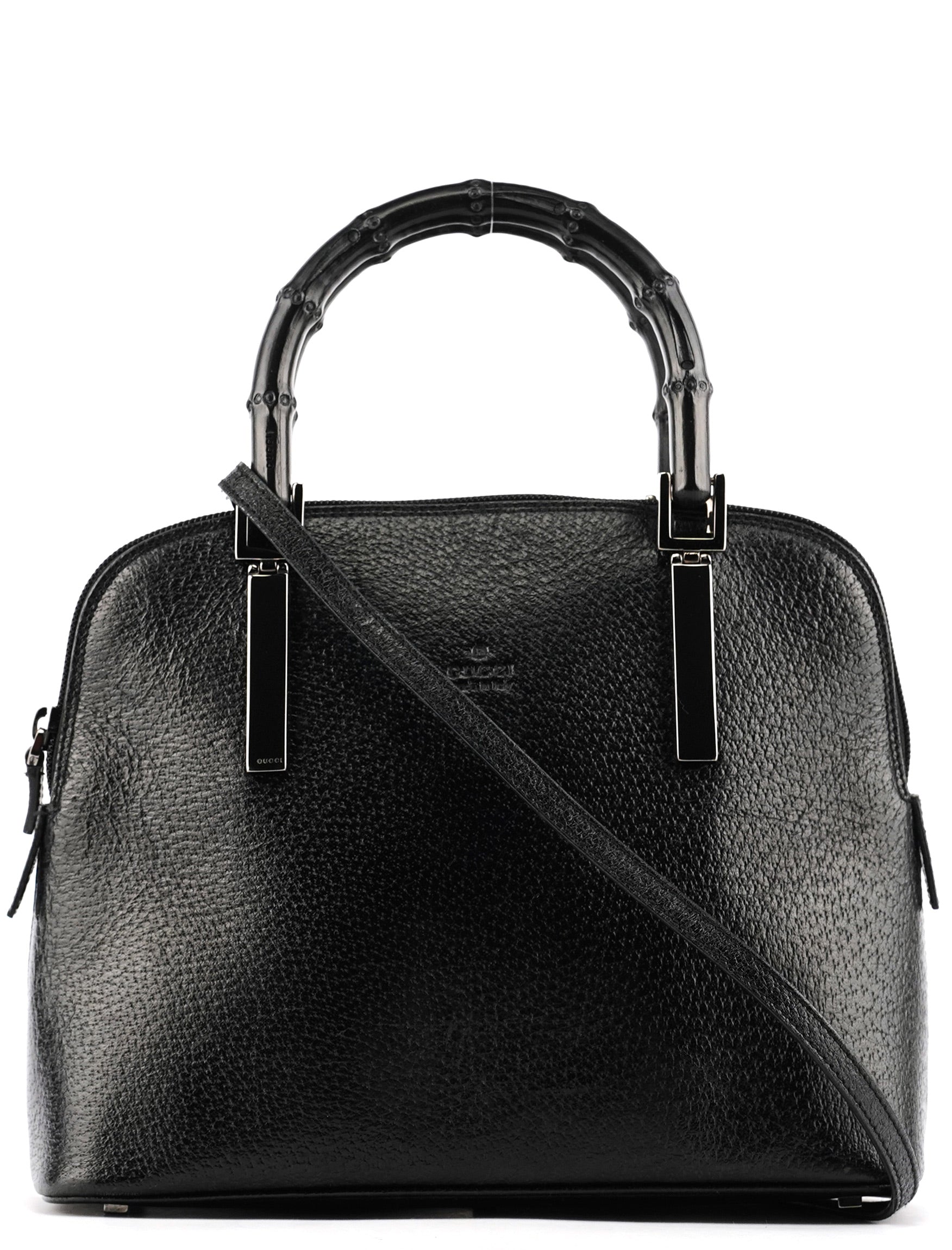 Designed in the late 1990s by Tom Ford, this Gucci Bamboo 2-way tote bag is crafted from black grain leather in a structured silhouette. It features the signature lacquered black bamboo top handle and sleek silver-tone hardware accents. The bag includes a detachable long strap and a zipper closure, opening to a spacious black fabric-lined interior.