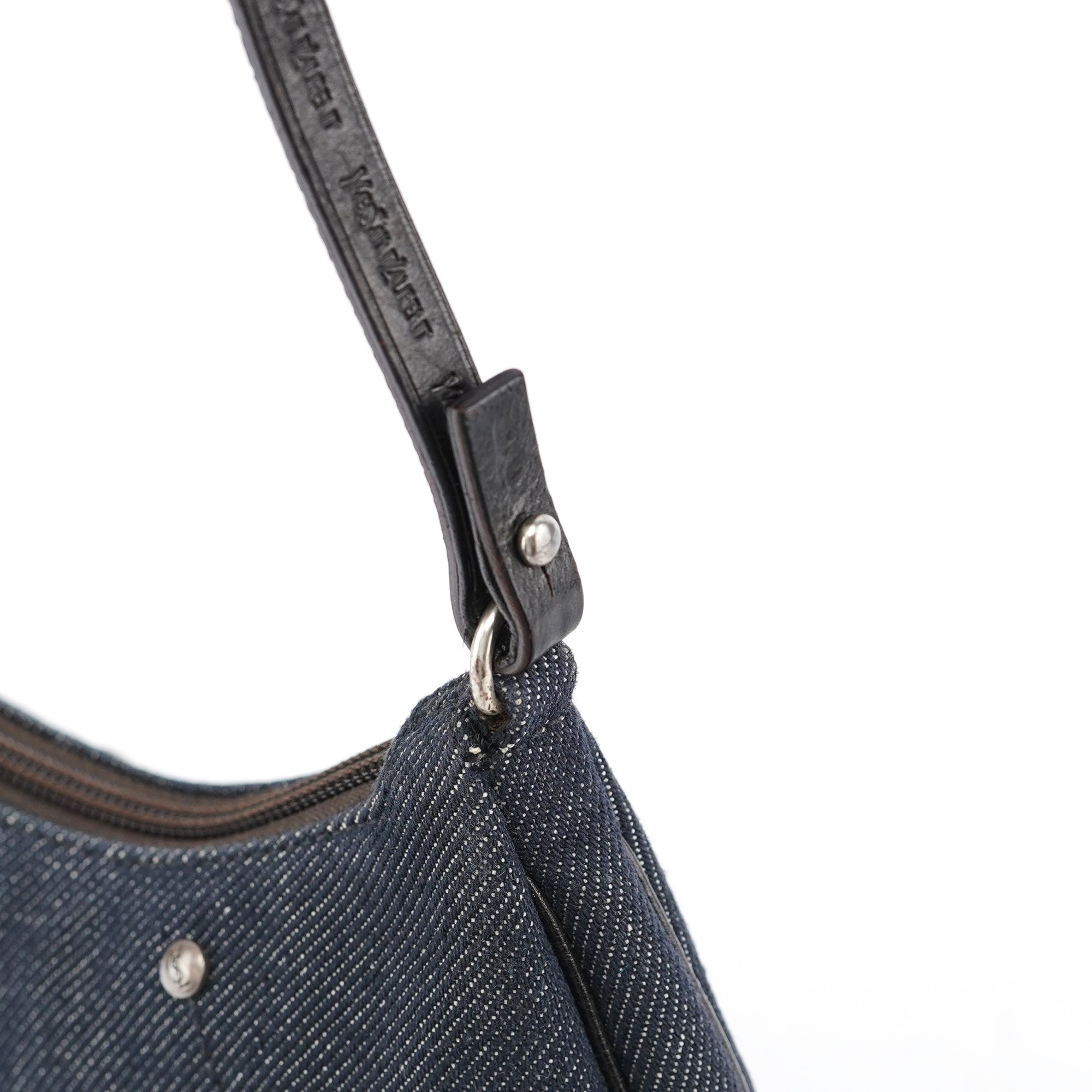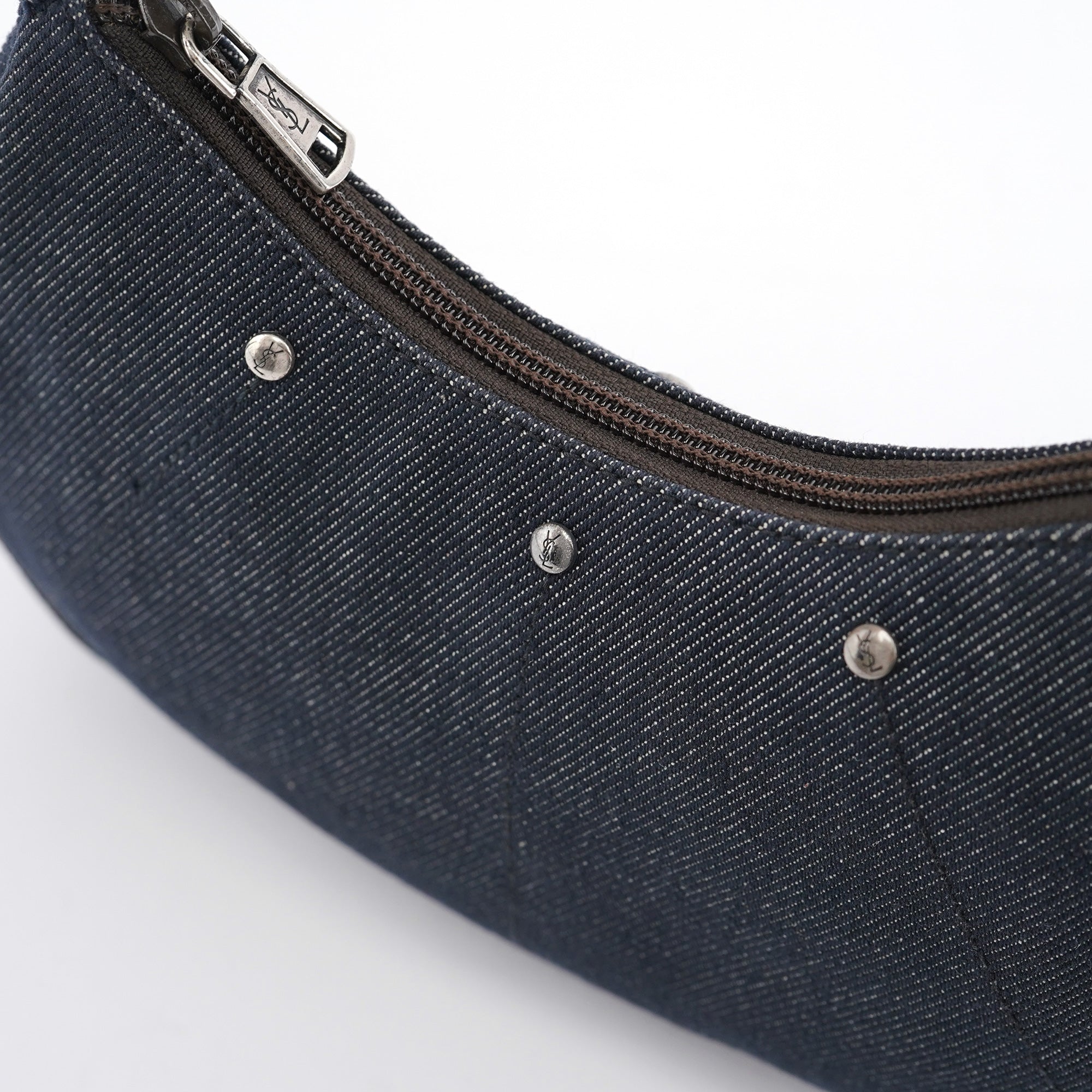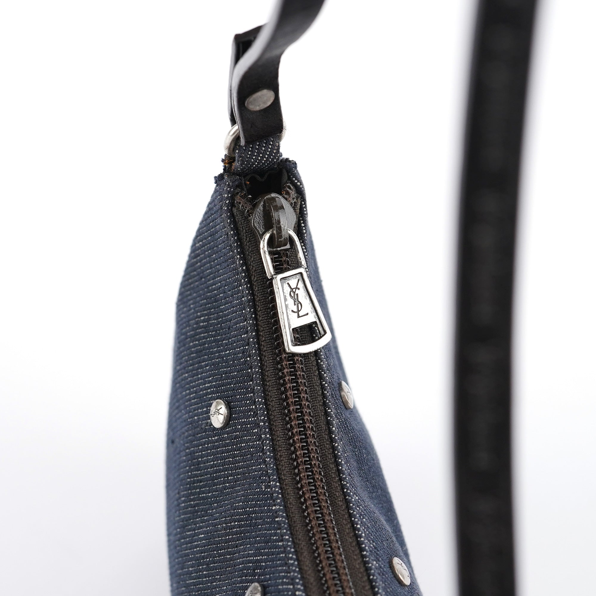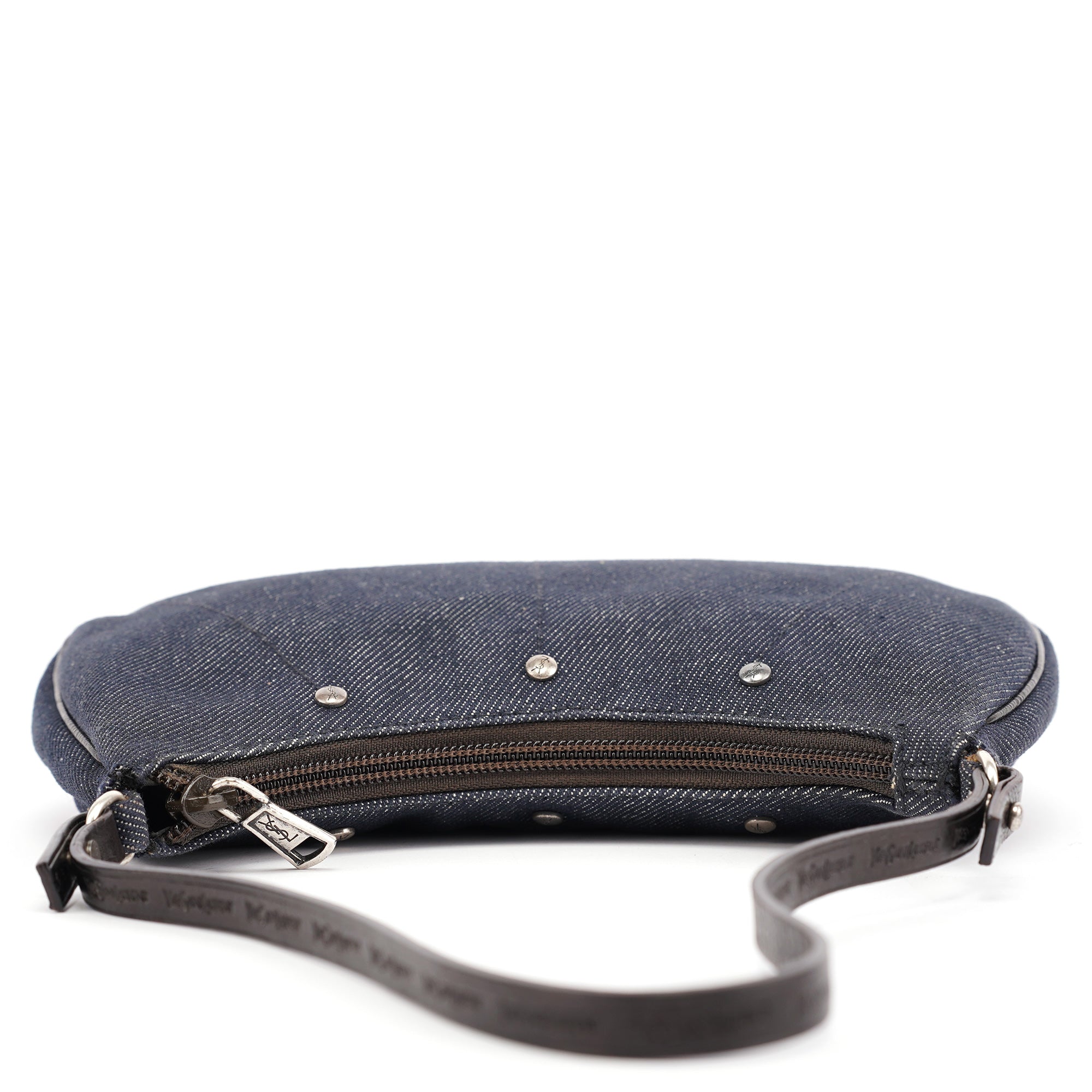 Designed in the early 2000s by Tom Ford, this YSL Rive Gauche navy mini hobo bag is crafted in structured denim with smooth leather trim and silver-tone hardware. The crescent-shaped silhouette is finished with a studded detail at the front and a shoulder strap with Yves Saint Laurent logo embossing. Its top-zip closure opens to a satin-lined interior.