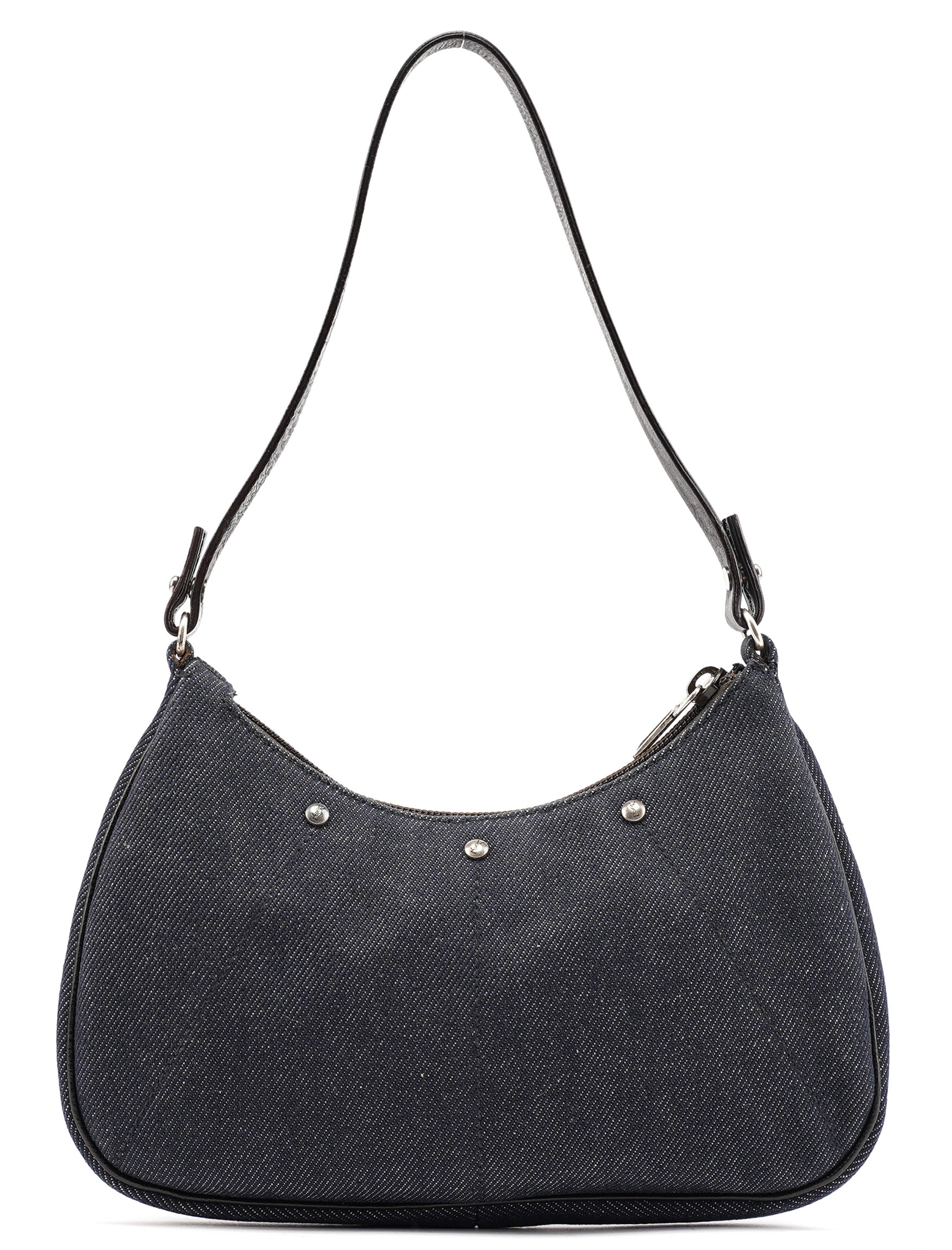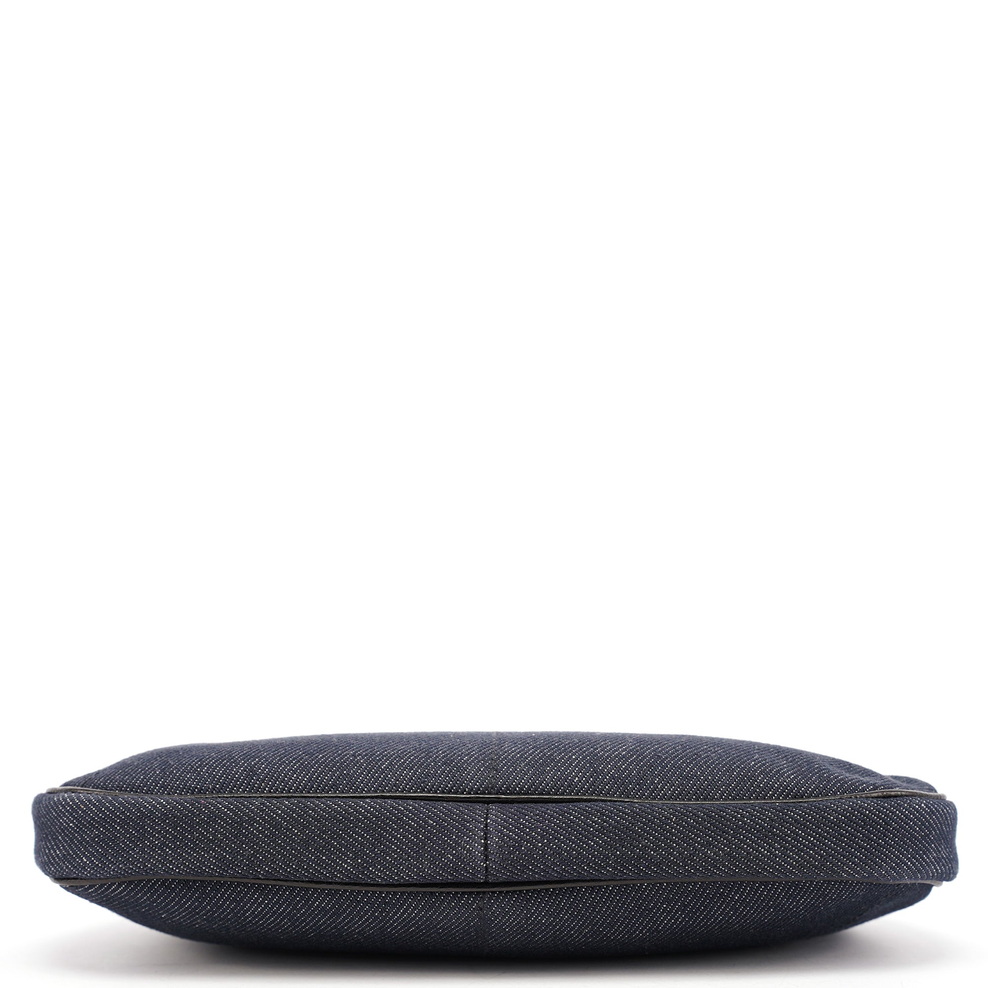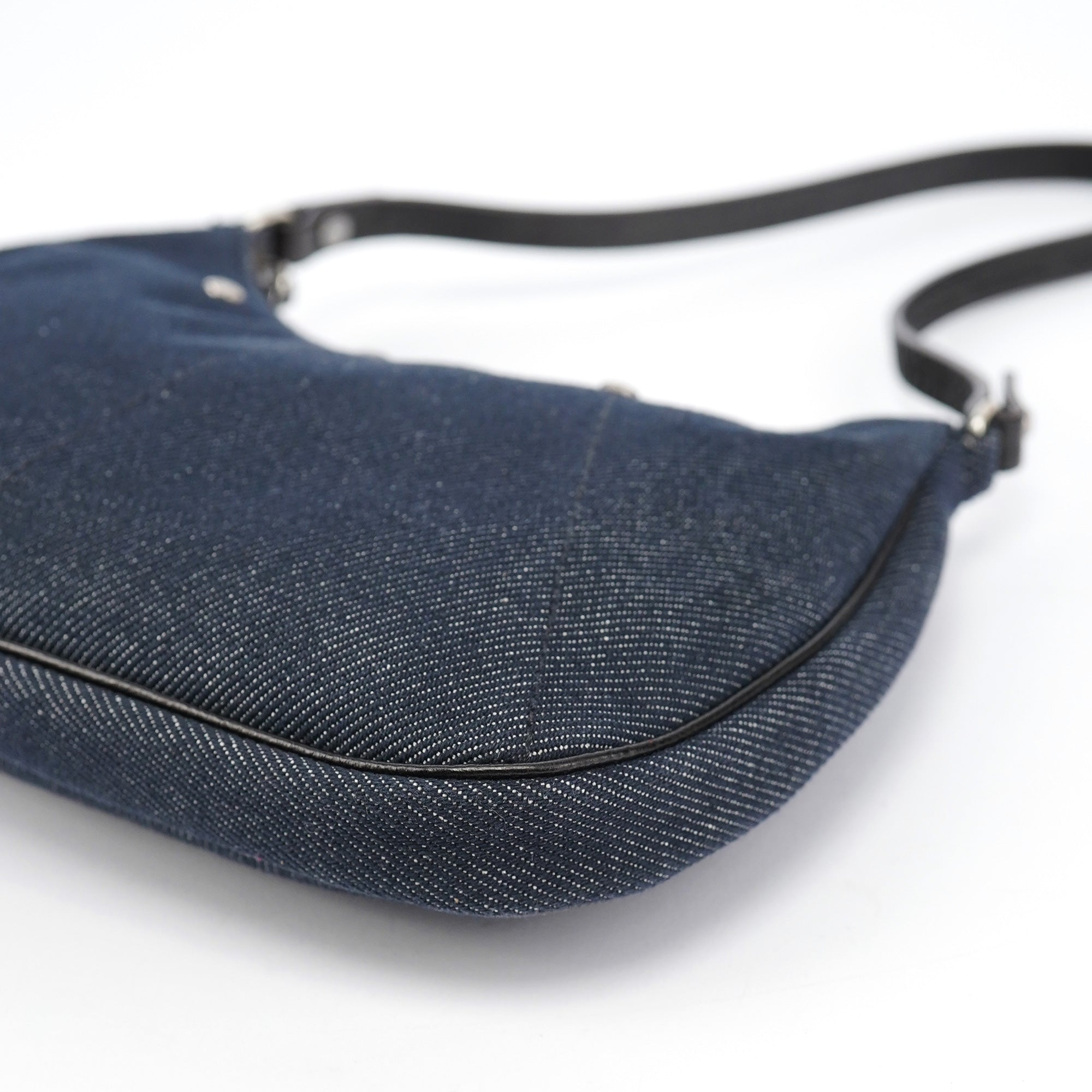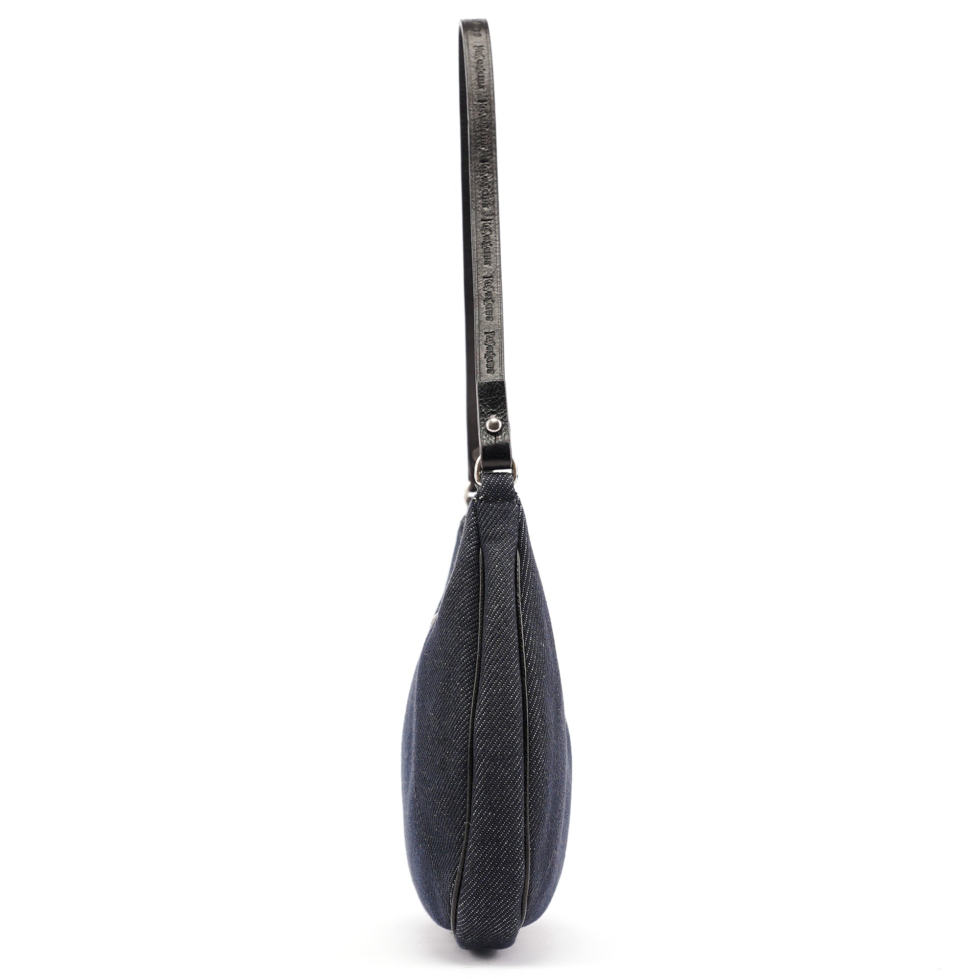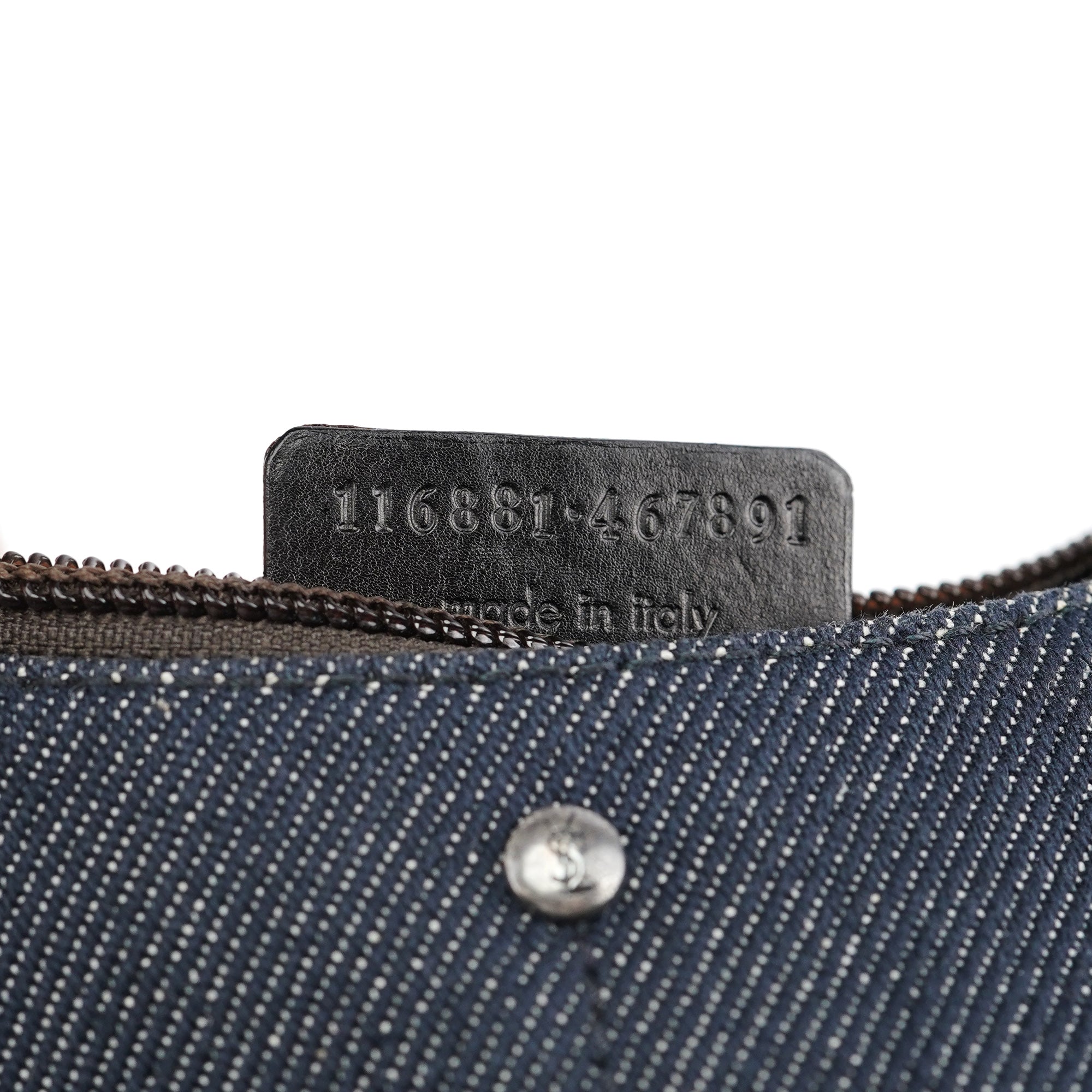 Designed in the early 2000s by Tom Ford, this YSL Rive Gauche navy mini hobo bag is crafted in structured denim with smooth leather trim and silver-tone hardware. The crescent-shaped silhouette is finished with a studded detail at the front and a shoulder strap with Yves Saint Laurent logo embossing. Its top-zip closure opens to a satin-lined interior.