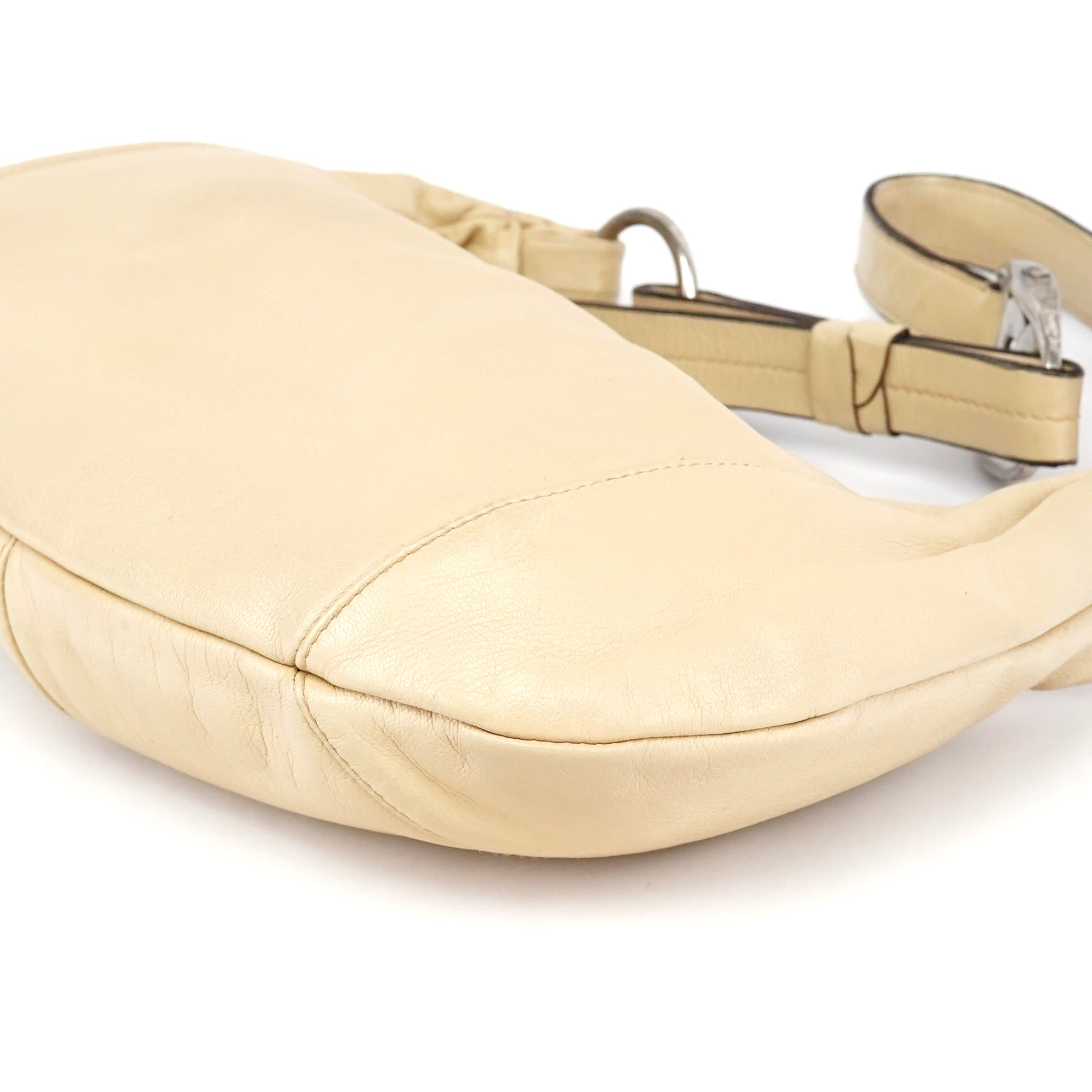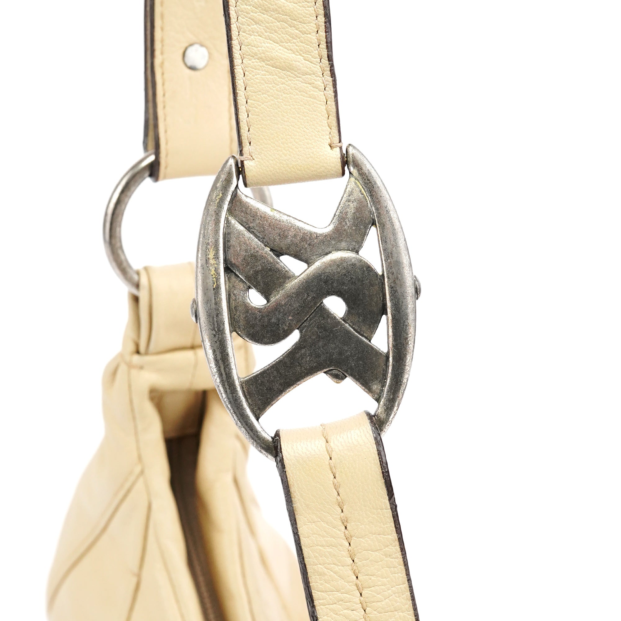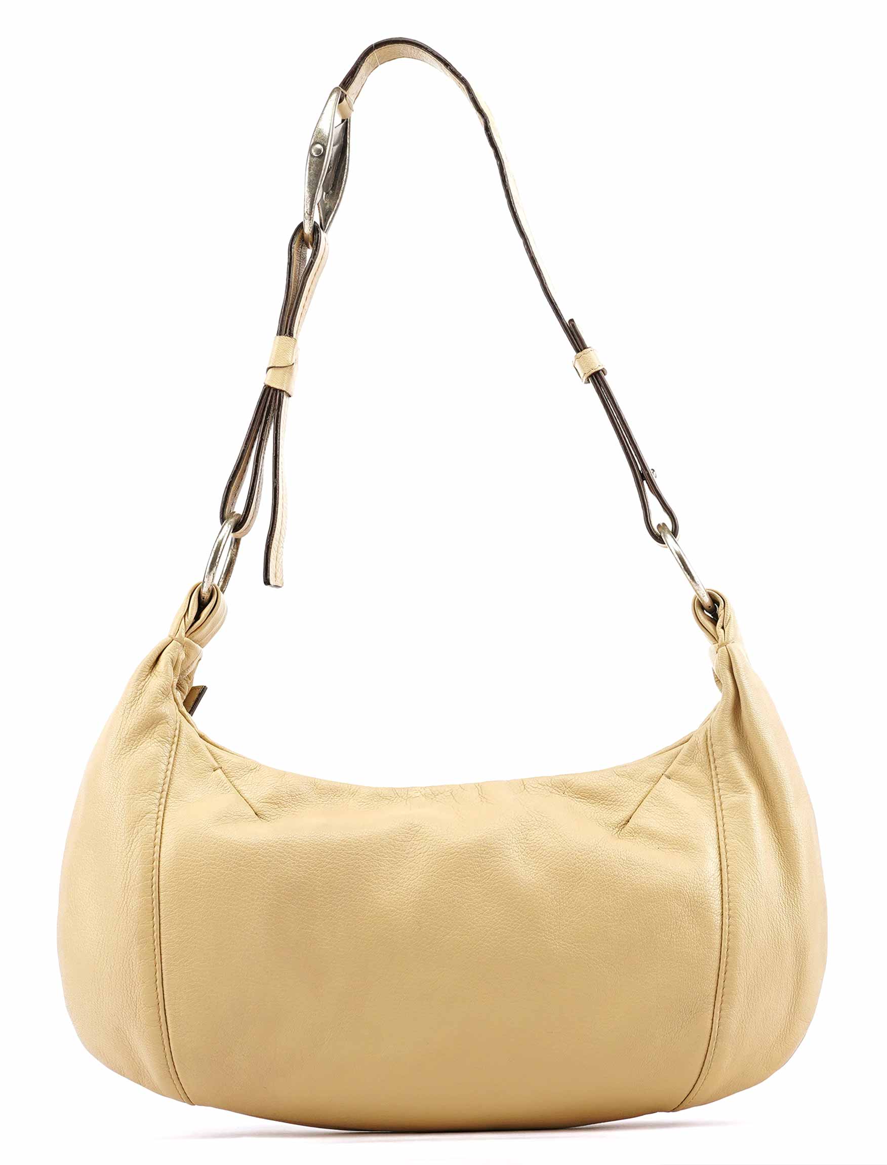 Designed in the early 2000s by Tom Ford, this Yves Saint Laurent Mombasa bag features beige deerskin leather with a signature crescent silhouette and a silver-tone interlocking YSL logo buckle. It is finished with an adjustable flat leather strap, a zip-top opening, and a brown suede-lined interior with a secure zippered pocket.