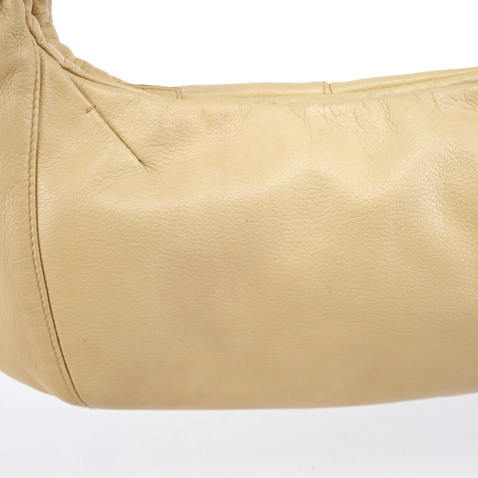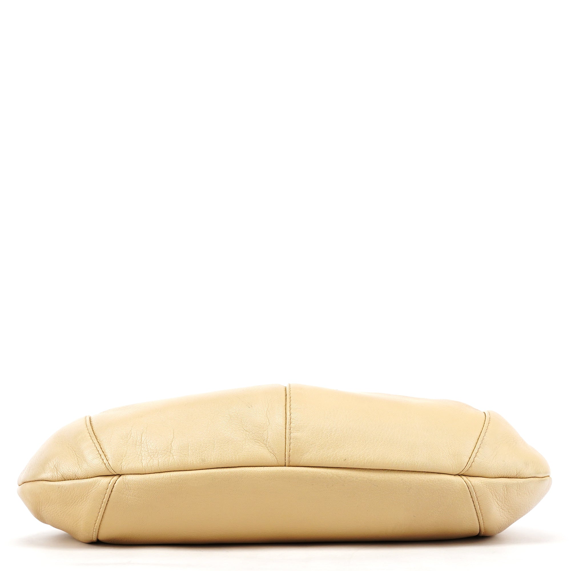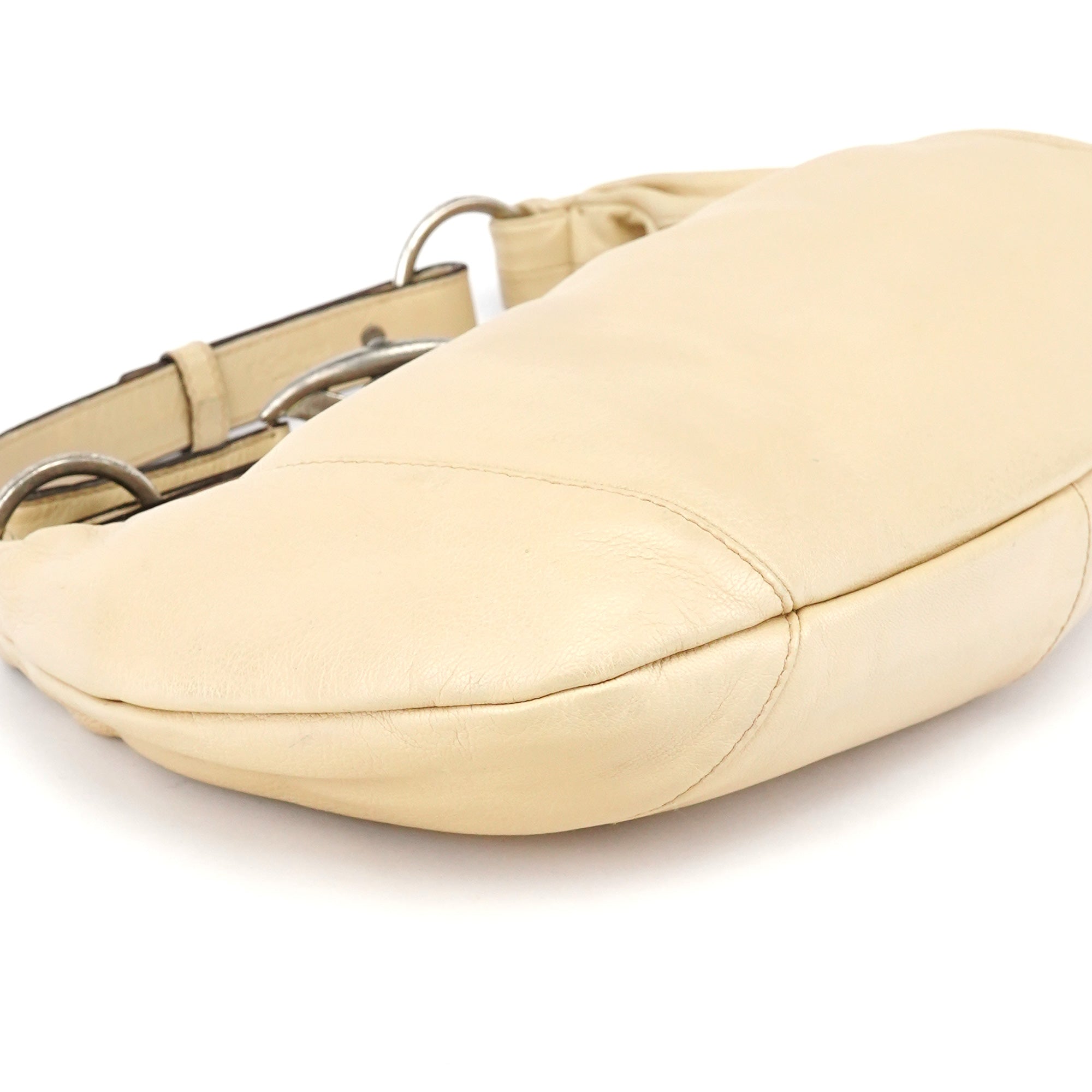 Designed in the early 2000s by Tom Ford, this Yves Saint Laurent Mombasa bag features beige deerskin leather with a signature crescent silhouette and a silver-tone interlocking YSL logo buckle. It is finished with an adjustable flat leather strap, a zip-top opening, and a brown suede-lined interior with a secure zippered pocket.