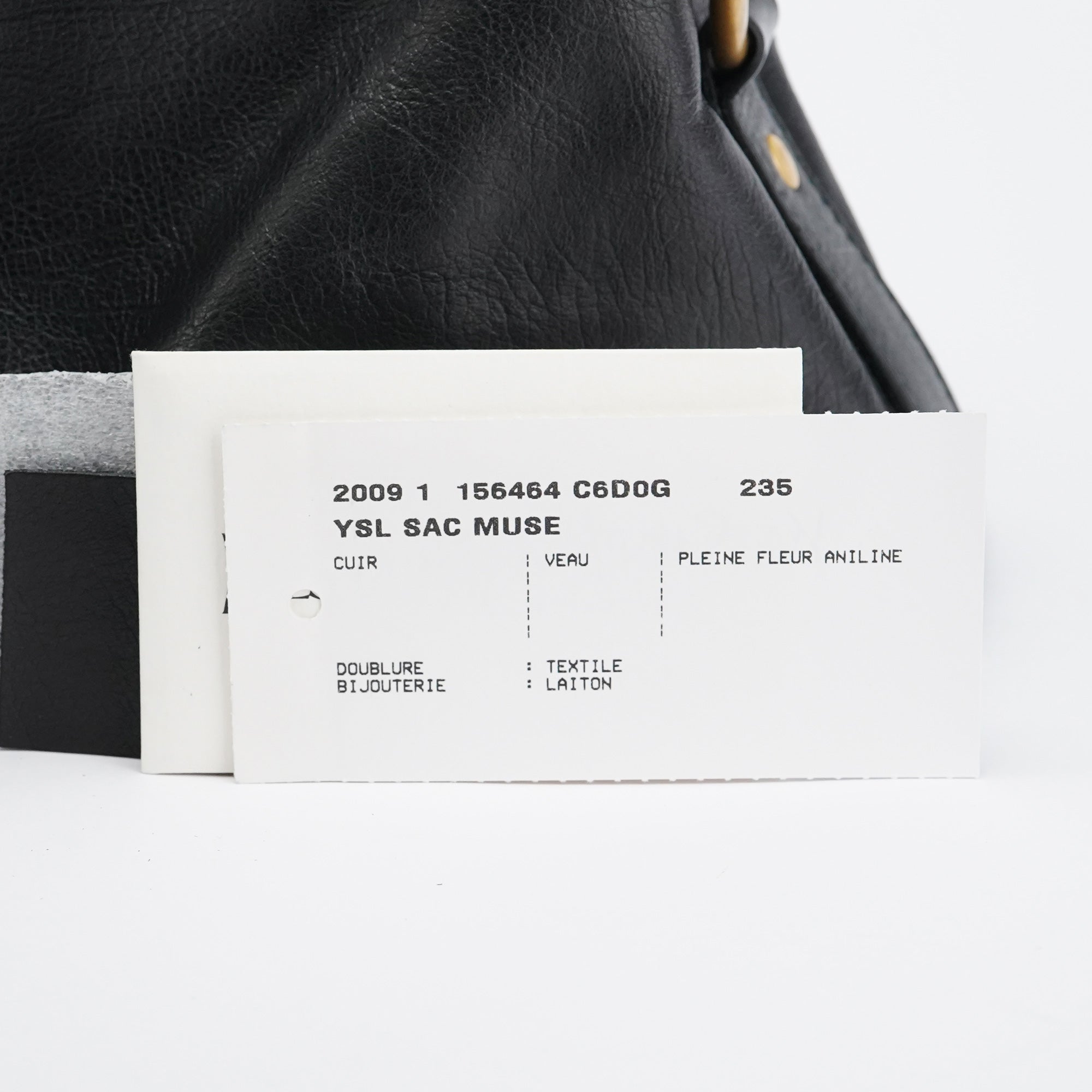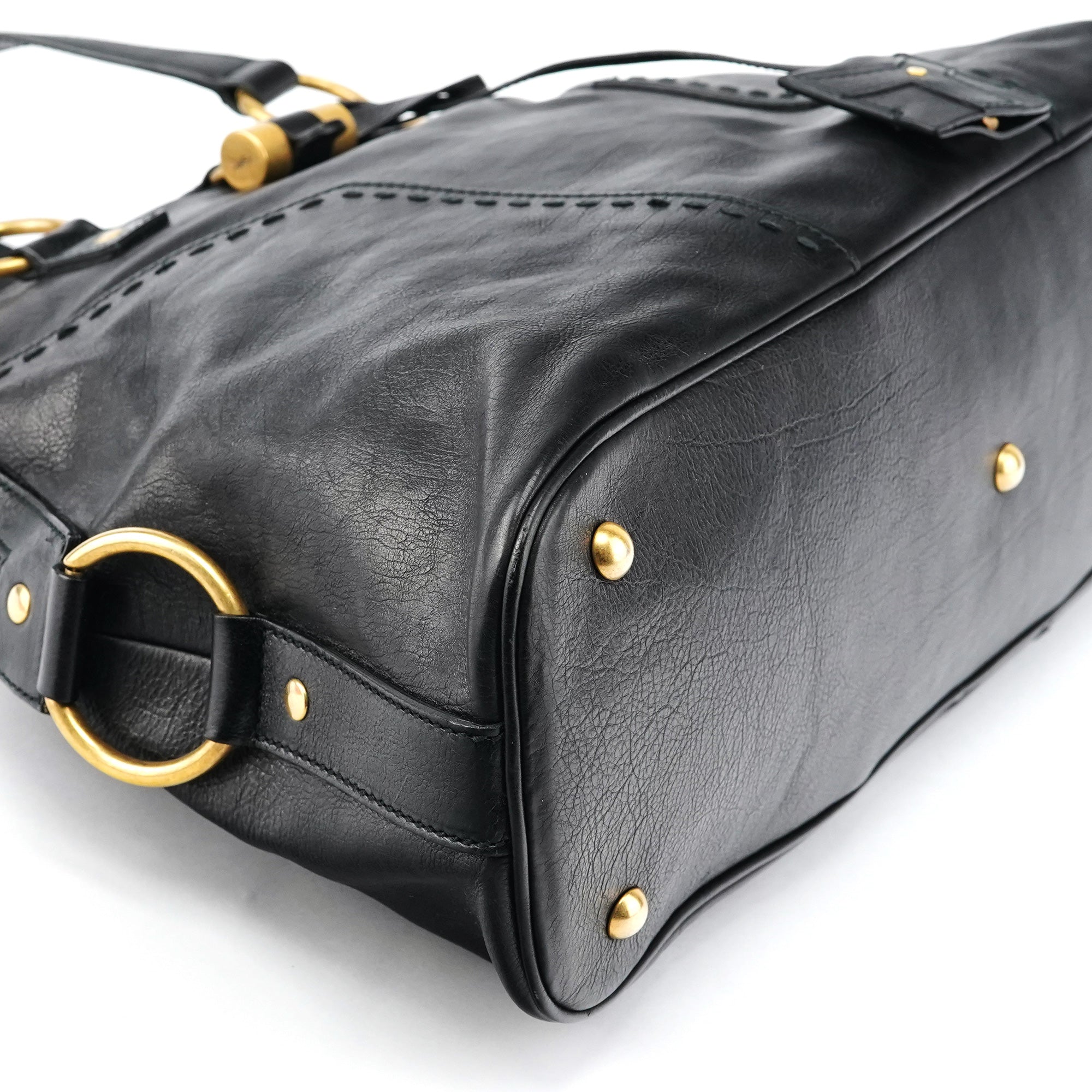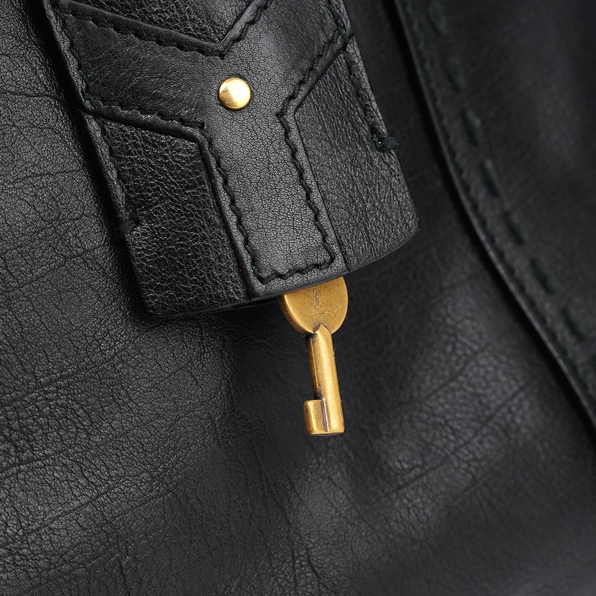Designed in the late 2000s, this Yves Saint Laurent Muse tote is crafted from soft black leather in a wide, dome-shaped silhouette. It features gold-tone hardware, dual top handles, and a distinctive front Y-stitch leather panel. The bag includes a prominent center padlock clasp, a hanging clochette with key, and a black fabric-lined interior.