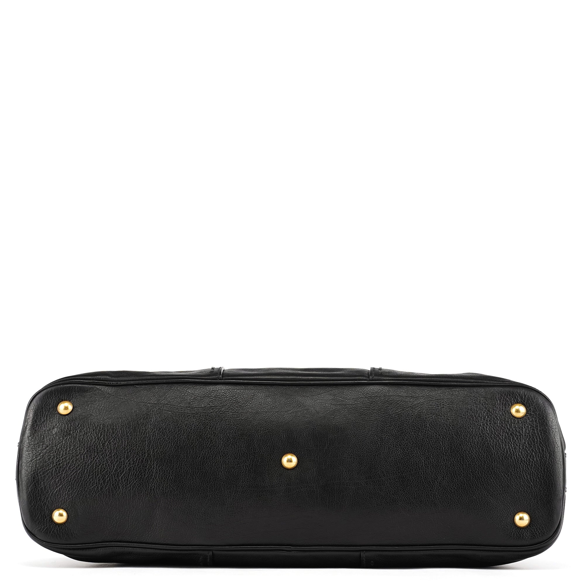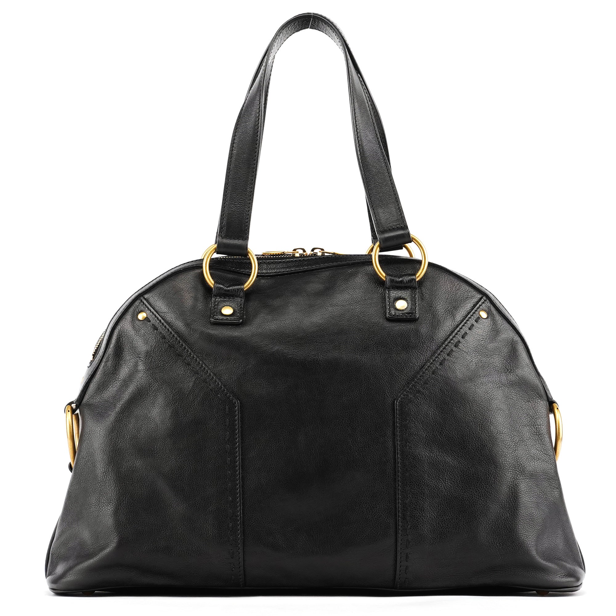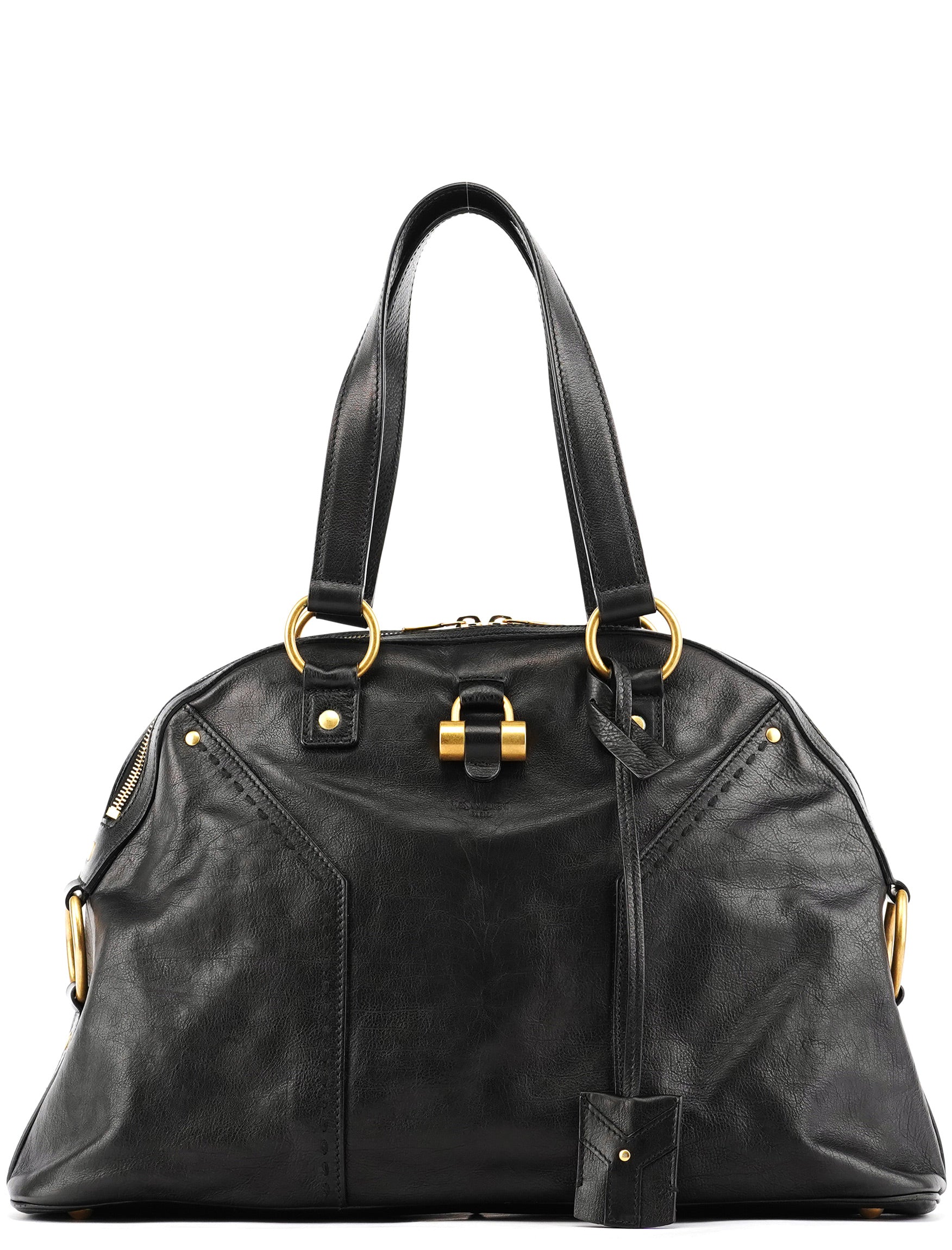Designed in the late 2000s, this Yves Saint Laurent Muse tote is crafted from soft black leather in a wide, dome-shaped silhouette. It features gold-tone hardware, dual top handles, and a distinctive front Y-stitch leather panel. The bag includes a prominent center padlock clasp, a hanging clochette with key, and a black fabric-lined interior.