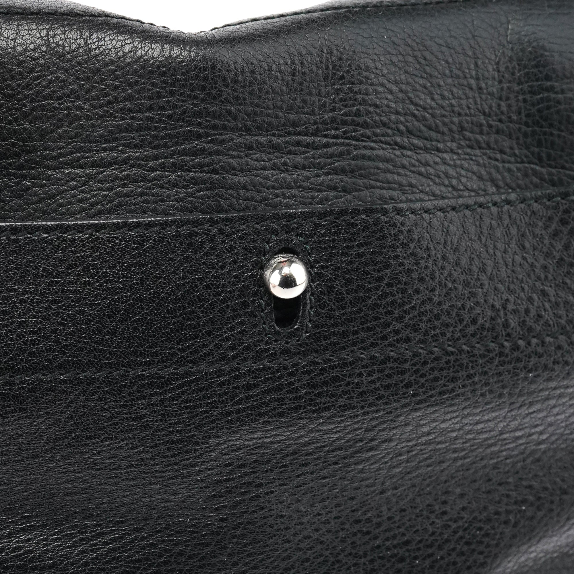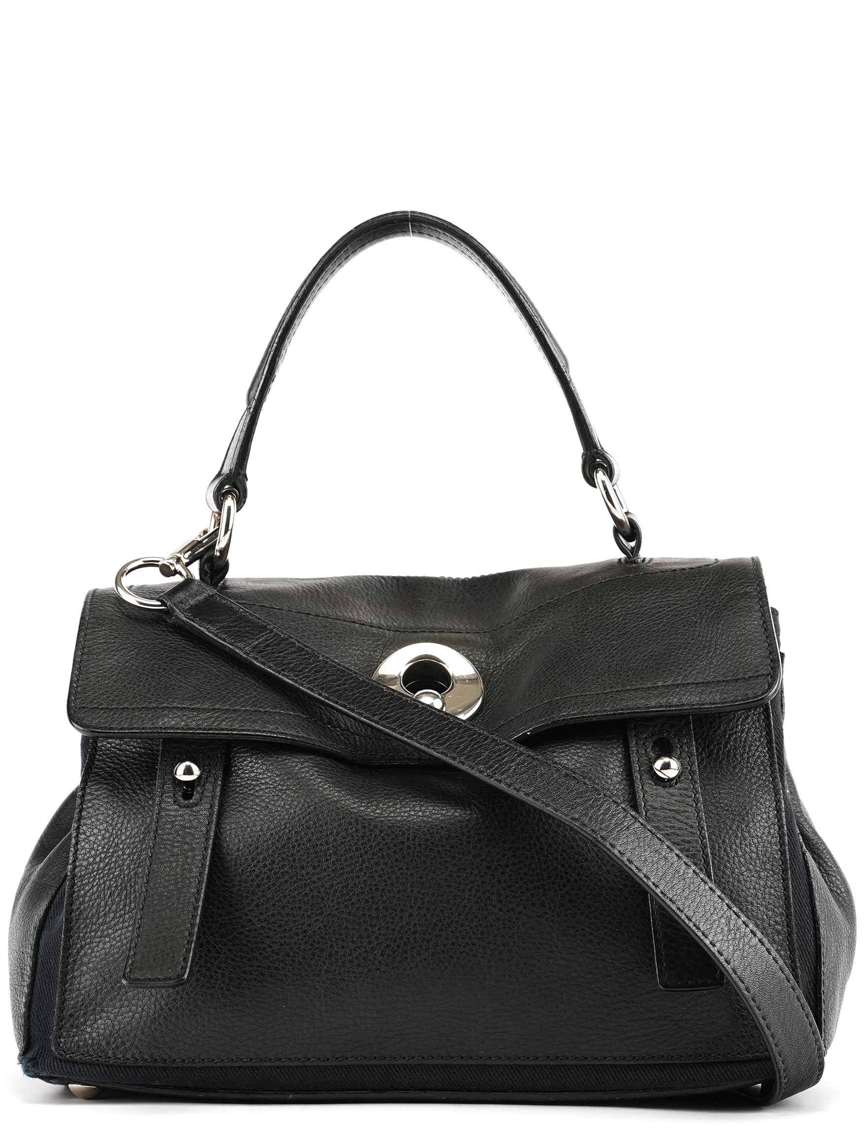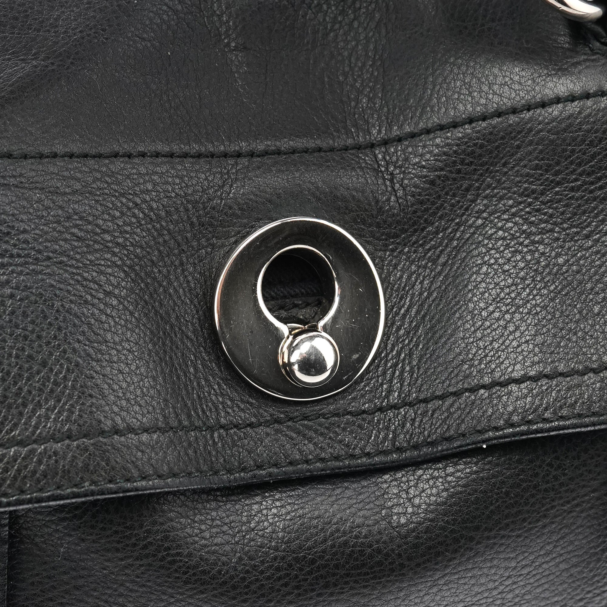 Designed in the late 2000s, this vintage Yves Saint Laurent Muse Two features black pebbled leather with the model's signature oversized fold-over flap and prominent turnlock closure. The single top handle and detachable shoulder strap offer versatile carrying options.