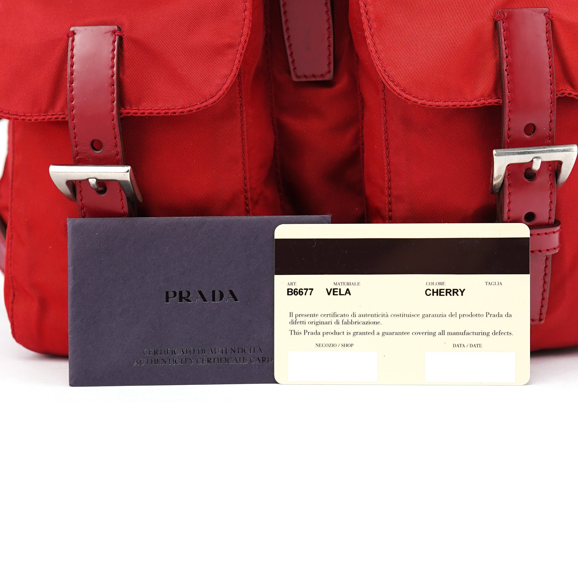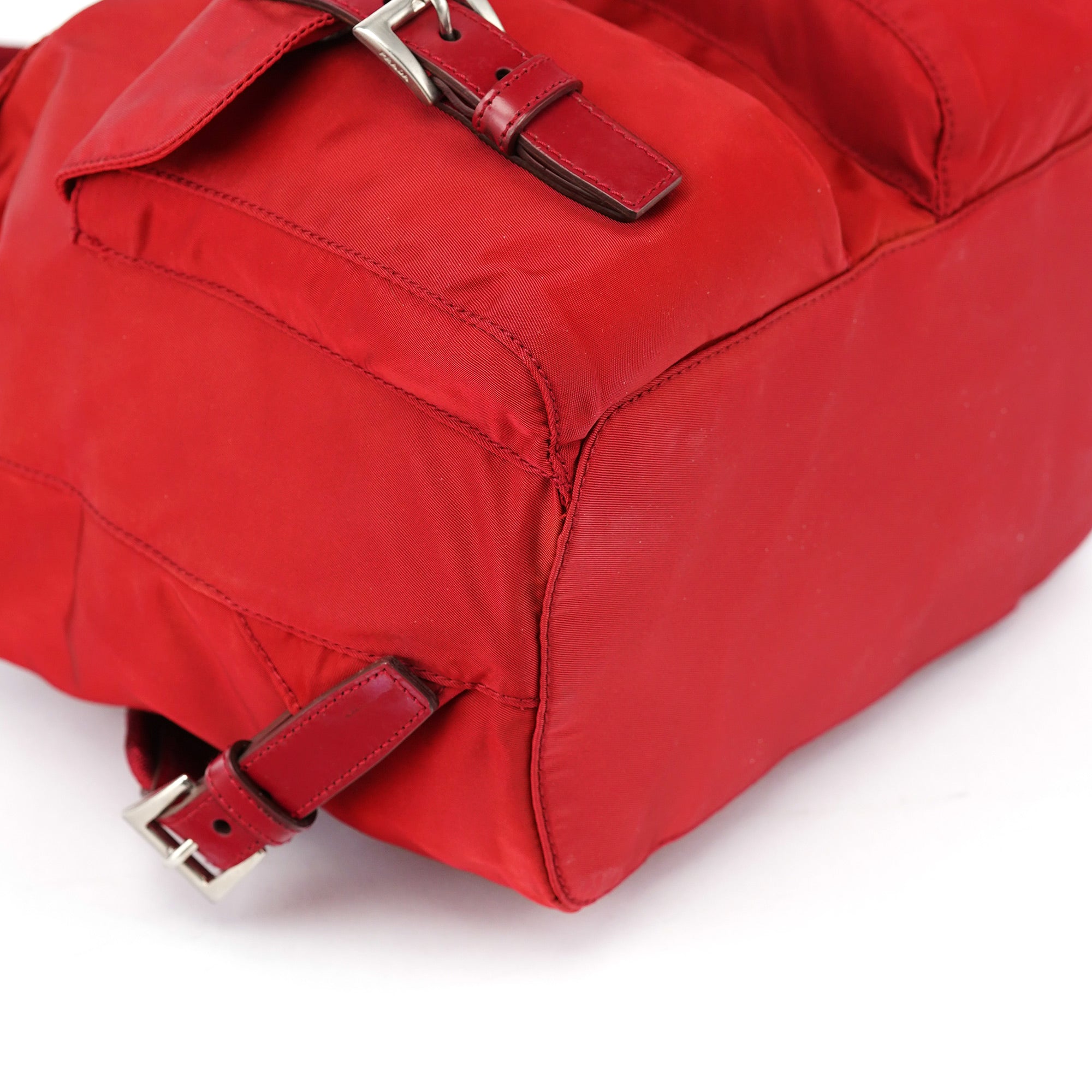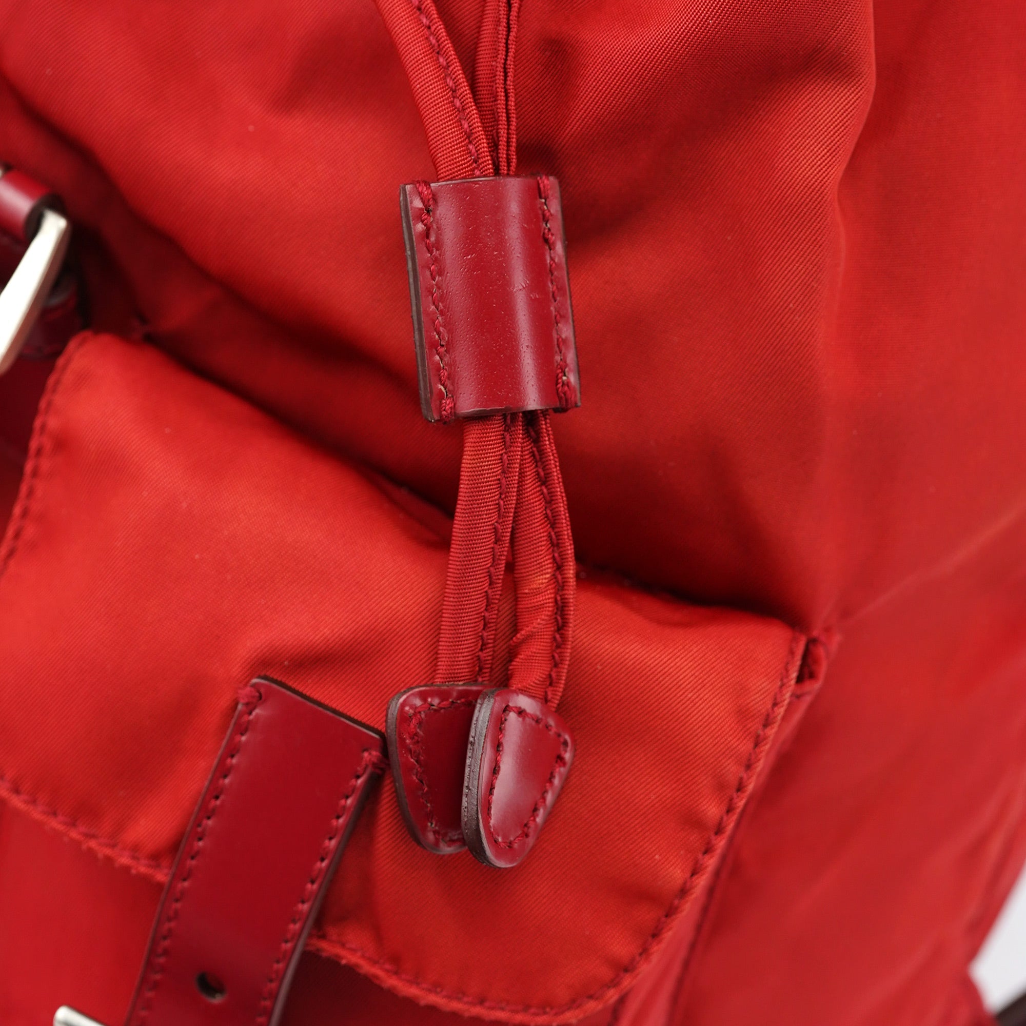 Designed in the 2000s, this Prada Tessuto Vela backpack is crafted in red nylon with tonal leather trim and silver-tone hardware. Features include two front pockets, a buckle-secured flap, and adjustable shoulder straps. Finished with a satin-lined interior and iconic Prada triangle logo.