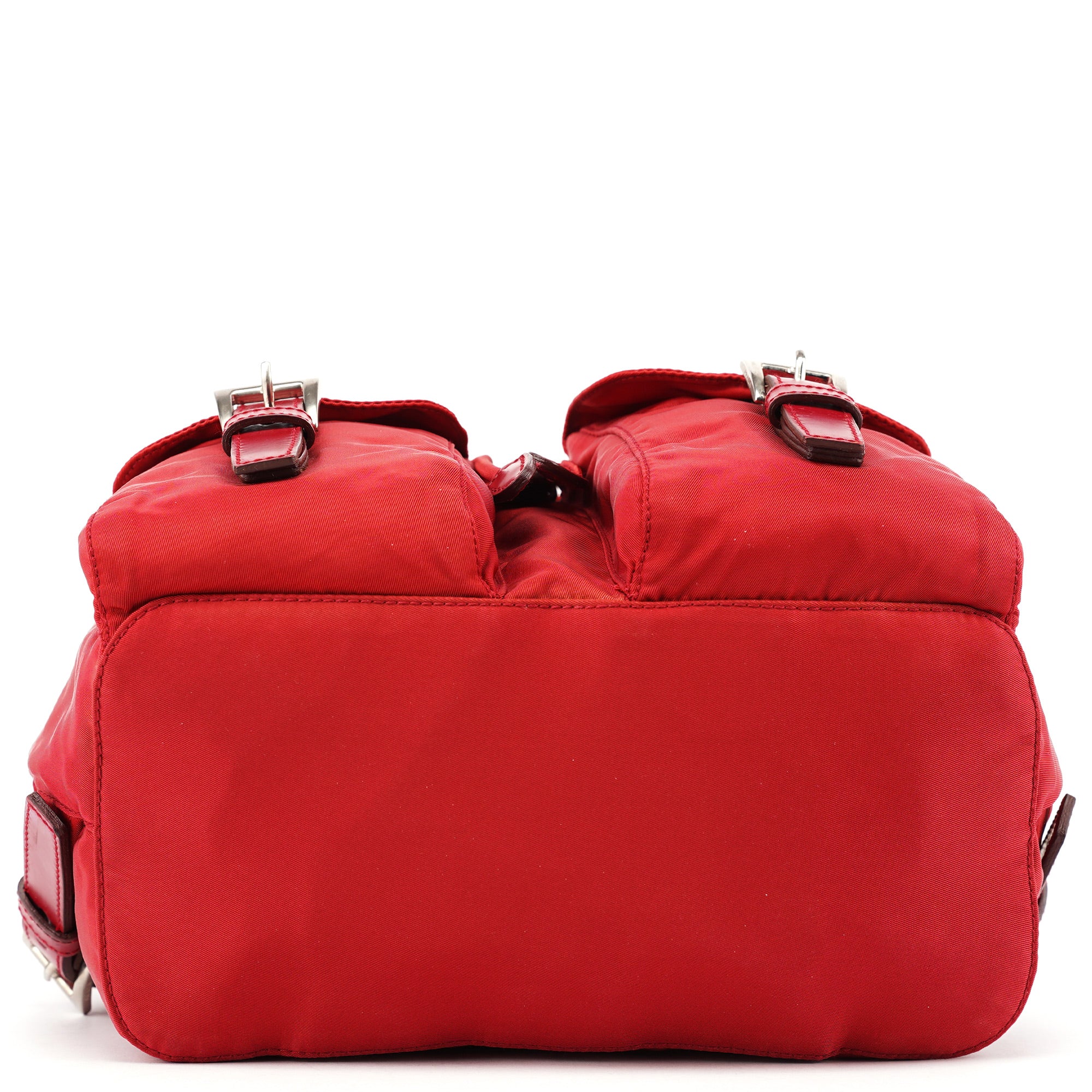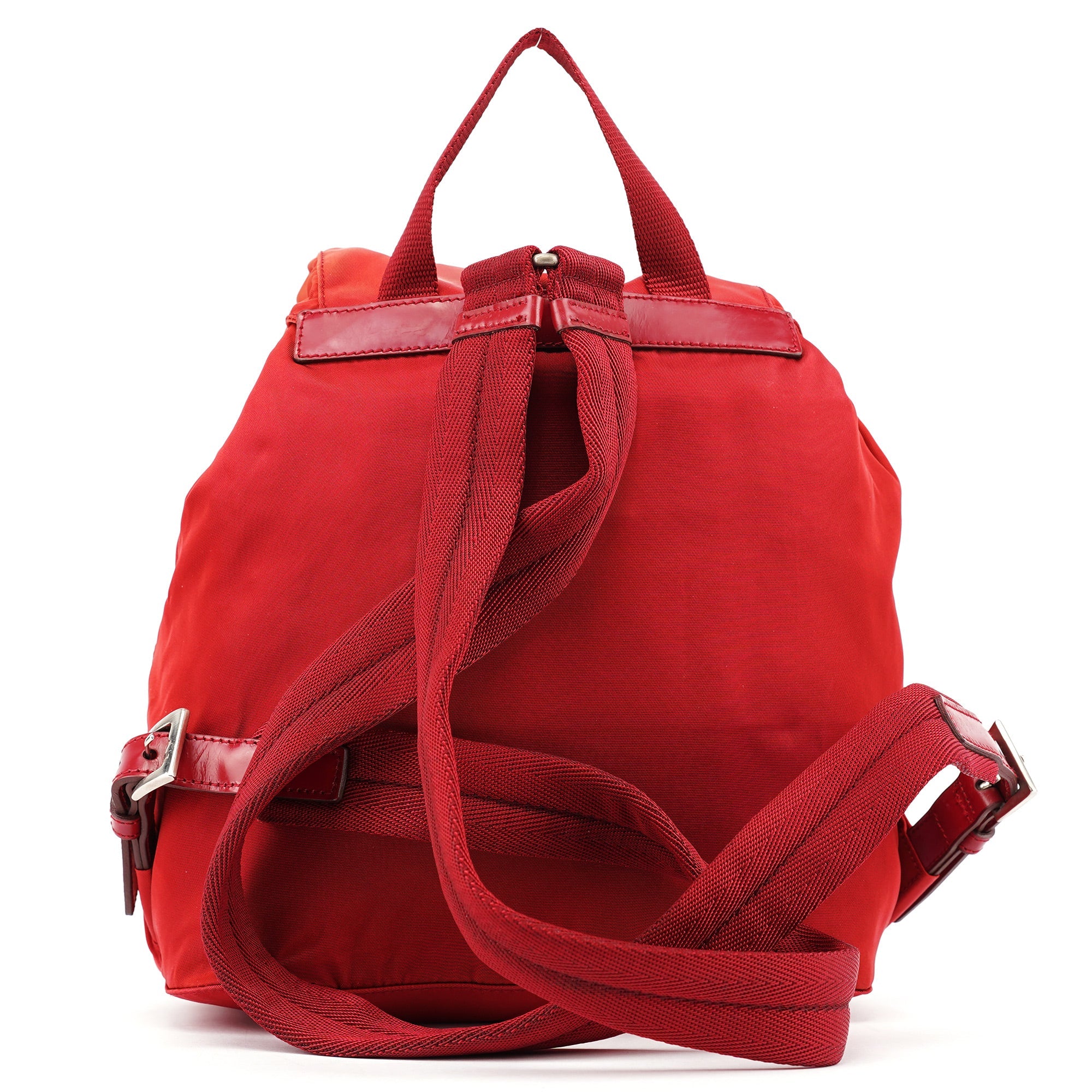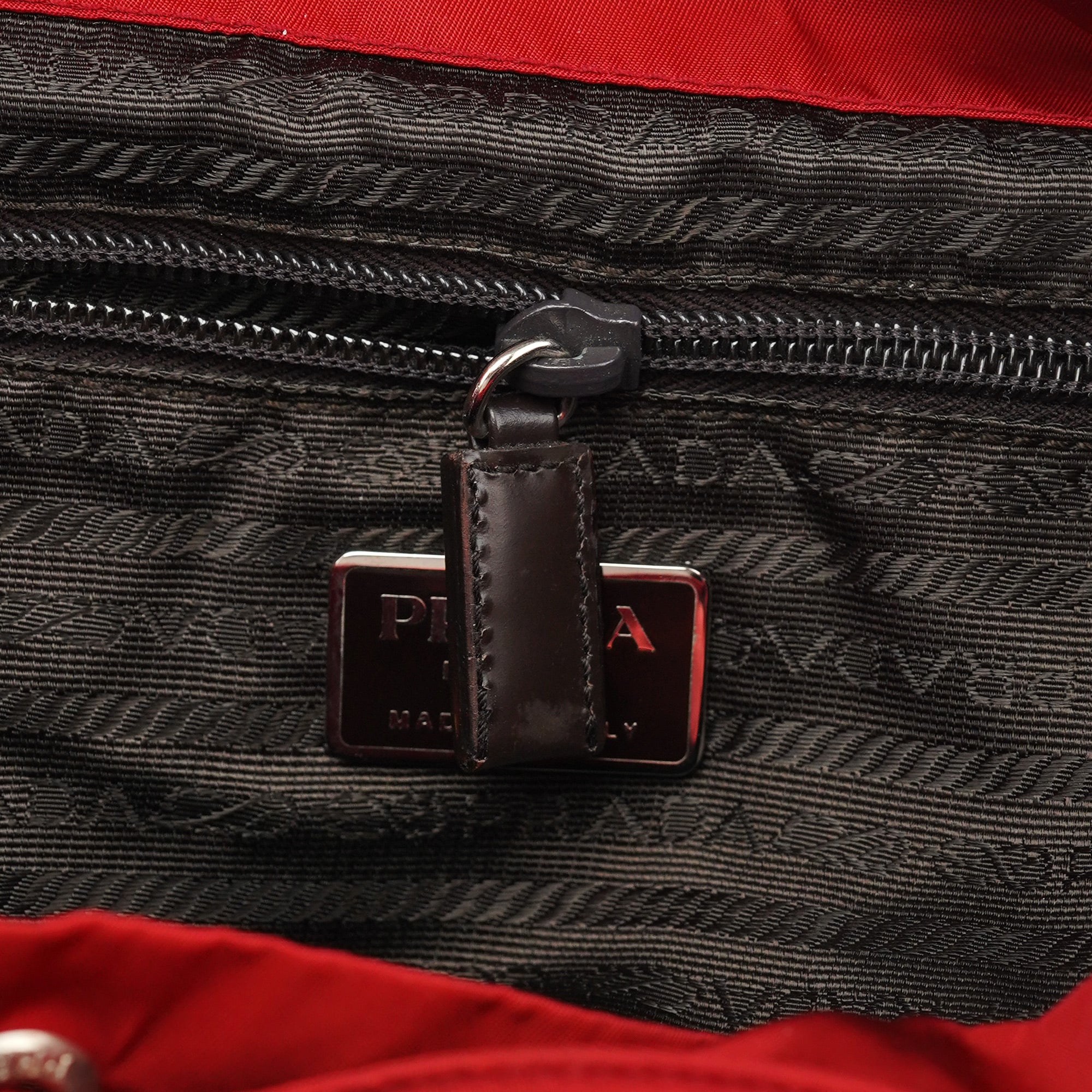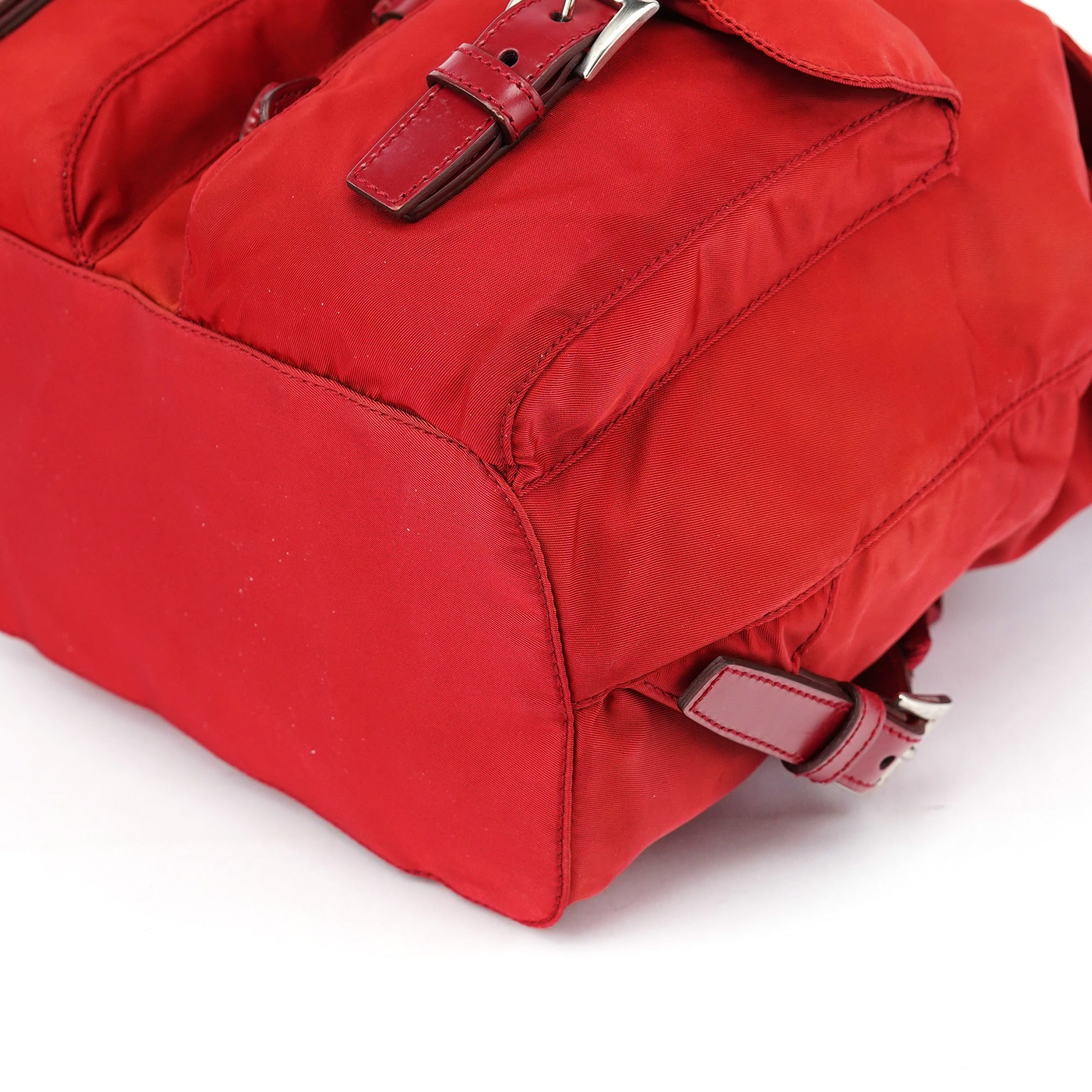 Designed in the 2000s, this Prada Tessuto Vela backpack is crafted in red nylon with tonal leather trim and silver-tone hardware. Features include two front pockets, a buckle-secured flap, and adjustable shoulder straps. Finished with a satin-lined interior and iconic Prada triangle logo.